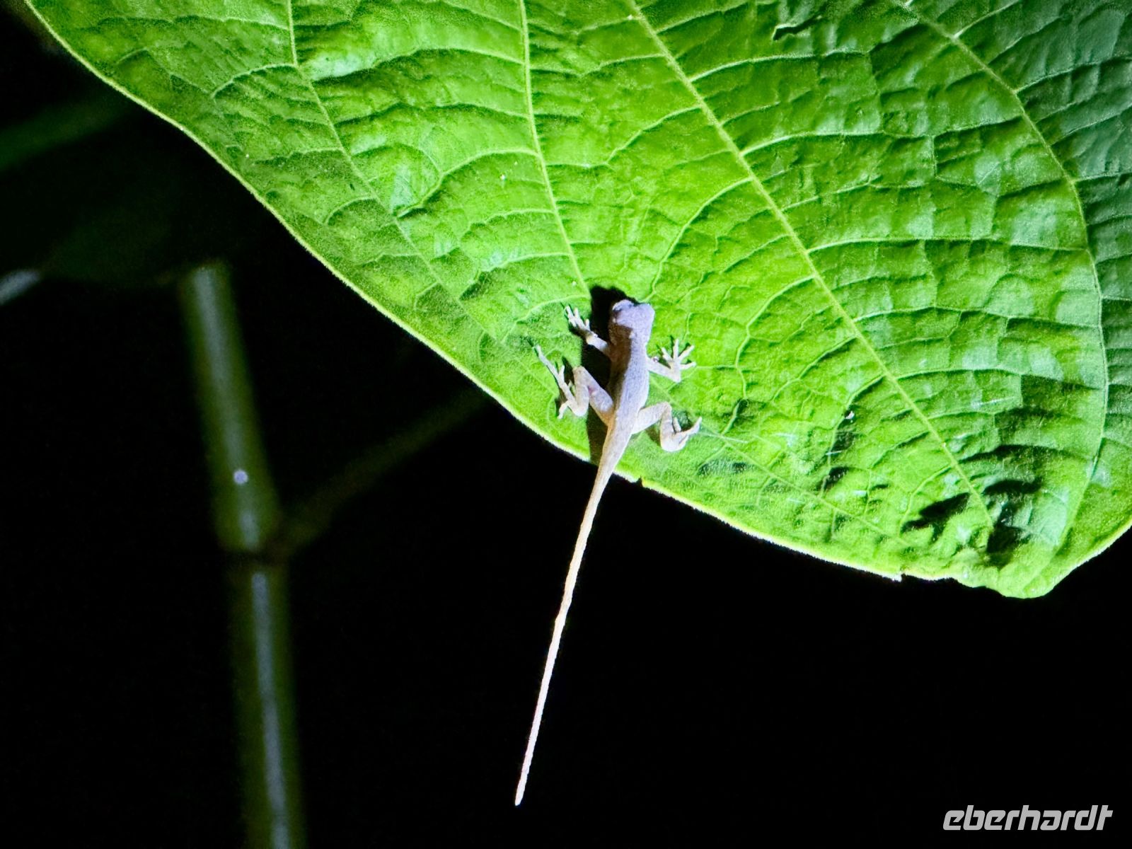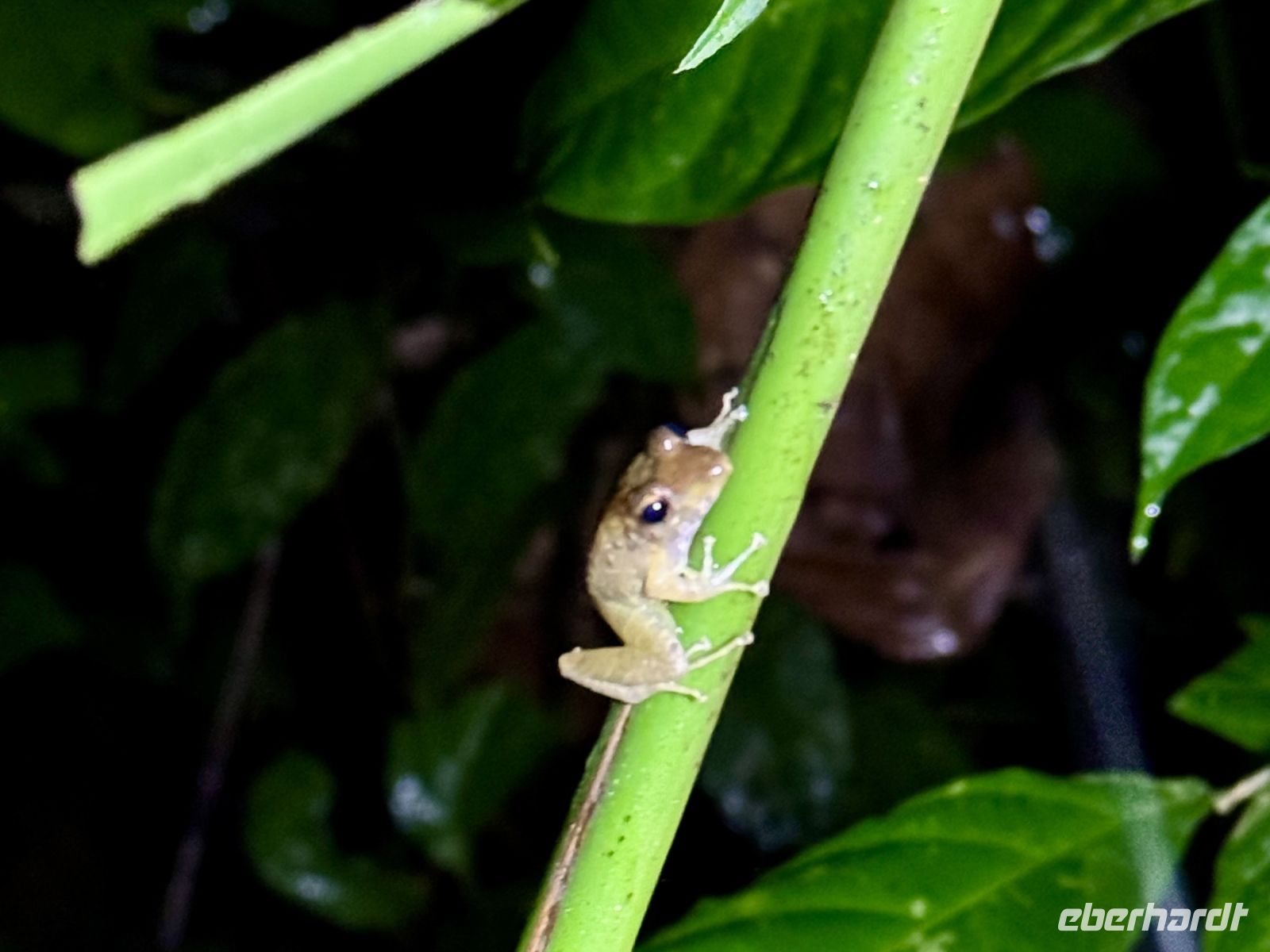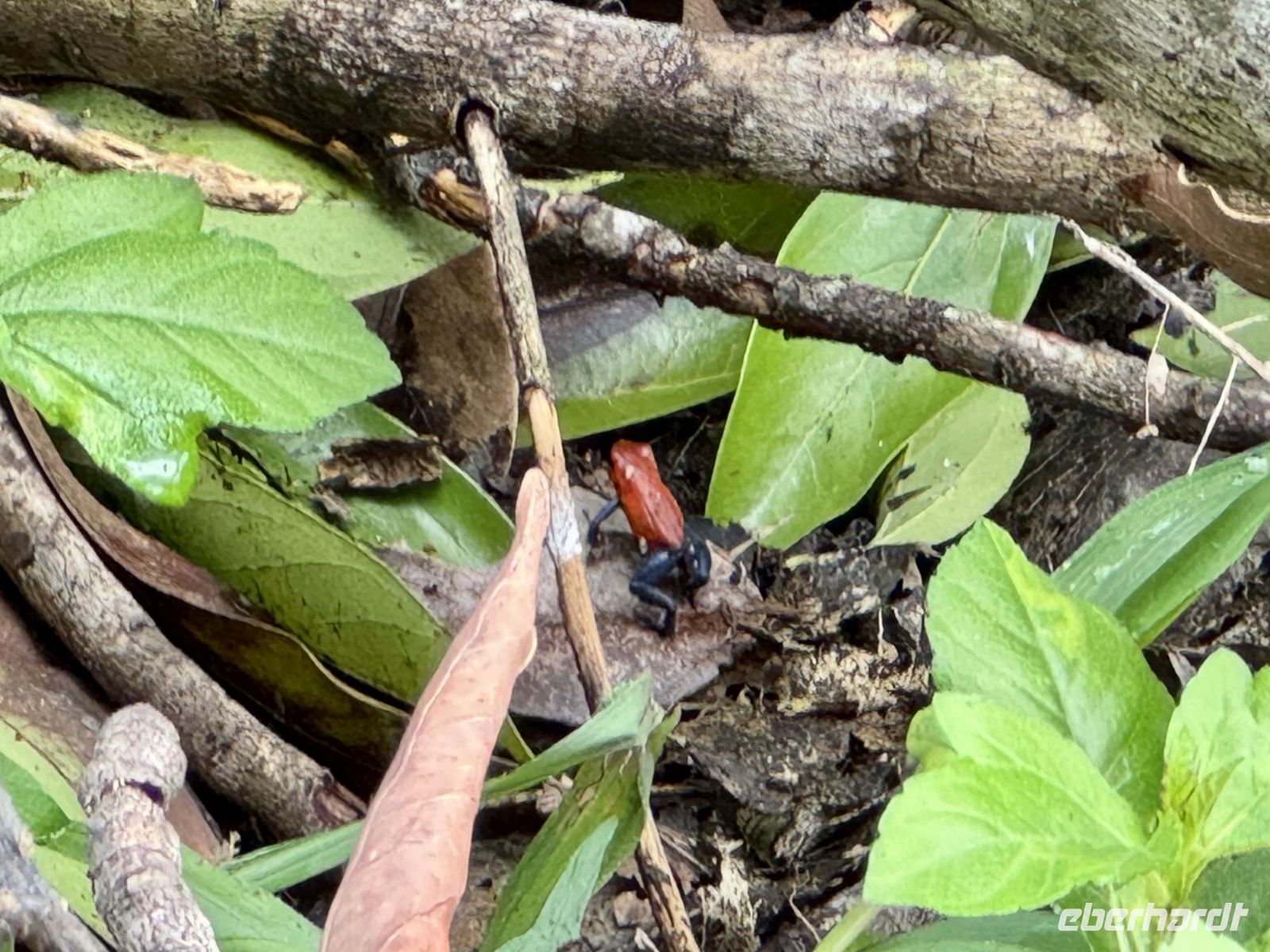 Durch den Zeitunterschied wachen wir in der ersten Nacht in Costa Rica mehrmals und/oder sehr zeitig am Morgen auf. So drehen einige Gäste meiner kleinen Gruppe schon vor dem Frühstück eine kleine Runde auf dem hoteleigenen Coffee Trail. Unsere Fahrt zum Vulkan Poas führt uns auch bereits an einigen Kaffeeplantagen vorbei. Die Straße windet sich höher und höher, stellenweise muss sich unser Kleinbus ganz schön den Berg hinaufquälen. Bei einem Fotostopp blicken wir zurück auf das Tal von San José zwischen den Vulkanen im Norden und dem Faltengebirge im Süden. Dann erreichen wir den Park und spazieren im leichten Sprühregen durch einen Zwerg-Nebelwald, wie uns Nico erklärt, zum Rand des Vulkans. An einigen Stellen konnte ich unterwegs ein bisschen den Schwefel riechen. Obwohl auch heute die Wolken von der Karibik herein- und über den Vulkan ziehen, lassen sich der Krater selbst und auch der See (bis zu 70 Grad heiß!) am Boden gut erkennen. Durch dichte Wolken, grüne Wälder und Weideland mit Holsteinrindern fahren wir nun bergab zu unserem zweiten Stopp, der Kaffeeplantage. Unterwegs kaufen wir spontan an einem Stand die lokalen Spezialitäten Erdbeeren und Käse, die wir auf der Weiterfahrt verkosten. Beides sehr lecker! Ein Fotostopp an einem Wasserfall ist die nächste Überraschung, die Nico für uns parat hat. Geht es jetzt jeden Tag so weiter? Gegen Mittag erreichen wir die Kaffeeplantage und bekommen dort auch erstmal ein traditionelles Mittagsgericht (Casado) mit u. a. Reis, Bohnen und Kochbananen. Anschließend führt uns Mahri (?) durch die Plantage und erklärt uns die gesamte Produktionskette von der Aussaat bis zur Röstung. Weil wir gut aufpassen, spendiert sie zwischendurch eine Runde Kaffeelikör. Draußen in der Sonne lässt es sich im Moment kaum aushalten. Dafür trocknen jetzt die Bohnen besonders gut. Natürlich bekommen wir am Ende der Führung auch eine Tasse Kaffee — aufgebrüht nach der traditionellen Methode. Und die braucht ihre Zeit … Zurück im Bus zeichnet Nico unsere heutige Route auf der Karte ein. Wir sind auf der Karibikseite der Vulkankette angelangt und müssen noch bis La Fortuna. Das ist gar nicht mehr so weit — gegen 15:30 Uhr sind wir am Hotel. Nachdem wir unsere Zimmer bezogen haben, dürfen wir uns etwa eine Stunde ausruhen, bevor wir nochmals aufbrechen. Gemeinsam wollen wir auf einer Nachtwanderung den Froschkönig suchen. Mit einem Guide und Taschenlampen begeben wir uns in den Dschungel. Eine wahre Symphonie aus Luten erfüllt die Nacht. Schnell werden wir fündig und sehen die ersten Frösche. Der heftige Regen treibt sie wohl nach draußen, meint Nico. So kehren wir zwar klatschnass, aber mit einer erfreulich hohen Ausbeute zurück. Wir haben viele Regenfrösche gesehen, den berühmten Rotaugen-Grünfrosch, auch den kleinsten Frosch Costa Ricas, Sanduhr-Laubfrösche, ja sogar ein eigentlich tagaktiver Pfeilgiftfrosch hat für uns Glückspilze extra Überstunden gemacht. Außerdem haben wir eine Viper, einen Glasflügelschmetterling und schlafende kleine Eidechsen gesehen. Beim gemeinsamen Abendessen im Grillrestaurant gegenüber unserem Hotel — Nico hat freundlicherweise einen Tisch für uns reserviert — stärken wir uns nach dem doch recht langen ersten Rundreisetag in Costa Rica mit bereits vielen tollen Momenten.