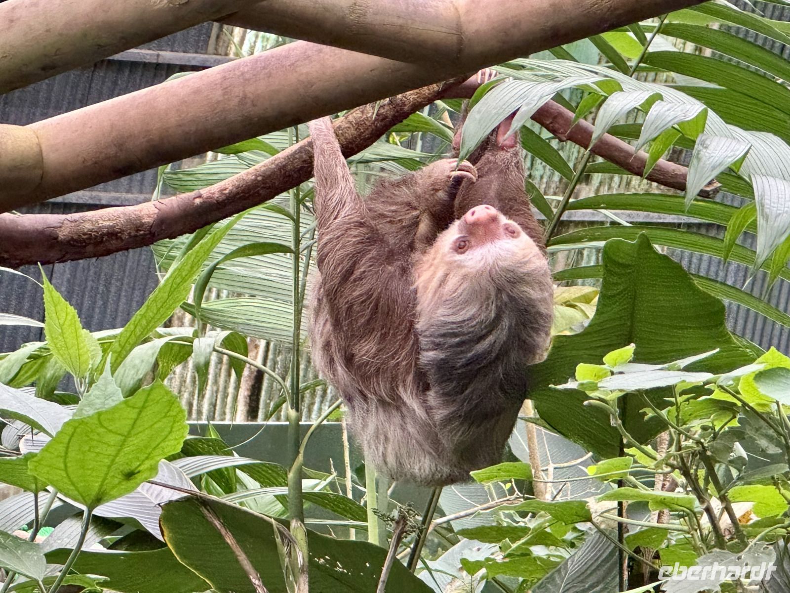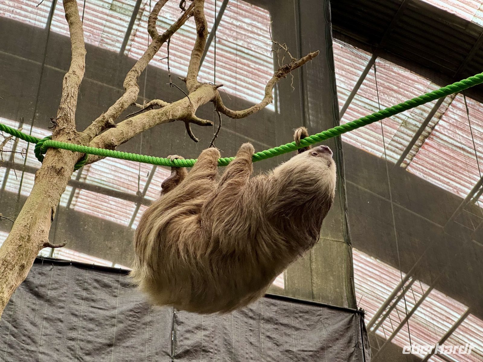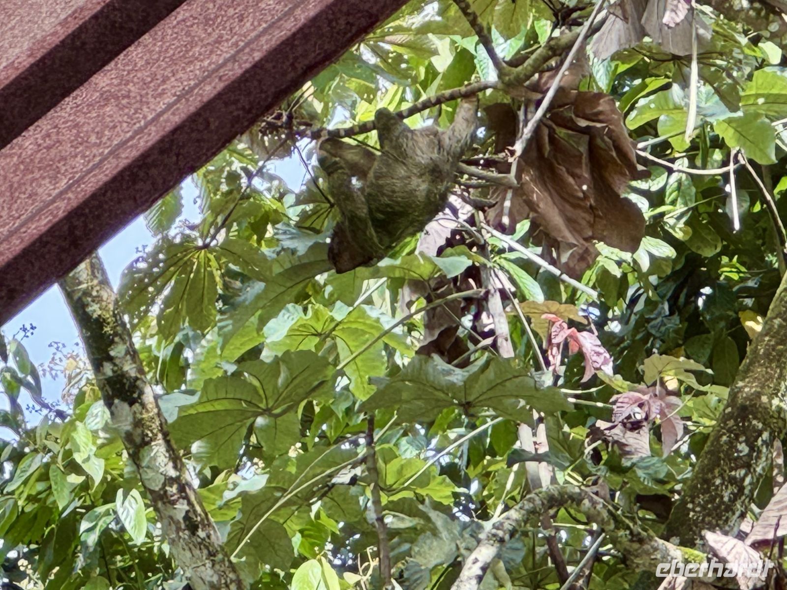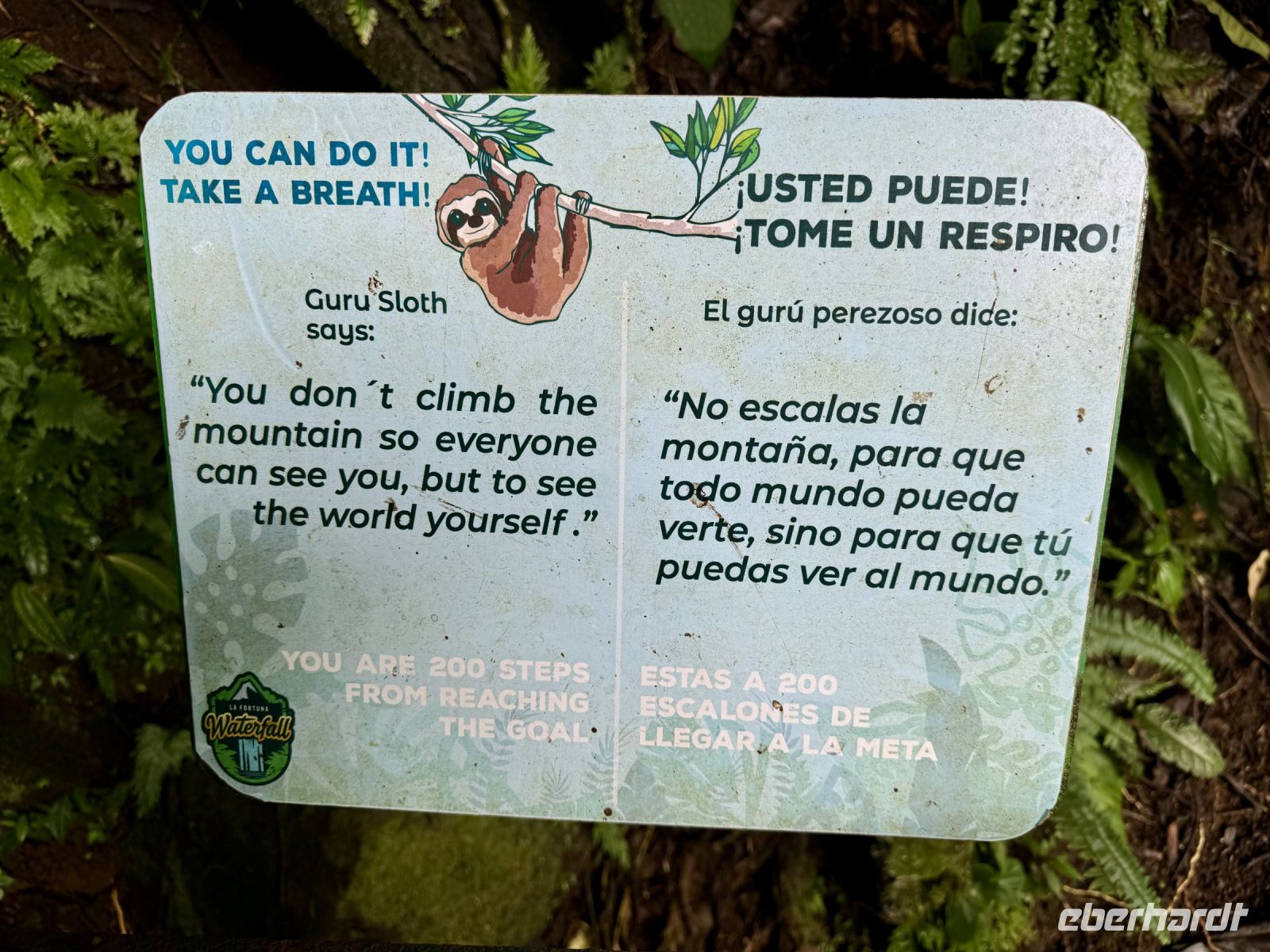 Mit einem Besuch beim La-Fortuna-Wasserfall starten wir gemütlich in unseren dritten Tag in Costa Rica. Den ersten Blick auf den Wasserfall erhaschen wir am Aussichtspunkt, bevor wir zur langen Treppe nach unten abbiegen. Die müssen wir nachher wieder hinauf. Uff. Immerhin können wir unten ein kleines Erfrischungsbad direkt am Fuß des Wasserfalls oder im abfließenden Bach nehmen. Trotz eines leichten Nieselregens wird diese Möglichkeit von einigen Touristen angenommen – scheint also nicht eisig kalt zu sein. Ich warte trotzdem lieber bis zum Abend … Nach dem Wasserfall sind wir anderthalb Stunden an kleinen Flussläufen in und um La Fortuna auf Faultiersuche — leider erfolglos. Zwar herrscht auf den Ameisenstraßen durch den Wald Hochbetrieb und auch kleine Eidechsen und Pfeilgiftfrösche kriegen wir vor die Kameralinse. Doch Faultiere? Fehlanzeige! Und dann fahren wir zum Mittagessen in ein sehr schönes Restaurant – und werden von Nico mit den Worten empfangen: „Wollt ihr lieber zuerst die Speisekarte anschauen oder erstmal das Faultier sehen?“ Ja, natürlich das Faultier! Das hängt nämlich direkt neben dem Restaurant in einem Baum und hangelt sich langsam durch die Äste. Was sind wir für Glückspilze! Und das beziehe ich ausdrücklich auch mit auf das unglaublich leckere Essen. Für mich gibt es ein überbackenes Wolfsbarschfilet mit Blattspinat. Ein Traum. Das gibt viele Pluspunkte für Costa Rica. Und leckere Schokolade gibt es in La Fortuna auch, wie ein Abstecher zum Schokoladengeschäft beweist, das mir schon gestern aufgefallen war. Und ich habe dafür ein ganz feines Radar! Am Nachmittag dürfen wir uns ausruhen und auf den abendlichen Ausflug vorbereiten. Es steht nämlich noch ein Besuch der heißen Quellen am Arenal an, auf den ich mich sehr freue! Vier Pools mit angenehm warmem Wasser zum Entspannen! Da stört es auch überhaupt nicht, dass es wieder vom Himmel tröpfelt, im Gegenteil. Auch ein Abendessen vom Buffet ist hier inklusive. Nach diesem Genießertag werden wir bestimmt alle ganz wunderbar schlafen!