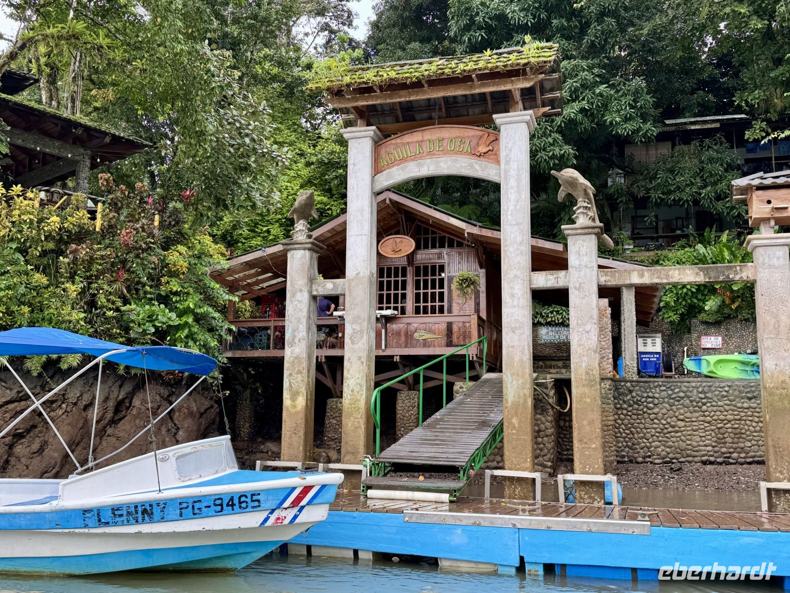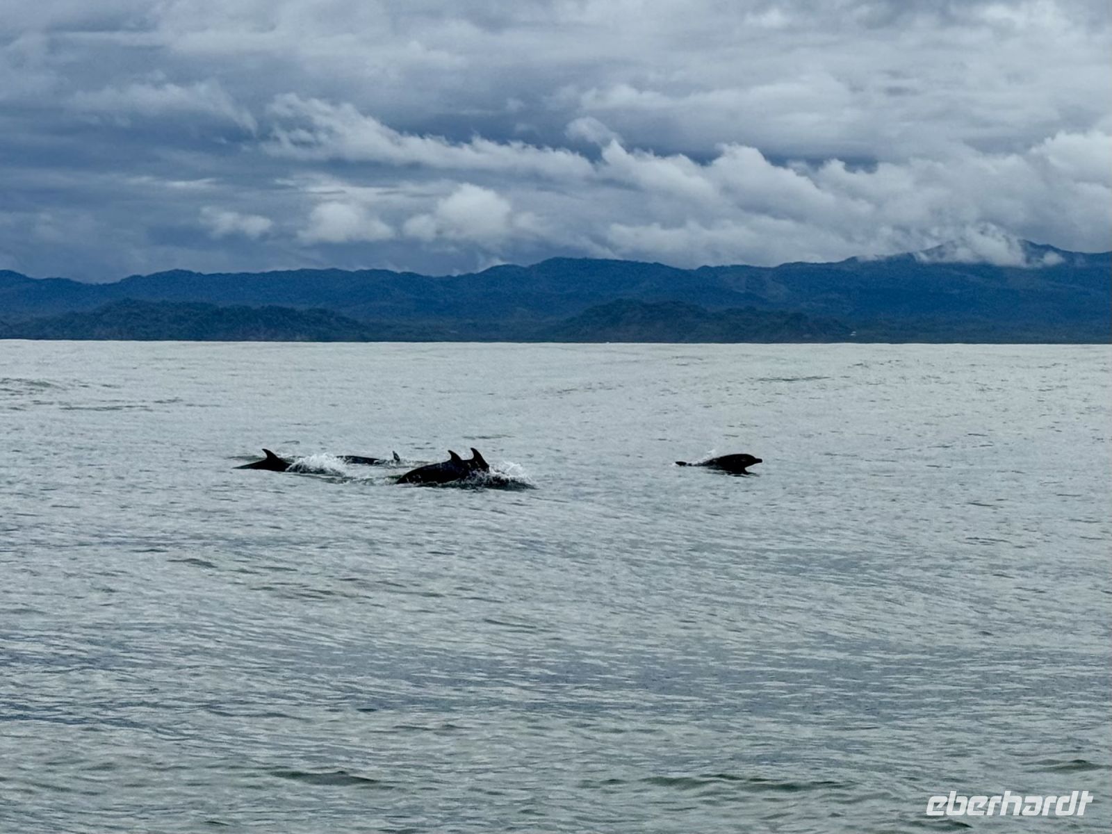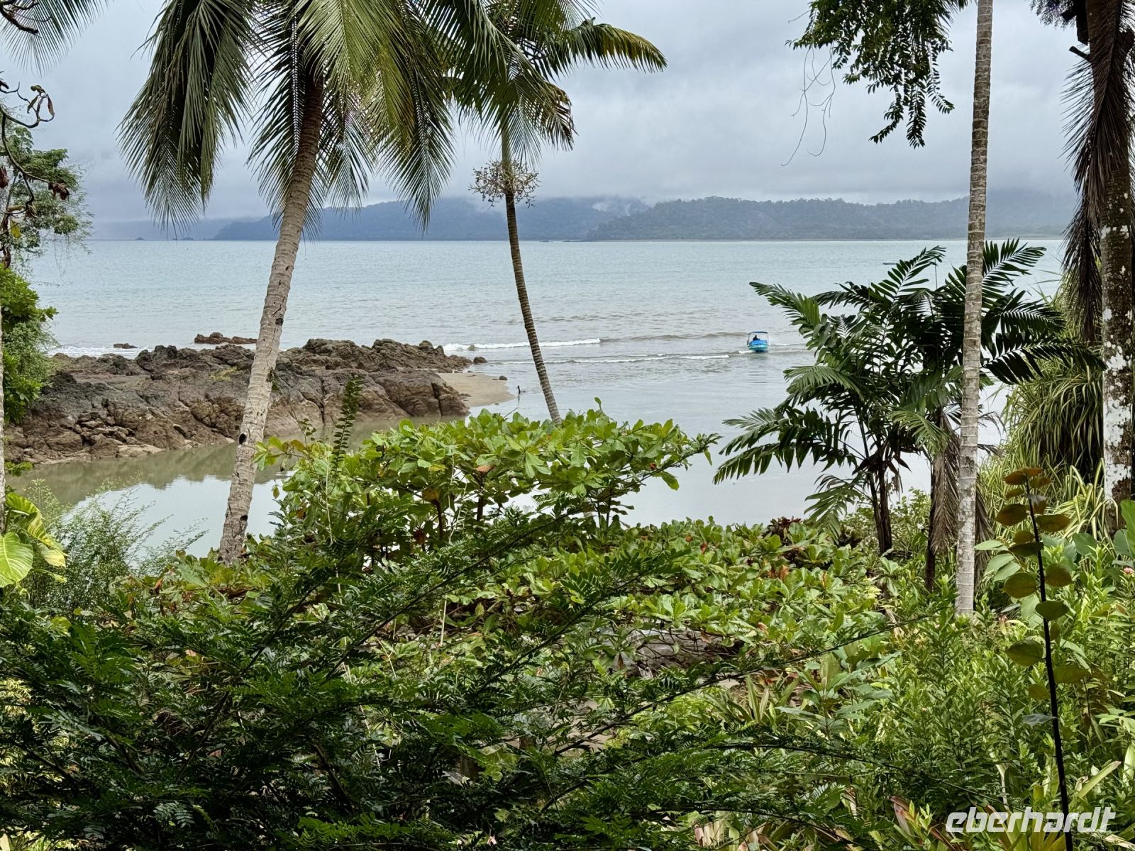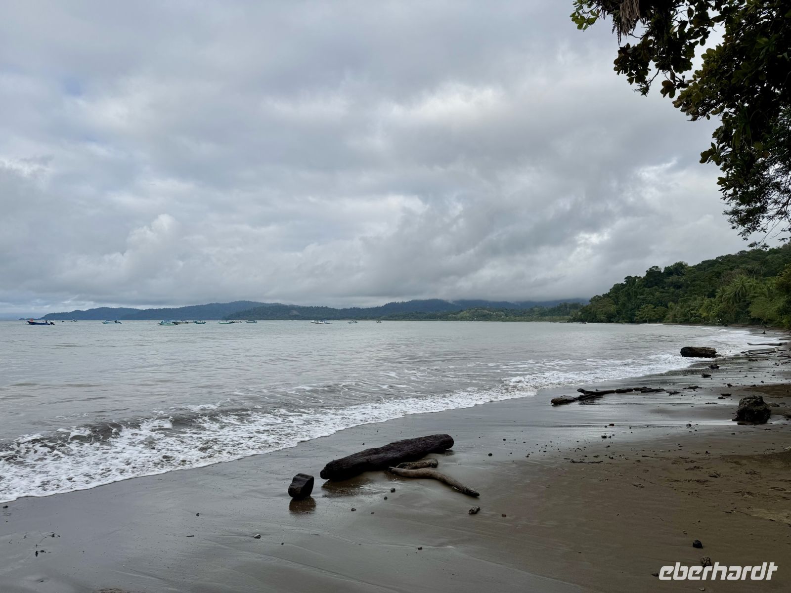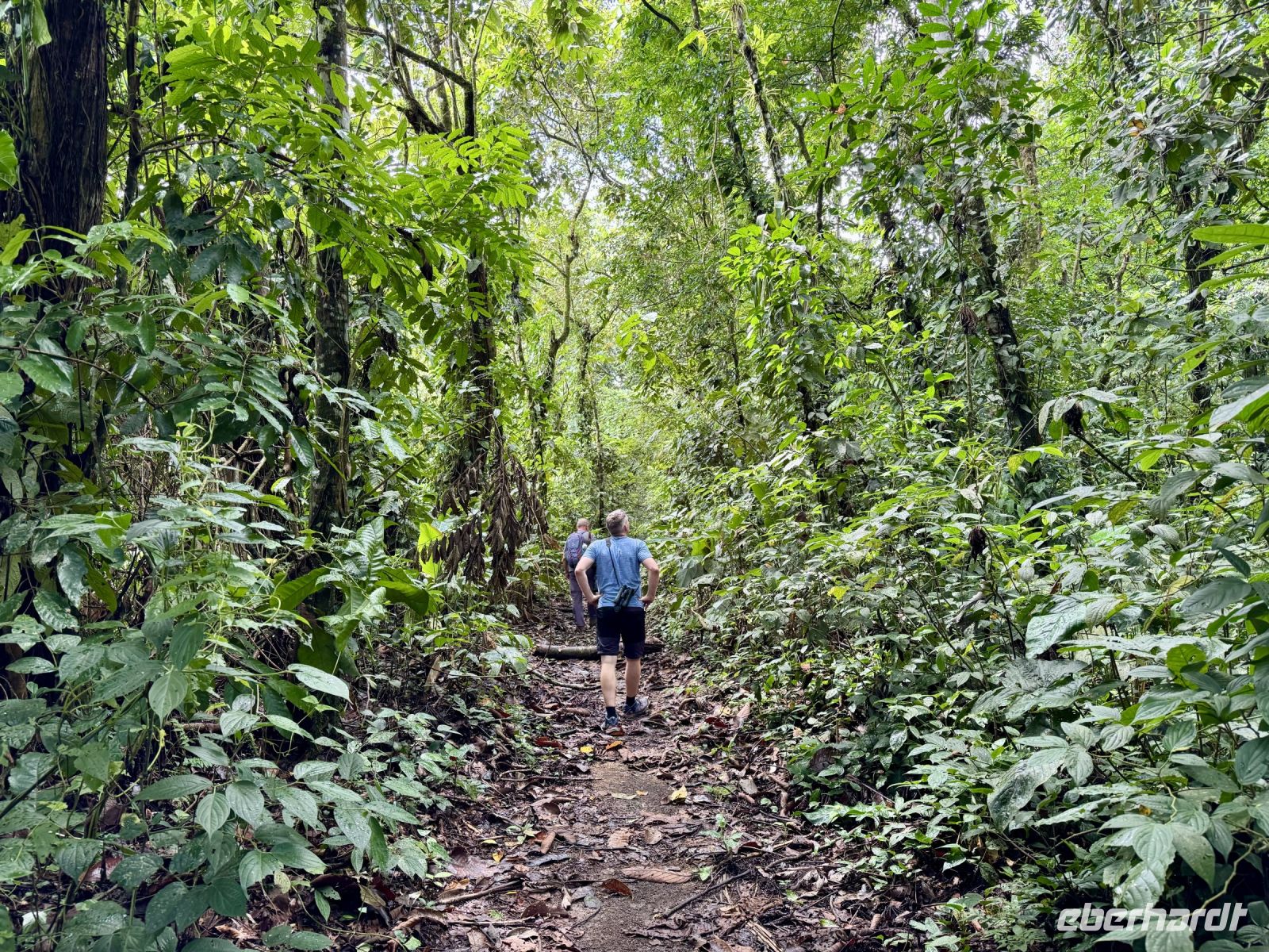Im Crystal Ballena wären wir gern noch 1–2 Nächte länger geblieben. Doch wir folgen weiter dem Ruf des Abenteuers. Unsere nächste Unterkunft können wir nur mit dem Boot erreichen … Wir starten im inzwischen obligatorischen flüssigen Sonnenschein und fahren zurück auf die Hauptstraße. Nachdem wir die Panamericana kurz gekreuzt haben, führt uns unsere Route vorbei an Palmölplantagen bis nach Sierpe. Hier verpacken und verladen wir unsere Koffer und Rucksäcke in ein (überdachtes) Motorboot. Das Verpacken ist nötig, denn natürlich regnet es sowieso wieder und außerdem kann die Überfahrt etwas spritzig werden, vor allem an der Schwelle zwischen Fluss und Meer. An den Häusern und anderen Booten in Sierpe tuckern wir noch gemächlich vorbei. Dann erfolgt der Sprung auf Warpgeschwindigkeit und wir zischen mit Karacho los. Mit viel Schwung geht es in die Kurven; wer bremst, verliert. Auf dem Meer wird es holpriger, wir hüpfen munter auf und ab. Der letzte Abschnitt der Anfahrt führt über offenes Wasser, quer durch die Drake Bay, und dauert etwa 15 Minuten. Dann gehen wir zurück auf Impulsgeschwindigkeit und nähern uns langsam dem Anleger. Während unsere Koffer ausgeladen und auf unsere Zimmer gebracht werden, begrüßen uns unsere Gastgeber Christina und Ronald mit Cocktails im Hotel Aguila d‘Osa. Wir bekommen auch sogleich unser erstes Mittagessen und lernen dabei Chefkoch Dixon kennen. Er wird uns die nächsten 72 Stunden kulinarisch verwöhnen. Mehr kriege ich nicht mehr mit, nachdem uns die beiden Keksdosen gezeigt worden sind — mein inneres Krümelmonster übernimmt von nun an die Kontrolle. Immerhin wissen meine Gäste gleich, wo ich im Zweifel stets zu finden bin. Nico gibt uns nun Zeit zum Beziehen unserer schicken Zimmer. Die persönliche Hängematte auf der Veranda muss gleich ausprobiert werden! Später am Nachmittag entführt uns Nico auf einen kleinen Abenteuerspaziergang durch den Regenwald zum Cocolito Beach. Ein süßer Hund begleitet uns und passt treuherzig auf uns auf. Beim Überqueren der Hängebrücke kommt Indiana-Jones-Feeling auf. Dann werden wir Zeuge eines seltenen Wetterphänomens: Sonnenstrahlen bahnen sich ihren Weg durch das dichte Blätterdach! Halleluja! Da ärgere ich mich ja fast, dass ich meine Badehose im Hotel gelassen habe. Am ersten Strand zockt uns Nico erstmal alle beim Einsiedlerkrebsrennen ab — sein kleiner Krebs war eindeutig mit Pilsen gedopt. Am zweiten Strand hüpfen einige Gäste tatsächlich mit Nico ins Wasser und schwimmen eine Runde. Das Wasser hat wohl um die 25–26 Grad. Kaum vorstellbar, nach all dem Regen der letzten Tage. Wir treten langsam den Rückweg an, denn in Costa Rica wird es immer zeitig dunkel. (Sonnenuntergang ist gegen 17:20 Uhr.) Beim Abendessen gibt es zum Nachtisch leckere Erdbeer-Crème-Brûlée — ein toller Abschluss für unseren ersten Tag im Paradies. Ein letzter Gute-Nacht-Keks muss jedoch noch sein …