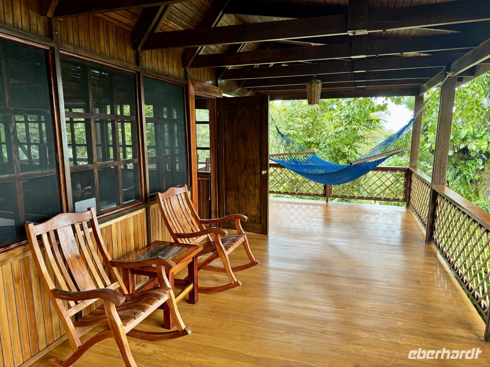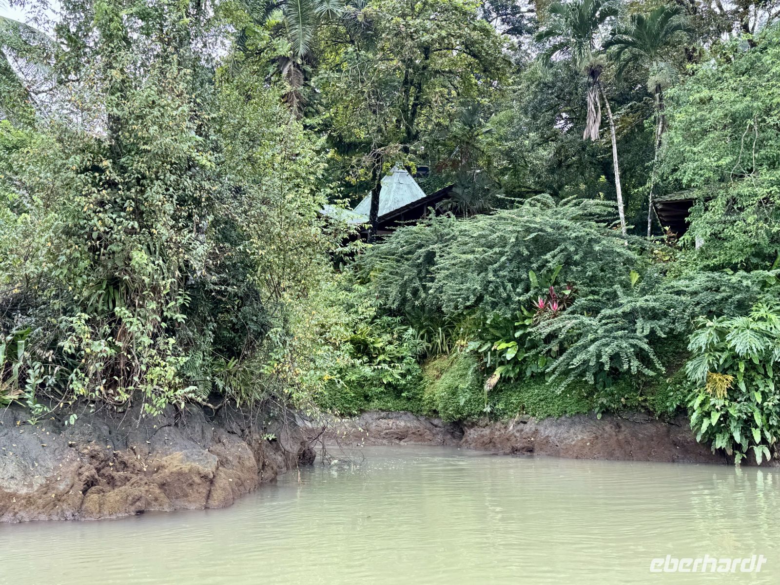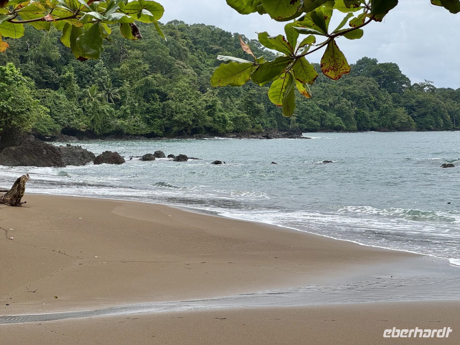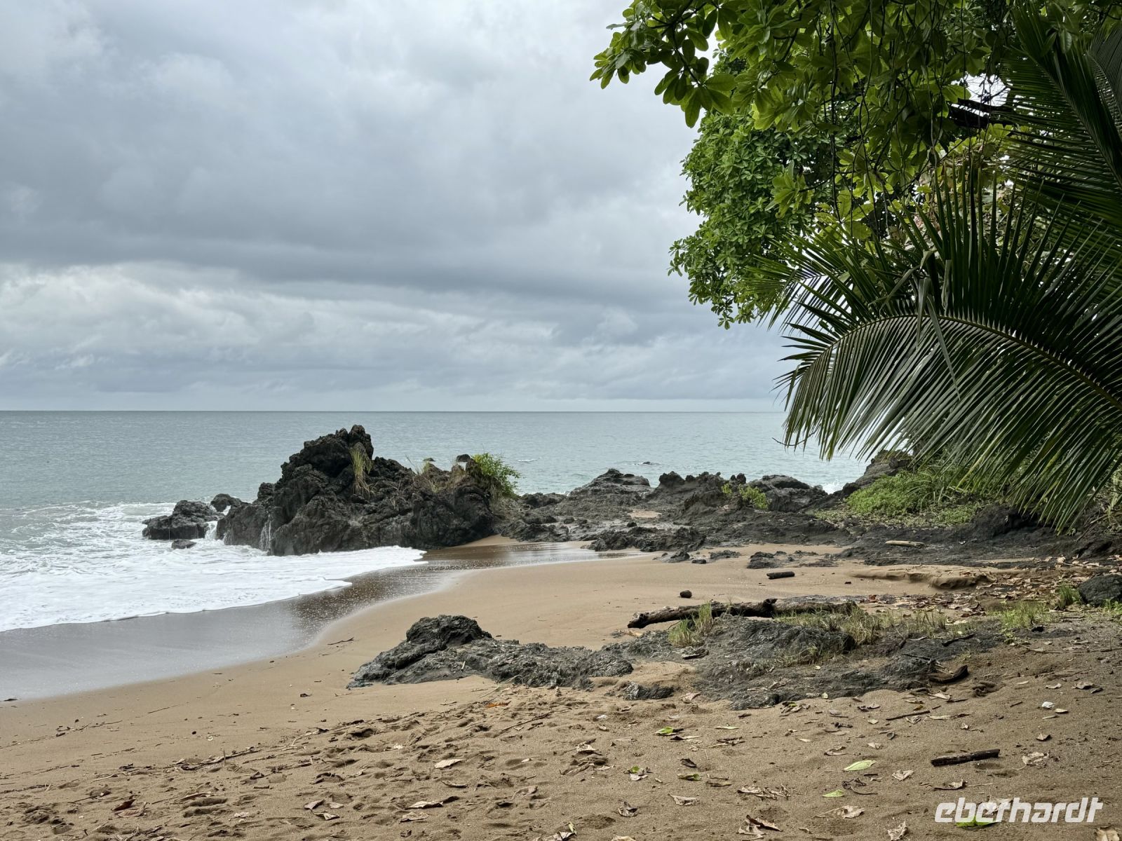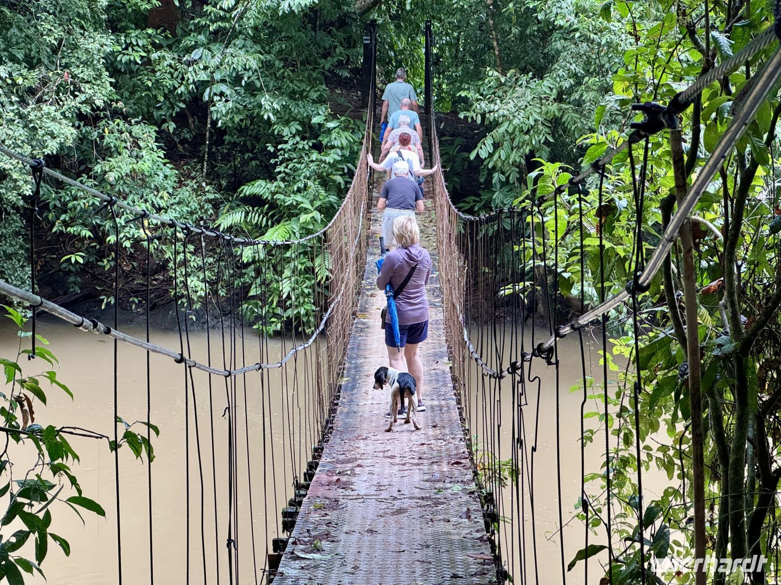 Im Crystal Ballena wären wir gern noch 1–2 Nächte länger geblieben. Doch wir folgen weiter dem Ruf des Abenteuers. Unsere nächste Unterkunft können wir nur mit dem Boot erreichen … Wir starten im inzwischen obligatorischen flüssigen Sonnenschein und fahren zurück auf die Hauptstraße. Nachdem wir die Panamericana kurz gekreuzt haben, führt uns unsere Route vorbei an Palmölplantagen bis nach Sierpe. Hier verpacken und verladen wir unsere Koffer und Rucksäcke in ein (überdachtes) Motorboot. Das Verpacken ist nötig, denn natürlich regnet es sowieso wieder und außerdem kann die Überfahrt etwas spritzig werden, vor allem an der Schwelle zwischen Fluss und Meer. An den Häusern und anderen Booten in Sierpe tuckern wir noch gemächlich vorbei. Dann erfolgt der Sprung auf Warpgeschwindigkeit und wir zischen mit Karacho los. Mit viel Schwung geht es in die Kurven; wer bremst, verliert. Auf dem Meer wird es holpriger, wir hüpfen munter auf und ab. Der letzte Abschnitt der Anfahrt führt über offenes Wasser, quer durch die Drake Bay, und dauert etwa 15 Minuten. Dann gehen wir zurück auf Impulsgeschwindigkeit und nähern uns langsam dem Anleger. Während unsere Koffer ausgeladen und auf unsere Zimmer gebracht werden, begrüßen uns unsere Gastgeber Christina und Ronald mit Cocktails im Hotel Aguila d‘Osa. Wir bekommen auch sogleich unser erstes Mittagessen und lernen dabei Chefkoch Dixon kennen. Er wird uns die nächsten 72 Stunden kulinarisch verwöhnen. Mehr kriege ich nicht mehr mit, nachdem uns die beiden Keksdosen gezeigt worden sind — mein inneres Krümelmonster übernimmt von nun an die Kontrolle. Immerhin wissen meine Gäste gleich, wo ich im Zweifel stets zu finden bin. Nico gibt uns nun Zeit zum Beziehen unserer schicken Zimmer. Die persönliche Hängematte auf der Veranda muss gleich ausprobiert werden! Später am Nachmittag entführt uns Nico auf einen kleinen Abenteuerspaziergang durch den Regenwald zum Cocolito Beach. Ein süßer Hund begleitet uns und passt treuherzig auf uns auf. Beim Überqueren der Hängebrücke kommt Indiana-Jones-Feeling auf. Dann werden wir Zeuge eines seltenen Wetterphänomens: Sonnenstrahlen bahnen sich ihren Weg durch das dichte Blätterdach! Halleluja! Da ärgere ich mich ja fast, dass ich meine Badehose im Hotel gelassen habe. Am ersten Strand zockt uns Nico erstmal alle beim Einsiedlerkrebsrennen ab — sein kleiner Krebs war eindeutig mit Pilsen gedopt. Am zweiten Strand hüpfen einige Gäste tatsächlich mit Nico ins Wasser und schwimmen eine Runde. Das Wasser hat wohl um die 25–26 Grad. Kaum vorstellbar, nach all dem Regen der letzten Tage. Wir treten langsam den Rückweg an, denn in Costa Rica wird es immer zeitig dunkel. (Sonnenuntergang ist gegen 17:20 Uhr.) Beim Abendessen gibt es zum Nachtisch leckere Erdbeer-Crème-Brûlée — ein toller Abschluss für unseren ersten Tag im Paradies. Ein letzter Gute-Nacht-Keks muss jedoch noch sein …