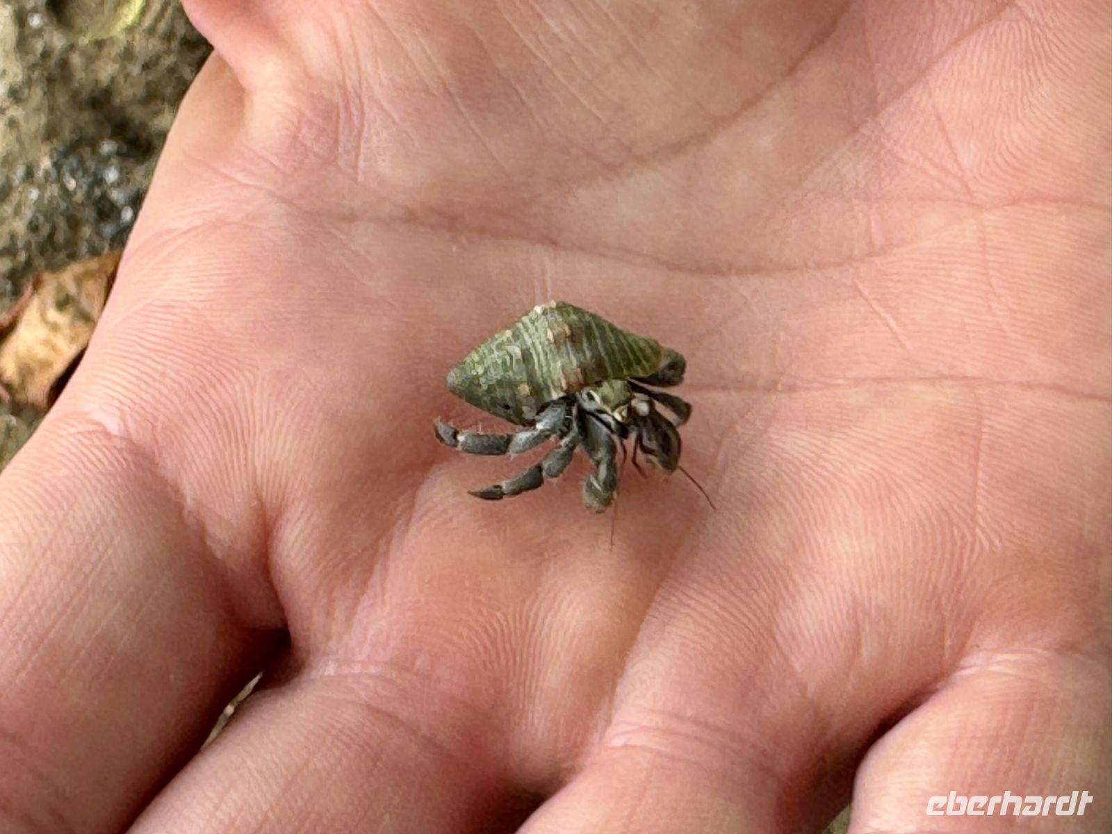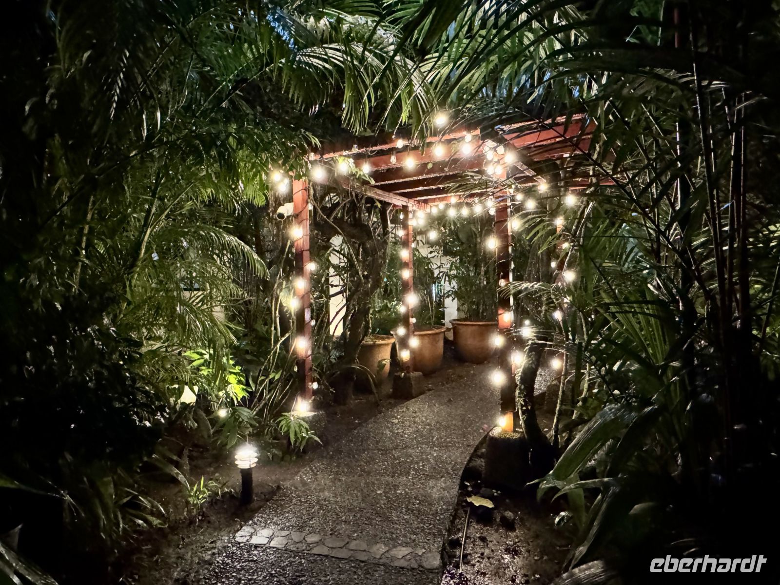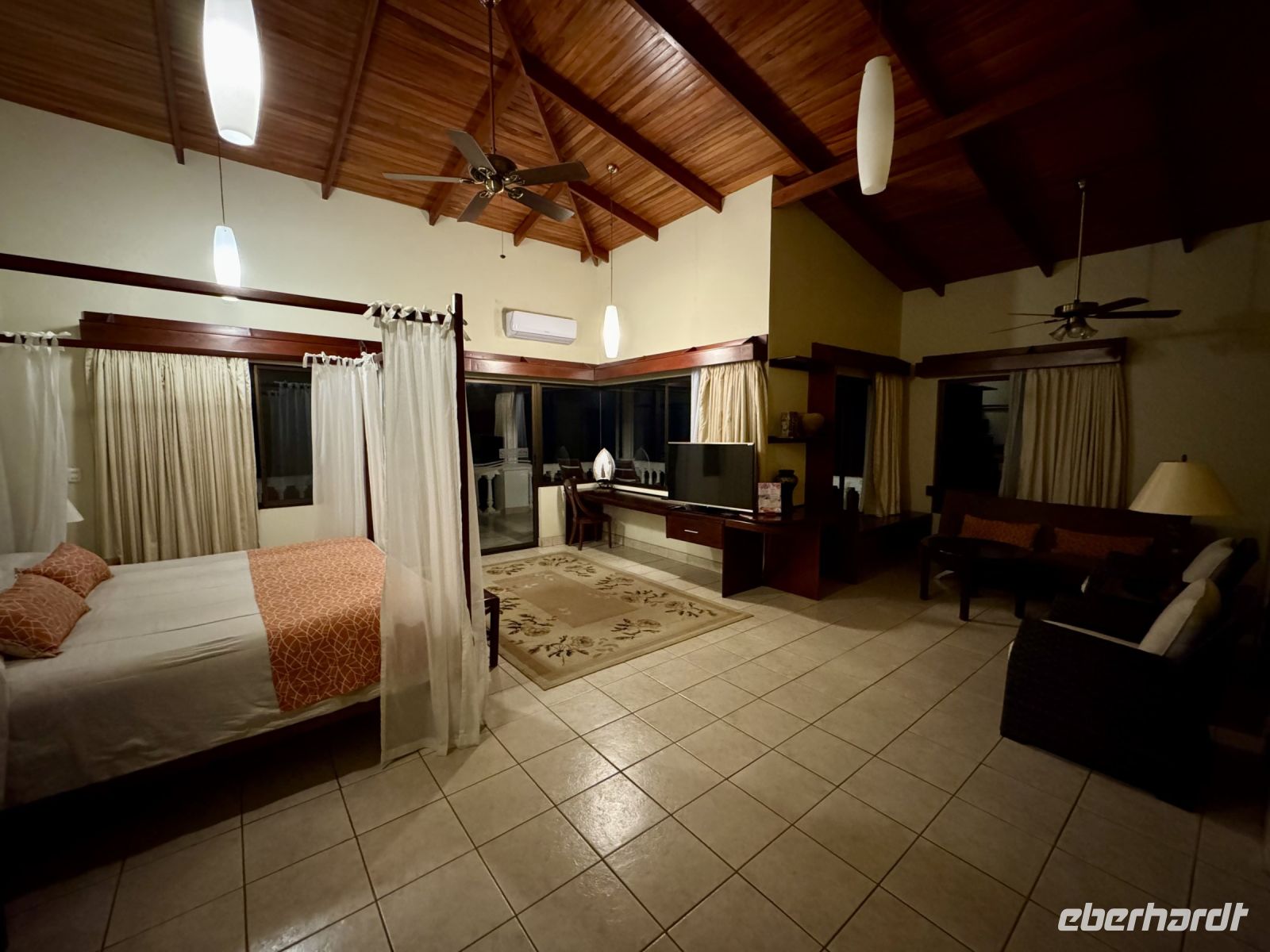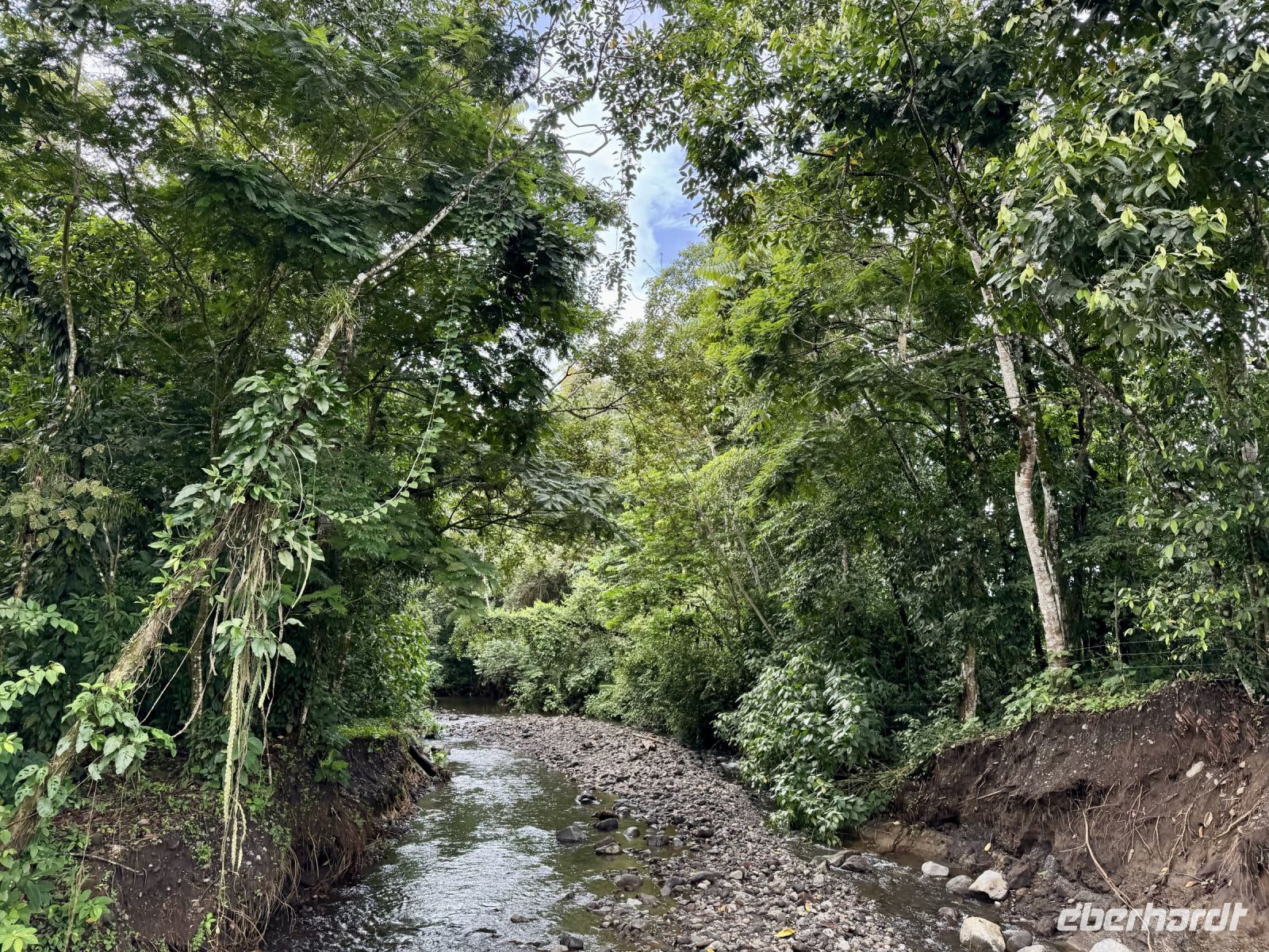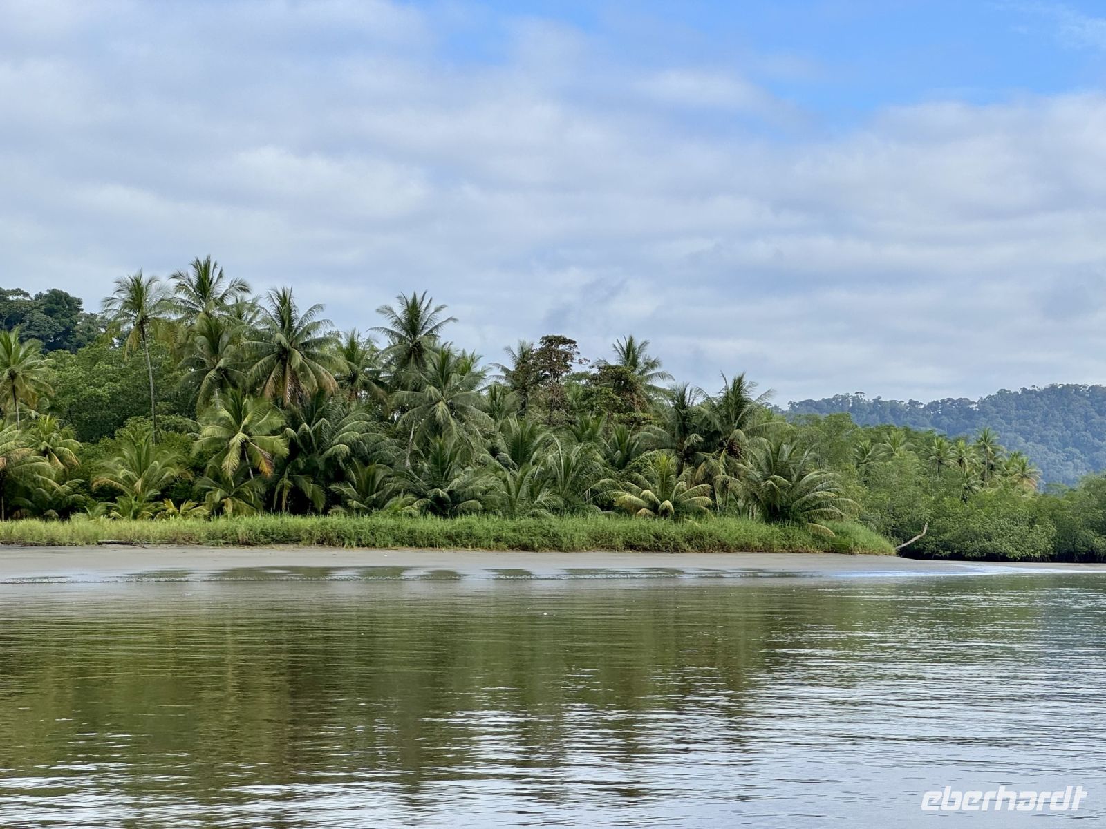 Im Crystal Ballena wären wir gern noch 1–2 Nächte länger geblieben. Doch wir folgen weiter dem Ruf des Abenteuers. Unsere nächste Unterkunft können wir nur mit dem Boot erreichen … Wir starten im inzwischen obligatorischen flüssigen Sonnenschein und fahren zurück auf die Hauptstraße. Nachdem wir die Panamericana kurz gekreuzt haben, führt uns unsere Route vorbei an Palmölplantagen bis nach Sierpe. Hier verpacken und verladen wir unsere Koffer und Rucksäcke in ein (überdachtes) Motorboot. Das Verpacken ist nötig, denn natürlich regnet es sowieso wieder und außerdem kann die Überfahrt etwas spritzig werden, vor allem an der Schwelle zwischen Fluss und Meer. An den Häusern und anderen Booten in Sierpe tuckern wir noch gemächlich vorbei. Dann erfolgt der Sprung auf Warpgeschwindigkeit und wir zischen mit Karacho los. Mit viel Schwung geht es in die Kurven; wer bremst, verliert. Auf dem Meer wird es holpriger, wir hüpfen munter auf und ab. Der letzte Abschnitt der Anfahrt führt über offenes Wasser, quer durch die Drake Bay, und dauert etwa 15 Minuten. Dann gehen wir zurück auf Impulsgeschwindigkeit und nähern uns langsam dem Anleger. Während unsere Koffer ausgeladen und auf unsere Zimmer gebracht werden, begrüßen uns unsere Gastgeber Christina und Ronald mit Cocktails im Hotel Aguila d‘Osa. Wir bekommen auch sogleich unser erstes Mittagessen und lernen dabei Chefkoch Dixon kennen. Er wird uns die nächsten 72 Stunden kulinarisch verwöhnen. Mehr kriege ich nicht mehr mit, nachdem uns die beiden Keksdosen gezeigt worden sind — mein inneres Krümelmonster übernimmt von nun an die Kontrolle. Immerhin wissen meine Gäste gleich, wo ich im Zweifel stets zu finden bin. Nico gibt uns nun Zeit zum Beziehen unserer schicken Zimmer. Die persönliche Hängematte auf der Veranda muss gleich ausprobiert werden! Später am Nachmittag entführt uns Nico auf einen kleinen Abenteuerspaziergang durch den Regenwald zum Cocolito Beach. Ein süßer Hund begleitet uns und passt treuherzig auf uns auf. Beim Überqueren der Hängebrücke kommt Indiana-Jones-Feeling auf. Dann werden wir Zeuge eines seltenen Wetterphänomens: Sonnenstrahlen bahnen sich ihren Weg durch das dichte Blätterdach! Halleluja! Da ärgere ich mich ja fast, dass ich meine Badehose im Hotel gelassen habe. Am ersten Strand zockt uns Nico erstmal alle beim Einsiedlerkrebsrennen ab — sein kleiner Krebs war eindeutig mit Pilsen gedopt. Am zweiten Strand hüpfen einige Gäste tatsächlich mit Nico ins Wasser und schwimmen eine Runde. Das Wasser hat wohl um die 25–26 Grad. Kaum vorstellbar, nach all dem Regen der letzten Tage. Wir treten langsam den Rückweg an, denn in Costa Rica wird es immer zeitig dunkel. (Sonnenuntergang ist gegen 17:20 Uhr.) Beim Abendessen gibt es zum Nachtisch leckere Erdbeer-Crème-Brûlée — ein toller Abschluss für unseren ersten Tag im Paradies. Ein letzter Gute-Nacht-Keks muss jedoch noch sein …