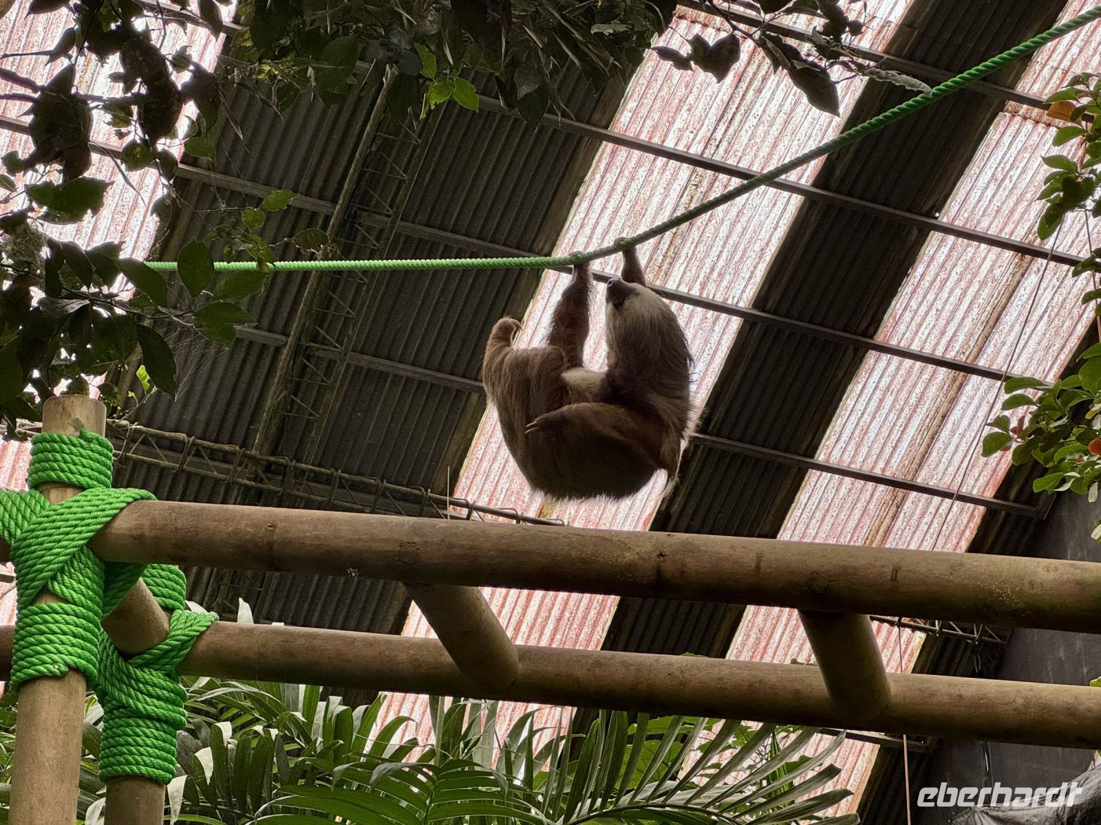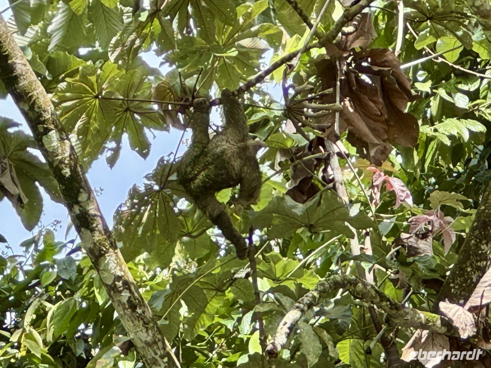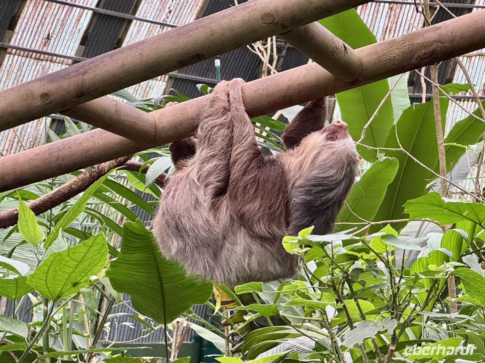 Zur Abwechslung regnet es heute wieder stärker, aber auch nicht nur. Nein, Petrus täuscht ab und zu so etwas wie eine Pause oder Auflockerung der Wolkendecke an. In Wirklichkeit ist es jedoch nur das Luftholen für den nächsten heftigen Schauer. Das Prasseln der Regentropfen auf dem Dach unseres Busses oder den Wellblechdächern der Häuser gehört inzwischen standardmäßig als Hintergrundmusik zu jedem Reisetag dazu. Auf der Fahrt zum Nebelwald von Monteverde beschließen wir jedoch gemeinsam, uns auch den Rest unserer Reise nicht davon verderben zu lassen. Beim Spaziergang auf den Hängebrücken zwischen den Baumwipfeln könnte es tatsächlich auch viel schlimmer sein. Nico erklärt uns den Aufbau der Vegetation, einzelne Pflanzen und weitere Besonderheiten des Nebelwaldes, während wir nacheinander die acht Hängebrücken überqueren. Den Rest des geplanten Tagesprogramms basteln wir jedoch wetterbedingt um und nehmen nach einer Kuchenpause an einer Führung durch die Auffangstation für Zweifingerfaultiere teil. Während einige der elf Faultier-Weibchen tief und fest schlafen, tun uns andere den Gefallen und klettern gaaaaaaaaaaaaanz langsam an den Leitern und Seilen durch die Halle. Neugierig werfen sie einen Blick auf uns — aus ihrer Sicht — hektische Besucher herunter. Immer schön mit der Ruhe! Fressen, schlafen, fressen, schlafen, ein Mal pro Woche ein Toilettengang — Pura Vida! Ganz ohne Mittagspause wollen wir unseren Ausflug nicht beschließen, weshalb wir auf der alten Quäker-Straße das Café Kolibri ansteuern. Der Name ist Programm: Ganz viele Kolibris in verschiedenen Farben — von grün glänzend bis violett — flattern um unsere Köpfe herum. Im Vergleich zu den Faultieren genau das andere Extrem. Leckeren Kaffee und Aqua dulce con leche gibt es hier auch. Auf der holprigen Straße kehren wir nun durch den Regen zum Hotel zurück. Für etwas mehr als zwei Stunden können wir uns ein bisschen ausruhen, dann habe ich zum großen Umtrunk geladen. Mit einer Flasche Rum feiern wir Bergfest und trinken uns das Wetter schön. Es folgt ein weiteres Abendmahl bei Nicos Freundin Rebecca. Diesmal kommen alle mit zum Dinner, das heute etwas zeitiger stattfindet — wir wollen/müssen nämlich morgen leider auch zeitiger los.