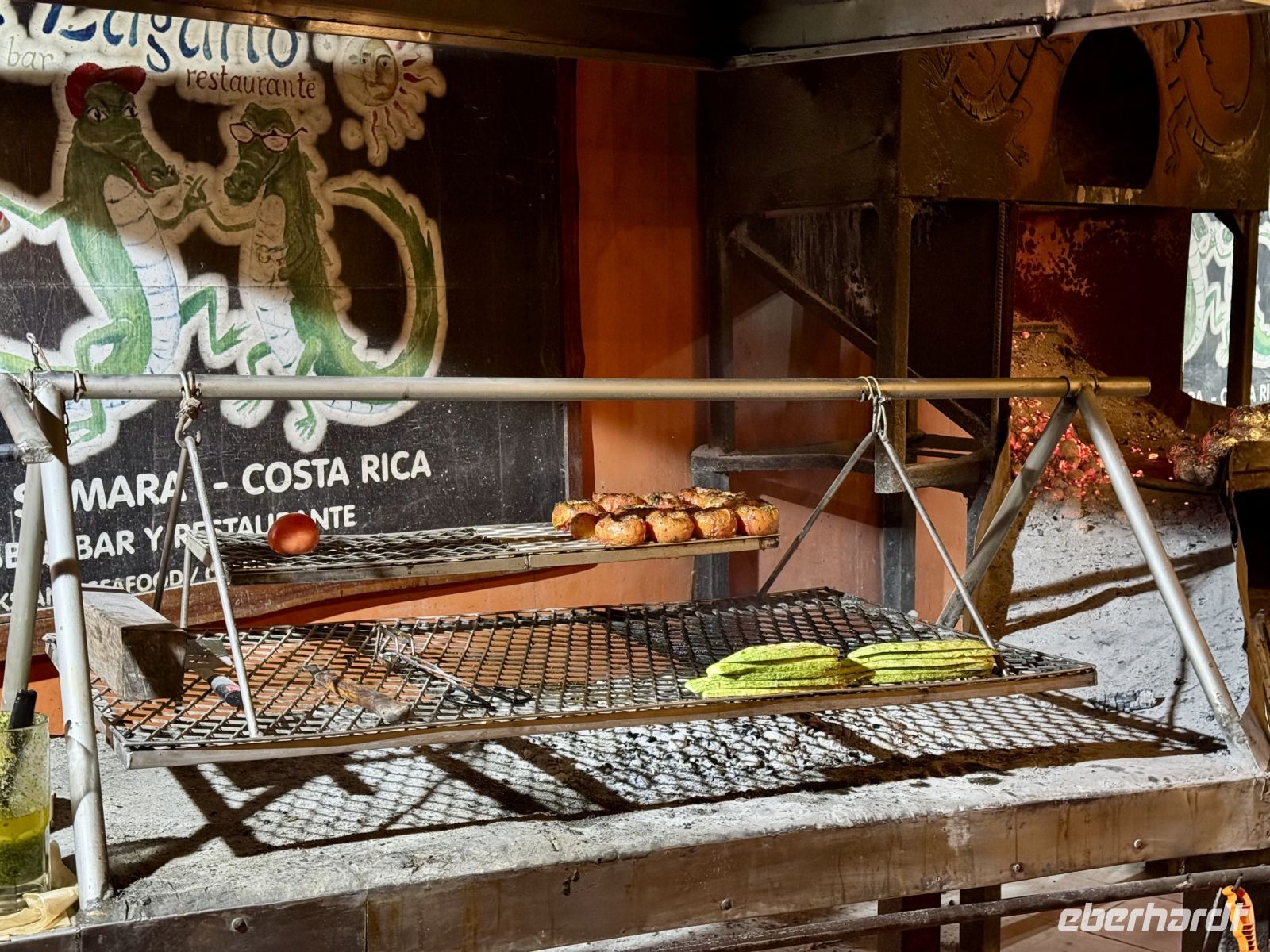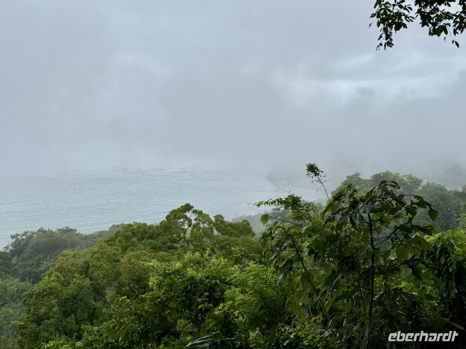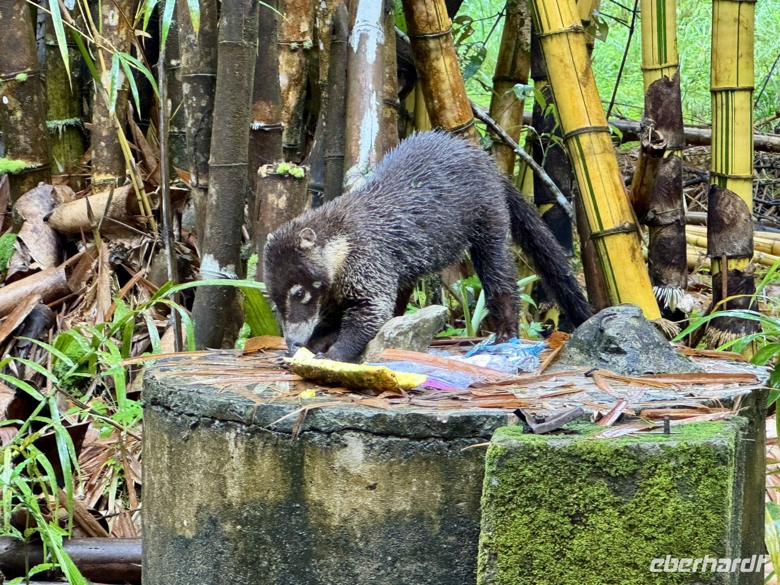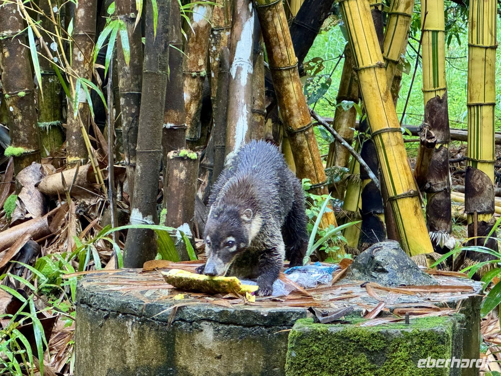 Auch am zweiten Morgen in Samara werden wir um 9:00 Uhr am Hotel abgeholt und hinten auf den bekannten Lkw verladen. Diesmal werden wir jedoch nicht zum Strand transferiert, sondern mitten im Wald abgesetzt. Es wird wohl ein Regenspaziergang werden. Inzwischen sind wir jedoch gut präpariert. Sowohl Sonnencreme als auch Regenschutz sind stets griffbereit. Unter einer Hütte suchen wir vorübergehend Schutz. Von oben beäugen uns neugierig die Langnasenfledermäuse. Kaum hat unser Guide Christopher mit seiner Einführung begonnen, lockt uns schon ein weiteres Tier mit einer langen Nase wieder ins Freie: ein Nasenbär. Genüsslich macht er sich über die Reste einer Ananas her und folgt uns sogar ein Stückchen, als wir schließlich in Richtung Aussichtspunkt aufbrechen. Christopher führt uns nun durch die historische Plantage. Unterwegs bekommen wir Erklärungen zur Entstehungsgeschichte des Reservats (es soll vorrangig als Wildtierkorridor dienen), zu einzelnen Pflanzen, zur historischen Bauweise, zu seinem Wildbienenprojekt und auch zu einigen Tierarten. Am Aussichtspunkt angekommen sehen wir allerdings … wenig bis gar nichts von der Bucht von Samara. Dazu ist das Wetter weiterhin zu schlecht, auch wenn der Regen nun kurzzeitig aufgehört hat. Der Nebel reißt zwar zwischendurch auf, sodass wir Strand, Meer, Inseln und auch das Riff einigermaßen gut sehen können. Da haben wir heute wirklich noch den besten Moment abgepasst, bevor das Wetter wieder umschlägt. Denselben Weg geht es wieder zurück zum Ausgangspunkt der Wanderung, wo nun auf UNS einige Scheiben Ananas und ein erfrischendes Getränk warten. Wir bedanken uns bei Christopher für den sehr interessanten Spaziergang und kehren zum Hotel zurück. Der Nachmittag bleibt tatsächlich halbwegs trocken, sodass sich für meine Gäste ein weiterer Spaziergang zum Strand anbietet. Gegen 16 Uhr funktioniert dann auch das Internet wieder, das seit der Nacht im ganzen Ort durch umgestürzte Bäume ausgefallen war. So kann ich an der kleinen Eisdiele doch noch zwei Kugeln Eis bezahlen, um mein Buchprojekt über die besten Eisdielen der Welt voranzutreiben. Den letzten Abend in Samara begehen wir abermals in einem Restaurant am Strand. Dafür haben Nico und ich diesmal ein Grillrestaurant ausgesucht, wo das Essen auf dem Rost über Holzkohle zubereitet wird.
