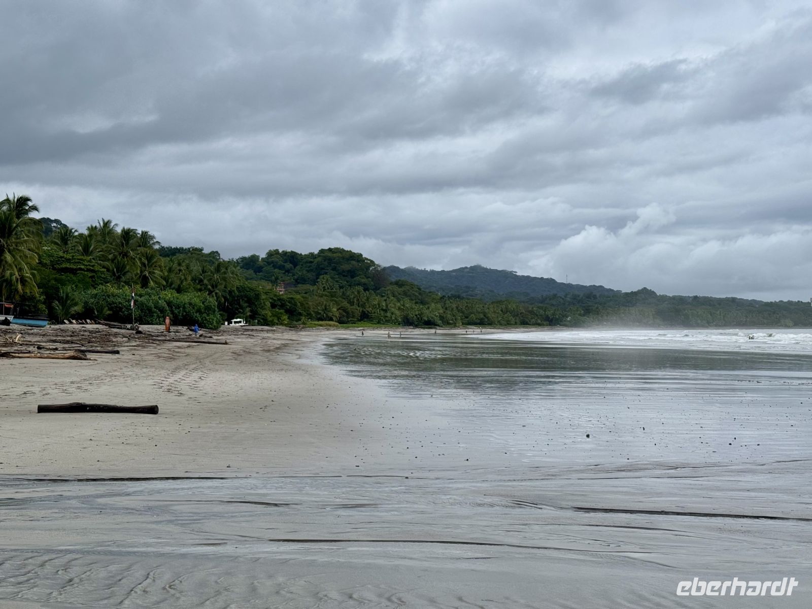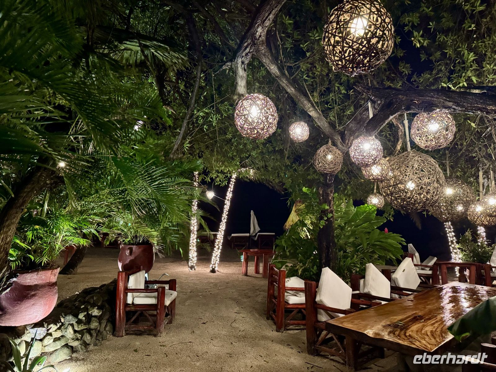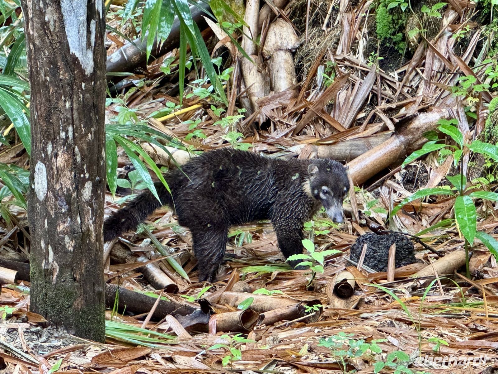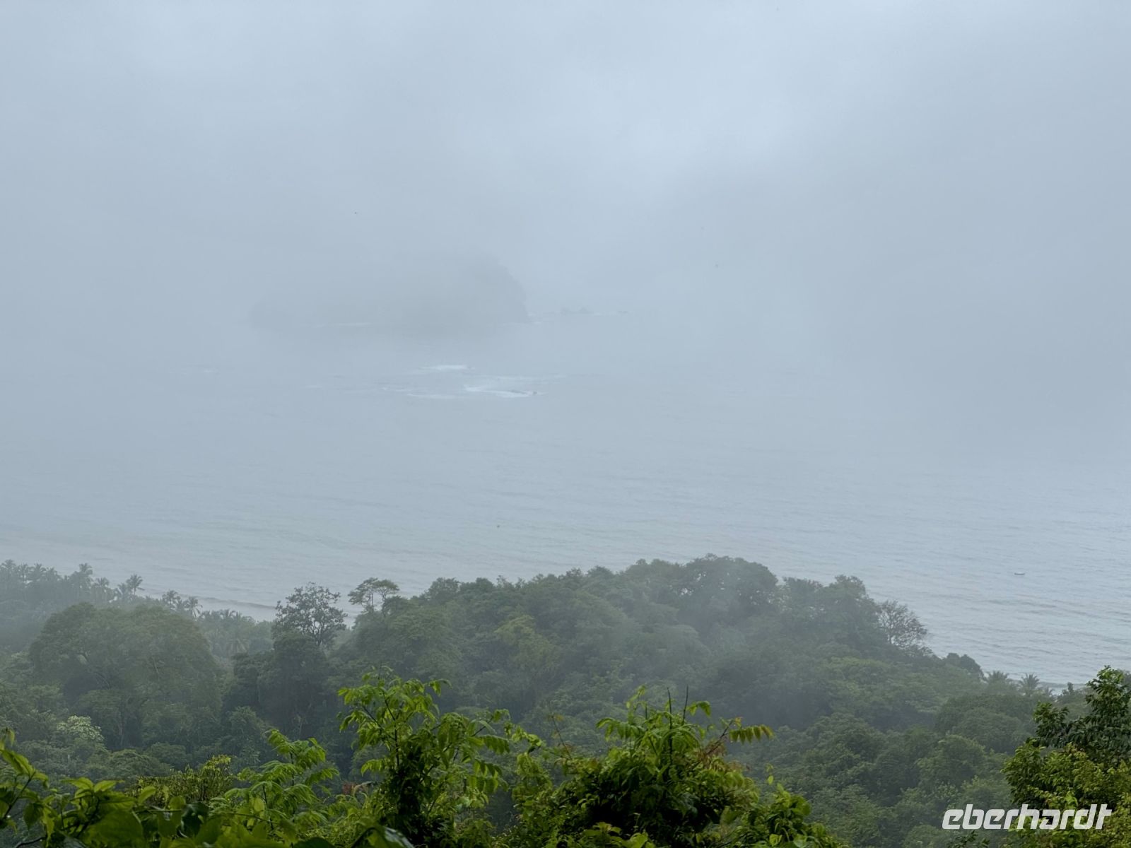 Auch am zweiten Morgen in Samara werden wir um 9:00 Uhr am Hotel abgeholt und hinten auf den bekannten Lkw verladen. Diesmal werden wir jedoch nicht zum Strand transferiert, sondern mitten im Wald abgesetzt. Es wird wohl ein Regenspaziergang werden. Inzwischen sind wir jedoch gut präpariert. Sowohl Sonnencreme als auch Regenschutz sind stets griffbereit. Unter einer Hütte suchen wir vorübergehend Schutz. Von oben beäugen uns neugierig die Langnasenfledermäuse. Kaum hat unser Guide Christopher mit seiner Einführung begonnen, lockt uns schon ein weiteres Tier mit einer langen Nase wieder ins Freie: ein Nasenbär. Genüsslich macht er sich über die Reste einer Ananas her und folgt uns sogar ein Stückchen, als wir schließlich in Richtung Aussichtspunkt aufbrechen. Christopher führt uns nun durch die historische Plantage. Unterwegs bekommen wir Erklärungen zur Entstehungsgeschichte des Reservats (es soll vorrangig als Wildtierkorridor dienen), zu einzelnen Pflanzen, zur historischen Bauweise, zu seinem Wildbienenprojekt und auch zu einigen Tierarten. Am Aussichtspunkt angekommen sehen wir allerdings … wenig bis gar nichts von der Bucht von Samara. Dazu ist das Wetter weiterhin zu schlecht, auch wenn der Regen nun kurzzeitig aufgehört hat. Der Nebel reißt zwar zwischendurch auf, sodass wir Strand, Meer, Inseln und auch das Riff einigermaßen gut sehen können. Da haben wir heute wirklich noch den besten Moment abgepasst, bevor das Wetter wieder umschlägt. Denselben Weg geht es wieder zurück zum Ausgangspunkt der Wanderung, wo nun auf UNS einige Scheiben Ananas und ein erfrischendes Getränk warten. Wir bedanken uns bei Christopher für den sehr interessanten Spaziergang und kehren zum Hotel zurück. Der Nachmittag bleibt tatsächlich halbwegs trocken, sodass sich für meine Gäste ein weiterer Spaziergang zum Strand anbietet. Gegen 16 Uhr funktioniert dann auch das Internet wieder, das seit der Nacht im ganzen Ort durch umgestürzte Bäume ausgefallen war. So kann ich an der kleinen Eisdiele doch noch zwei Kugeln Eis bezahlen, um mein Buchprojekt über die besten Eisdielen der Welt voranzutreiben. Den letzten Abend in Samara begehen wir abermals in einem Restaurant am Strand. Dafür haben Nico und ich diesmal ein Grillrestaurant ausgesucht, wo das Essen auf dem Rost über Holzkohle zubereitet wird.