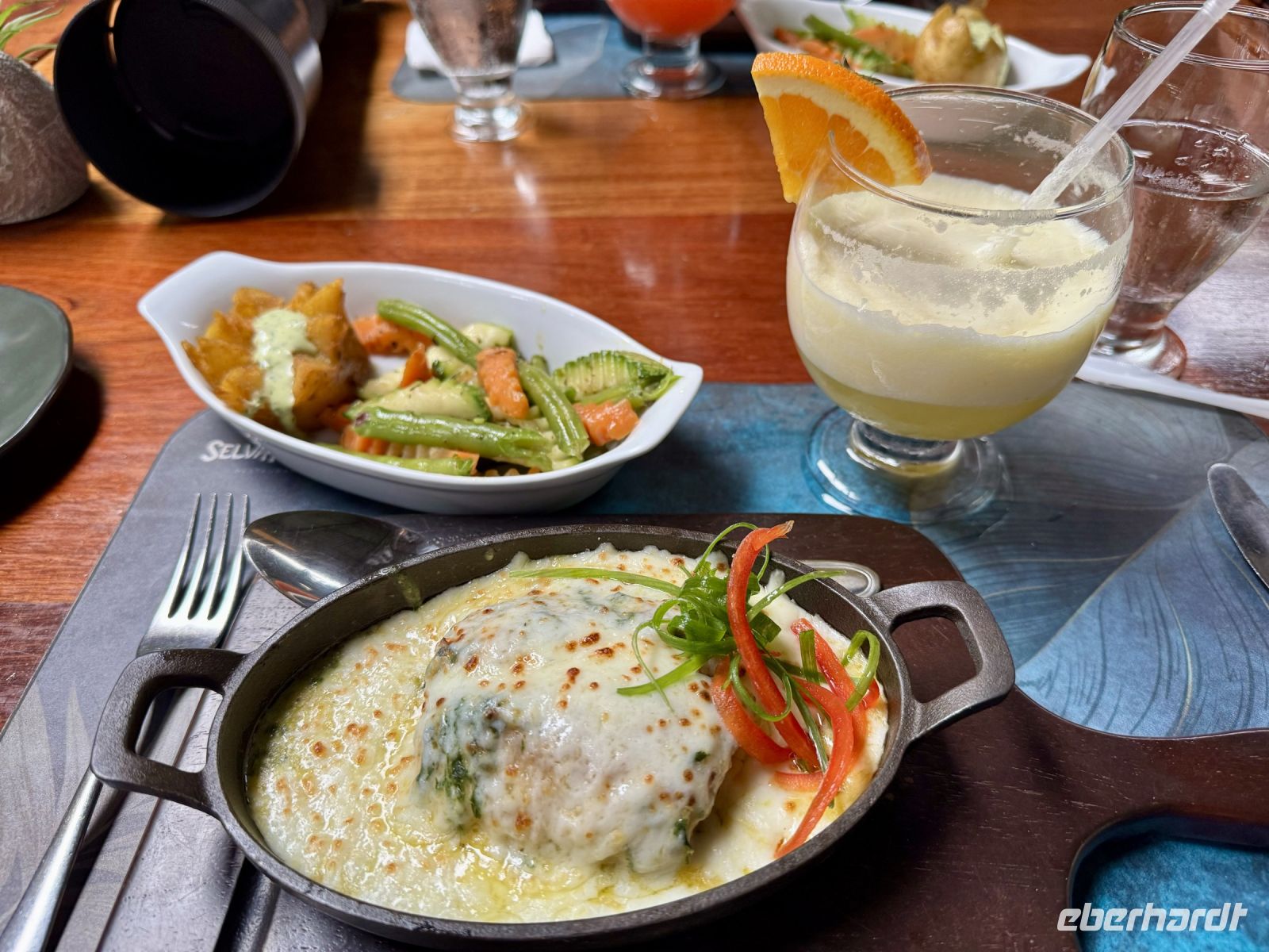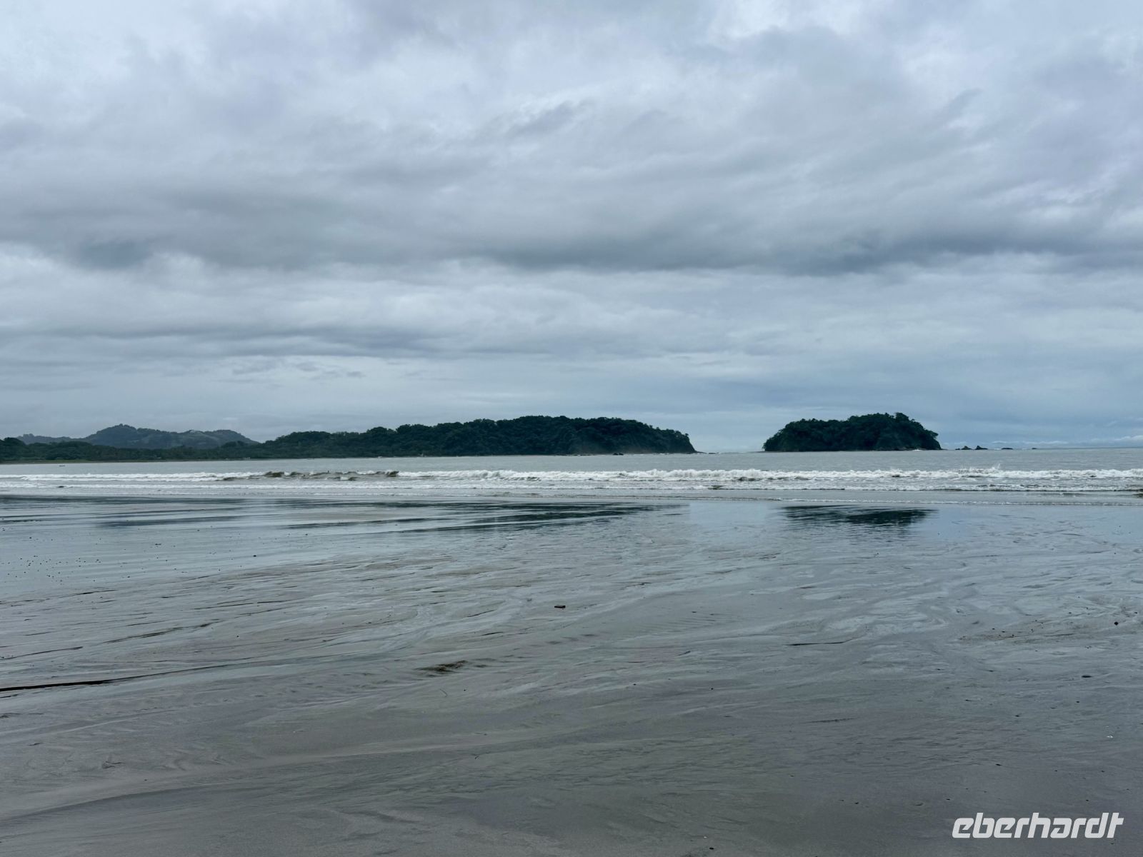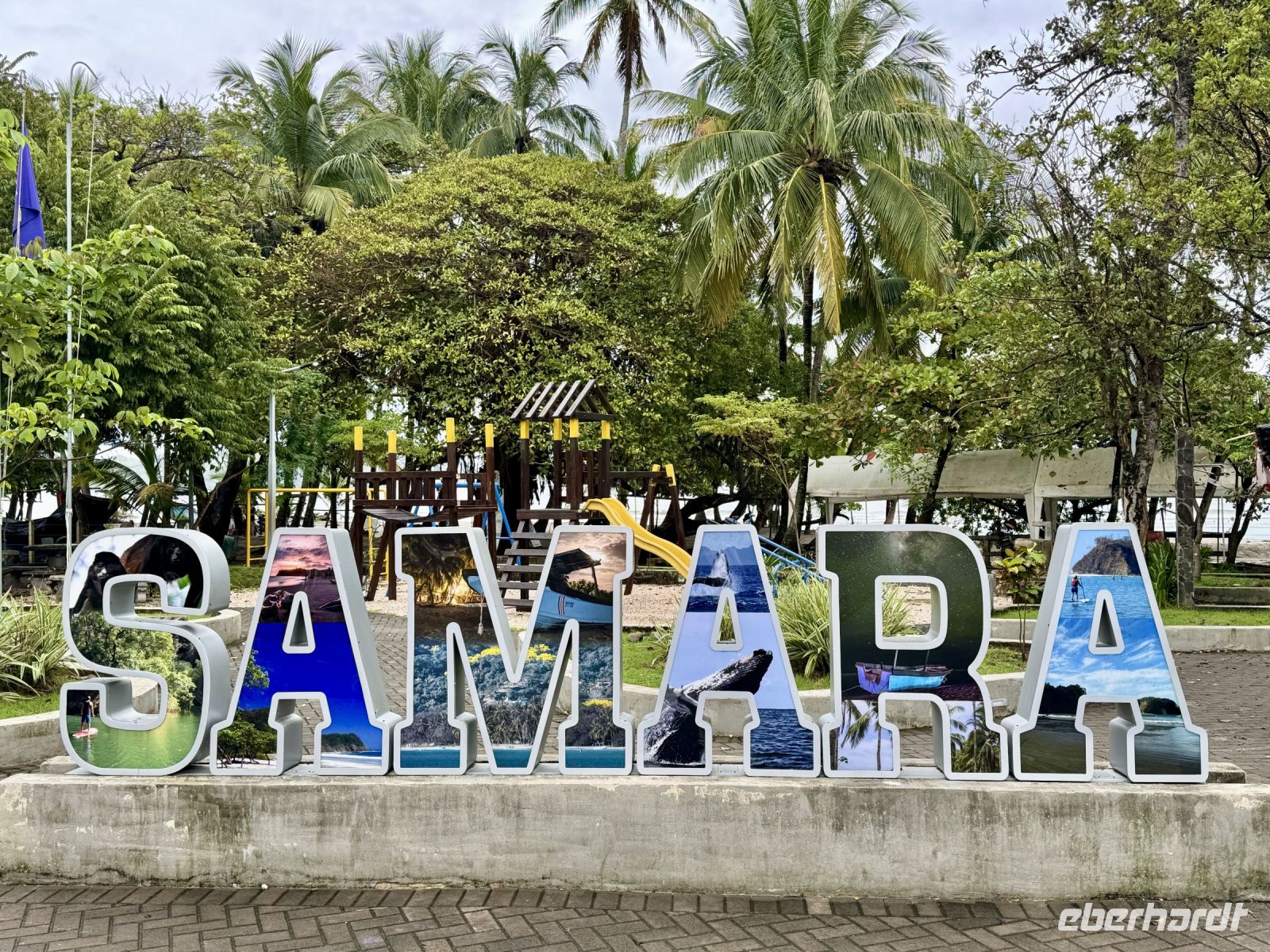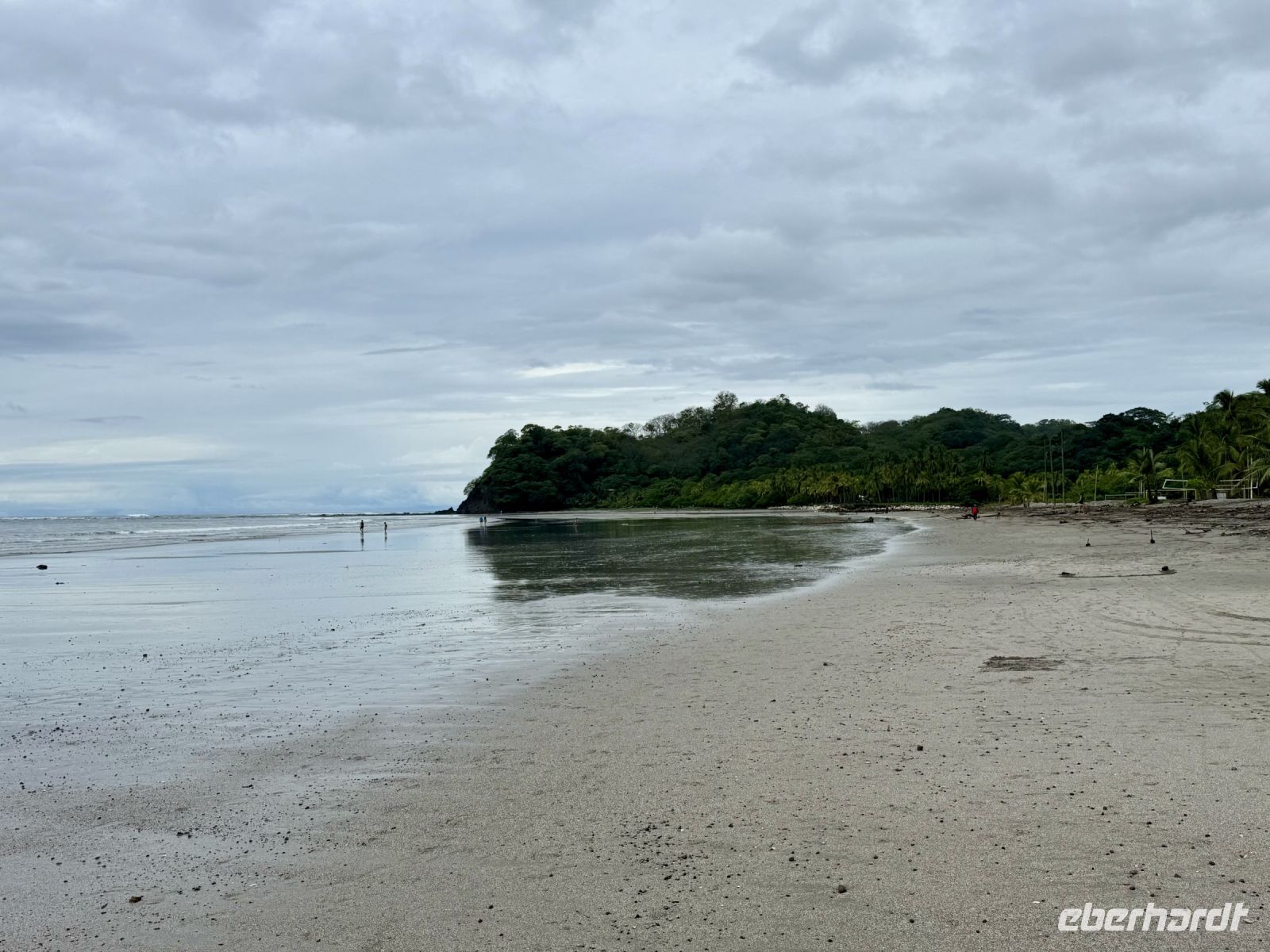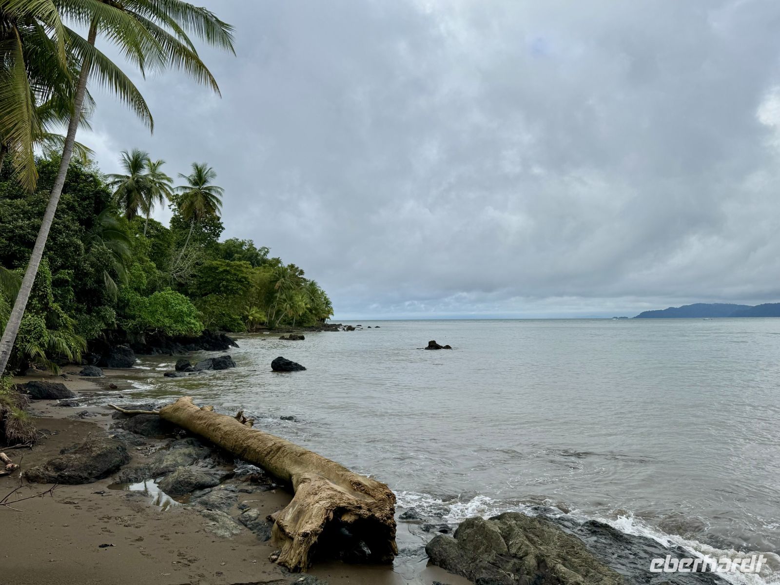 Auch am zweiten Morgen in Samara werden wir um 9:00 Uhr am Hotel abgeholt und hinten auf den bekannten Lkw verladen. Diesmal werden wir jedoch nicht zum Strand transferiert, sondern mitten im Wald abgesetzt. Es wird wohl ein Regenspaziergang werden. Inzwischen sind wir jedoch gut präpariert. Sowohl Sonnencreme als auch Regenschutz sind stets griffbereit. Unter einer Hütte suchen wir vorübergehend Schutz. Von oben beäugen uns neugierig die Langnasenfledermäuse. Kaum hat unser Guide Christopher mit seiner Einführung begonnen, lockt uns schon ein weiteres Tier mit einer langen Nase wieder ins Freie: ein Nasenbär. Genüsslich macht er sich über die Reste einer Ananas her und folgt uns sogar ein Stückchen, als wir schließlich in Richtung Aussichtspunkt aufbrechen. Christopher führt uns nun durch die historische Plantage. Unterwegs bekommen wir Erklärungen zur Entstehungsgeschichte des Reservats (es soll vorrangig als Wildtierkorridor dienen), zu einzelnen Pflanzen, zur historischen Bauweise, zu seinem Wildbienenprojekt und auch zu einigen Tierarten. Am Aussichtspunkt angekommen sehen wir allerdings … wenig bis gar nichts von der Bucht von Samara. Dazu ist das Wetter weiterhin zu schlecht, auch wenn der Regen nun kurzzeitig aufgehört hat. Der Nebel reißt zwar zwischendurch auf, sodass wir Strand, Meer, Inseln und auch das Riff einigermaßen gut sehen können. Da haben wir heute wirklich noch den besten Moment abgepasst, bevor das Wetter wieder umschlägt. Denselben Weg geht es wieder zurück zum Ausgangspunkt der Wanderung, wo nun auf UNS einige Scheiben Ananas und ein erfrischendes Getränk warten. Wir bedanken uns bei Christopher für den sehr interessanten Spaziergang und kehren zum Hotel zurück. Der Nachmittag bleibt tatsächlich halbwegs trocken, sodass sich für meine Gäste ein weiterer Spaziergang zum Strand anbietet. Gegen 16 Uhr funktioniert dann auch das Internet wieder, das seit der Nacht im ganzen Ort durch umgestürzte Bäume ausgefallen war. So kann ich an der kleinen Eisdiele doch noch zwei Kugeln Eis bezahlen, um mein Buchprojekt über die besten Eisdielen der Welt voranzutreiben. Den letzten Abend in Samara begehen wir abermals in einem Restaurant am Strand. Dafür haben Nico und ich diesmal ein Grillrestaurant ausgesucht, wo das Essen auf dem Rost über Holzkohle zubereitet wird.