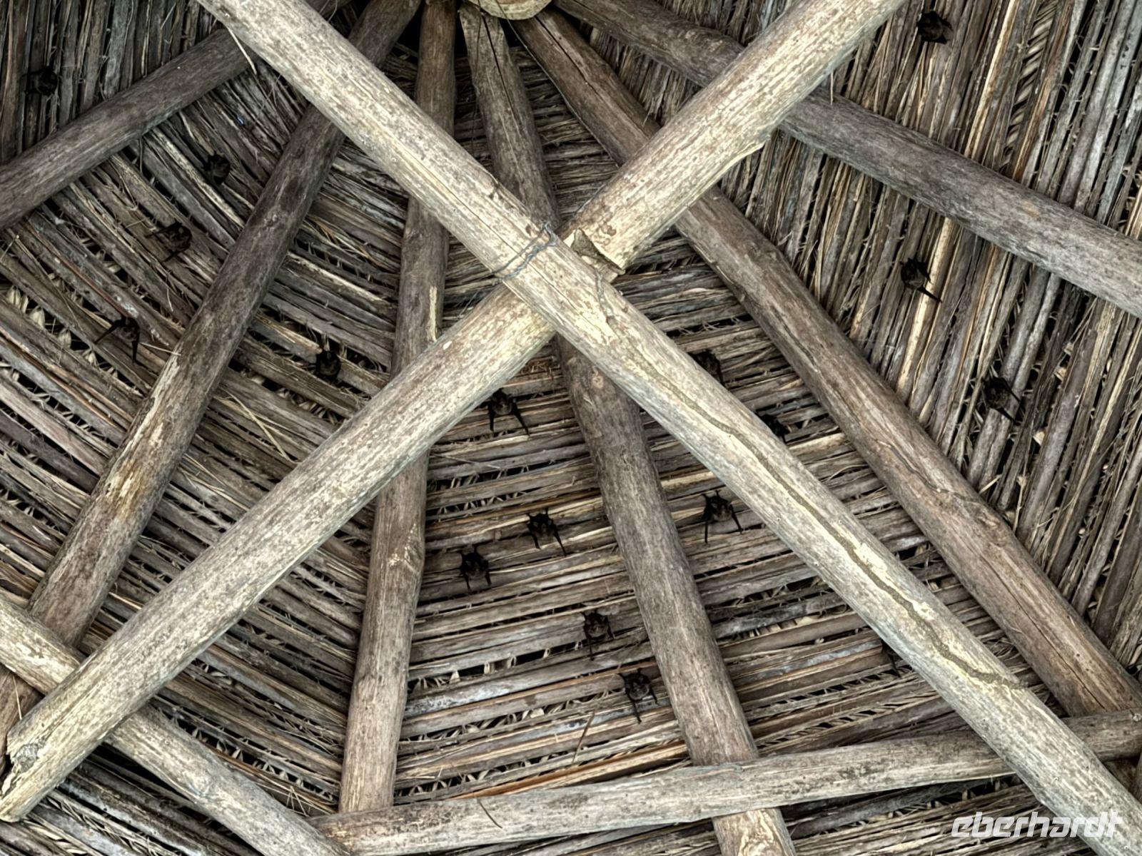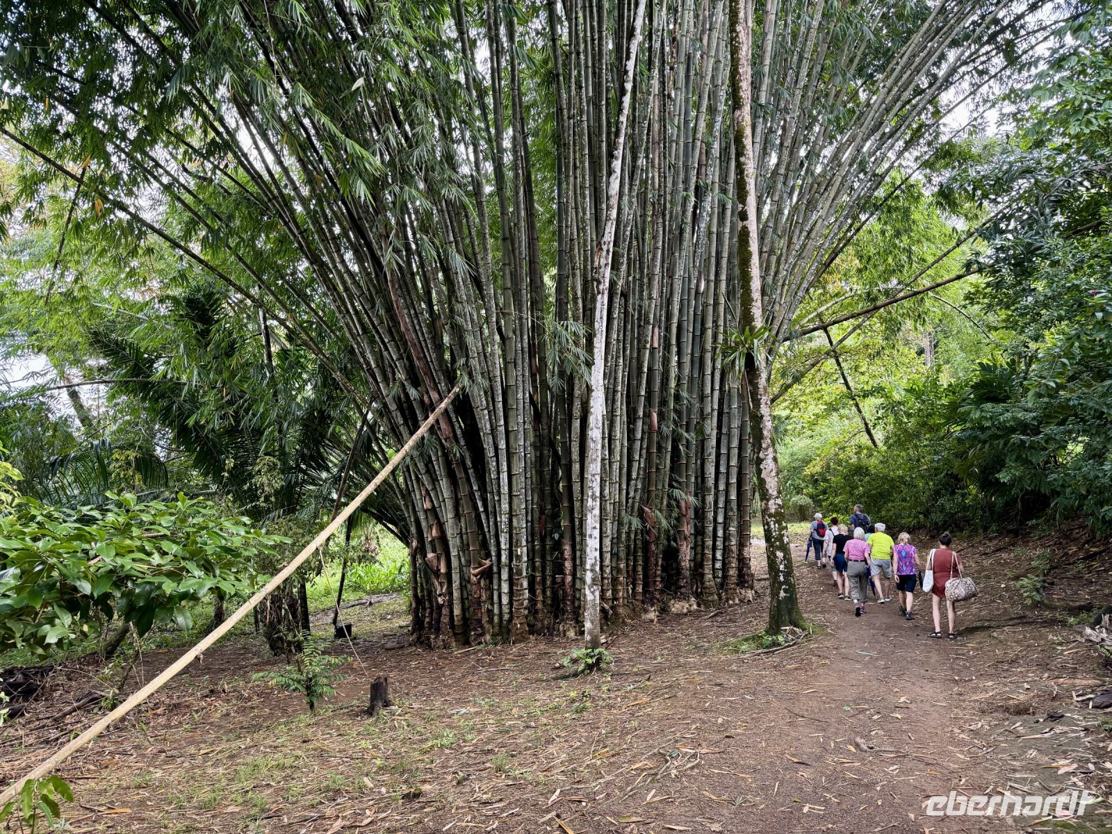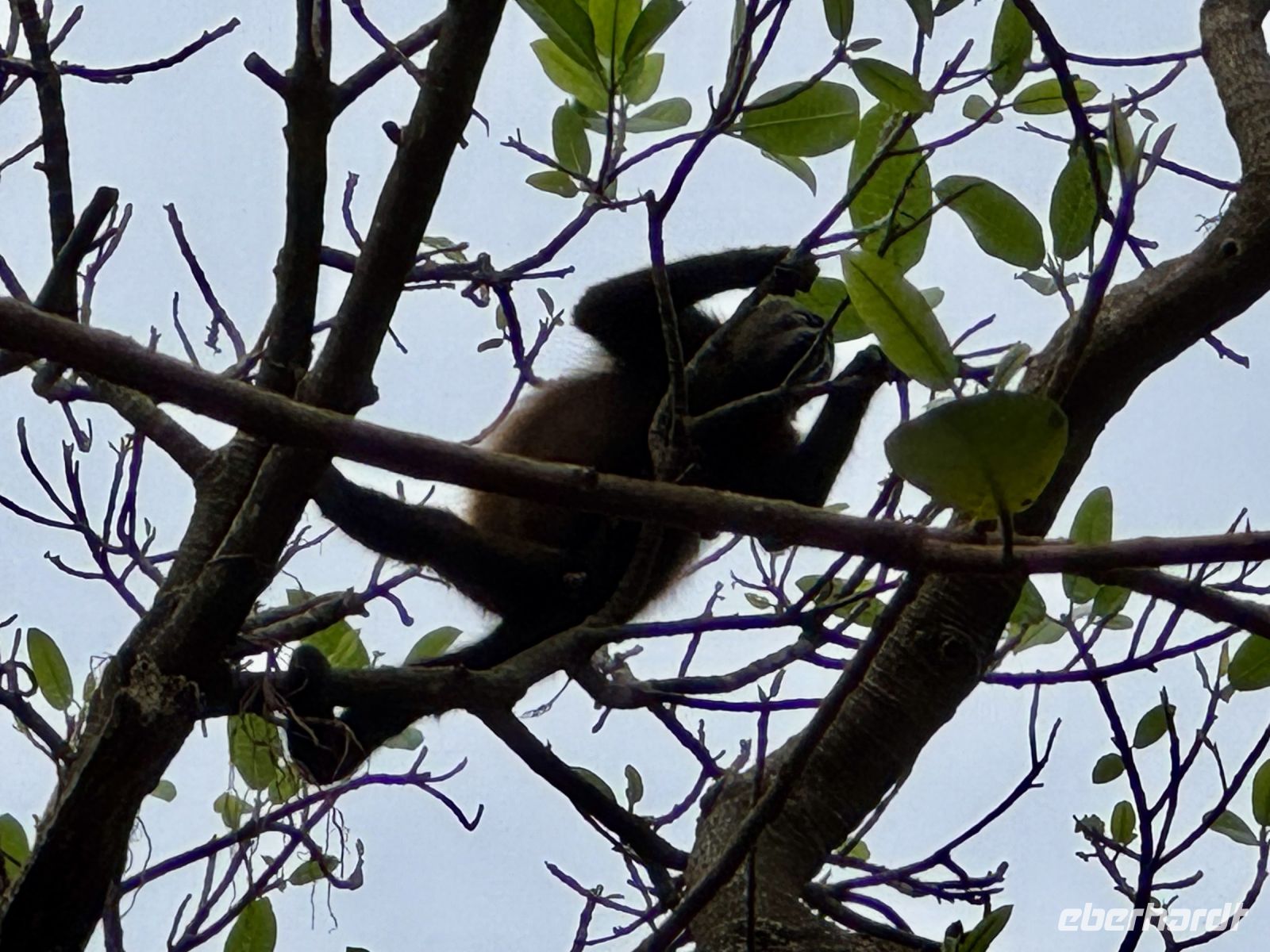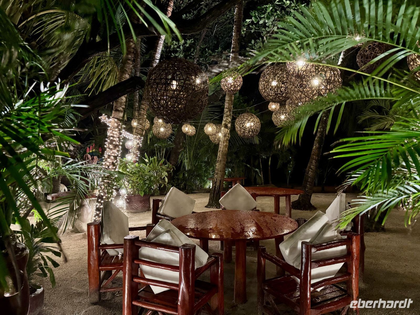 Auch am zweiten Morgen in Samara werden wir um 9:00 Uhr am Hotel abgeholt und hinten auf den bekannten Lkw verladen. Diesmal werden wir jedoch nicht zum Strand transferiert, sondern mitten im Wald abgesetzt. Es wird wohl ein Regenspaziergang werden. Inzwischen sind wir jedoch gut präpariert. Sowohl Sonnencreme als auch Regenschutz sind stets griffbereit. Unter einer Hütte suchen wir vorübergehend Schutz. Von oben beäugen uns neugierig die Langnasenfledermäuse. Kaum hat unser Guide Christopher mit seiner Einführung begonnen, lockt uns schon ein weiteres Tier mit einer langen Nase wieder ins Freie: ein Nasenbär. Genüsslich macht er sich über die Reste einer Ananas her und folgt uns sogar ein Stückchen, als wir schließlich in Richtung Aussichtspunkt aufbrechen. Christopher führt uns nun durch die historische Plantage. Unterwegs bekommen wir Erklärungen zur Entstehungsgeschichte des Reservats (es soll vorrangig als Wildtierkorridor dienen), zu einzelnen Pflanzen, zur historischen Bauweise, zu seinem Wildbienenprojekt und auch zu einigen Tierarten. Am Aussichtspunkt angekommen sehen wir allerdings … wenig bis gar nichts von der Bucht von Samara. Dazu ist das Wetter weiterhin zu schlecht, auch wenn der Regen nun kurzzeitig aufgehört hat. Der Nebel reißt zwar zwischendurch auf, sodass wir Strand, Meer, Inseln und auch das Riff einigermaßen gut sehen können. Da haben wir heute wirklich noch den besten Moment abgepasst, bevor das Wetter wieder umschlägt. Denselben Weg geht es wieder zurück zum Ausgangspunkt der Wanderung, wo nun auf UNS einige Scheiben Ananas und ein erfrischendes Getränk warten. Wir bedanken uns bei Christopher für den sehr interessanten Spaziergang und kehren zum Hotel zurück. Der Nachmittag bleibt tatsächlich halbwegs trocken, sodass sich für meine Gäste ein weiterer Spaziergang zum Strand anbietet. Gegen 16 Uhr funktioniert dann auch das Internet wieder, das seit der Nacht im ganzen Ort durch umgestürzte Bäume ausgefallen war. So kann ich an der kleinen Eisdiele doch noch zwei Kugeln Eis bezahlen, um mein Buchprojekt über die besten Eisdielen der Welt voranzutreiben. Den letzten Abend in Samara begehen wir abermals in einem Restaurant am Strand. Dafür haben Nico und ich diesmal ein Grillrestaurant ausgesucht, wo das Essen auf dem Rost über Holzkohle zubereitet wird.