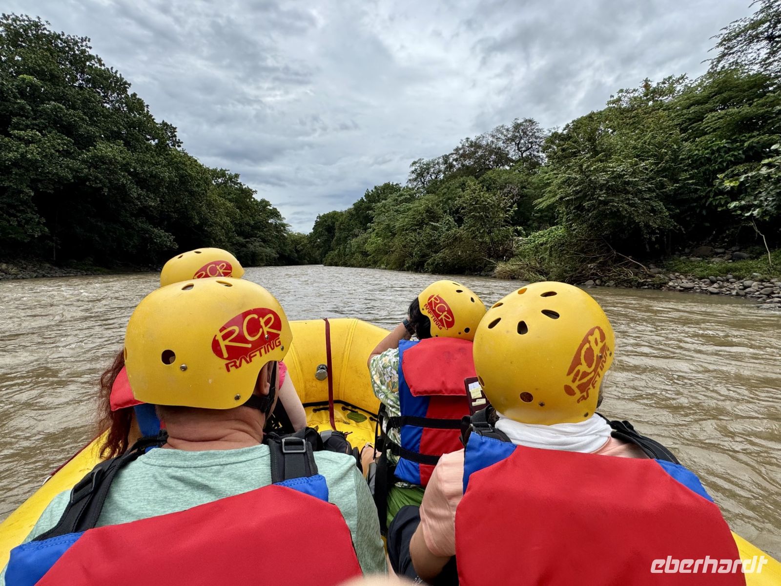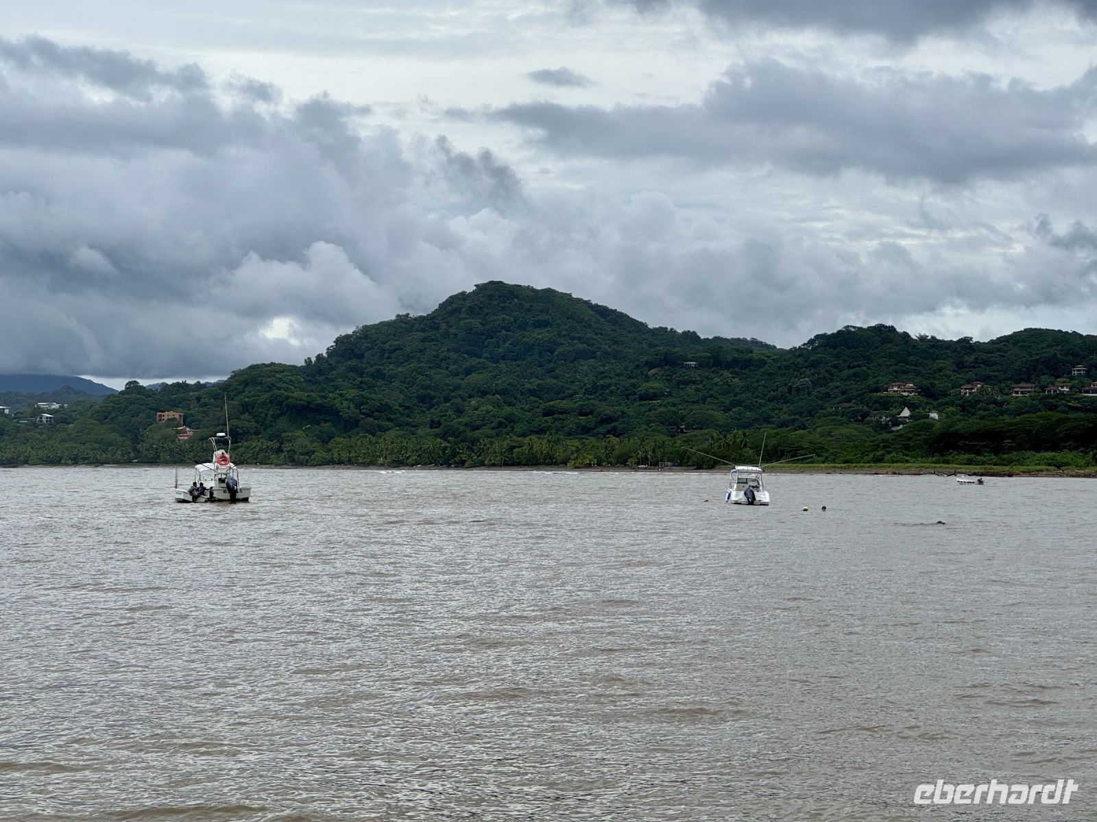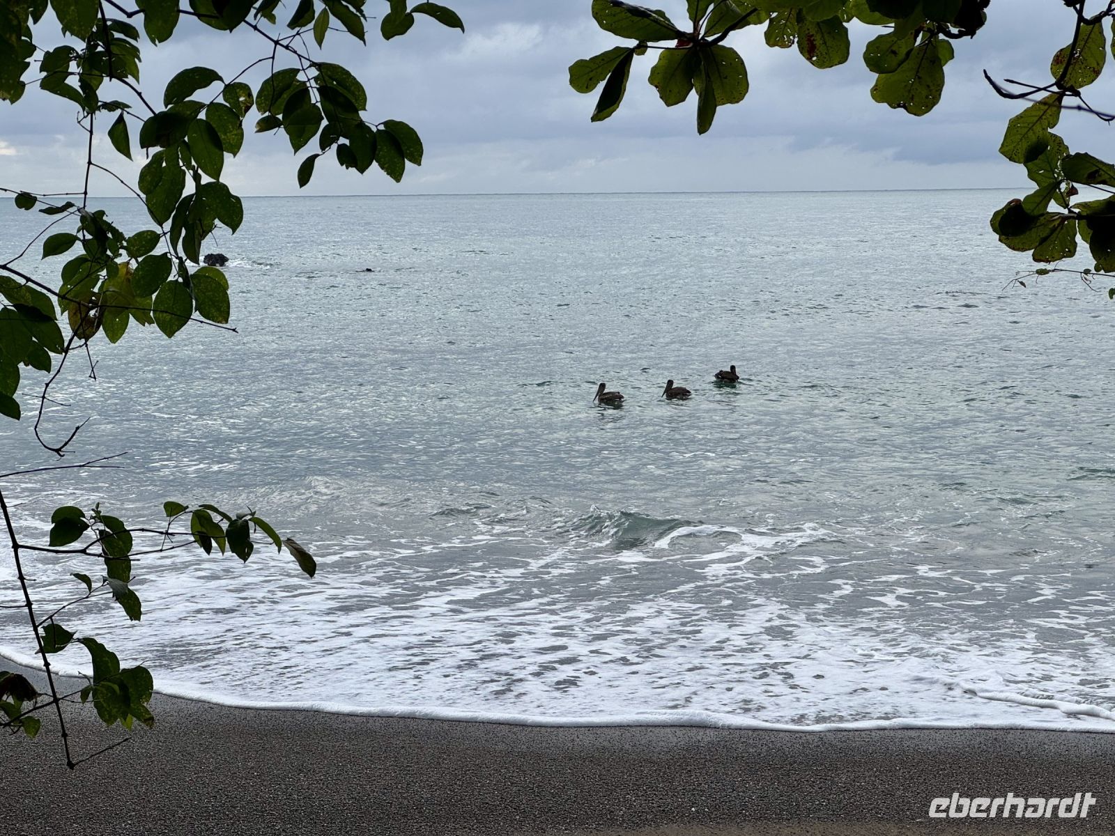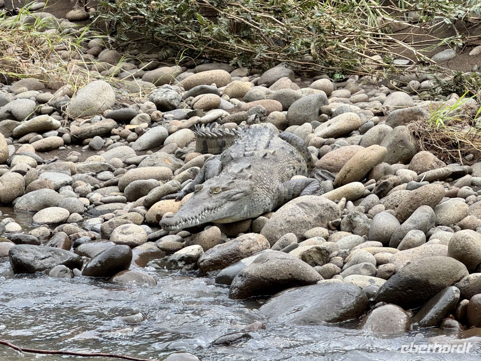 Nach zwei Nächten in La Fortuna verlassen wir die Gegend um den Vulkan Arenal. Ihm scheint das nicht zu gefallen, denn er schmollt und versteckt sich heute hinter dicken Wolken. Nico erzählt uns trotzdem einiges zu seiner Ausbruchsgeschichte. Am Arenal-Stausee machen wir einen ersten kleinen Stopp. Inzwischen hat es sich wieder so richtig eingeregnet. Da hatten wir am Morgen wieder richtig Glück, dass wir trockenen Hauptes zum Frühstück und zurück laufen konnten. Parallel zum See geht es nun erstmal weiter durch die grüne Vegetation. Linker Hand sehen wir immer mal wieder das Wasser. Wir überqueren die Grenze zur Provinz Guanacaste. Kaum zu glauben, dass es hier in ein paar Monaten staubtrocken sein soll, wie uns Nico erzählt. Noch ist alles grün. Zu unserer River Floating Tour werden wir schon erwartet. Die Guides sind ebenso aufgeregt wie wir, denn die Tour findet wohl seit 10 Tagen zum ersten Mal wieder statt. Entsprechend hungrig müssen die Krokodile sein … Vom Restaurant aus, in dem wir später dann auch unser Mittagessen bekommen werden, betrachten wir misstrauisch den angeschwollenen Fluss mit seiner starken Strömung und schicken ein Stoßgebet zum Himmel, dass sich das Wetter hält. Im Moment regnet es nämlich gerade nicht. Als wir dann wenig später mit Helm und Schwimmweste ausgestattet in den beiden Schlauchbooten sitzen und die erste Stromschnelle passieren, kommen uns Strömung und Fluss aus der Nähe betrachtet nur noch halb so schlimm vor. Stattdessen gilt unsere Aufmerksamkeit nun den Krokodilen, an die uns unsere Guides für meinen persönlichen Geschmack viel zu nah heransteuern. Aber gut, man(n) muss ja nur schneller schwimmen können als der Rest der Gruppe. Vom Wasser aus sehen wir zudem mehrere große Leguane, verschiedene Reiher und andere Vögel, Fledermäuse und Brüllaffen (Nico führt während der Reise akribisch Protokoll über die angetroffenen Tiere). Schade, denke ich bei mir, als wir am Ziel ankommen und wieder aussteigen müssen, die Affen hätte ich gern mehr aus der Nähe gesehen. Kaum sind wir ein paar Schritte in Richtung Bus gelaufen, hängen sie auch schon über unseren Köpfen in den Bäumen, die Brüllaffen, und lassen sich in aller Ruhe fotografieren. Da wäre jeder Tierfilmer neidisch. Hera fährt uns mit dem Bus zurück zum Restaurant, d. h. dem Ausgangspunkt der Tour, wo nun das vorbestellte Mittagessen auf uns wartet. Es gibt auch wieder Casado, aber sogar in einer noch besseren Variante und mit einem leckeren Kuchen als Nachtisch. Wir scheinen heute zur Abwechslung das Wetterglück im Wetterunglück gepachtet zu haben, denn während wir genüsslich unser Dessert löffeln, öffnet der Himmel wieder alle Schleusen. Und zum weiteren Glück steht für den Nachmittag nur noch die Weiterfahrt durch Nicoya bis nach Samara auf dem Programm. Unser Hotel befindet sich nicht weit vom Pazifikstrand entfernt und wird von einer deutschen Auswandererfamilie geführt. Sie haben sich in Samara ein wirklich schönes Anwesen aufgebaut — hier werden wir es bestimmt drei Nächte aushalten. Nico versichert uns, dass uns auch das Frühstück gut gefallen wird. Da sind wir schon gespannt. Am Abend kämpfen wir uns durch den Regen die ca. 450 Meter zum Abendessen in einer schicken Pizzeria am Strand. Es ist stürmischer geworden und der Wind pfeift durch die mit Lichterketten geschmückten Palmen. Die Beleuchtung, das Pfeifen des Windes, das Rauschen der Wellen – eine kitschige und verregnete, aber dennoch schöne Atmosphäre. Dazu gibt es leckere Pizza, was wollen wir mehr! Auf dem Rückweg hört sogar der Regen auf. Vielleicht wird ja morgen wieder besseres Wetter? Für die geplante Delfinbeobachtung wäre es sicher gut.
