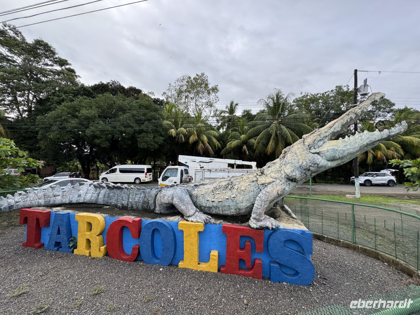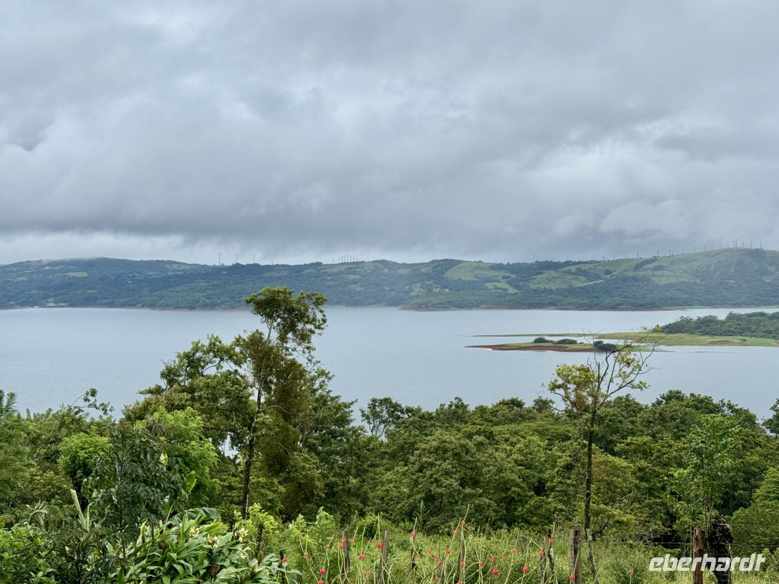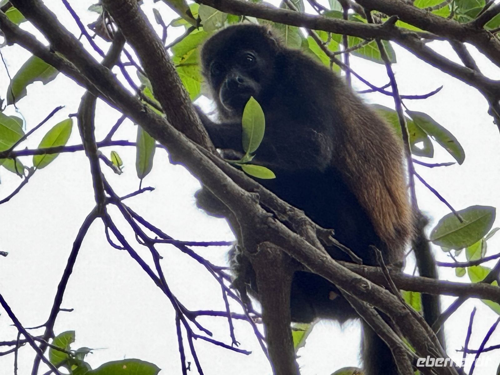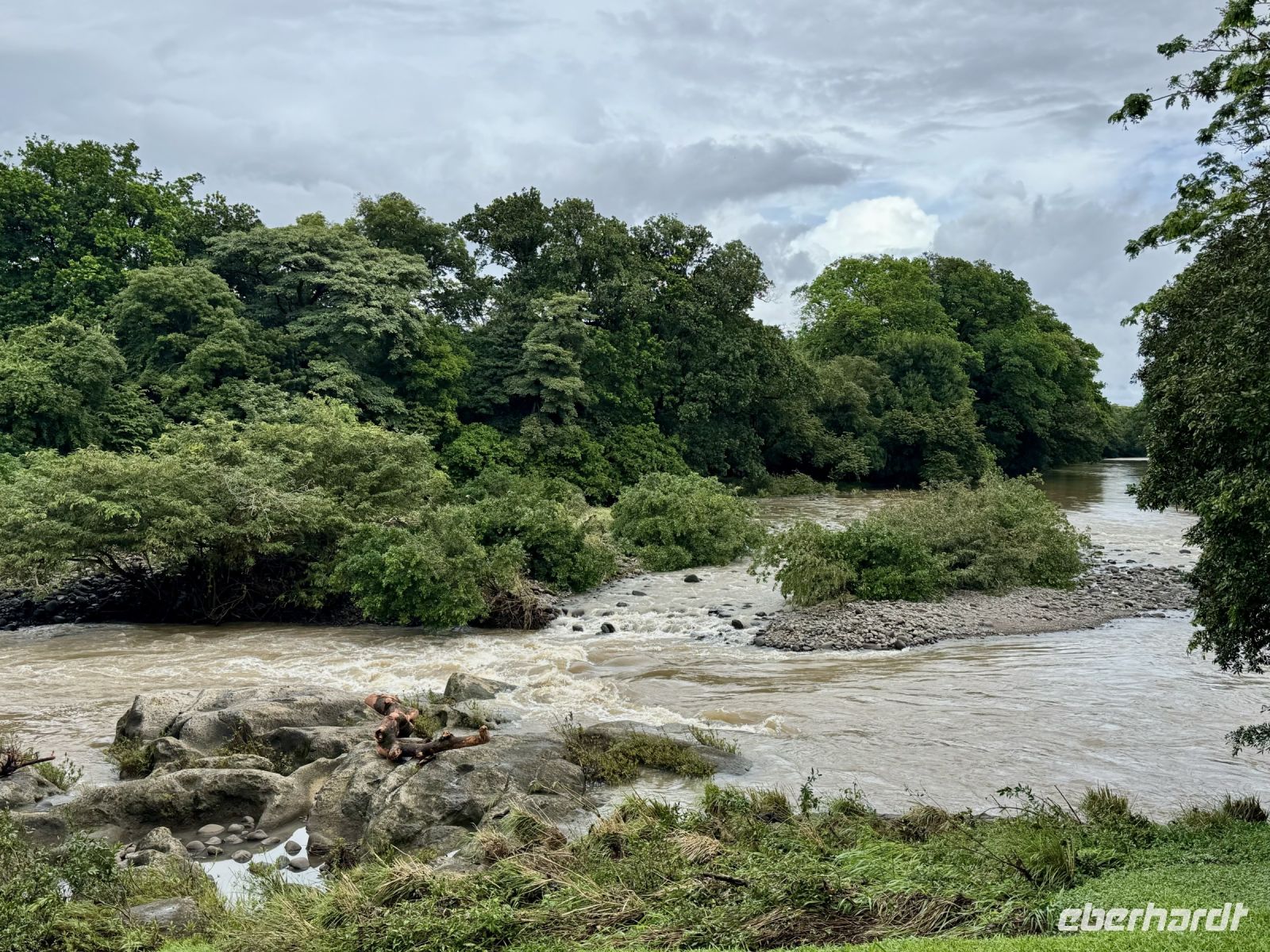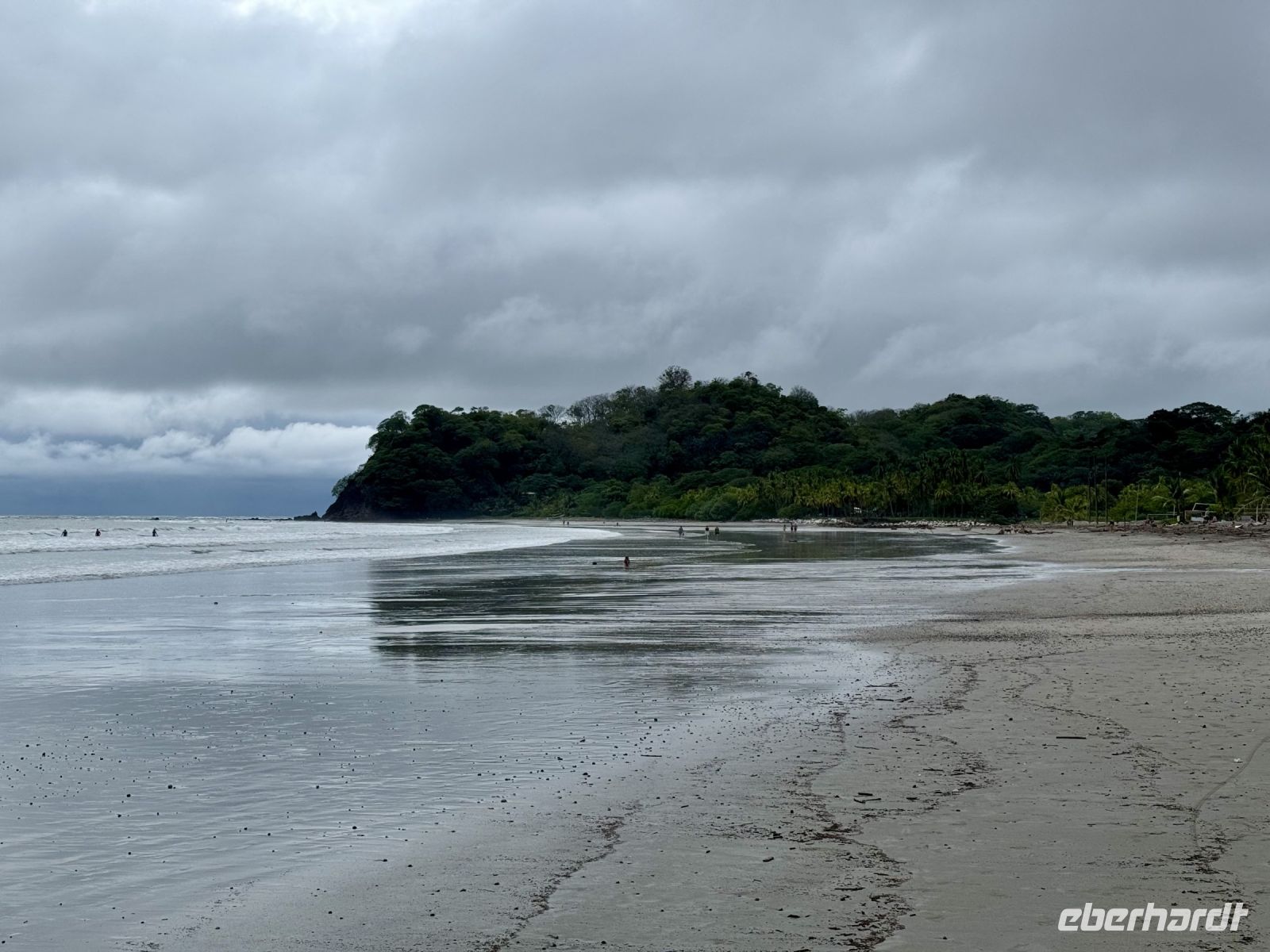 Nach zwei Nächten in La Fortuna verlassen wir die Gegend um den Vulkan Arenal. Ihm scheint das nicht zu gefallen, denn er schmollt und versteckt sich heute hinter dicken Wolken. Nico erzählt uns trotzdem einiges zu seiner Ausbruchsgeschichte. Am Arenal-Stausee machen wir einen ersten kleinen Stopp. Inzwischen hat es sich wieder so richtig eingeregnet. Da hatten wir am Morgen wieder richtig Glück, dass wir trockenen Hauptes zum Frühstück und zurück laufen konnten. Parallel zum See geht es nun erstmal weiter durch die grüne Vegetation. Linker Hand sehen wir immer mal wieder das Wasser. Wir überqueren die Grenze zur Provinz Guanacaste. Kaum zu glauben, dass es hier in ein paar Monaten staubtrocken sein soll, wie uns Nico erzählt. Noch ist alles grün. Zu unserer River Floating Tour werden wir schon erwartet. Die Guides sind ebenso aufgeregt wie wir, denn die Tour findet wohl seit 10 Tagen zum ersten Mal wieder statt. Entsprechend hungrig müssen die Krokodile sein … Vom Restaurant aus, in dem wir später dann auch unser Mittagessen bekommen werden, betrachten wir misstrauisch den angeschwollenen Fluss mit seiner starken Strömung und schicken ein Stoßgebet zum Himmel, dass sich das Wetter hält. Im Moment regnet es nämlich gerade nicht. Als wir dann wenig später mit Helm und Schwimmweste ausgestattet in den beiden Schlauchbooten sitzen und die erste Stromschnelle passieren, kommen uns Strömung und Fluss aus der Nähe betrachtet nur noch halb so schlimm vor. Stattdessen gilt unsere Aufmerksamkeit nun den Krokodilen, an die uns unsere Guides für meinen persönlichen Geschmack viel zu nah heransteuern. Aber gut, man(n) muss ja nur schneller schwimmen können als der Rest der Gruppe. Vom Wasser aus sehen wir zudem mehrere große Leguane, verschiedene Reiher und andere Vögel, Fledermäuse und Brüllaffen (Nico führt während der Reise akribisch Protokoll über die angetroffenen Tiere). Schade, denke ich bei mir, als wir am Ziel ankommen und wieder aussteigen müssen, die Affen hätte ich gern mehr aus der Nähe gesehen. Kaum sind wir ein paar Schritte in Richtung Bus gelaufen, hängen sie auch schon über unseren Köpfen in den Bäumen, die Brüllaffen, und lassen sich in aller Ruhe fotografieren. Da wäre jeder Tierfilmer neidisch. Hera fährt uns mit dem Bus zurück zum Restaurant, d. h. dem Ausgangspunkt der Tour, wo nun das vorbestellte Mittagessen auf uns wartet. Es gibt auch wieder Casado, aber sogar in einer noch besseren Variante und mit einem leckeren Kuchen als Nachtisch. Wir scheinen heute zur Abwechslung das Wetterglück im Wetterunglück gepachtet zu haben, denn während wir genüsslich unser Dessert löffeln, öffnet der Himmel wieder alle Schleusen. Und zum weiteren Glück steht für den Nachmittag nur noch die Weiterfahrt durch Nicoya bis nach Samara auf dem Programm. Unser Hotel befindet sich nicht weit vom Pazifikstrand entfernt und wird von einer deutschen Auswandererfamilie geführt. Sie haben sich in Samara ein wirklich schönes Anwesen aufgebaut — hier werden wir es bestimmt drei Nächte aushalten. Nico versichert uns, dass uns auch das Frühstück gut gefallen wird. Da sind wir schon gespannt. Am Abend kämpfen wir uns durch den Regen die ca. 450 Meter zum Abendessen in einer schicken Pizzeria am Strand. Es ist stürmischer geworden und der Wind pfeift durch die mit Lichterketten geschmückten Palmen. Die Beleuchtung, das Pfeifen des Windes, das Rauschen der Wellen – eine kitschige und verregnete, aber dennoch schöne Atmosphäre. Dazu gibt es leckere Pizza, was wollen wir mehr! Auf dem Rückweg hört sogar der Regen auf. Vielleicht wird ja morgen wieder besseres Wetter? Für die geplante Delfinbeobachtung wäre es sicher gut.