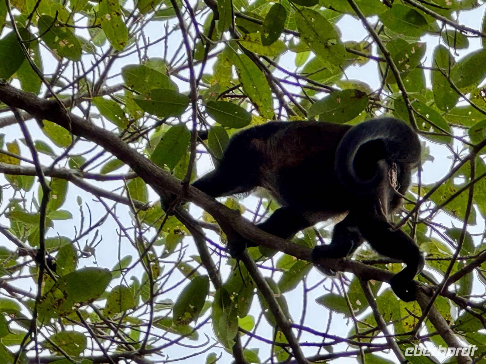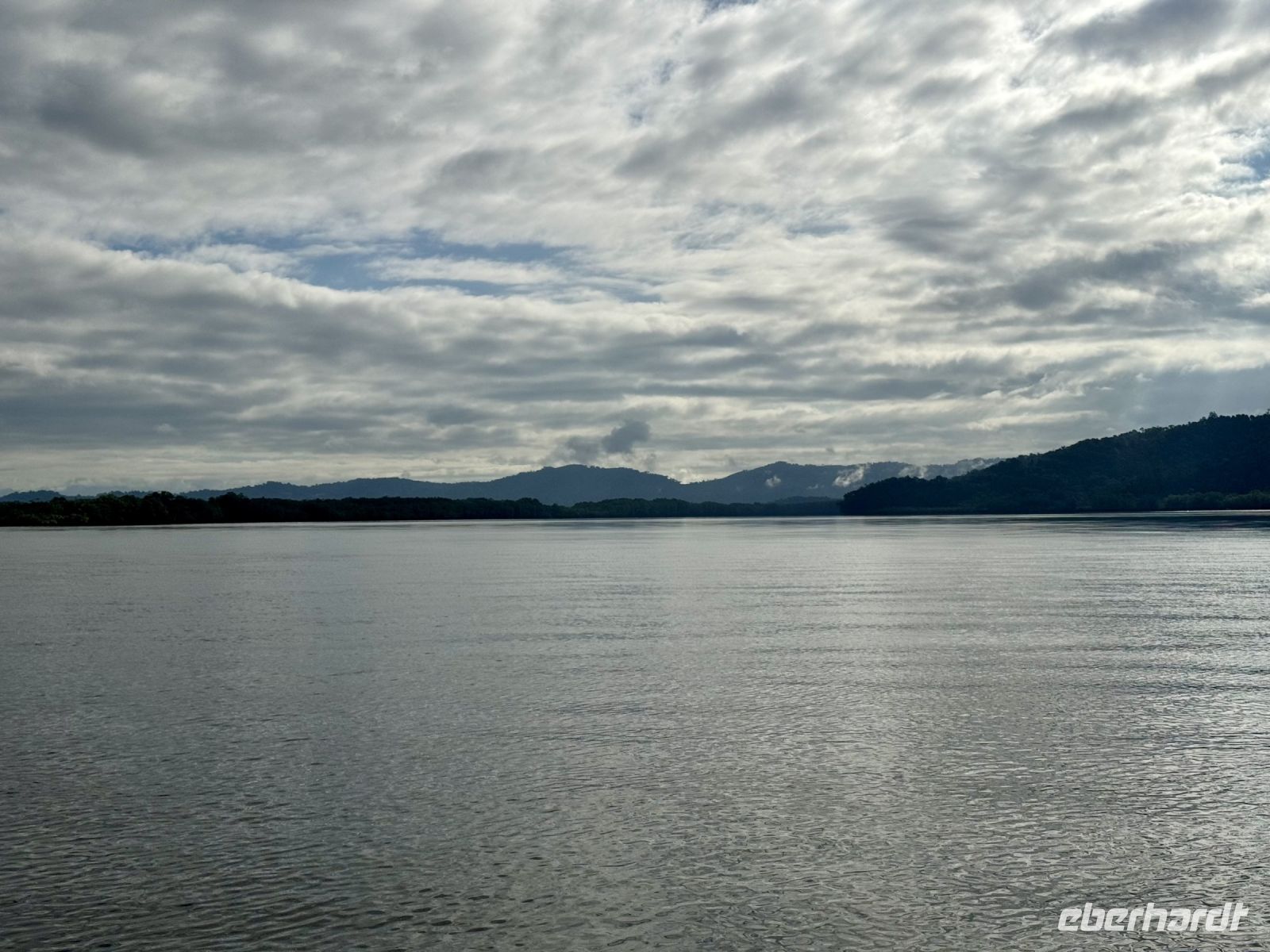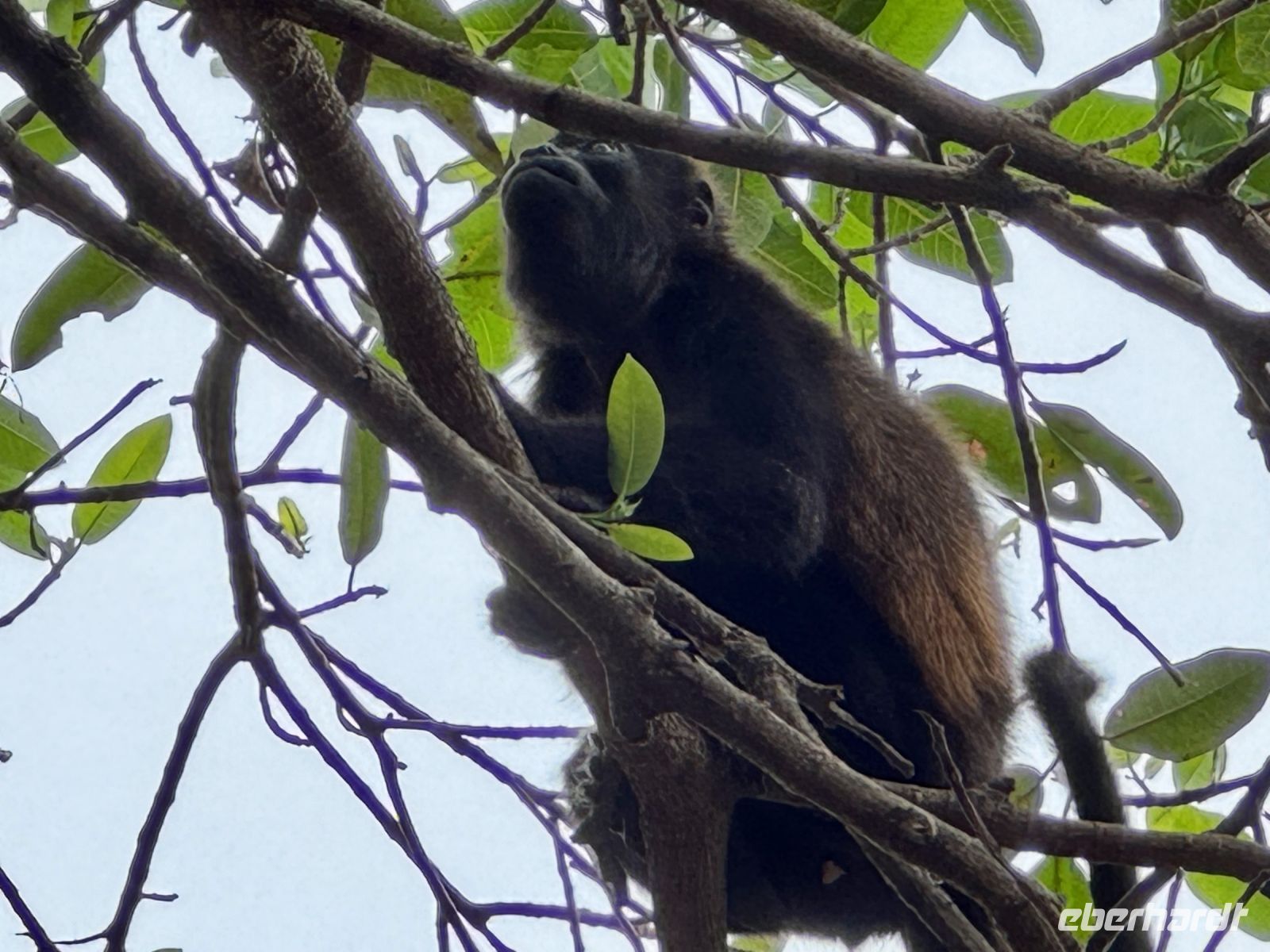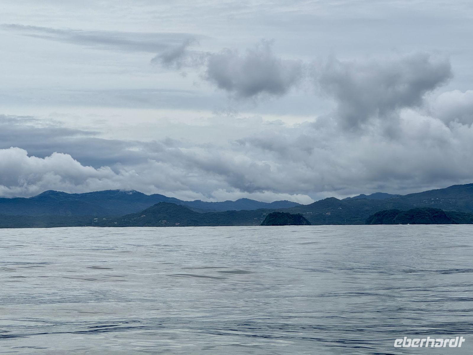 Nach zwei Nächten in La Fortuna verlassen wir die Gegend um den Vulkan Arenal. Ihm scheint das nicht zu gefallen, denn er schmollt und versteckt sich heute hinter dicken Wolken. Nico erzählt uns trotzdem einiges zu seiner Ausbruchsgeschichte. Am Arenal-Stausee machen wir einen ersten kleinen Stopp. Inzwischen hat es sich wieder so richtig eingeregnet. Da hatten wir am Morgen wieder richtig Glück, dass wir trockenen Hauptes zum Frühstück und zurück laufen konnten. Parallel zum See geht es nun erstmal weiter durch die grüne Vegetation. Linker Hand sehen wir immer mal wieder das Wasser. Wir überqueren die Grenze zur Provinz Guanacaste. Kaum zu glauben, dass es hier in ein paar Monaten staubtrocken sein soll, wie uns Nico erzählt. Noch ist alles grün. Zu unserer River Floating Tour werden wir schon erwartet. Die Guides sind ebenso aufgeregt wie wir, denn die Tour findet wohl seit 10 Tagen zum ersten Mal wieder statt. Entsprechend hungrig müssen die Krokodile sein … Vom Restaurant aus, in dem wir später dann auch unser Mittagessen bekommen werden, betrachten wir misstrauisch den angeschwollenen Fluss mit seiner starken Strömung und schicken ein Stoßgebet zum Himmel, dass sich das Wetter hält. Im Moment regnet es nämlich gerade nicht. Als wir dann wenig später mit Helm und Schwimmweste ausgestattet in den beiden Schlauchbooten sitzen und die erste Stromschnelle passieren, kommen uns Strömung und Fluss aus der Nähe betrachtet nur noch halb so schlimm vor. Stattdessen gilt unsere Aufmerksamkeit nun den Krokodilen, an die uns unsere Guides für meinen persönlichen Geschmack viel zu nah heransteuern. Aber gut, man(n) muss ja nur schneller schwimmen können als der Rest der Gruppe. Vom Wasser aus sehen wir zudem mehrere große Leguane, verschiedene Reiher und andere Vögel, Fledermäuse und Brüllaffen (Nico führt während der Reise akribisch Protokoll über die angetroffenen Tiere). Schade, denke ich bei mir, als wir am Ziel ankommen und wieder aussteigen müssen, die Affen hätte ich gern mehr aus der Nähe gesehen. Kaum sind wir ein paar Schritte in Richtung Bus gelaufen, hängen sie auch schon über unseren Köpfen in den Bäumen, die Brüllaffen, und lassen sich in aller Ruhe fotografieren. Da wäre jeder Tierfilmer neidisch. Hera fährt uns mit dem Bus zurück zum Restaurant, d. h. dem Ausgangspunkt der Tour, wo nun das vorbestellte Mittagessen auf uns wartet. Es gibt auch wieder Casado, aber sogar in einer noch besseren Variante und mit einem leckeren Kuchen als Nachtisch. Wir scheinen heute zur Abwechslung das Wetterglück im Wetterunglück gepachtet zu haben, denn während wir genüsslich unser Dessert löffeln, öffnet der Himmel wieder alle Schleusen. Und zum weiteren Glück steht für den Nachmittag nur noch die Weiterfahrt durch Nicoya bis nach Samara auf dem Programm. Unser Hotel befindet sich nicht weit vom Pazifikstrand entfernt und wird von einer deutschen Auswandererfamilie geführt. Sie haben sich in Samara ein wirklich schönes Anwesen aufgebaut — hier werden wir es bestimmt drei Nächte aushalten. Nico versichert uns, dass uns auch das Frühstück gut gefallen wird. Da sind wir schon gespannt. Am Abend kämpfen wir uns durch den Regen die ca. 450 Meter zum Abendessen in einer schicken Pizzeria am Strand. Es ist stürmischer geworden und der Wind pfeift durch die mit Lichterketten geschmückten Palmen. Die Beleuchtung, das Pfeifen des Windes, das Rauschen der Wellen – eine kitschige und verregnete, aber dennoch schöne Atmosphäre. Dazu gibt es leckere Pizza, was wollen wir mehr! Auf dem Rückweg hört sogar der Regen auf. Vielleicht wird ja morgen wieder besseres Wetter? Für die geplante Delfinbeobachtung wäre es sicher gut.