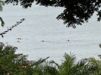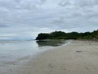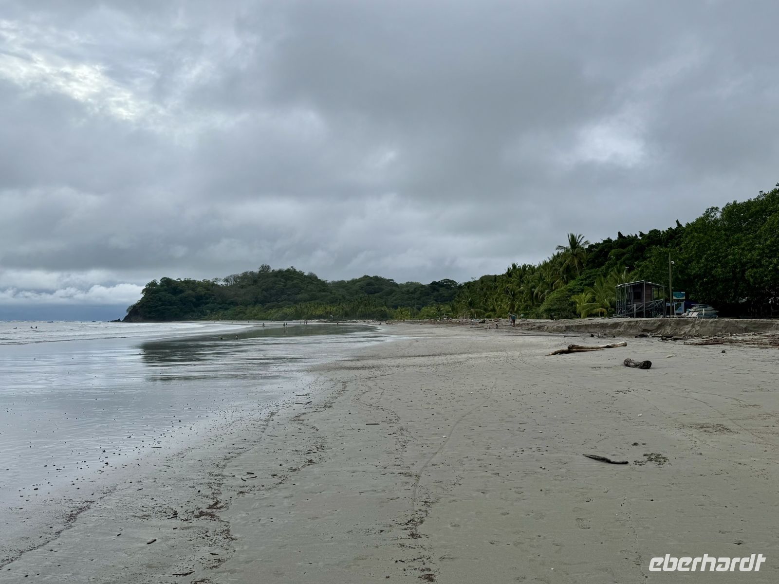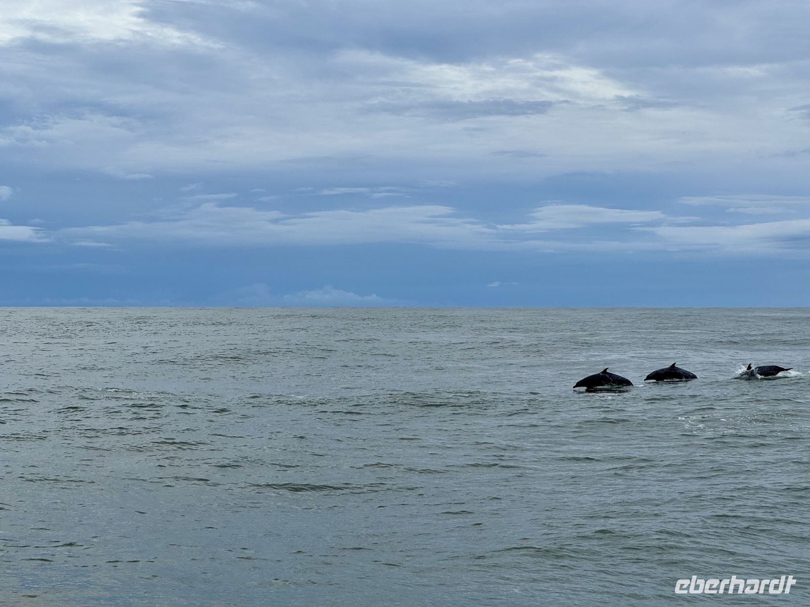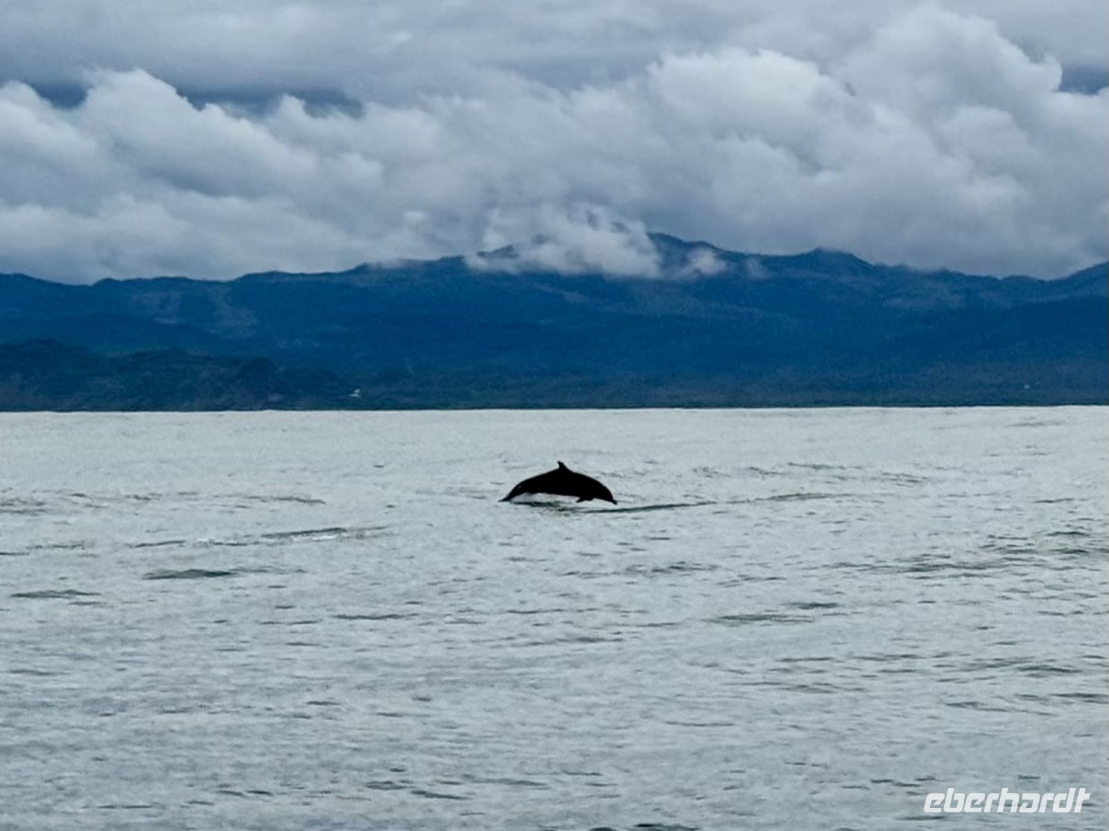 Da es in den letzten Tagen viel, sehr viel geregnet hat, kann die Kajaktour zu den Mangroven leider nicht stattfinden. Stattdessen machen wir heute alle die Bootstour zu den Delfinen, die für den morgigen Tag als fakultative Option angeboten wurde. Nach einem sehr guten Frühstück werden wir vom Hotel abgeholt. Genau genommen nehmen wir hinten auf der Ladefläche eines Lkws Platz. Es geht also schon recht abenteuerlich los. Am Strand wird es nicht viel besser. Einige Straßenhunde kommen gleich auf uns zu. Zwischen dem angespülten Strandgut suchen sie nach Aufmerksamkeit und Streicheleinheiten. Die hölzernen Boote am Strand erwecken nicht gerade Vertrauen. Worauf haben wir uns hier eingelassen? Doch es ist ein stabiles modernes Beiboot, das uns abholt. Ein kleines Stück müssen wir durchs Wasser waten, um einsteigen zu können. Unser Katamaran für die Tour liegt ein paar Meter vom Strand entfernt in der Bucht. Damit hüpfen wir nun über die Wellen und begeben uns auf die Suche nach Delfinen. Zunächst stoßen wir draußen auf dem Meer jedoch nur auf ein schwarzes Piratenschiff vor Anker. Weiter nordwestlich sind wir dann plötzlich von etwa 500 Schlankdelfinen (laut Schätzung der Crew) umgeben, die in kleinen Grüppchen zusammen schwimmen, tauchen, aus dem Wasser springen, spielen. Auf meinen Reisen bin ich schon einige Male auf Delfine getroffen, aber so ein Erlebnis hatte ich noch nie. Am liebsten würde ich ins Wasser hüpfen und mit ihnen weiterziehen. Was wohl ihr nächstes Ziel ist? Wir folgen ihnen ungefähr 20–30 Minuten, bevor wir abdrehen und in Richtung Samara zurückfahren. In der Bucht wird noch ein Stopp zum Baden eingelegt; Nico springt natürlich sofort ins Wasser. Am Strand warten unsere Schuhe auf uns, die wir hier zurückgelassen hatten, sowie drei Hunde, die fleißig darauf aufgepasst haben. Welches Glück wir wieder hatten, merken wir nach unserer Rückkehr ins Hotel. Da fängt es nämlich wieder an zu regnen. Am Nachmittag/Abend folgt jedoch nochmals eine trockene Phase. Die meisten von uns nutzen den freien Nachmittag für einen Spaziergang am Strand. Zum Abendessen geht es auch wieder ans Meer, diesmal allerdings in eine Strandbar.