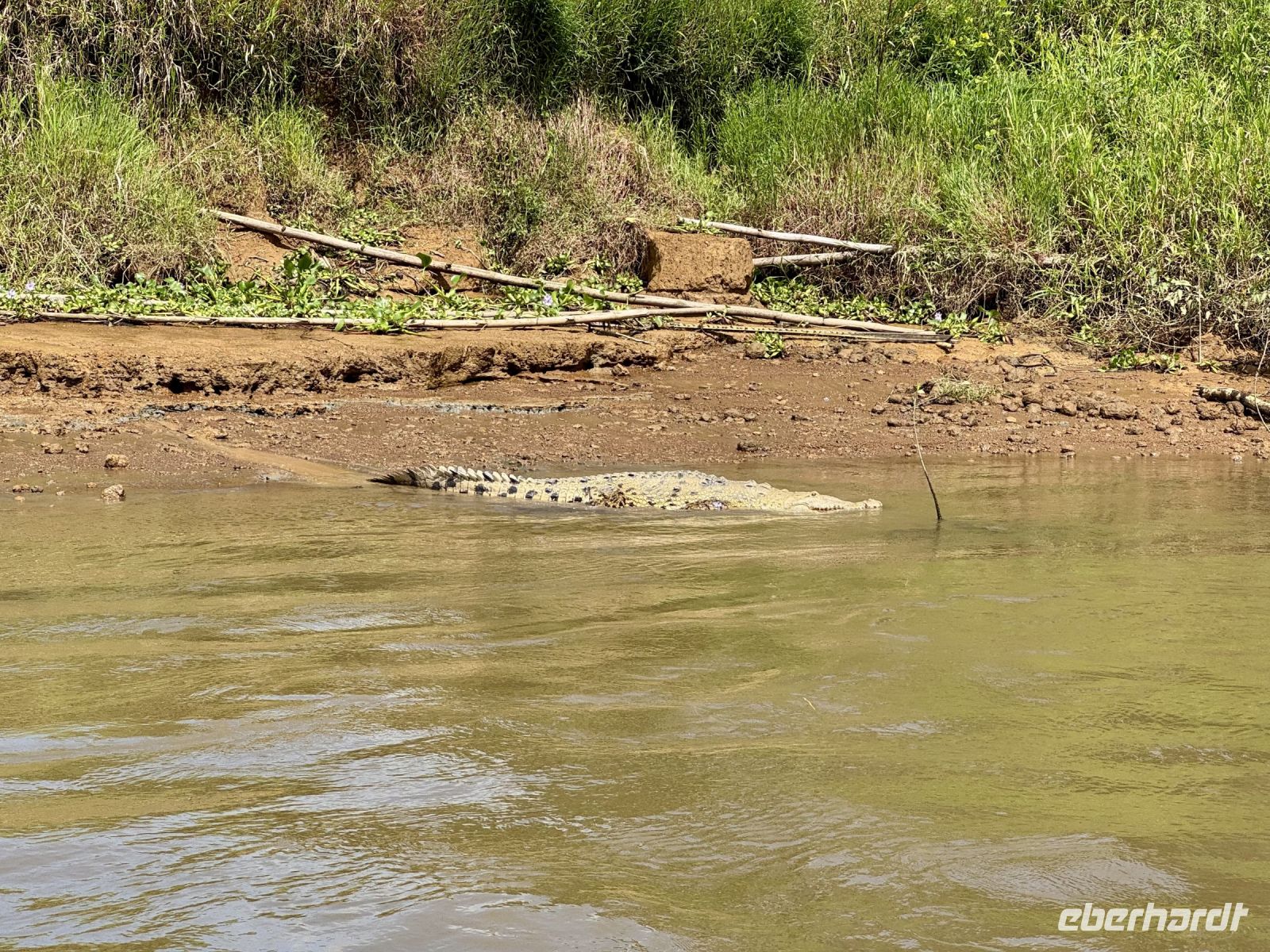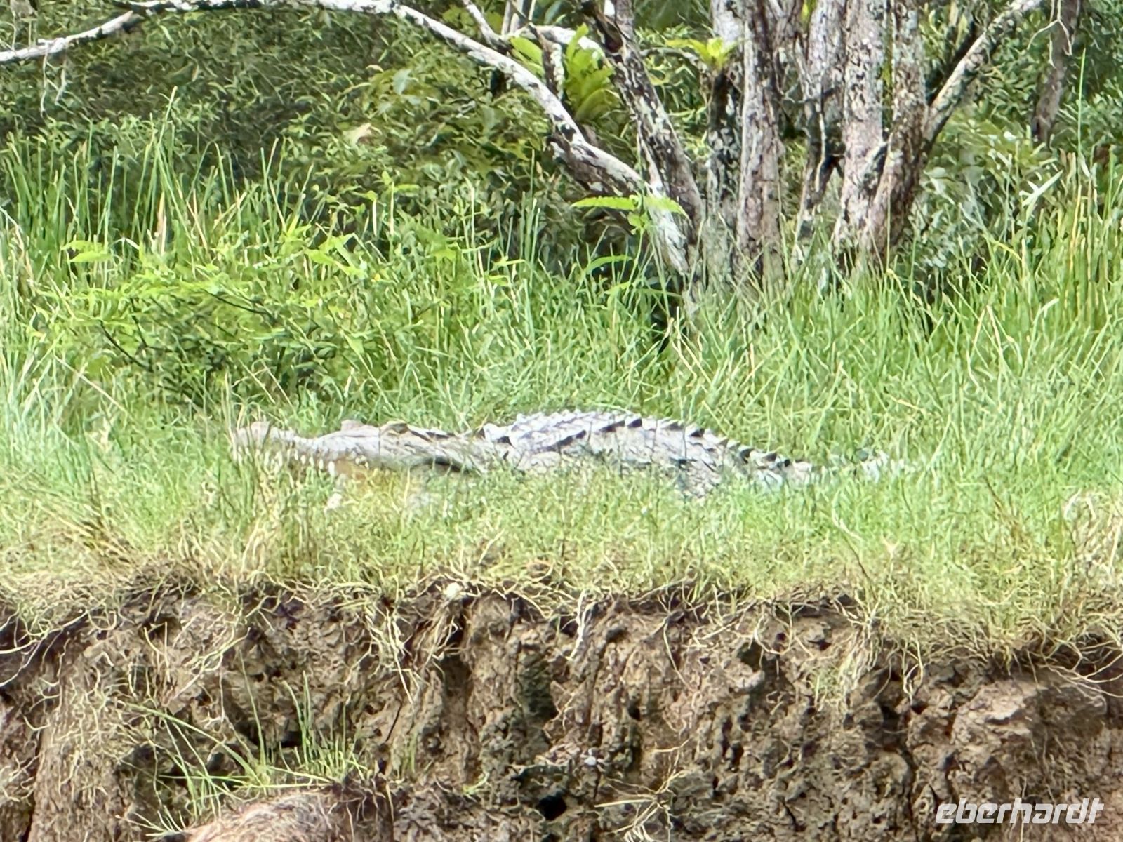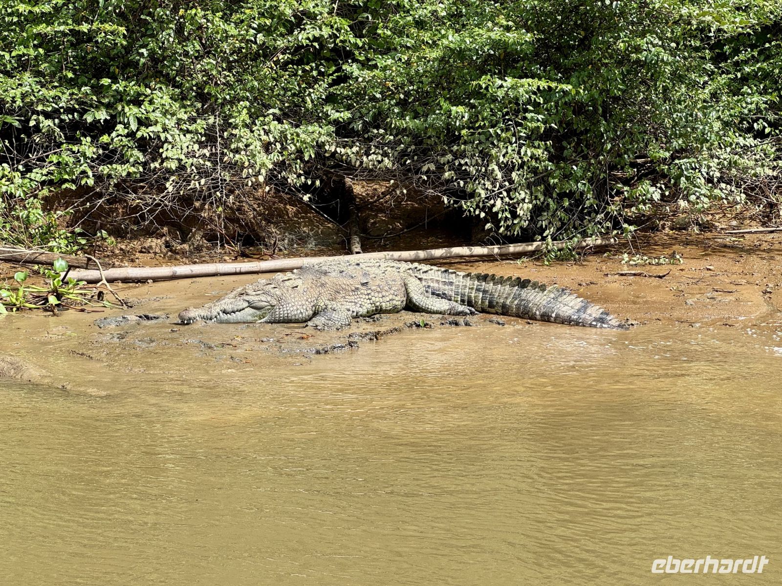 Schon beim viel zu zeitigen Frühstück beginnen heute die Tierbegegnungen. So treten wir spontan dem Verein der Wildbienenzüchter bei, nachdem sich die — zum Glück stachellosen — Insekten über unsere Marmelade und Ananas hermachen. Das Personal „rettet“ uns mit kleinen Marmeladentellern als Ablenkung. Dem frechen Kapuzineräffchen im Gebälk wird hingegen mit der Wasserpistole gedroht. Mit dem ersten morgendlichen Sonnenschein seit Tagen kommen offenbar auch die Tiere heraus, um Fell, Panzer bzw. Gefieder zu trocknen. In den Nationalpark können wir heute trotz des besseren Wetters nicht fahren, weshalb wir stattdessen mit Freddy und Gabriel eine Bootstour durch die Mangroven machen. Wir fahren also mit demselben Boot (aber ohne Koffer) die Strecke bis Sierpe wieder zurück, nehmen uns allerdings deutlich mehr Zeit. Es geht gefühlt Schlag auf Schlag, nachdem wir die ersten Mangroven erreicht haben. Dort, ein Blaureiher! Da oben hängt ein Faultier im Baum! Da drüben auf der Sandbank läuft ein kleines Krokodil ins Wasser! Hunderte Winkerkrabben grüßen beim Vorbeifahren. Für unsere Erfolgsliste sammeln wir noch Schmuckvögel, Silberreiher, Marmorreiher, vier Arten von Eisvögeln, darunter die kleinste Art überhaupt, Leguane, ein Zweifingerfaultier mit Baby sowie ganz viele Spitzkrokodile. Vor den großen Exemplaren mit vier Metern Länge hat sogar Crocodile Nico Respekt. In Sierpe wollen wir eine Pause machen, jedoch ist die Anlegestelle durch einen Leguan blockiert, der sich ausgerechnet diesen Ort zum Sonnen ausgesucht hat. Er entfleucht geschwind ins Wasser, als wir uns nähern. Im Schaukelstuhl futtern wir während der Pause Melone und leckeren Kuchen und freuen uns wie die Krokodile über das sonnige Wetter. Endlich mal kein Regen! Obwohl, ein bisschen genieselt hat es unterwegs schon. Noch trauen wir dem Frieden also nicht. Auf der Rückfahrt sehen wir noch mindestens vier weitere Krokodile, halten aber schon gar nicht mehr dafür an. Draußen auf dem Meer gleitet uns majestätisch ein Pelikan voraus und weist uns den Weg zur Drake Bay. Wir fahren an schönen Traumstränden vorbei, die wir gestern gar nicht richtig erkennen konnten. Am Steg wartet schon meine Spanischlehrerin Christina auf mich, oh oh! Keine Zeit, das Mittagessen wartet schon auf uns! Nochmal Glück gehabt! Nach dem Essen gibt es ein dichtes Gedränge an den Keksdosen. Hoffentlich bleiben für mich auch welche übrig! Ein Päuschen wird uns von Nico noch gegönnt, bevor er uns am Nachmittag zu einer Kajaktour einlädt. Im Verbund geht es erst gegen die Strömung flussaufwärts in den Dschungel. Am Ufer sonnt sich eine Eidechse und wir sehen einen weiteren Reiher sowie kleinere Vögel. Wir passieren mehrere kleine Wasserfälle und kehren schließlich an einem etwas größeren um, nachdem uns die Strömung doch zu stark geworden ist. Zurück an der Anlegestelle lichten sich langsam die Reihen. Zu fünft fahren wir noch ein Stück aufs Meer hinaus. Wir hatten ihn schon fast vermisst, aber nun kehrt der Regen doch noch zurück und treibt uns wieder in Richtung der Keksdosen, also zum Hotel. Das Abendessen ist aber heute tatsächlich so reichhaltig und gut, dass selbst für einen Keks kein Platz mehr ist. Aber dafür gab es ja „Deutschen Krokant“ zum Nachtisch — auch wenn niemand von uns je davon gehört hat.
