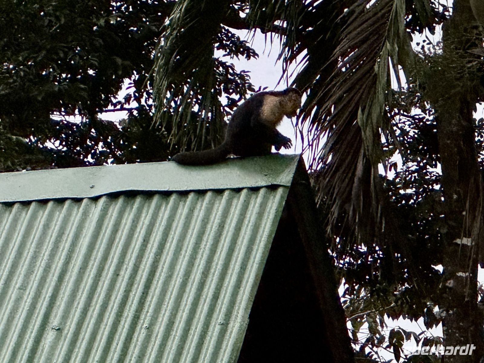 Das Prasseln des Regens und ein mehrmaliges dumpfes Poltern auf dem Dach holen mich wieder aus dem Schlaf. Letzteres stellt sich später als die Landung von Kapuzineraffen heraus, die von den Bäumen auf das Wellblech springen. Auch während des Frühstücks regnet es munter weiter, wovon sich aber Bienen und Kapuzineraffen nicht stören lassen. Doch diesmal sind wir vorbereitet. Für die einen gibt es Marmelade, für die anderen die Wasserpistole. Gut gerüstet verteidigt Reiseleiter Andreas das Frühstück seiner Gäste. Was wird aber nun aus unserem geplanten Tagesprogramm? Der Corcovado-Nationalpark bleibt noch mindestens drei Tage geschlossen und eine Wetterprognose ist schwierig. Am Ende wird es eine weitere Walbeobachtung, zu der Nico mit sechs Gästen aufbricht. Da gerade Ebbe ist, müssen sie mit einem kleinen Boot zum größeren Boot gebracht werden, das draußen in der Bucht festgemacht ist. Mit zwei Damen bleibe ich im Hotel zurück und widme mich heute der Büroarbeit. Vom nächsten Regenschauer bleiben sie draußen auf dem Meer verschont und sehen einige Delfine und sogar Buckelwale. Ein Erfolg also, wie strahlende Augen nach der Rückkehr verraten. Den Nachmittag nutzen wir dann spontan für einen Spaziergang zum kleinen Dorf an der Drake Bay. Am Aussichtspunkt erzählt Nico von den Abenteuern des Francis Drake, während ich eine Flasche Alkohol aus dem Rucksack zaubere. Freibeuter und Rum, das passt zusammen wie die Faust auf die Augenklappe. Der nächste kurze Regenschauer läutet den Rückmarsch ein. Nun tauschen wir die Rollen: Während sich Nico jetzt wiederum seinem Bürokram widmet, klettere ich mit zwei Freiwilligen noch einmal in die Kajaks. Die gestrige Tour auf dem Fluss hat uns so gut gefallen, dass wir das Erlebnis wiederholen möchten. Wir nehmen uns Zeit, lassen uns treiben, lauschen den Geräuschen des Dschungels. Am Ende schaukeln wir noch ein bisschen auf den Wellen der Bucht, während die Sonne langsam hinter uns hinter der Halbinsel untergeht. Das Wasser ist ruhiger als gestern, die Färbung des Himmels noch schöner. Inspiriert durch Nicos Erzählungen entern wir fast noch einen weißen Katamaran, dem wir immer näher kommen, doch entscheiden uns rechtzeitig für unser anständiges, ehrliches Touristenleben — und kehren zum Abendessen zum Hotel zurück. Mit Nicos Wort zum Dienstag endet nach dem Nusskuchen der letzte Abend in unserem kleinen Paradies.