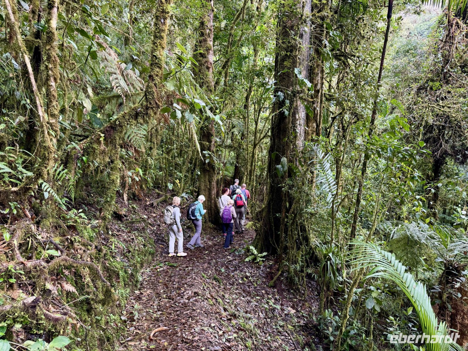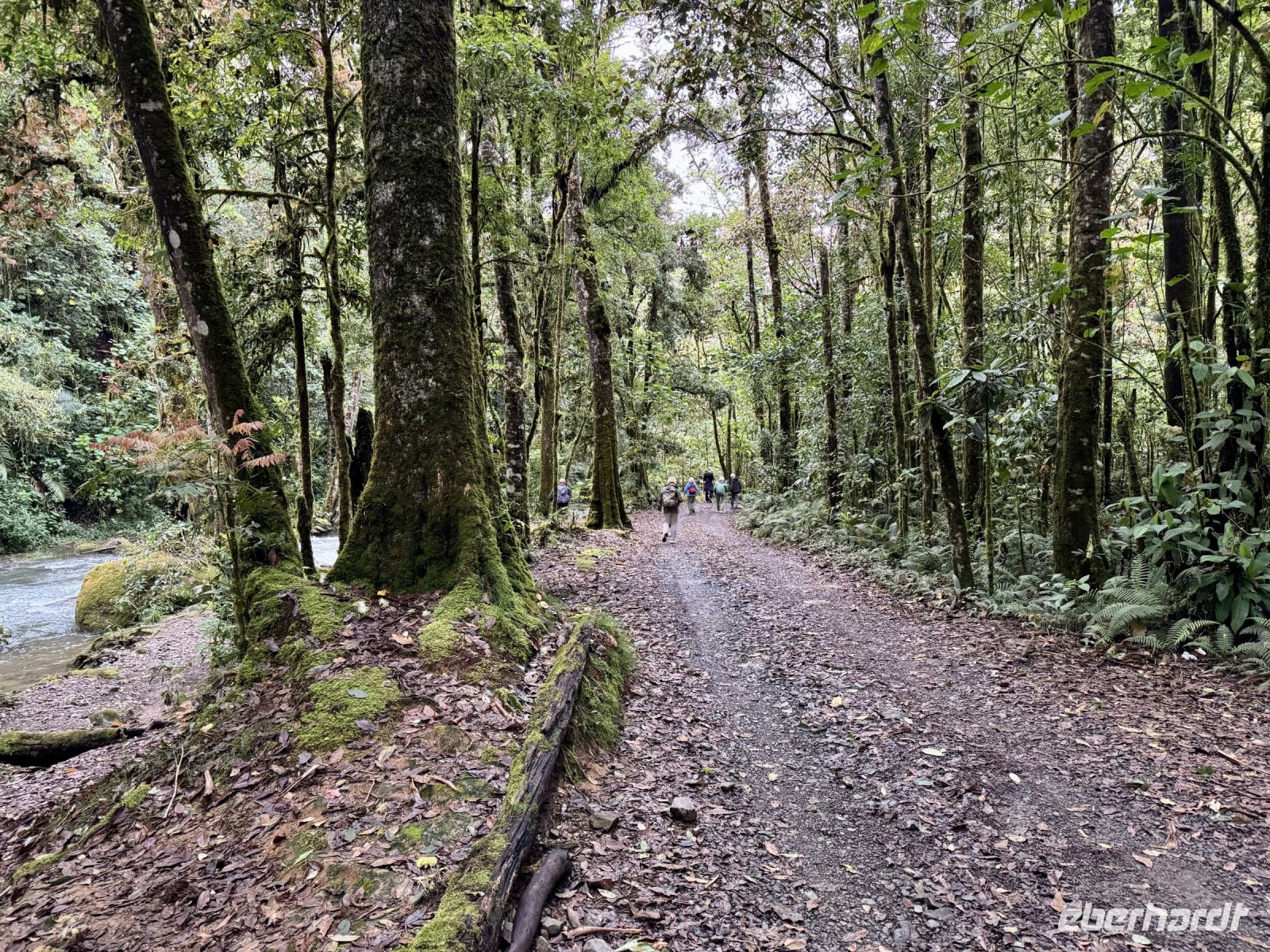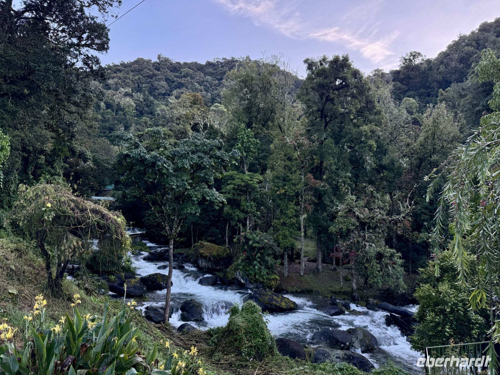 Sein Tagesablauf macht mir den Göttervogel erstmal direkt unsympathisch. Grummelnd quäle ich mich aus meinem Zimmer und werde gleich geblendet. Was ist denn das? Und wieso ist der Himmel auf einmal so blau? Das helle Licht wäre wohl die Sonne, erklärt uns Nico. Die scheint in Costa Rica aber fast so scheu zu sein wie dieser Quetzal, nach dem wir nun in der morgendlichen Kälte suchen müssen. Wir fahren mit dem Bus ein Stück die Straße zurück und laufen dann zu Fuß einen Hügel hinauf, hinter dem Nico schon häufig auf den Quetzal gestoßen ist. Die Gruppe von Hobby-Ornithologen, die mit schwerem Fotogerät bewaffnet bereits dort Stellung bezogen hat, scheint seine Story zu bestätigen. Die Sonne kommt immer mehr hinter den Bergen hervor und badet das Tal in goldenem Licht. Sind wir noch in Costa Rica? Auch die Vogelwelt scheint sich über den Wetterumschwung zu freuen, denn wir sehen nicht nur einen Quetzal, sondern mindestens zwei oder sogar drei, die überhaupt nicht scheu zu sein scheinen, sondern eine tolle Show für uns alle abziehen. Und ja, nachdem die Müdigkeit meine Glieder so langsam verlassen hat, erfreue auch ich mich an diesem tollen Schauspiel und den wunderschönen Vögeln. Wir sind dann schon im Gehen, schon fast um die Kurve, als uns ein Quetzal folgt und sich ganz nah neben uns auf einem Ast niederlässt, uns neugierig beäugt. Da kriegen wir sogar mit dem Handy recht gute Aufnahmen hin. Nun geht es aber erstmal zurück ins Hotel, zum Frühstück. Den wärmenden Kaffee oder Tee haben wir uns nach diesem tollen Erfolg auch verdient, ebenso wie eine kleine Erholungspause. Immerhin will Nico mit uns noch vor dem Mittagessen einige Höhenmeter überwinden und zum Aussichtspunkt wandern. Der Weg geht durch einen märchenhaften Hochgebirgs-Eichenwald und gehört zum Naturschutzgebiet um das Hotel herum. Damit ich die schwere Flasche Rum nicht auch noch wieder hinuntertragen muss, bitte ich um Mithilfe bei der Entleerung. Da muss ich natürlich nicht lange fragen. Nico hat auch wieder den passenden Trinkspruch auf Lager. An den Aussichtspunkt schließt sich ein weiterer Wanderweg an, der schmaler ist und an einem Bach entlang stärker durch das Unterholz führt. Die erhofften einheimischen Wildschweine sehen wir aber nicht. Der grüne Weg führt zurück auf den Hauptweg und damit zurück zum Hotel. Wir können die anschließende Mittagspause individuell verbringen und verabreden uns für den Nachmittag zu einer zweiten Wanderung am Fluss. Am Anfang geht es noch sehr gemütlich und entspannt los, aber nach der Forellenzuchtstation kommt bei Nico wieder der Abenteurer durch. Er möchte uns noch einen Wasserfall zeigen, aber das schaffen wir am Ende zeitlich nicht mehr. Bevor es dunkel wird, kehren wir wieder um und laufen zum Hotel zurück. Zum Abendessen verschlägt es uns in ein benachbartes Restaurant, das mit seiner Weihnachtsdeko und Holzstruktur auch am Nordpol stehen könnte. Das heftige Gewitter über Costa Rica können wir zwar sehen – die Blitze erhellen den Nachthimmel – doch es zieht glücklicherweise um das Tal von San Gerardo de Dota herum.