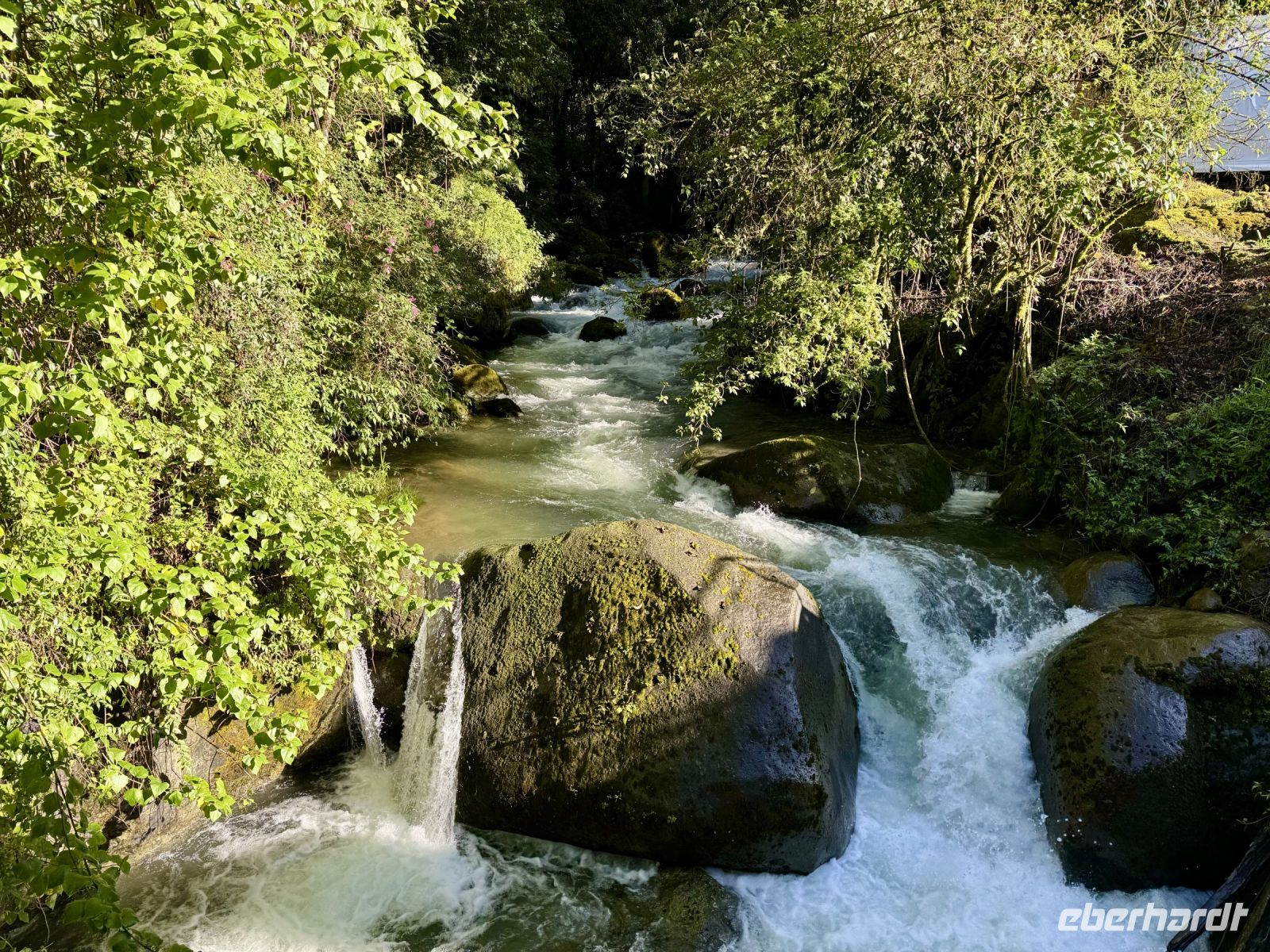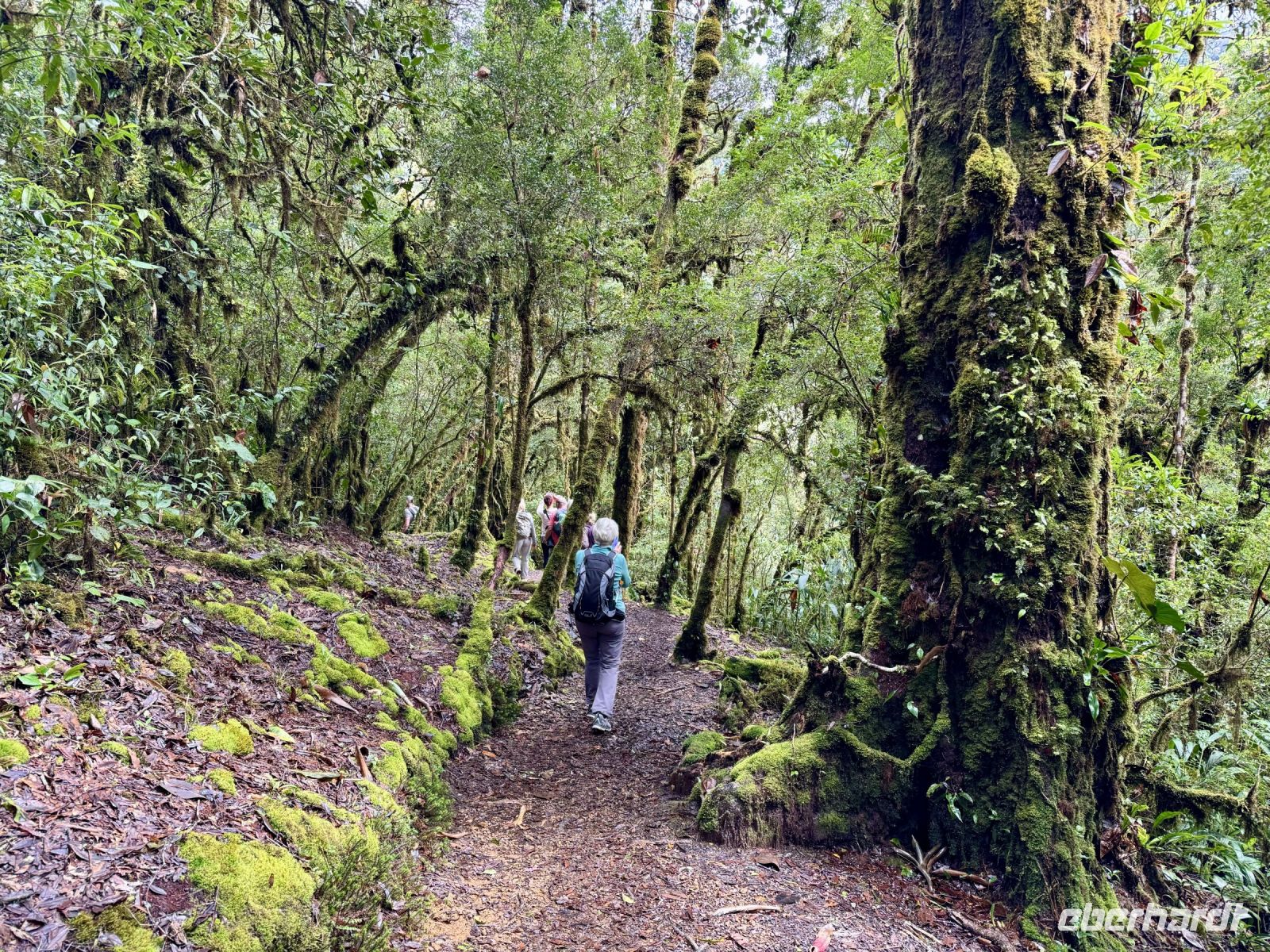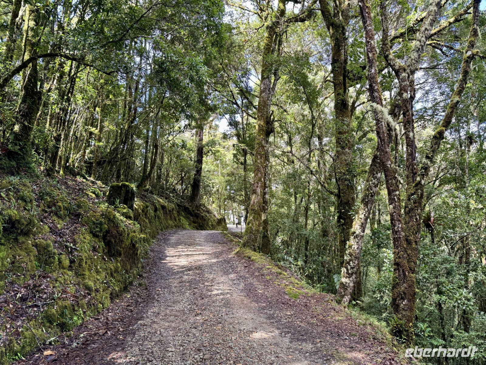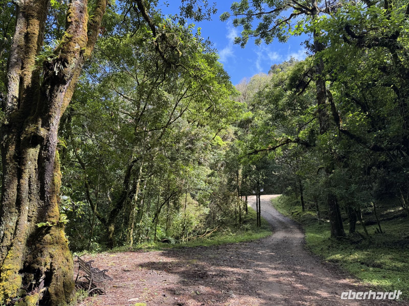Sein Tagesablauf macht mir den Göttervogel erstmal direkt unsympathisch. Grummelnd quäle ich mich aus meinem Zimmer und werde gleich geblendet. Was ist denn das? Und wieso ist der Himmel auf einmal so blau? Das helle Licht wäre wohl die Sonne, erklärt uns Nico. Die scheint in Costa Rica aber fast so scheu zu sein wie dieser Quetzal, nach dem wir nun in der morgendlichen Kälte suchen müssen. Wir fahren mit dem Bus ein Stück die Straße zurück und laufen dann zu Fuß einen Hügel hinauf, hinter dem Nico schon häufig auf den Quetzal gestoßen ist. Die Gruppe von Hobby-Ornithologen, die mit schwerem Fotogerät bewaffnet bereits dort Stellung bezogen hat, scheint seine Story zu bestätigen. Die Sonne kommt immer mehr hinter den Bergen hervor und badet das Tal in goldenem Licht. Sind wir noch in Costa Rica? Auch die Vogelwelt scheint sich über den Wetterumschwung zu freuen, denn wir sehen nicht nur einen Quetzal, sondern mindestens zwei oder sogar drei, die überhaupt nicht scheu zu sein scheinen, sondern eine tolle Show für uns alle abziehen. Und ja, nachdem die Müdigkeit meine Glieder so langsam verlassen hat, erfreue auch ich mich an diesem tollen Schauspiel und den wunderschönen Vögeln. Wir sind dann schon im Gehen, schon fast um die Kurve, als uns ein Quetzal folgt und sich ganz nah neben uns auf einem Ast niederlässt, uns neugierig beäugt. Da kriegen wir sogar mit dem Handy recht gute Aufnahmen hin. Nun geht es aber erstmal zurück ins Hotel, zum Frühstück. Den wärmenden Kaffee oder Tee haben wir uns nach diesem tollen Erfolg auch verdient, ebenso wie eine kleine Erholungspause. Immerhin will Nico mit uns noch vor dem Mittagessen einige Höhenmeter überwinden und zum Aussichtspunkt wandern. Der Weg geht durch einen märchenhaften Hochgebirgs-Eichenwald und gehört zum Naturschutzgebiet um das Hotel herum. Damit ich die schwere Flasche Rum nicht auch noch wieder hinuntertragen muss, bitte ich um Mithilfe bei der Entleerung. Da muss ich natürlich nicht lange fragen. Nico hat auch wieder den passenden Trinkspruch auf Lager. An den Aussichtspunkt schließt sich ein weiterer Wanderweg an, der schmaler ist und an einem Bach entlang stärker durch das Unterholz führt. Die erhofften einheimischen Wildschweine sehen wir aber nicht. Der grüne Weg führt zurück auf den Hauptweg und damit zurück zum Hotel. Wir können die anschließende Mittagspause individuell verbringen und verabreden uns für den Nachmittag zu einer zweiten Wanderung am Fluss. Am Anfang geht es noch sehr gemütlich und entspannt los, aber nach der Forellenzuchtstation kommt bei Nico wieder der Abenteurer durch. Er möchte uns noch einen Wasserfall zeigen, aber das schaffen wir am Ende zeitlich nicht mehr. Bevor es dunkel wird, kehren wir wieder um und laufen zum Hotel zurück. Zum Abendessen verschlägt es uns in ein benachbartes Restaurant, das mit seiner Weihnachtsdeko und Holzstruktur auch am Nordpol stehen könnte. Das heftige Gewitter über Costa Rica können wir zwar sehen – die Blitze erhellen den Nachthimmel – doch es zieht glücklicherweise um das Tal von San Gerardo de Dota herum.