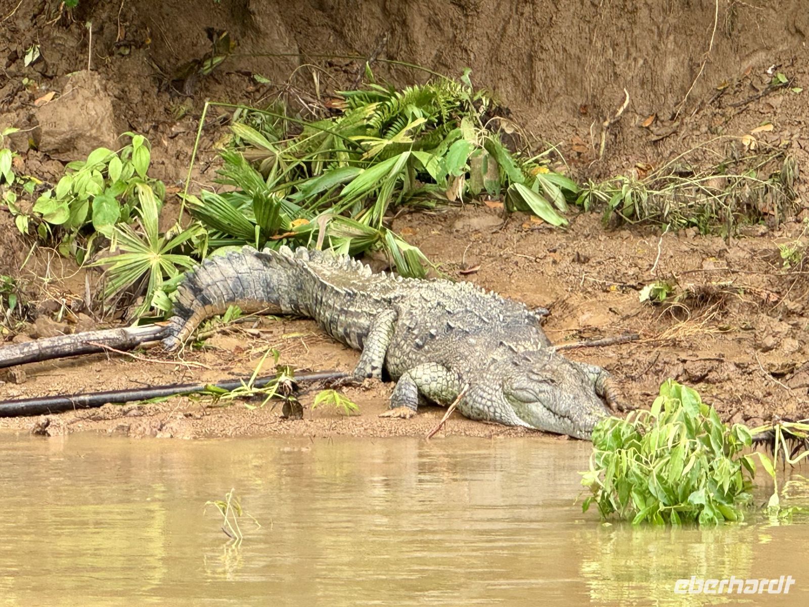 Uns Zugvögel zieht es heute zurück in wärmere Gefilde, zurück an die Pazifikküste. Der Regen kommt jedoch mit. Oder ist schon da, je nachdem. Die Straße hinunter soll besser sein, was streckenweise Ansichtssache ist. Wir erreichen das Flachland, wo der Regen vorübergehend aufhört, und kehren zur Lagebesprechung an einer Art Raststätte mit Buffetrestaurant und Souvenirladen ein. Es sieht nämlich gar nicht gut aus. Nach den heftigen, historischen Regenfällen der letzten Tage ist die Straße vor uns wegen mehrerer Erdrutsche gesperrt. Ein Stück Käsekuchen mit Nutella hilft vorerst gegen die aufkommende schlechte Stimmung. Nach vielleicht 40 Minuten verkündet Nico die Weiterfahrt; die Straße soll wohl wieder frei sein. Sehr weit kommen wir jedoch nicht. Entweder stimmte die Meldung nicht oder es gab einen weiteren Erdrutsch. Wie dem auch sei: Kurz vor dem Carara-Nationalpark (bei mir werden Erinnerungen an meinen ersten kurzen Aufenthalt in Costa Rica wach) stecken wir im Stau fest. Den vielen Krokodilen im Rio Grande de Tárcoles gefällt das (vermutlich). Nico und ich sehen allerdings heute nur ein kleines Krokodil im hohen Gras. Der Fluss ist deutlich über die Ufer getreten. Die starke Strömung könnte sogar die größere Gefahr darstellen als hungrige Reptilien. Wir beide laufen ein Stück, teils um uns die Beine zu vertreten, teils um uns ein Bild der Lage zu machen. Nach sieben (!) Kilometern vorbei an wartenden Trucks und Pkws haben wir bei Tárcoles den Erdrutsch erreicht. Die Straße sieht schon freigeschaufelt aus, aber es wird noch gebaggert. Trotzdem besteht die Hoffnung auf eine baldige Weiterfahrt. Im Örtchen besorgen wir Bier und Snacks für unsere wartenden Gäste. Ein freundlicher Lkw-Fahrer, der aus Tárcoles in die Gegenrichtung unterwegs ist, nimmt uns bis zu unserem froschgrünen Bus mit. So ist das Bier sogar noch kalt und unsere Gäste freuen sich sehr über die Erfrischung. Auch der blaue Himmel, der ab und zu zwischen den Wolken sichtbar ist, hebt die Stimmung. Ohne Erdrutsche hätte es eigentlich ein sehr schöner Abend und Sonnenuntergang am Hotelpool werden können … Es dauert jedoch nochmals etwa eine Stunde, bis es endlich weitergeht. Zähflüssig, mit Unterbrechungen, aber immerhin. Hinter Jaco kommt der Verkehr auch langsam wieder mehr ins Rollen. Inzwischen ist es schon lange dunkel und unsere Mägen knurren laut (zumindest bei einigen). Ein Halt an einem Buffetrestaurant am Straßenrand verschafft Abhilfe. Das geht auch schnell, sodass wir kurz nach acht wieder zurück auf der Straße sind. Die ist nun auch fast leer — wahrscheinlich haben sich die Trucker inzwischen alle eine Unterkunft bzw. einen Parkplatz gesucht. Gegen 22:30 Uhr weckt mich Nicos sanfte Stimme aus einem leichten Schlummer. Fünfzehn Stunden sind seit unserer Abfahrt aus Monteverde vergangen. Gegen alle Widrigkeiten haben wir unser Hotel doch noch erreicht, sogar noch vor Mitternacht. Die schönen großen Zimmer sind eine erste kleine Entschädigung für die heutigen Strapazen.