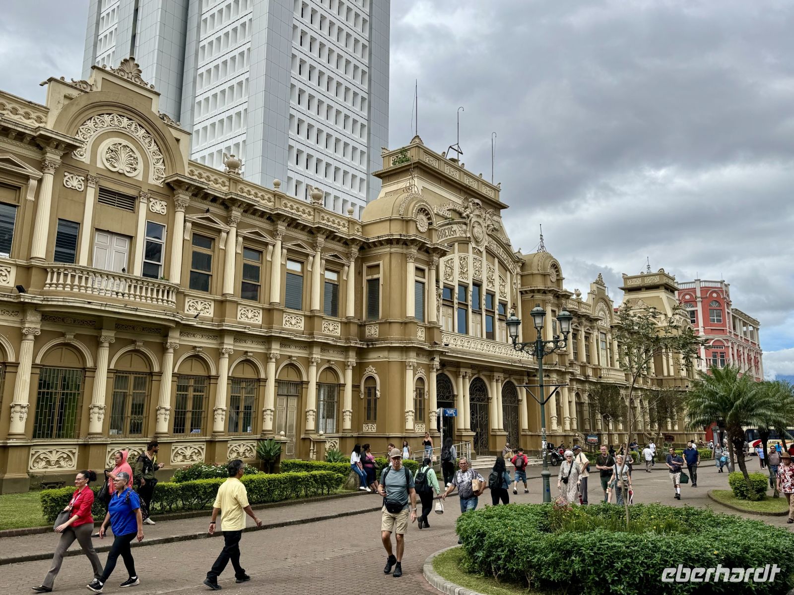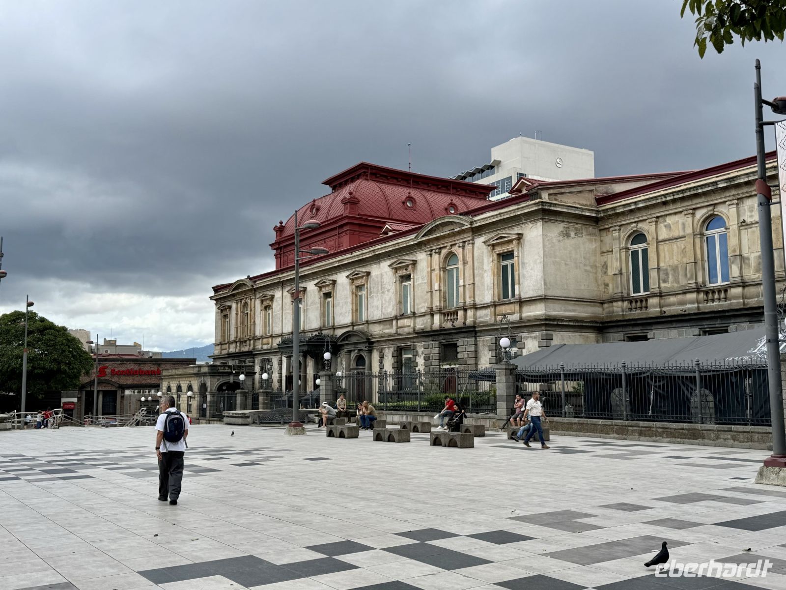 Die Koffer sind in den Bus verladen, die Schlüssel abgegeben, alle sitzen an ihrem Platz — ein letztes Mal „Good morning, everybody!“ Unser letzter Tag in Costa Rica ist tatsächlich gekommen, der Abschied von Nico und Hera rückt näher. Unser Busfahrer steht auch gleich vor der Herausforderung, den Bus die steile Straße hinauf aus dem Tal zu manövrieren. Das schafft er natürlich mit Bravour. Außerdem ist das Wetter noch auf unserer Seite. Nur Nicos Pläne werden durchkreuzt. Gern möchte er uns die Aussicht vom Berg des Todes, also aus einer Höhe von 3.400 Metern, zeigen, weshalb wir auf der Panamericana nochmal ein Stück in die eigentlich „falsche“ Richtung fahren, d. h. nach Süden statt nach Norden. Aber: Wie Sie sehen, sehen Sie nichts. Nur Nebel. Von der Vegetation in dieser Höhe bekommen wir trotzdem einen guten Eindruck. Mit halb erfüllter Mission drehen wir also um und fahren via Cartago nach San José. Ein krasser Gegensatz zum beschaulichen San Gerardo de Dota. Doch Nico möchte eine Lanze für die pulsierende Hauptstadt brechen und lädt uns zu einem Spaziergang durch die Fußgängerzone ein. Wir beginnen am Hauptpostamt, laufen zur zentralen Markthalle und schließlich zum Nationaltheater. Hier erweckt Nico die Vergangenheit mit blumigen Worten zum Leben und lässt uns das wichtigste Gebäude der Stadt mit anderen Augen sehen. Auch später am Nationalmuseum hält er ein flammendes Plädoyer für Costa Rica, sodass wir sofort bei ihm einziehen würden, wenn – ja wenn die Gewährung der Aufenthaltsgenehmigung nicht 4,5 Jahre dauern würde – und das Wetter besser wäre. Den leichten Schauer während der zweiten Hälfte seiner Stadtführung haben wir aber gut weggesteckt, davon lassen wir uns inzwischen nicht mehr beeindrucken. Zwei Stunden waren wir zu Fuß unterwegs, als wir den Bus wieder erreichen. Für ein spätes Mittagessen/zeitiges Abendessen und vor allem auch gemeinsames Abschiedsessen hat uns Nico nun Plätze in einem guten Fischrestaurant in Flughafennähe gebucht, damit wir schon vor dem Feierabendverkehr aus der Stadt raus sind und es dann nicht mehr weit zum Airport haben. Hier feiern wir auch unser Geburtstagskind – und schütteln ungläubig den Kopf, als doch nochmal ein Gewitter mit Wolkenbruch vom Himmel bricht. Na ja, schlimmstenfalls muss uns Nico mit seinem Kajak zum Flughafen paddeln … Wir fotografieren oder zeichnen den vollendeten Streckenverlauf unserer Reise ab bzw. nach, verabschieden uns mit lobenden Worten, lustigen Anekdoten und zwei dicken Umschlägen von Hera und Nico. Der Flughafen von San José ist dann recht überschaubar, lange Schlangen an den Schaltern und der Sicherheitskontrolle kaum bis gar nicht vorhanden, weshalb alles ganz entspannt wäre, wenn denn der Lufthansa-Flug nicht mit Verspätung starten würde, was natürlich etwas Sorge um den Anschluss in Frankfurt aufkommen lässt. Doch die Flugzeit ist wieder recht großzügig kalkuliert, sodass dennoch alles klappen sollte.