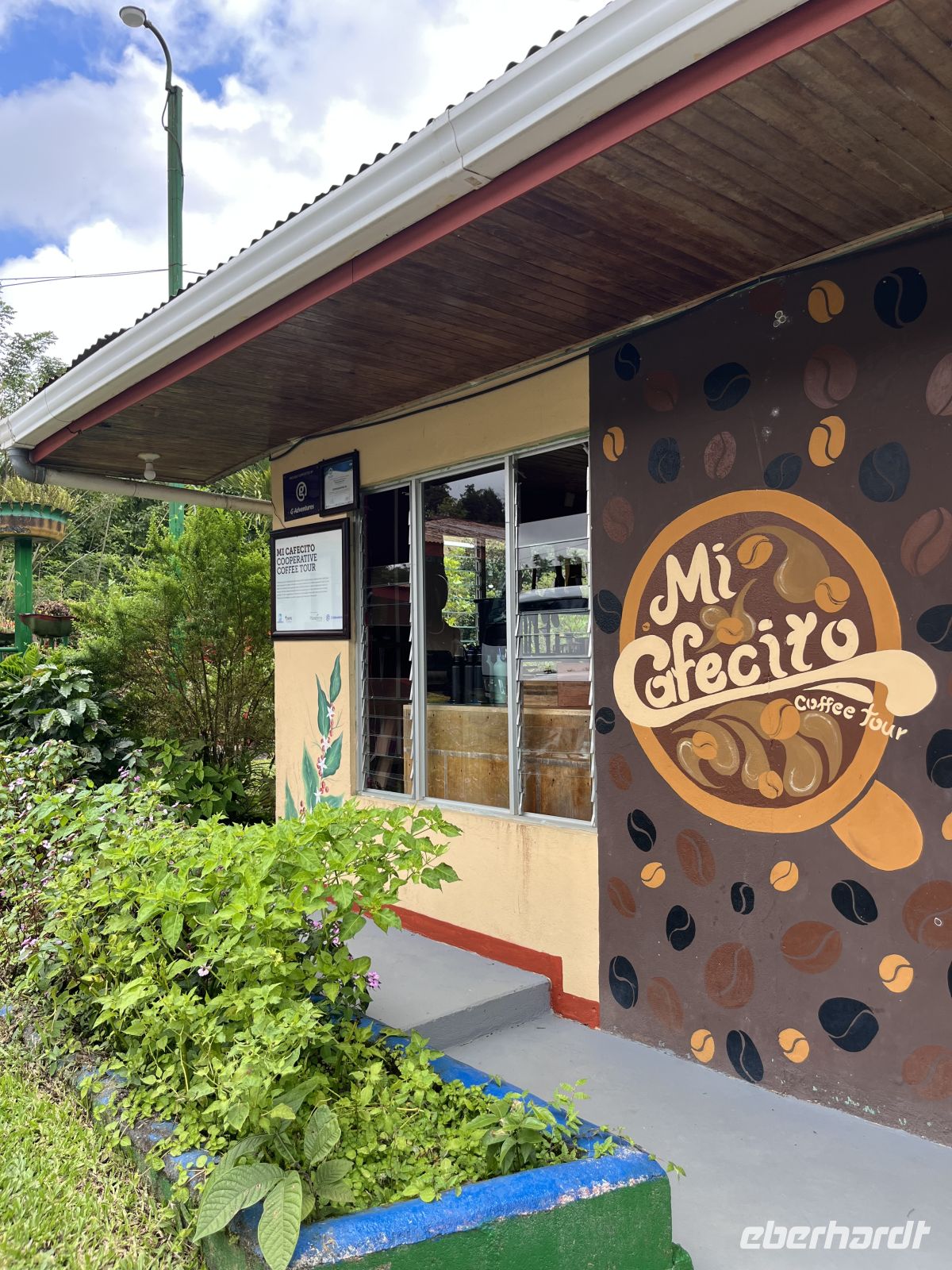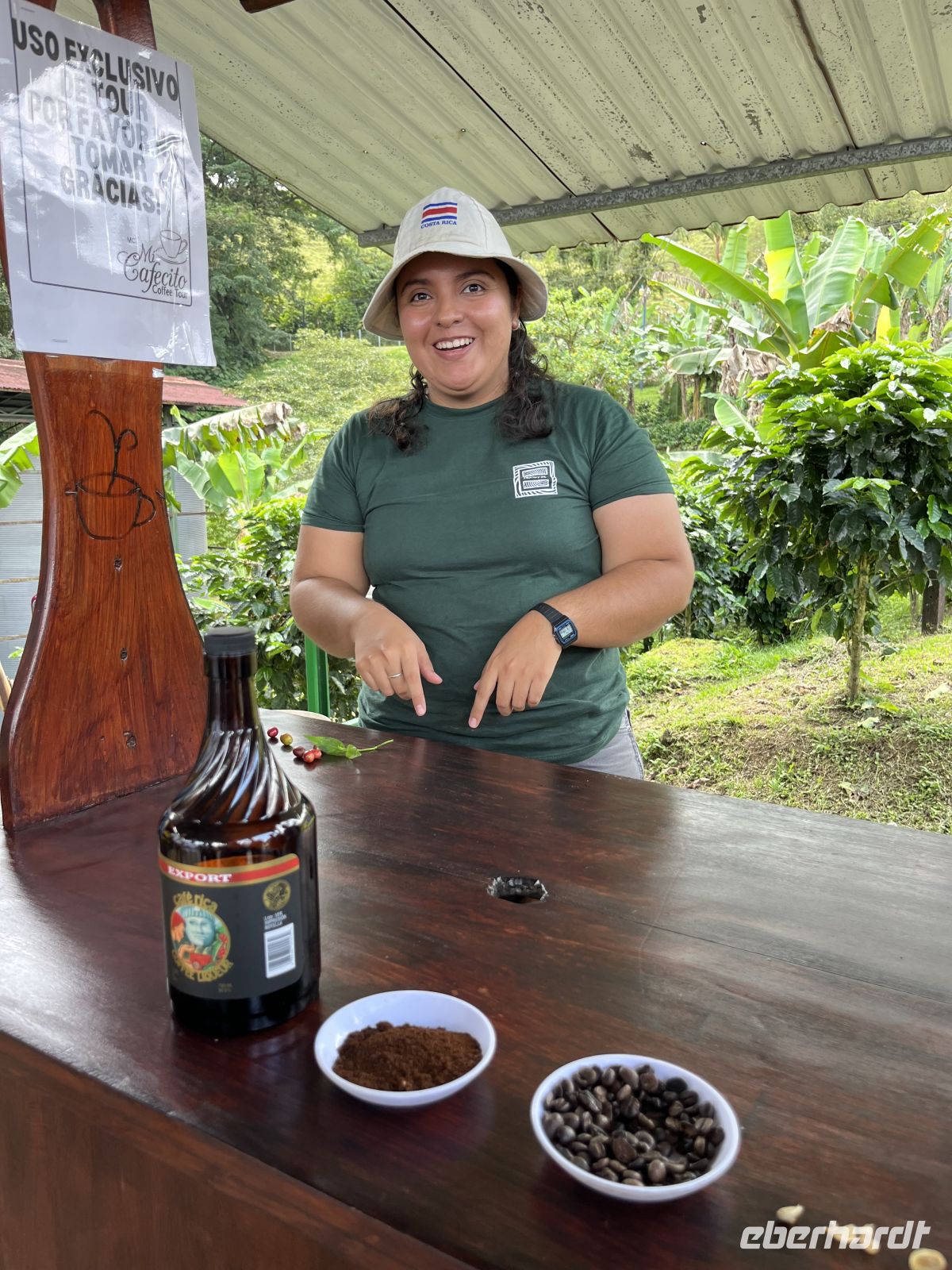 Einige von uns wurden schon sehr zeitig aus dem Bett (durch Jetlag) vertrieben, so dass wir einen schönen Sonnenaufgang beobachten konnten. Wir unternahmen eine kleine Erkundungs-Tour durch die schöne Hotelanlage. Anschließend nahmen wir unser erstes costaricanischen Frühstück ein und lernten unseren Busfahrer Edgar kennen. Bei schönstem Reisewetter traten wir die Reise hinauf zum Poás Vulkan an. Dabei hatten wir einen schönen Ausblick auf das Zentraltal mit San José, die Vulkankette und die Gebirgskette im Hintergrund. Beim Vulkan Poás blickten wir in den Krater und sahen den weißen Rauch aufsteigen und die Schwefelablagerungen. Der Vulkan hatte dieses Jahr im April seine letzte aktive Phase. Anschließend spazierten wir entlang eines Rundwanderweges (ca. 4 Kilometer) durch die herrlich grüne Vegetation vorbei an einer Lagune. Die Höhe von 2500 Metern bemerkten wir deutlich. Weiter ging es entlang der Hänge des Vulkans zur Kaffeefarm Mi Cafécito. Unterwegs fotografierten wir einen wunderschönen Wasserfall direkt an der Straße. Bei der unterhaltsamen Kaffeeführung lernten wir über die Geschichte des Kaffees, die Kaffeepflanzungen, den Aufbau und die Verarbeitung der Bohne. Beim Quiz über die verschiedenen Häute der Bohne scheiterten wir zwar, bekamen aber dennoch eine leckere Kaffee-Likörprobe.