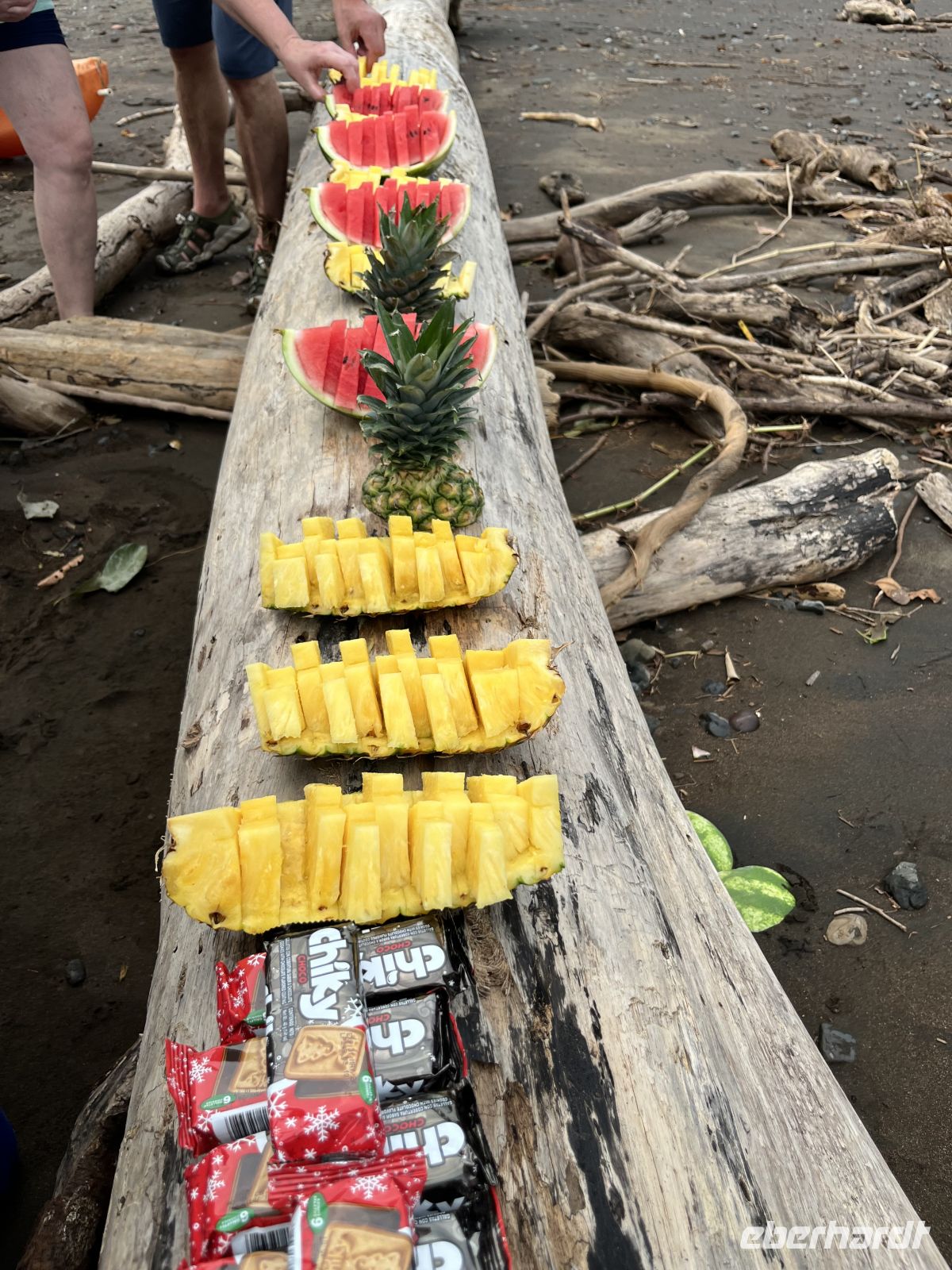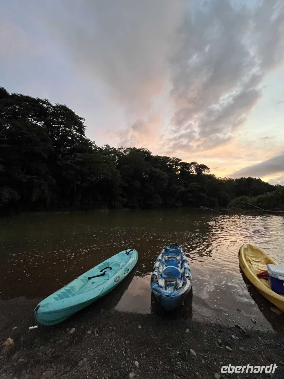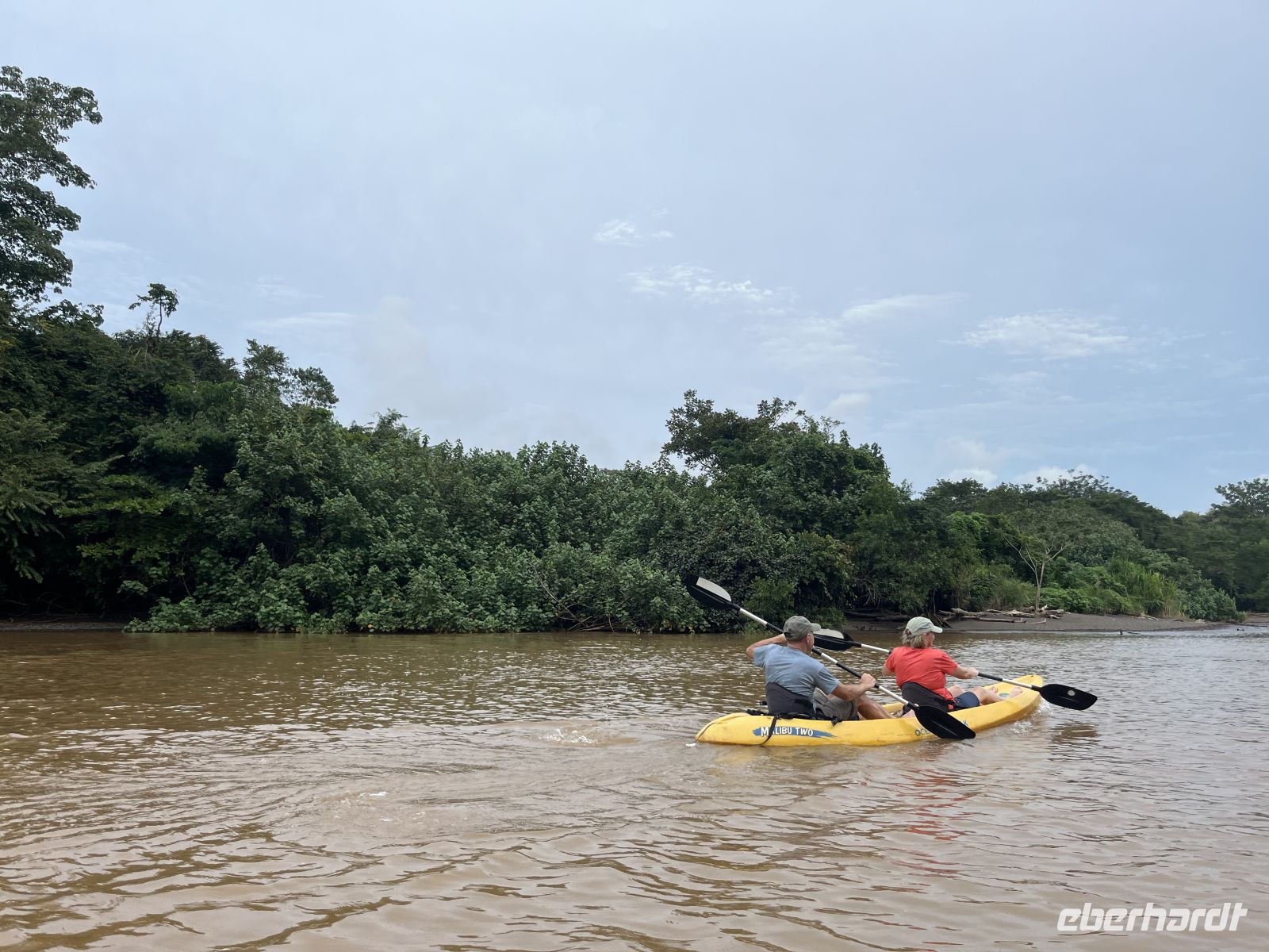 Anschließend trafen wir uns und wurden von einem umgebauten Transporter abgeholt, auf dem wir auf der Ladefläche mitfuhren. Wir fuhren in Richtung Playa Camaronal und dabei entlang teils unbefestigter Straße. Hier wurden wir von der Kajakcrew empfangen und eingewiesen. Die Strecke war kurzweilig und wir konnten auf einem ruhigen Fluss entspannt unsere Paddelkenntnisse testen. Für einige war es das erste Mal in einem Kajak, andere hatten schon etwas mehr Übung. Wir sahen Blaureiher und Weiße Ibisse. Am Strand angekommen hatten wir Zeit für einen kleinen Spaziergang. Das Baden ist hier aufgrund der Strömungen zu gefährlich, aber der Ausblick auf den weitläufigen Strand mit dunklem Sand war sehr schön. Nach der Stärkung mit frischer Ananas und Melone ging es zurück zum Ausgangspunkt.