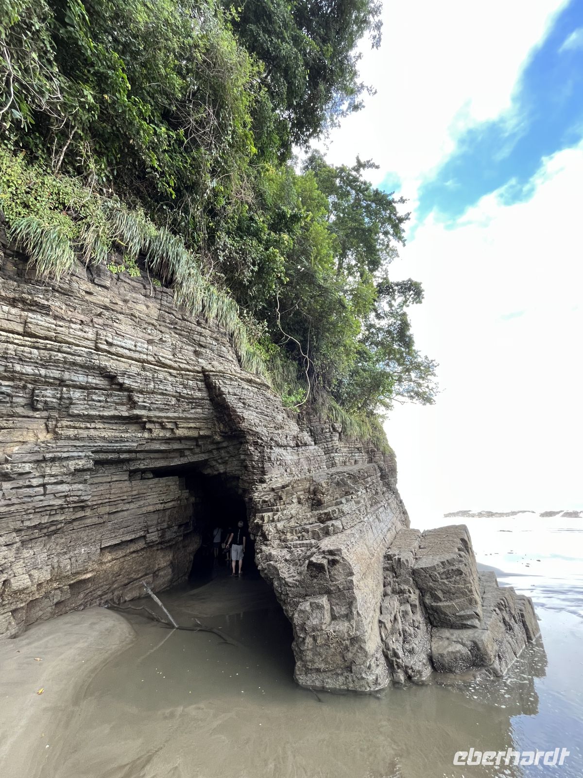 Heute hatten wir einen entspannten Morgen in der wunderschönen Cusinga Lodge. 6:30 Uhr verabredeten wir uns für eine kurze Wanderung hinunter zum Strand. Die Umgebung der Lodge gehört zum Marino Ballena Nationalpark und so wanderten wir durch den tropischen Regenwald. Der Strand war sehr pittoresk und einsam. Dadurch dass gerade Ebbe war, konnten wir am Strand entlang spazieren. Am Ende liefen wir durch eine kleine Höhle und erreichen einen zweiten Strand, namens Arco Iris, der Regenbogen.