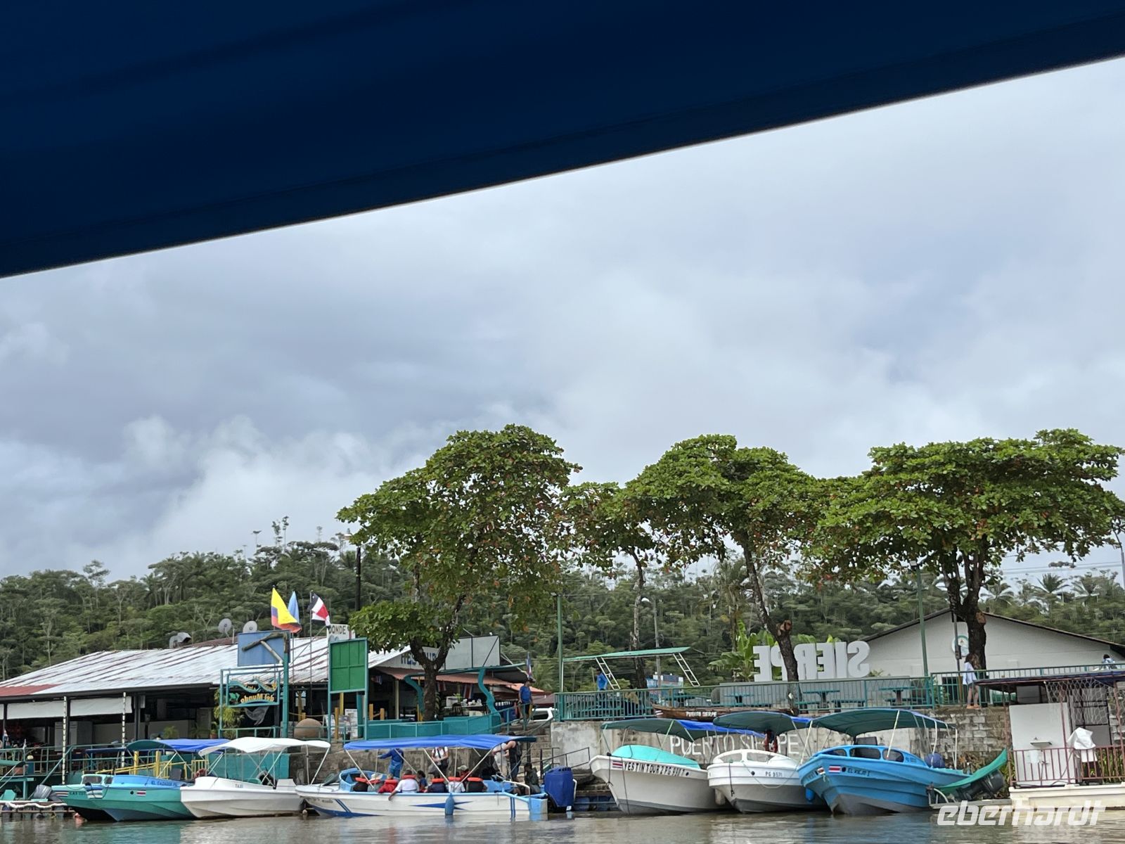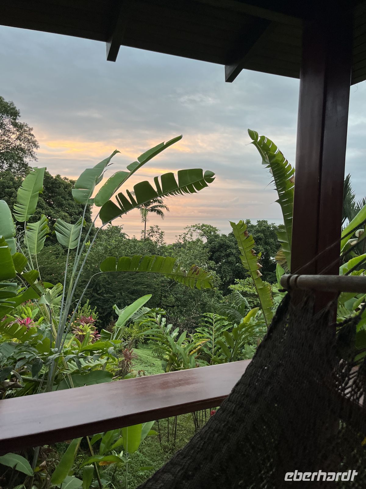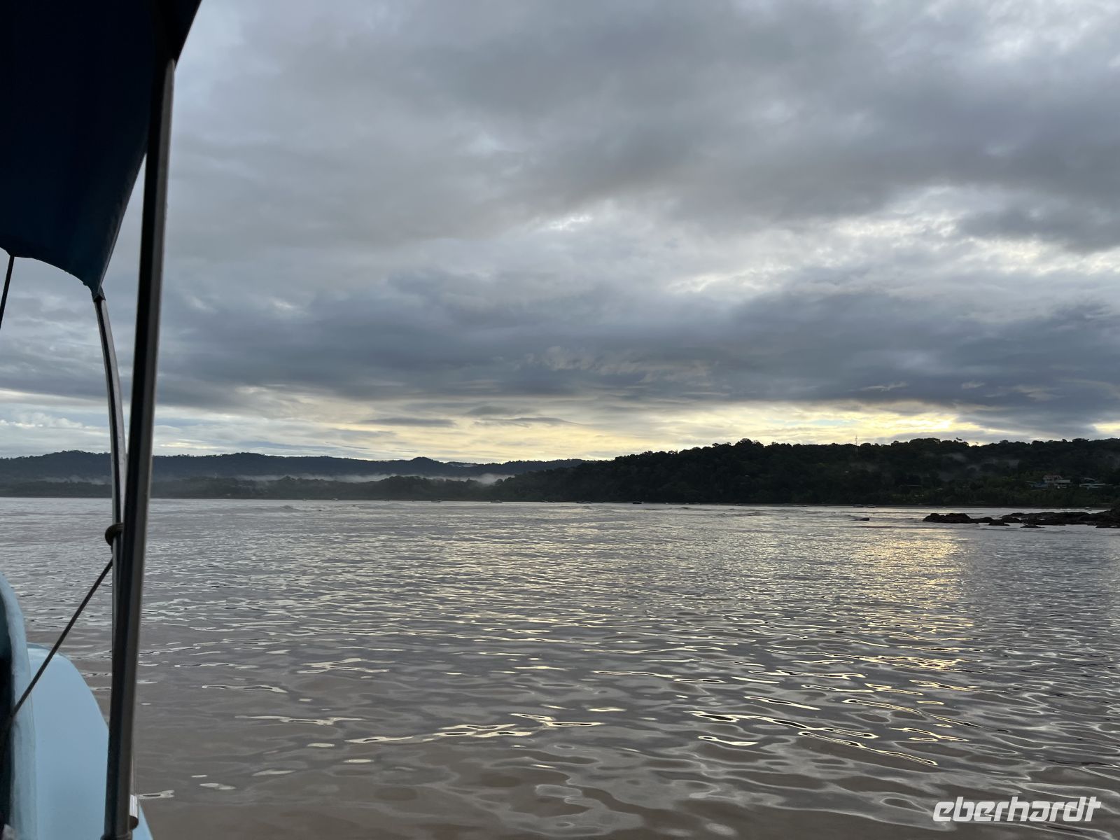 Wieder zurück im Hotel, genossen wir das Frühstück mit wunderbarer Aussicht auf den Pazifik. Dann traten wir unsere Reise weiter nach Süden an und gingen in dem Örtchen Sierpe an Bord eines Schnell-Bootes der Aguila de Osa Lodge. Hier fuhren wir zuerst entlang eines Flusses und dann hinauf aufs offene Meer. Leider fing es schon bald an, sehr stark zu regnen, so dass an alle Regenponchos verteilt wurden. Die Stelle, an der der Fluss aufs Meer traf, war ordentlich schaukelig mit circa 2 Meter hohen Wellen. Aber unser Bootsführer manövrierte uns sehr gewissenhaft über die Wellen. In der Lodge wurden wir herzlich empfangen und hatten erstmal die Gelegenheit, uns zu trocknen. Anschließend trafen wir uns für ein leckeres Mittagessen wieder. Den Nachmittag konnte jeder entspannen oder spazieren gehen, wobei nochmal starker Regen einsetzte.