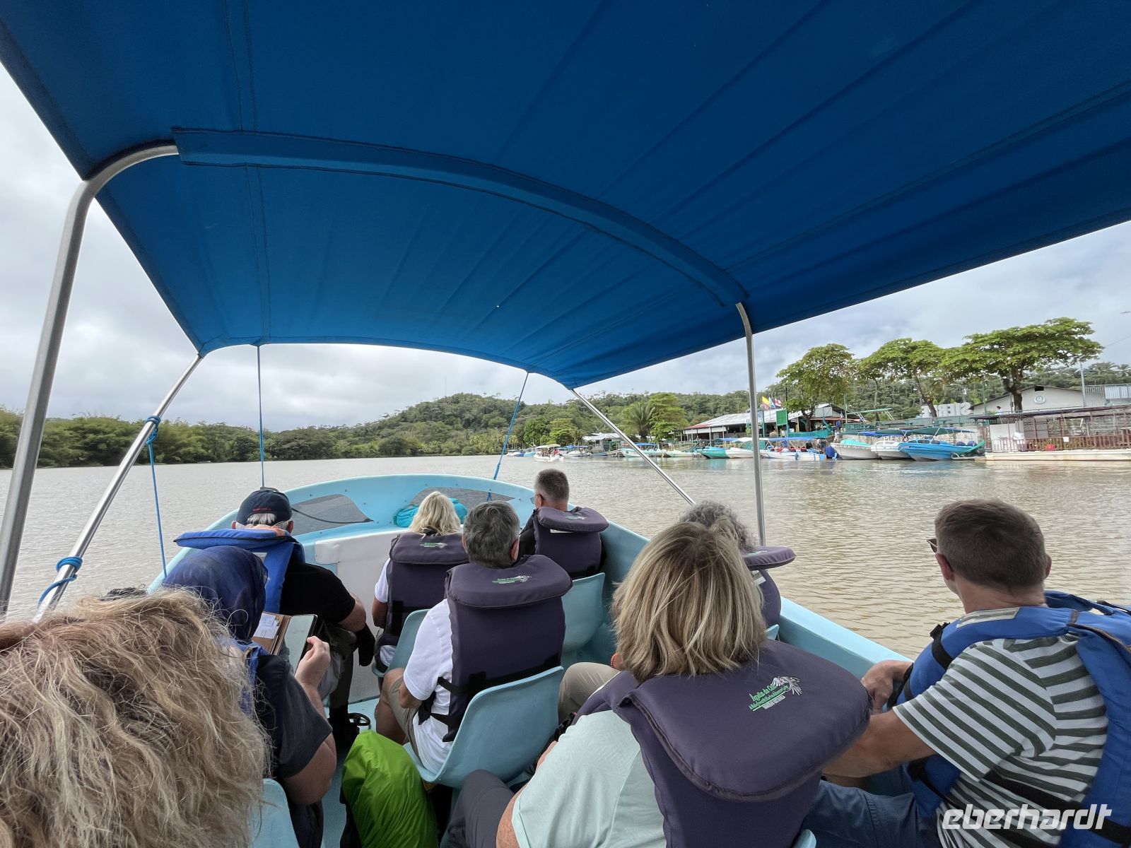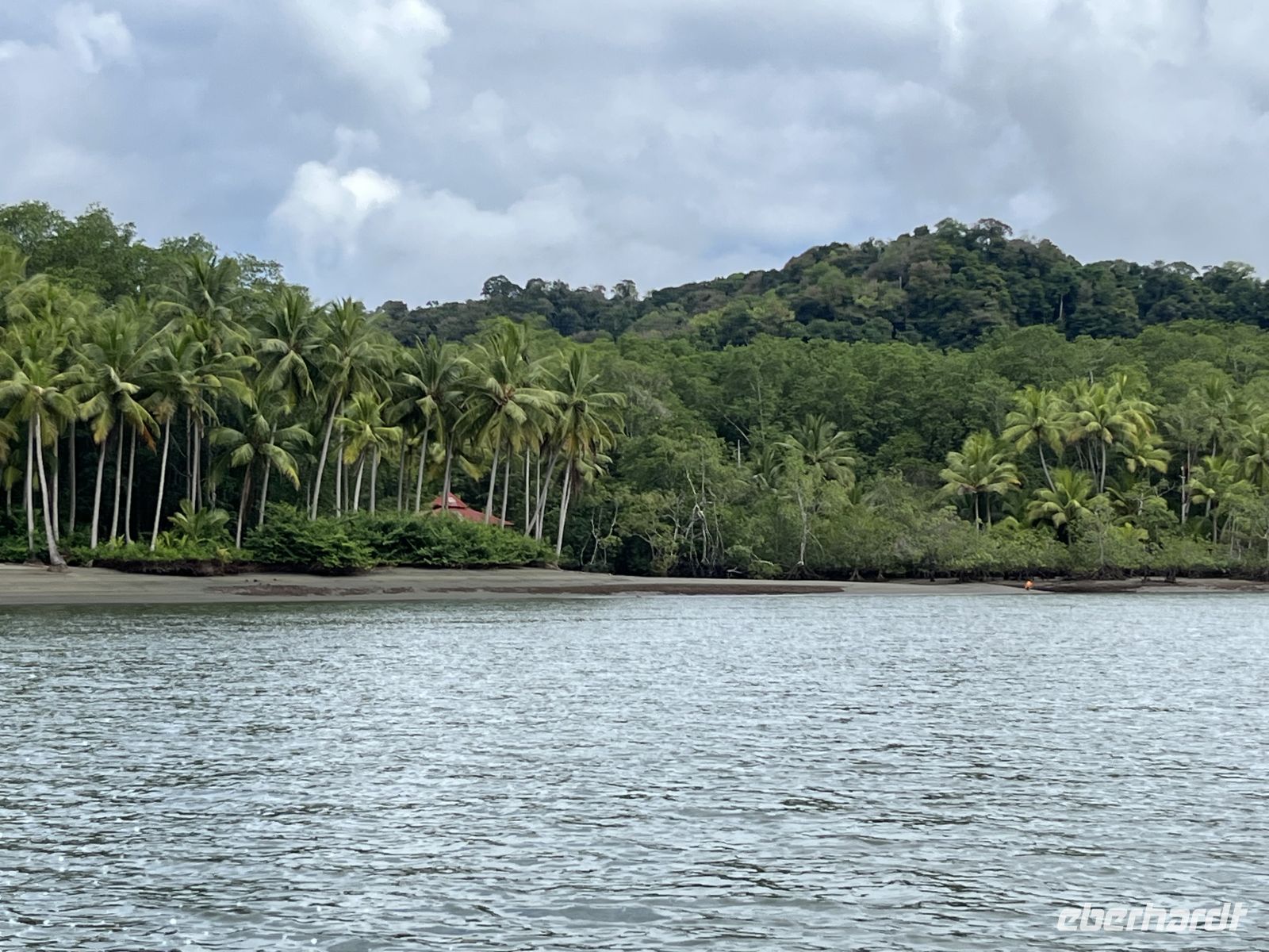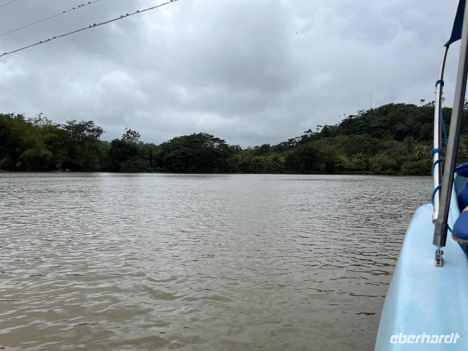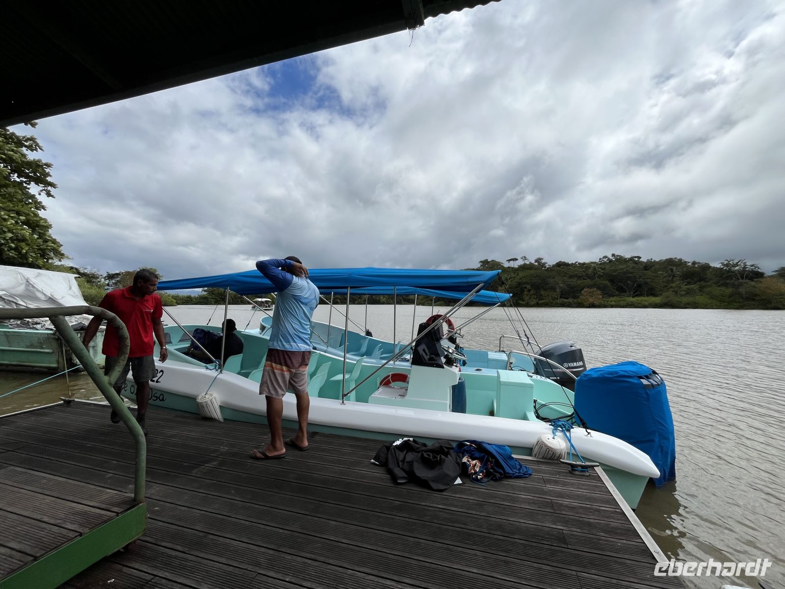 Wieder zurück im Hotel, genossen wir das Frühstück mit wunderbarer Aussicht auf den Pazifik. Dann traten wir unsere Reise weiter nach Süden an und gingen in dem Örtchen Sierpe an Bord eines Schnell-Bootes der Aguila de Osa Lodge. Hier fuhren wir zuerst entlang eines Flusses und dann hinauf aufs offene Meer. Leider fing es schon bald an, sehr stark zu regnen, so dass an alle Regenponchos verteilt wurden. Die Stelle, an der der Fluss aufs Meer traf, war ordentlich schaukelig mit circa 2 Meter hohen Wellen. Aber unser Bootsführer manövrierte uns sehr gewissenhaft über die Wellen. In der Lodge wurden wir herzlich empfangen und hatten erstmal die Gelegenheit, uns zu trocknen. Anschließend trafen wir uns für ein leckeres Mittagessen wieder. Den Nachmittag konnte jeder entspannen oder spazieren gehen, wobei nochmal starker Regen einsetzte.