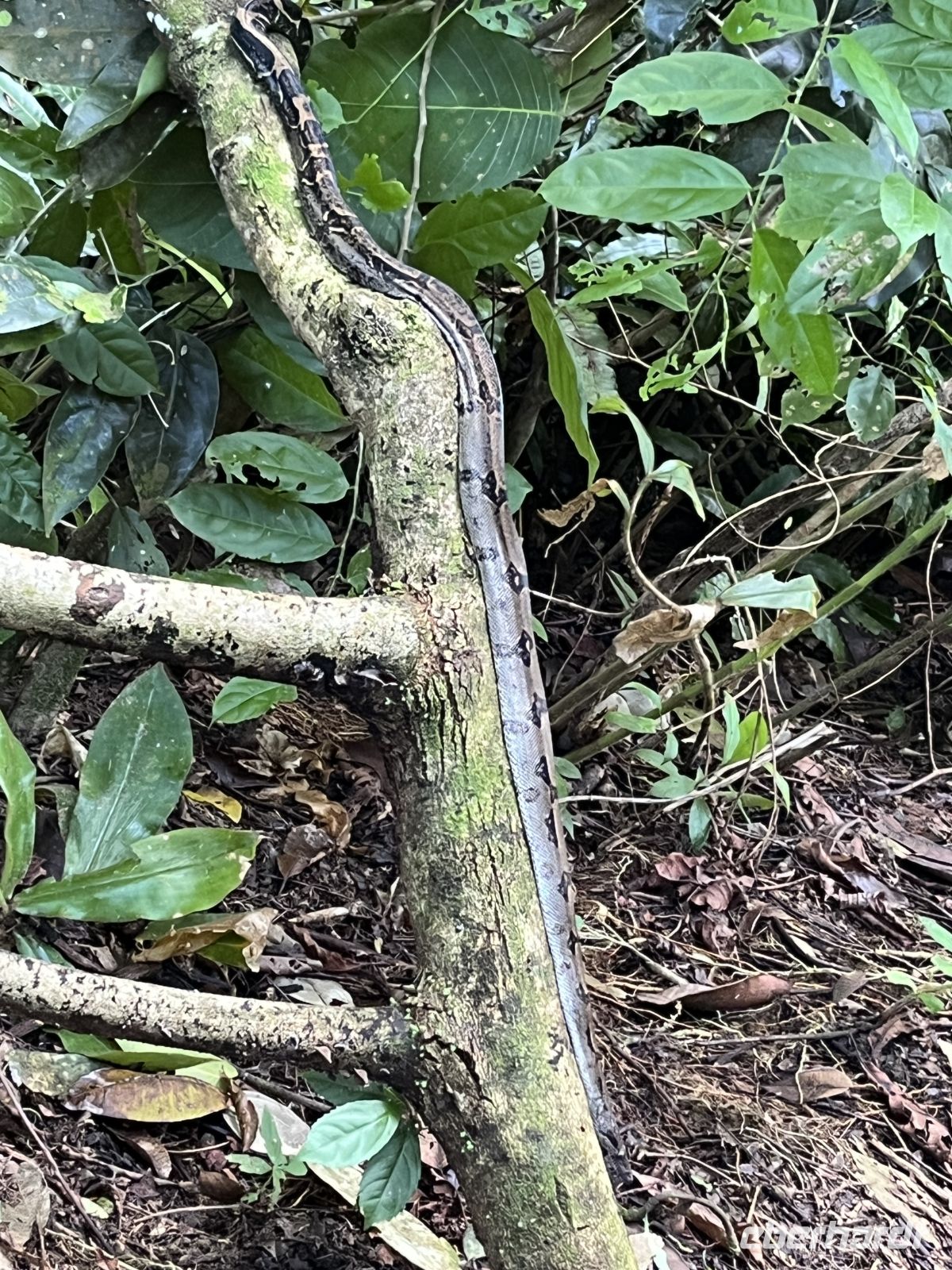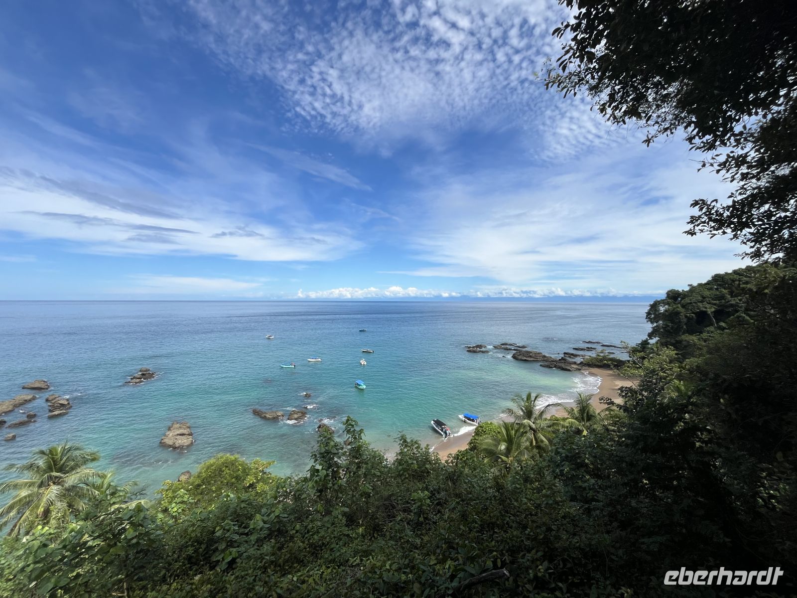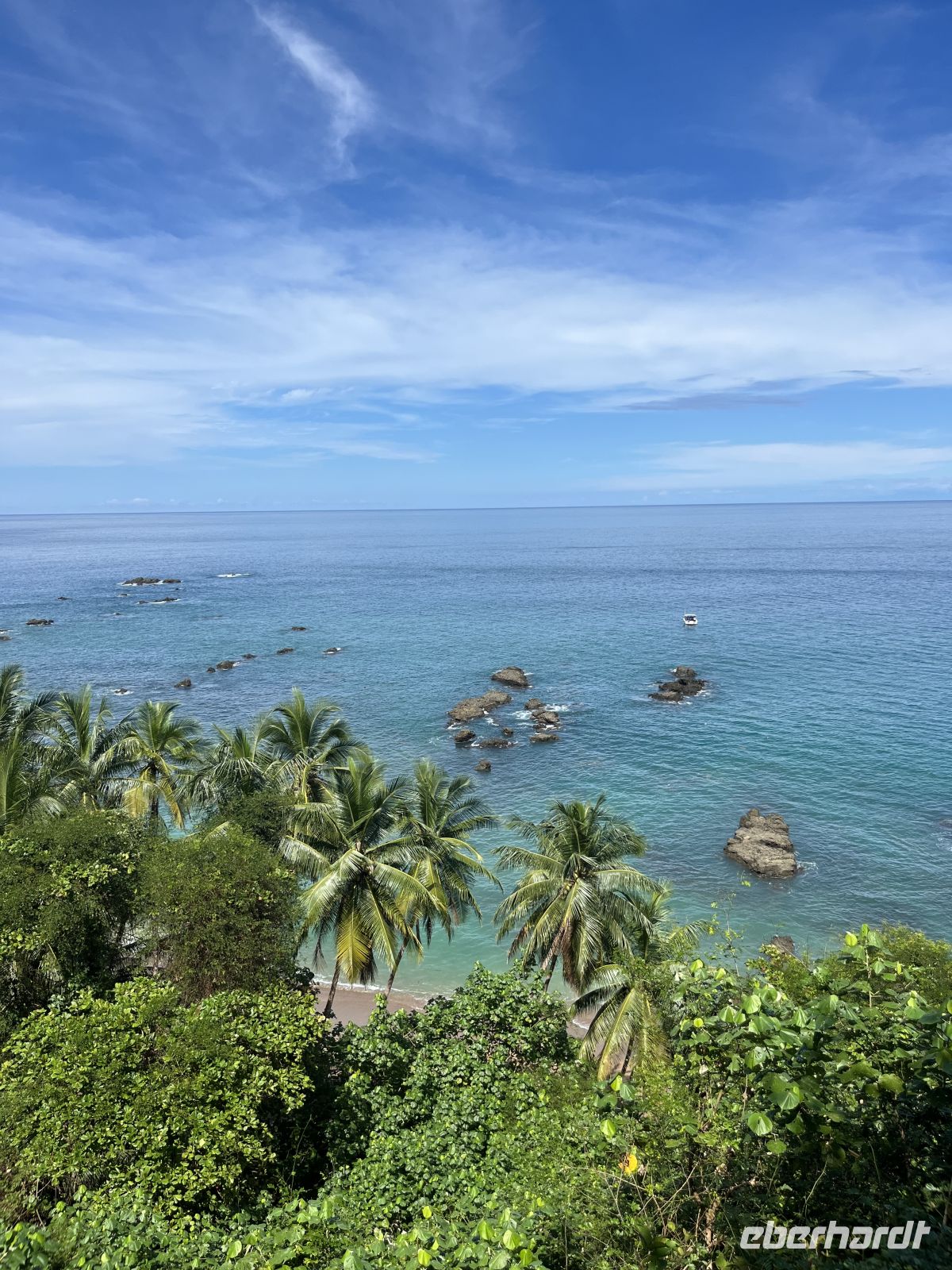 Gestern haben wir die Insel Caño bereits gesehen und auf der Landkarte nachgesehen, wo genau sie liegt. Heute fuhren wir mit einem etwas größeren Boot und mit unserem Guide Enrique dorthin. Die Insel ist ein biologisches Reservat und Teil des Corcovado Nationalparks. Während der Fahrt konnten wir wieder einen Buckelwal mit Kind sehen. Anschließend setzten wir drei Gäste auf der Insel Caño ab und fuhren zu einem der Schnorchel-Plätze vor der Küste. Hier wurden wir durch Enrique eingewiesen. Er schnorchelte mit uns und zeigte uns verschiedene Papageienfische, Königin-Engelfisch, Pazifischer Sergeant Major, Perlhuhn-Kugelfisch, Manta-Rochen, Buritto Grunt, Chameleon Wrasse und viele kleine, bunte Fische. Toll waren auch die drei Meeresschildkröten, die wir beobachten konnten - Karettschildkröte & Grüne Meeresschildkröte. Anschließend landeten wir am Strand, konnten uns bei etwas Obst stärken und hinauf zu einem Aussichtspunkt laufen. Hier lag direkt am Wegesrand eine Boa. Dann stand der zweite Schnorchelgang an und wir sahen einen Weißspitzenhai sowie einen Schwarm von Blauflossenmakrelen. Auch auf dem Rückweg hatten wir das Glück, wieder einen Buckelwal zu beobachten, diesmal zeigte er sogar seine Schwanzflosse. Am Nachmittag entspannten wir in der Lodge oder unternahmen noch einen kleinen Spaziergang. Das Abendessen war wieder sehr gut und sogar der Chefkoch machte kurz seine Runde.