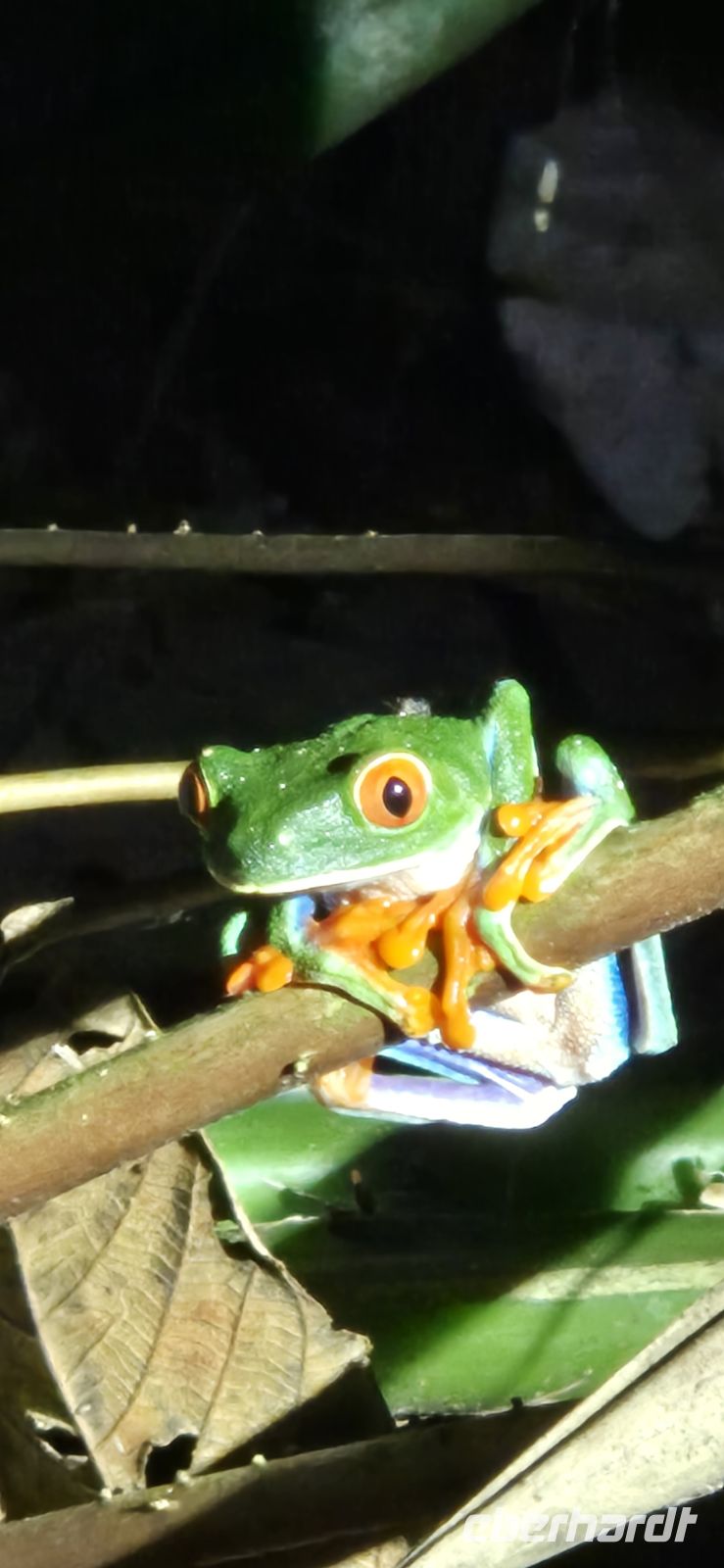 Natürlich darf auch eine Verkostung nicht fehlen. Neben frisch gebrühtem Kaffee probieren wir einen aromatischen Kaffeelikör, der hier hergestellt wird. Anschließend genießen wir ein typisches costa-ricanisches Mittagessen – ein Casado mit Reis, Bohnen, Salat und verschiedenen Zutaten. Einfach, frisch und sehr authentisch. Am Nachmittag setzen wir unsere Reise fort und erreichen schließlich unsere Unterkunft nahe La Fortuna, am Fuße des beeindruckenden Arenal Volcano. Die Arenal Oasis Eco Lodge & Wildlife Refuge liegt eingebettet in üppige Natur – kleine Bungalows, tropische Pflanzen und überall Vogelstimmen. Das Glück ist uns holt und wir entdecken ein erstes Faultier über uns in einer Baumkrone-na wenn das kein gutes Omen ist! Mit Einbruch der Dunkelheit wartet noch ein besonderes Erlebnis auf uns: eine geführte Wanderung durch den nächtlichen Regenwald. Sobald es dunkel wird, erwacht hier eine ganz eigene Welt. Frösche rufen aus dem Unterholz, Insekten zirpen und mit etwas Glück entdecken wir einige der faszinierenden Bewohner des tropischen Waldes.