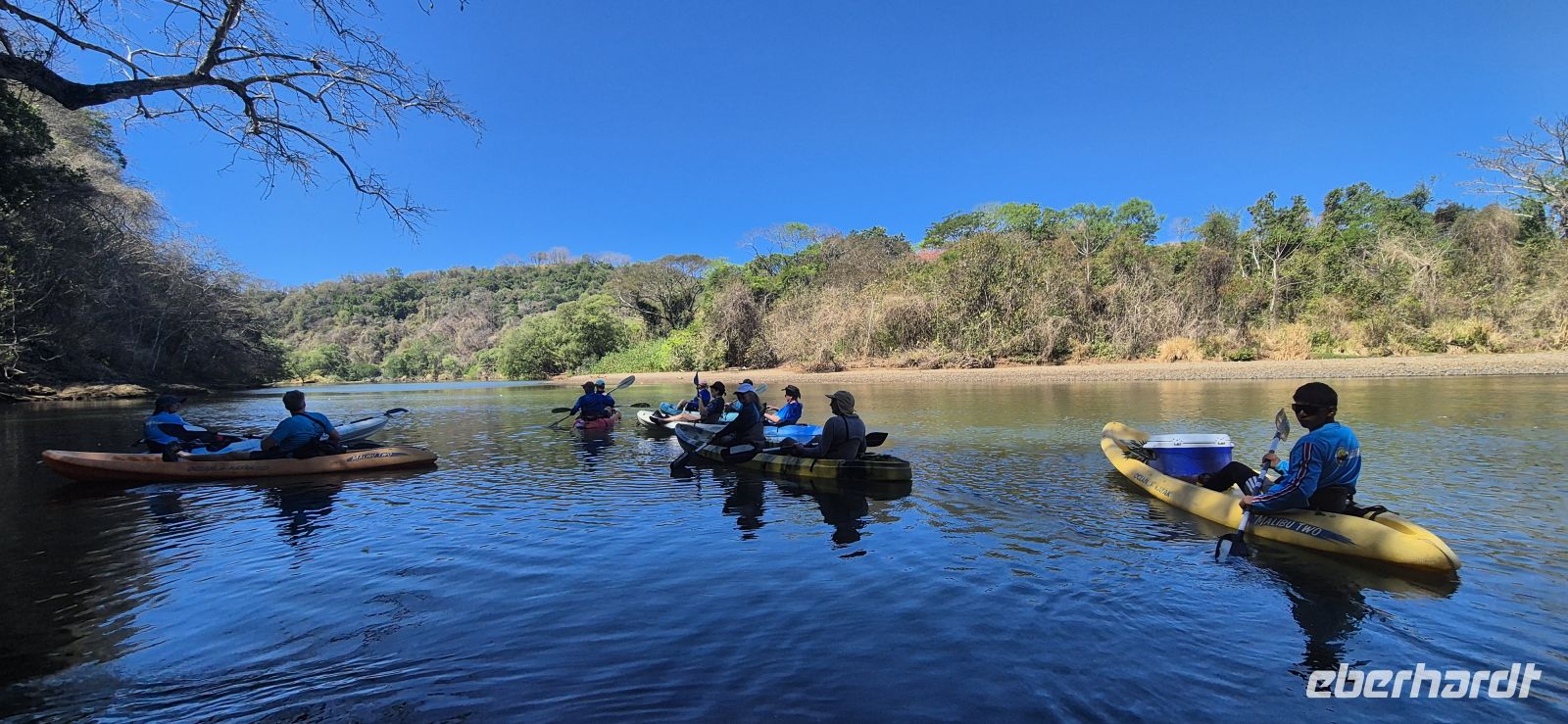 Schon bald brechen wir zu unserem Morgenausflug auf. Unser Guide Xavier holt uns ab und gemeinsam fahren wir zur Küste. Unser Ziel liegt in der Nähe des traumhaften Playa Carrillo, einer der schönsten Strände an der Pazifikküste von Costa Rica. Die weit geschwungene Bucht ist von unzähligen Kokospalmen gesäumt und wirkt mit ihrem hellen Sand und dem türkisfarbenen Wasser wie aus dem Bilderbuch. Noch einige Minuten abseits der Landstraße beginnt unser Kajakabenteuer. Nachdem wir uns jeweils zu zweit in die Boote verteilt haben, gleiten wir ruhig über das Wasser des Río Ora. Die Landschaft um uns herum ist beeindruckend: dichter tropischer Wald, spiegelglattes Wasser und eine wohltuende Stille. Hoch oben in den Baumwipfeln schlafen noch einige Brüllaffenfamilien, während wir lautlos vorbei paddeln. Immer wieder entdecken wir Vögel – Reiher am Ufer, Bussarde über uns in der Luft und mit etwas Glück sogar einen Adler. Schließlich erreichen wir die Flussmündung, wo der Fluss in den Pazifik übergeht. Hier legen wir eine entspannte Pause ein. Während wir kühle Getränke genießen und uns frische Ananas und saftige Wassermelone schmecken lassen, schweift unser Blick über den weiten Ozean. Natürlich nutzen wir die Gelegenheit auch für einen kleinen Spaziergang am Strand, bei dem uns die warmen Wellen des Pazifiks um die Füße spielen. Der Rückweg im Kajak gestaltet sich besonders angenehm, denn Wind und Strömung unterstützen uns. Fast mühelos gleiten wir zurück zum Ausgangspunkt. Von dort bringt uns unser Bus wieder zur Unterkunft, sodass wir gegen Mittag zurück sind.