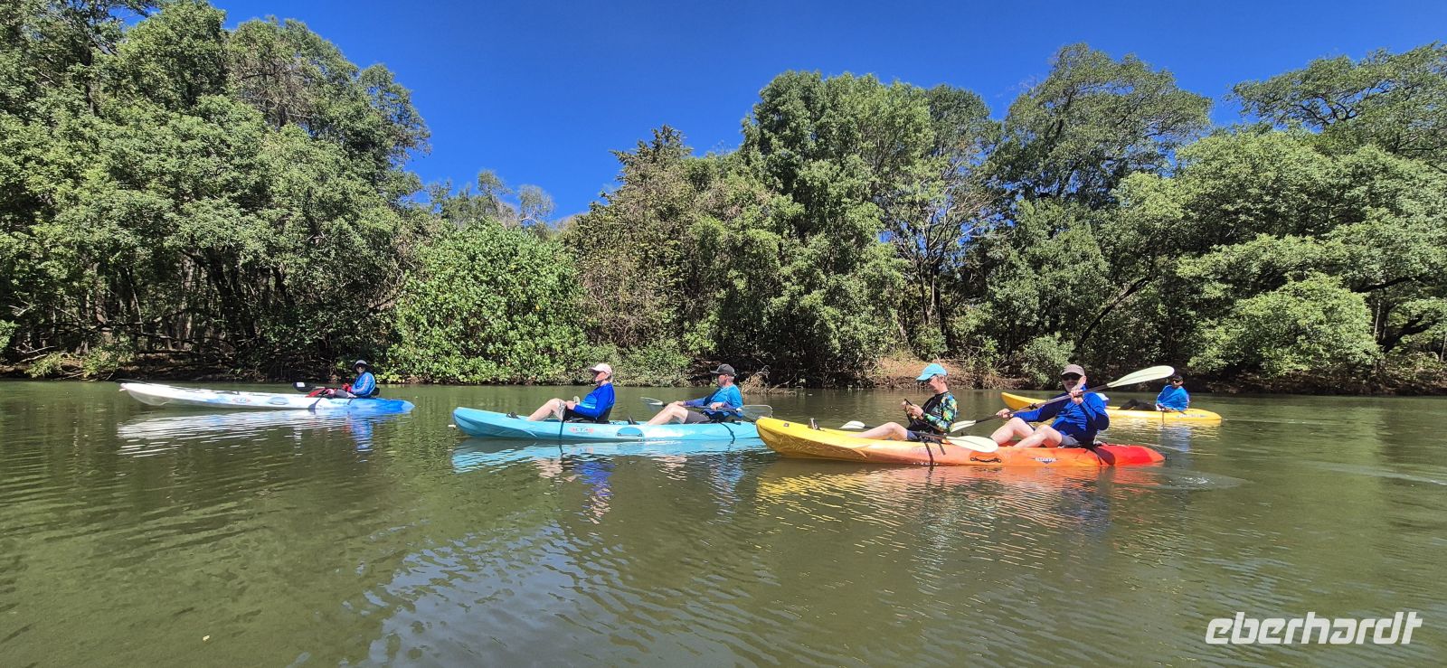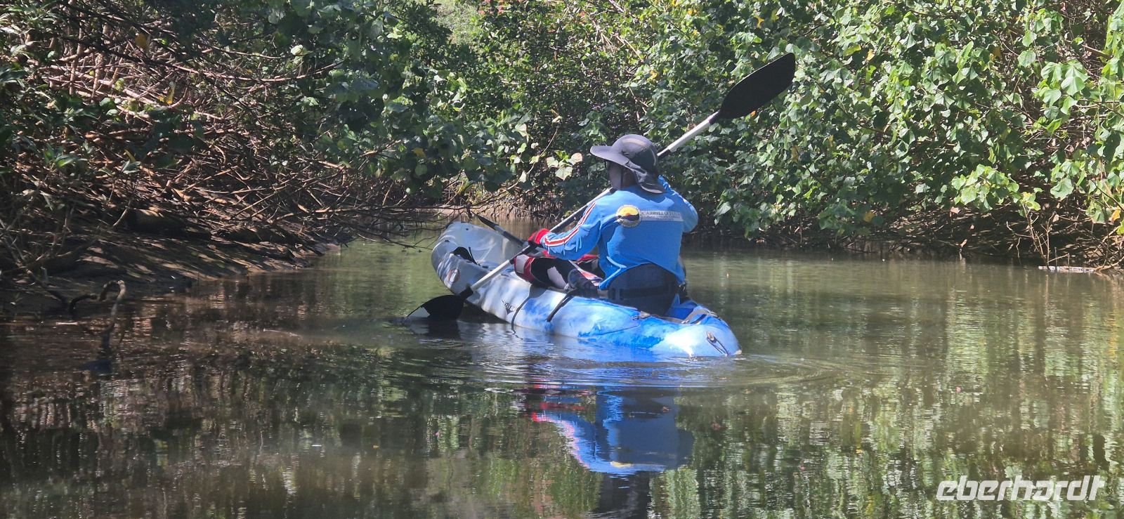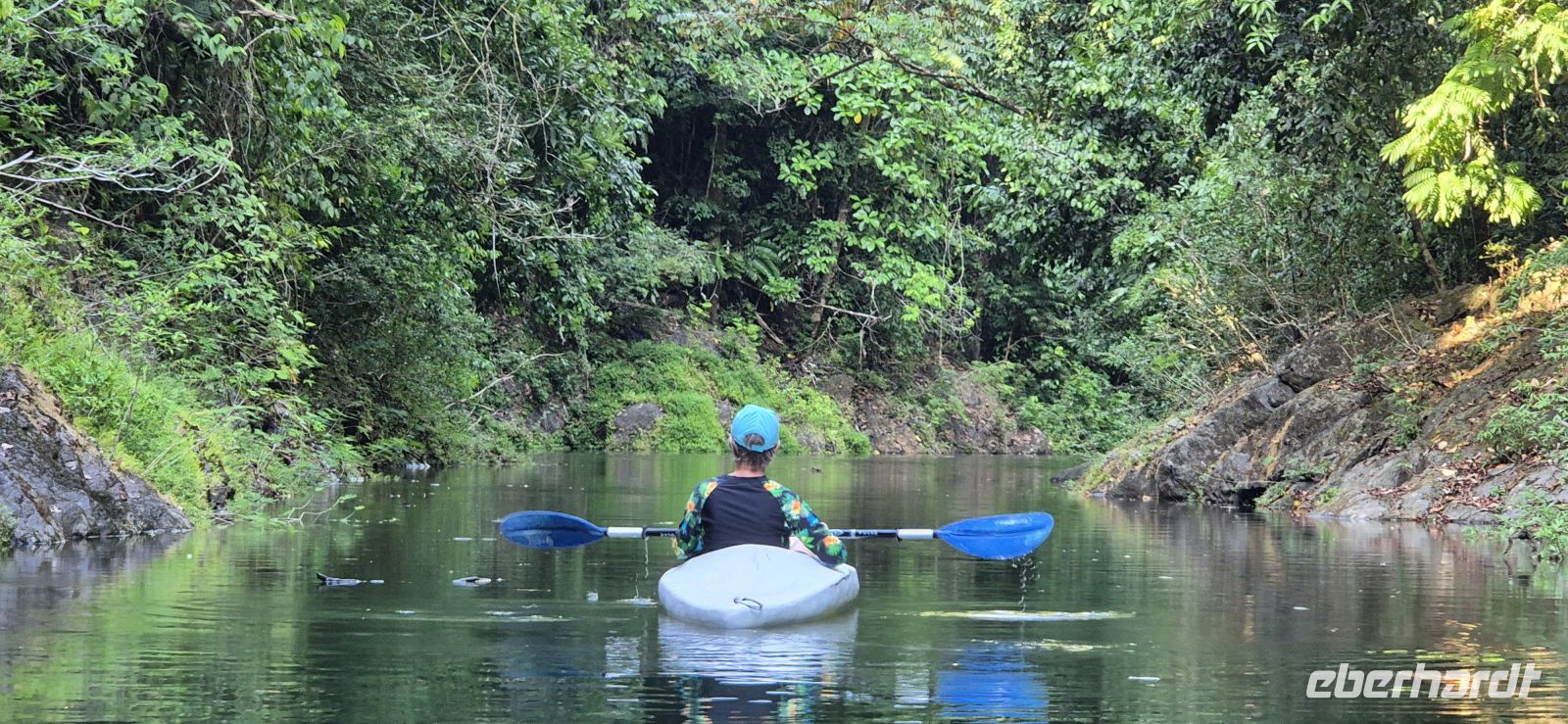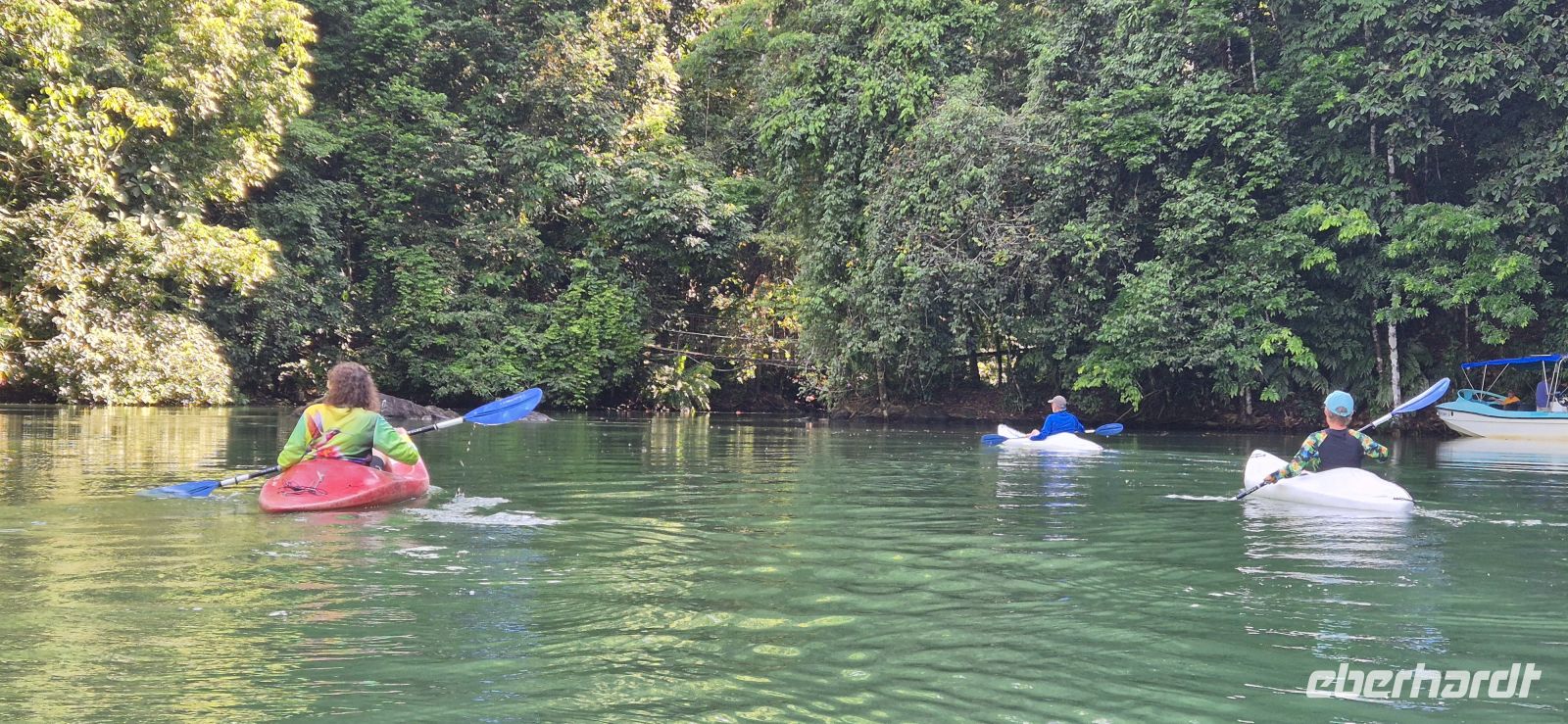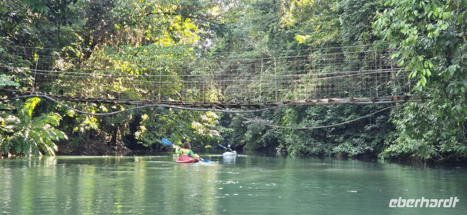 Am Nachmittag kehren wir per Boot zurück zu unserer Lodge. Die Eindrücke des Tages sind noch ganz frisch, doch wer möchte, nutzt die verbleibende Zeit für ein weiteres kleines Abenteuer: Einige von uns schnappen sich die kostenfrei zur Verfügung gestellten Kajaks der Lodge und paddeln gemütlich den Fluss hinauf. Ganz entspannt gleiten wir durch die stille Wasserwelt, die sich wie ein dichter, lebendiger Dschungel um uns legt. Dabei entdecken wir erneut faszinierende Tierwelt – Reiher stehen regungslos am Ufer, Brüllaffen melden sich aus den Baumwipfeln, und wir genießen einfach diesen besonderen Moment mitten in der Natur.