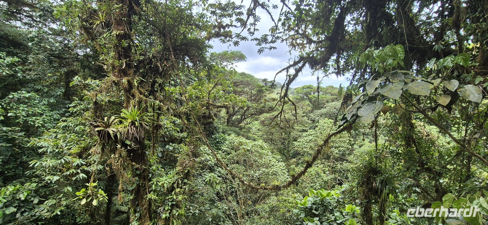 Ein letztes Mal genießen wir das reichhaltige Frühstück in Samara und greifen kräftig zu, bevor es weitergeht. Wir brechen auf und machen uns auf den Weg Richtung Monteverde. Unsere erste Pause führt uns nach Limonal, wo wir normalerweise eine erste Ara Begegnung in Costa Rica Aras in freier Wildbahn hätten, so nicht heute, sie bleiben verschollen. Unsere Reiseleiter Nico erklärt uns, dass es sich hier um eine Art Auffangstation handelt, die versuchte, die Aras wieder auszuwildern. Allerdings haben die Tiere es so gut hier, dass viele von ihnen einfach bleiben. Als wollten sie uns ein wenig ärgern, tauchen nach unserer Abreise plötzlich fünf rote Aras am Himmel auf. Was soll’s, kommt Zeit, kommen weitere Aras. Der Weg nach Monteverde führt uns teils auf holpriger Strecke, immer höher hinauf in die Berge, wo uns ein unglaublicher Ausblick auf die Nicoya-Halbinsel erwartet. Mittags erreichen wir das Anwesen von Dona Hermida. Hier werden wir zum einen herzlich begrüßt und mit einem traditionellen, köstlichen Mittagessen mit schmackhafter Hausmannskost verwöhnt. Auf der Veranda sitzend, genießen wir das angenehme Ambiente. Nico hat uns vorab bereits mehr über die Geschichte von Dona Hermida und ihrem beeindruckenden Naturimperium erzählt, das sie vor Jahrzehnten aufbaute. Nach dem Mittagessen lädt sie uns zu einem Rundgang durch das Anwesen ein. Wir entdecken Kaffeeplantagen, Kräutergärten, tropische Früchte wie Papaya und Jackfrucht, Bananenstauden, Pomelos und Mangobäume. Mit einem letzten Blick auf die Kaffeeplantage und frisch für uns geröstetem Kaffee, den wir hier erworben haben, machen wir uns schließlich auf den Weg nach Monteverde. Nach dem Check-in in unserem Hotel treffen wir Ricardo, einer der Gründungsmitglieder Monte Verdes und Teil der örtlichen Quäkergemeinde. Sehr anschaulich vermittelt er uns die Geschichte der Monteverde-Region, die einst von einer Gruppe Quäker, zu der auch sein Vater gehörte, gegründet wurde. Diese Pazifisten fanden in Costa Rica ein neues Zuhause, als sie in den USA mit der Politik ihres Heimatlandes nicht mehr übereinstimmen konnten. Es ist eine faszinierende Erzählung, untermalt mit Originalfotos aus Ricardos Familienalbum, die uns tiefe Einblicke in die Vergangenheit der Region geben. Der Abend klingt im Hotelrestaurant aus und wir freuen uns auf den morgigen Tag, wenn wir den Nebelwald Costa Ricas erkunden.