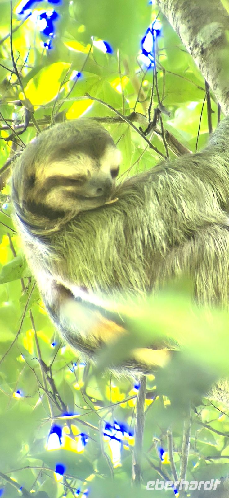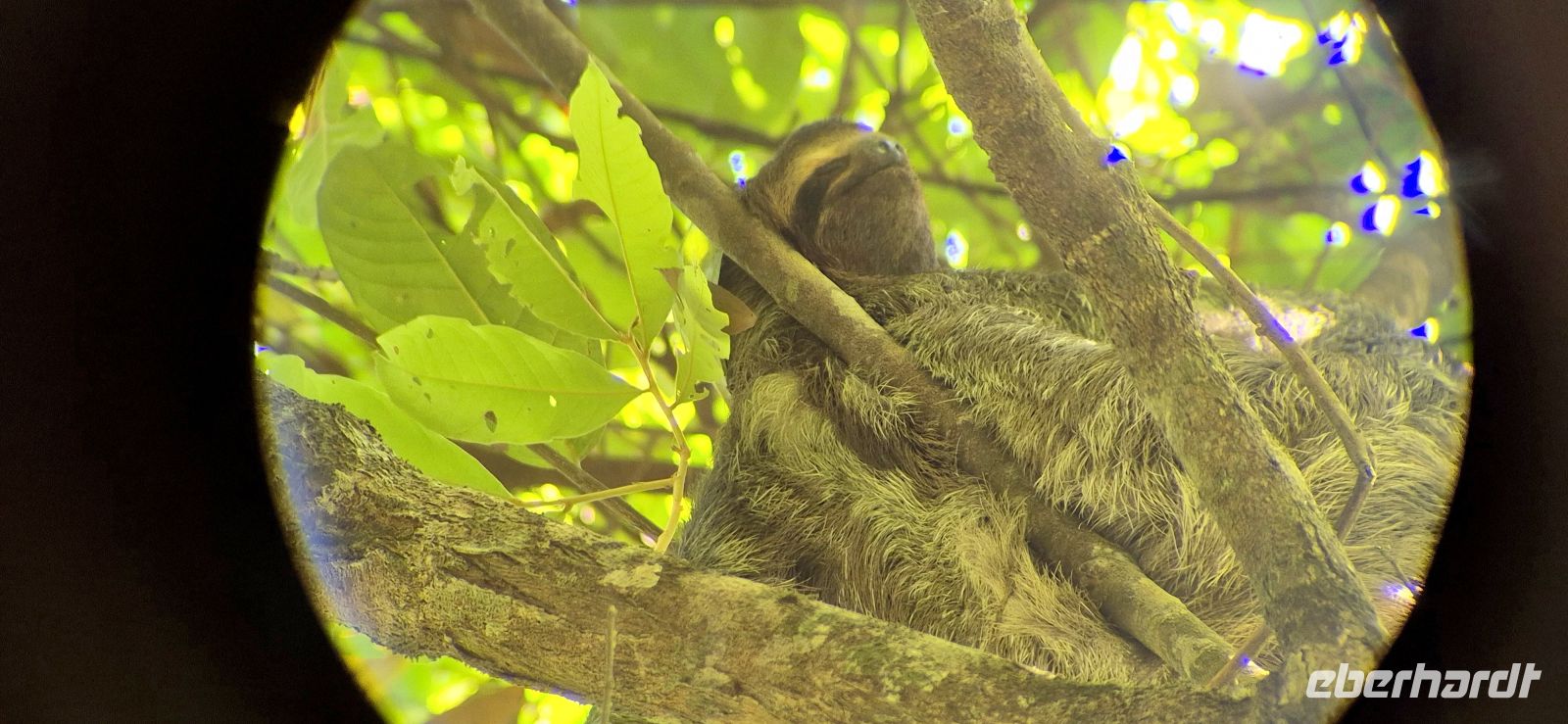 Mit Hilfe ihrer Teleskope und der Fähigkeit die Tierstimmen exakt zu imitieren, entdecken wir Tiere, die unseren Augen sonst verborgen geblieben wären. Ein ganz besonderer Moment: Hoch oben in den Baumwipfeln erspähen wir ein Dreifinger-Faultier, das es sich gemütlich gemacht hat. Durch die Vergrößerung wirkt es zum Greifen nah – ein unvergesslicher Anblick.