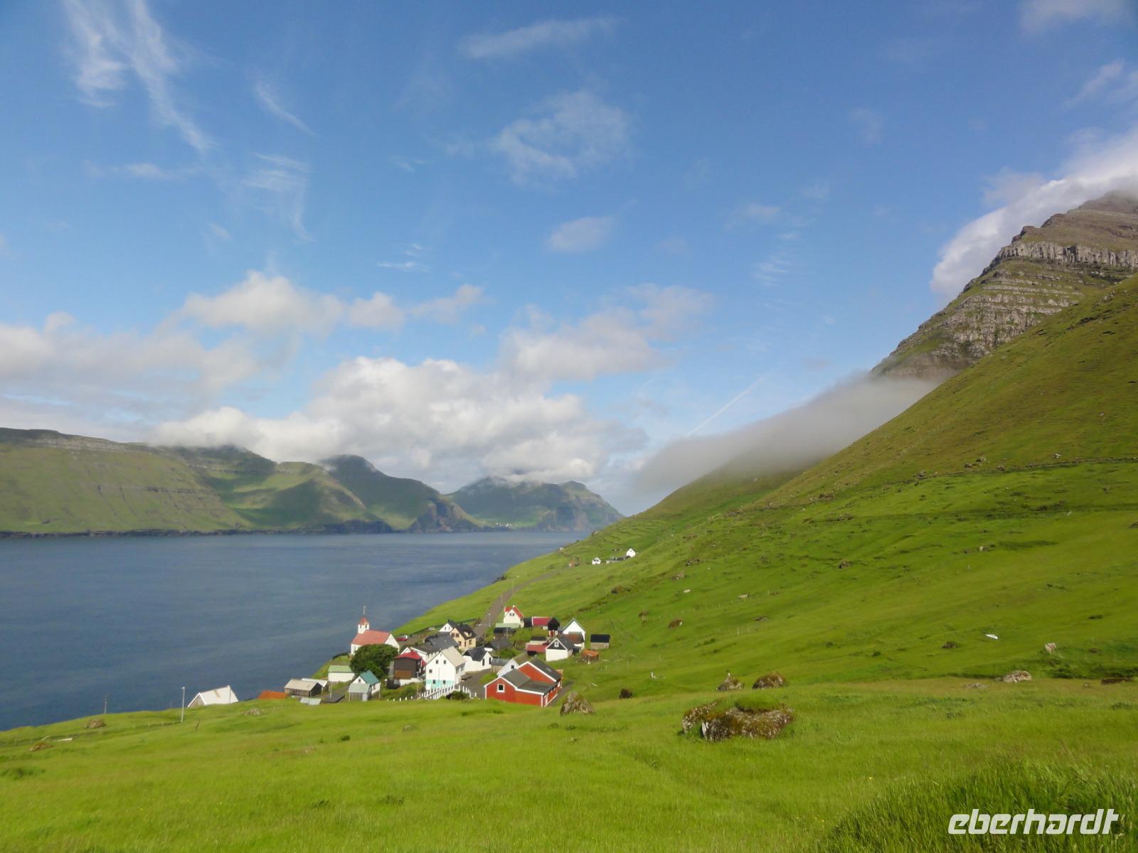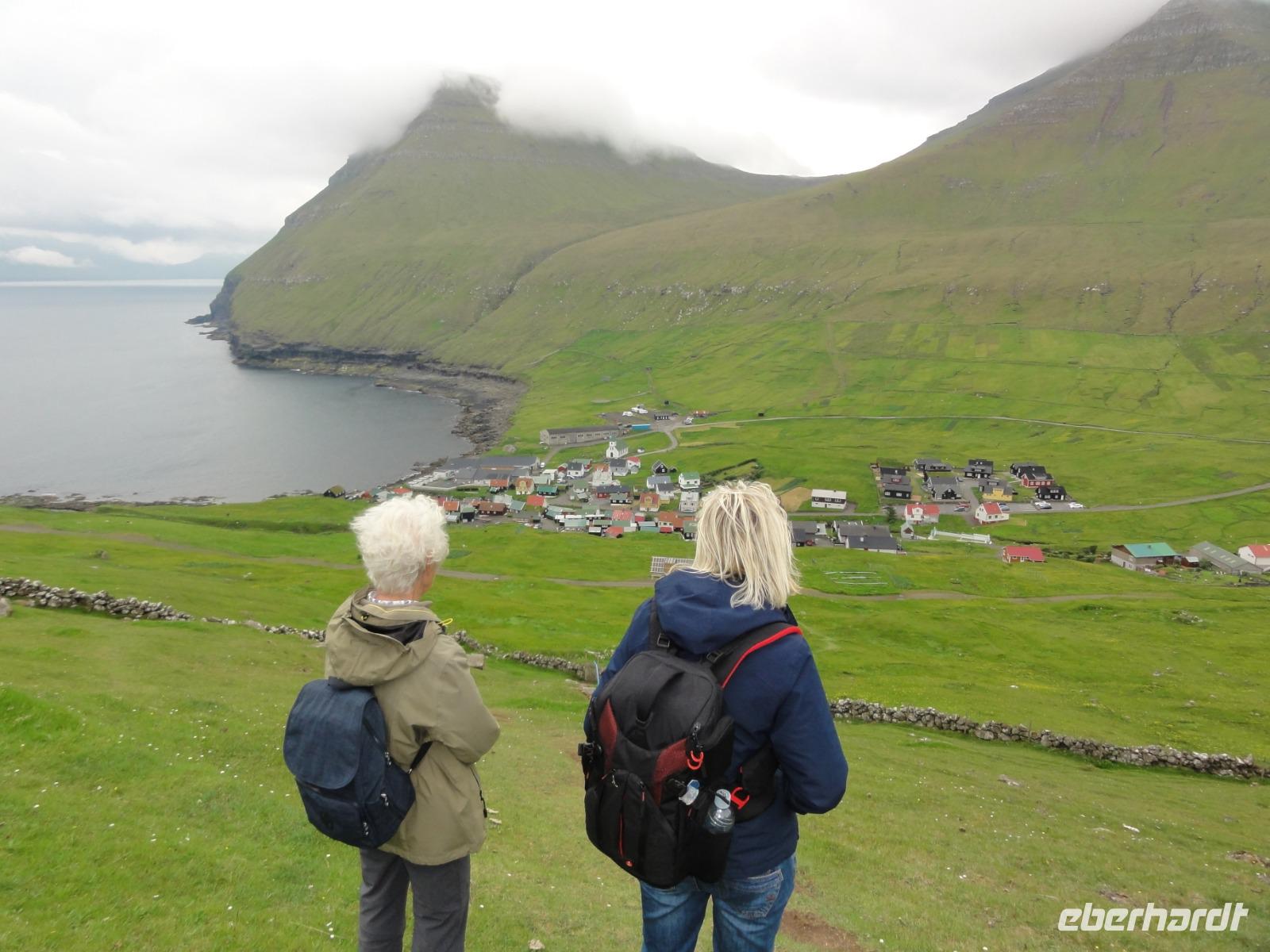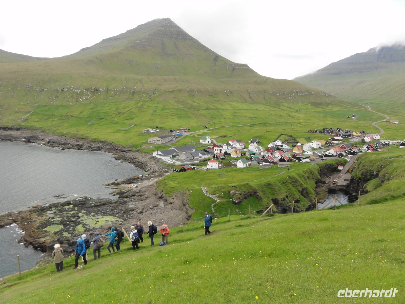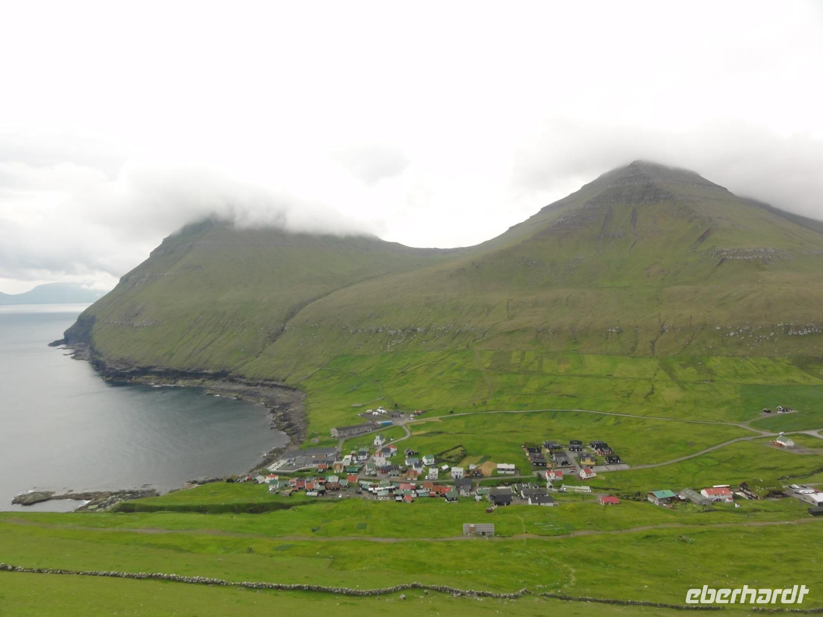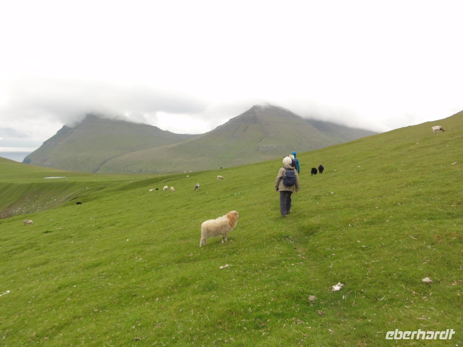 Nach dem Frühstück heißt es Wanderschuhe an und unser erstes Ziel ist Gjogv wo unsere Wanderung startet. Unterwegs sehen wir einige Schaefer die ihre Schafe zusammentreiben und machen einen Fotostopp oberhalb von Funningur. Von hier haben wir einen fabelhaften Ausblick auf das kleine Dorf unten in der Bucht und die 2 höchsten Berge der Inseln (883 m)