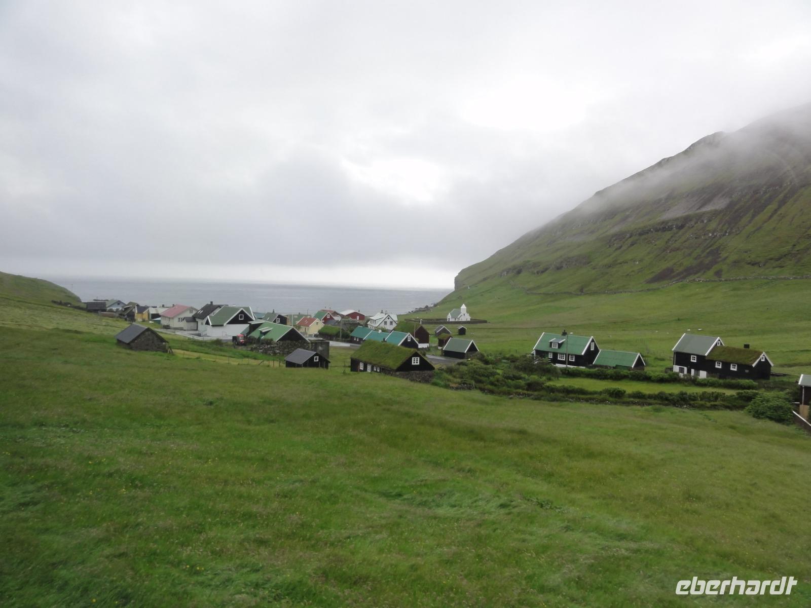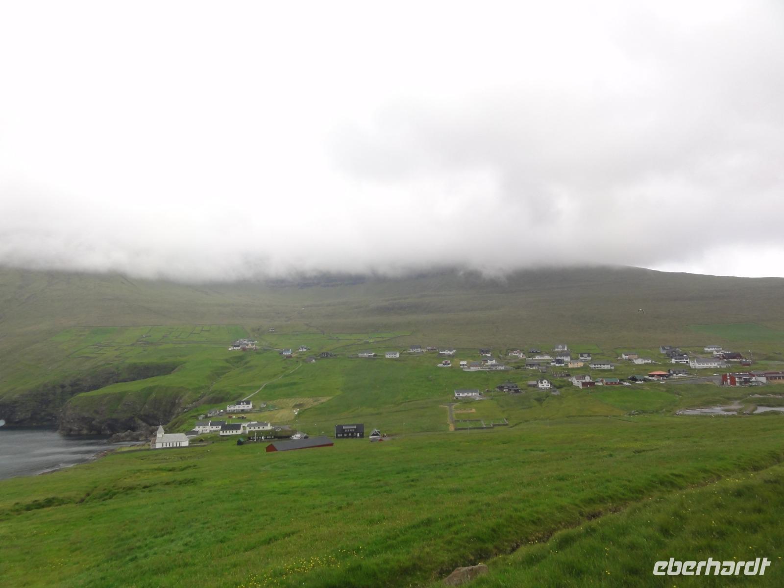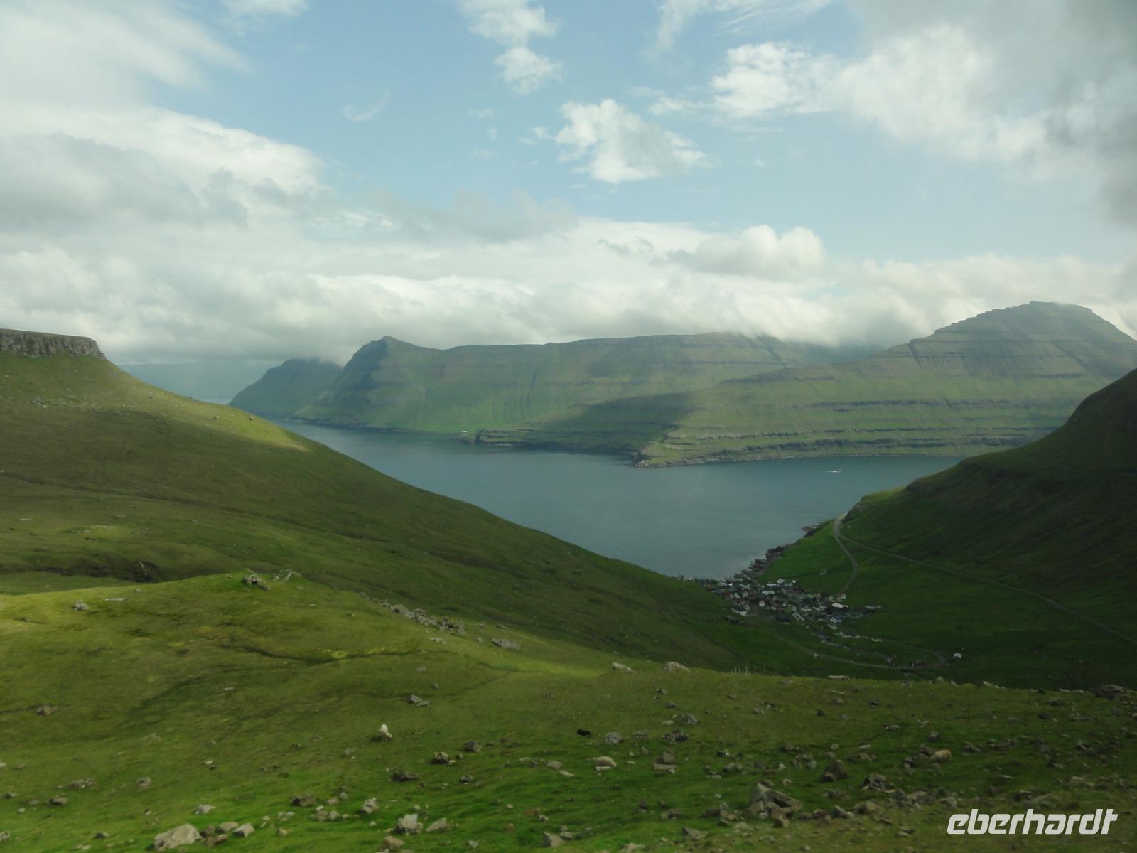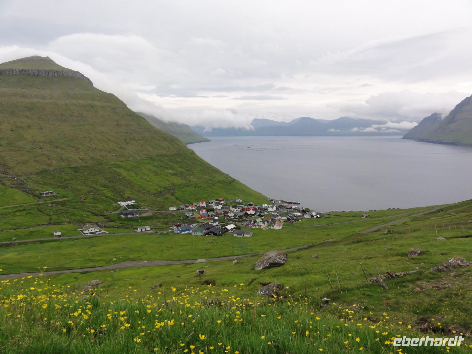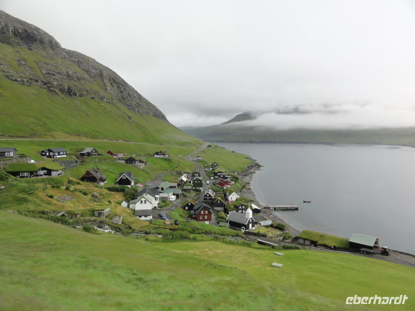 Nach dem Frühstück heißt es Wanderschuhe an und unser erstes Ziel ist Gjogv wo unsere Wanderung startet. Unterwegs sehen wir einige Schaefer die ihre Schafe zusammentreiben und machen einen Fotostopp oberhalb von Funningur. Von hier haben wir einen fabelhaften Ausblick auf das kleine Dorf unten in der Bucht und die 2 höchsten Berge der Inseln (883 m)