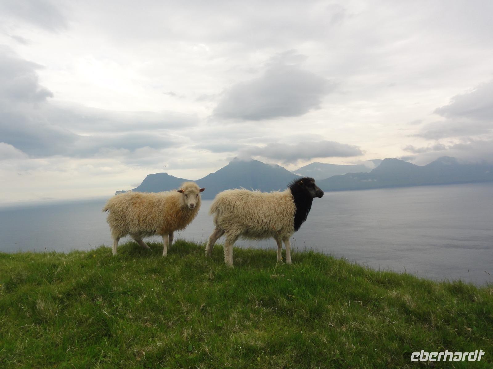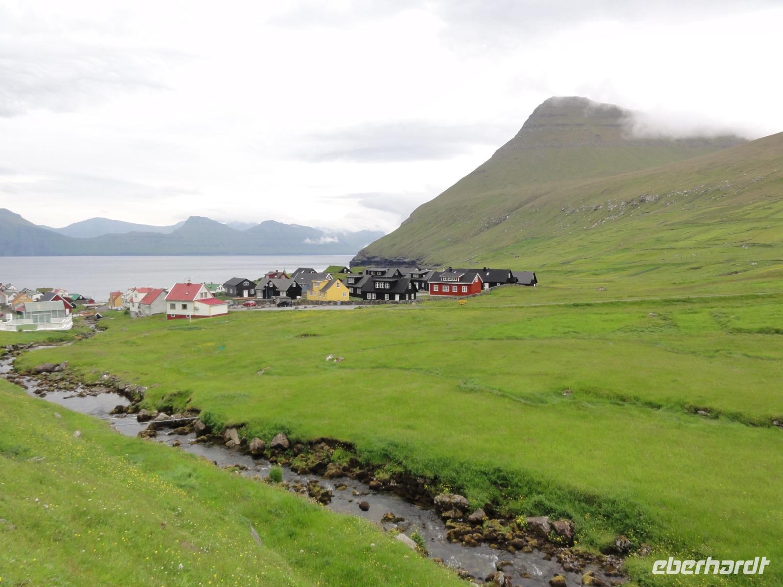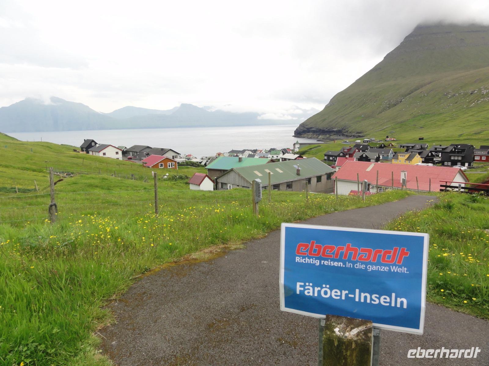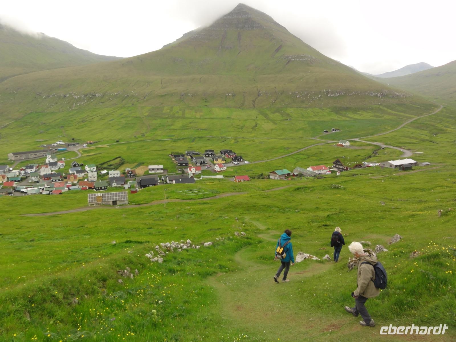Nach dem Frühstück heißt es Wanderschuhe an und unser erstes Ziel ist Gjogv wo unsere Wanderung startet. Unterwegs sehen wir einige Schaefer die ihre Schafe zusammentreiben und machen einen Fotostopp oberhalb von Funningur. Von hier haben wir einen fabelhaften Ausblick auf das kleine Dorf unten in der Bucht und die 2 höchsten Berge der Inseln (883 m)