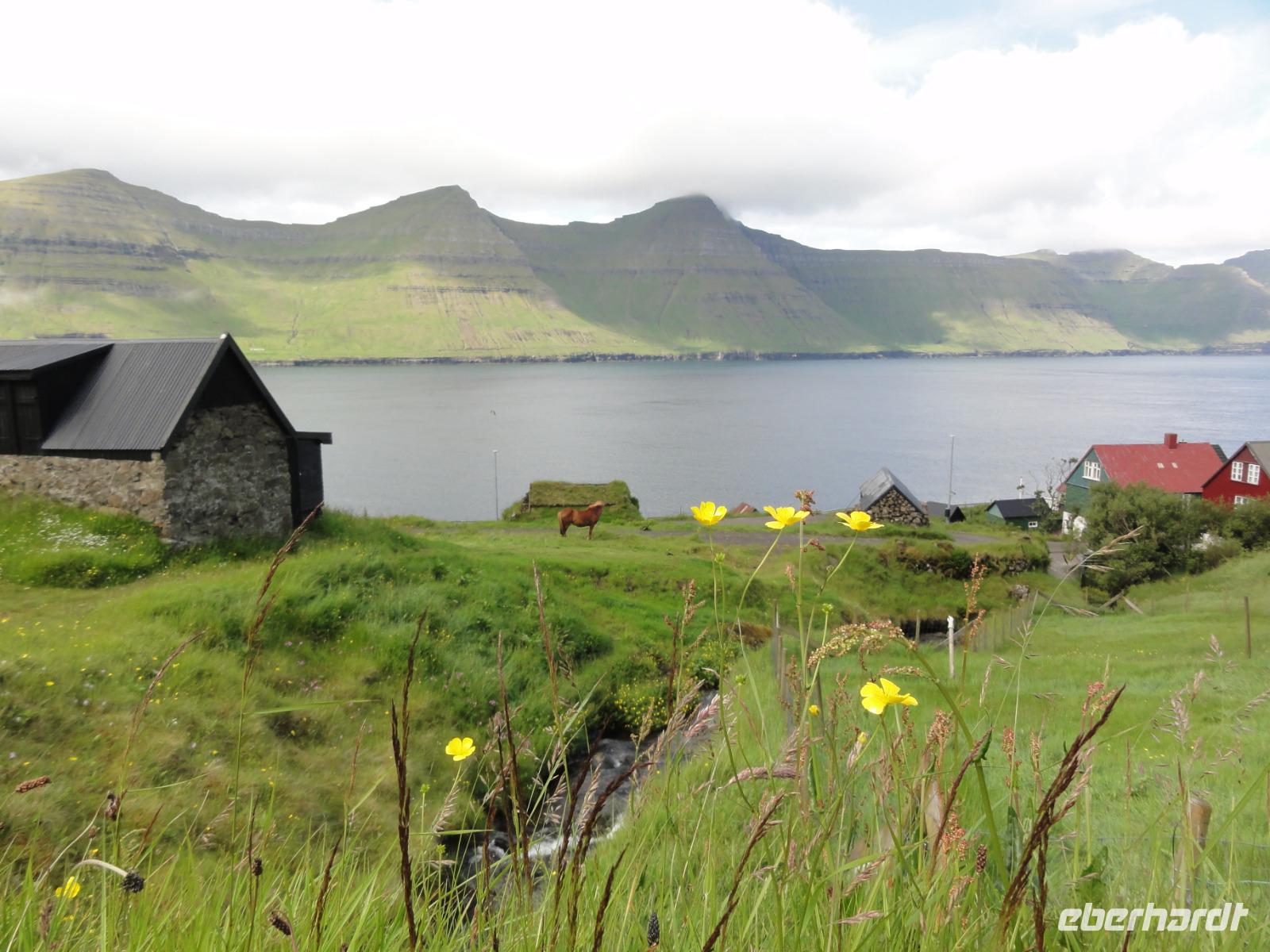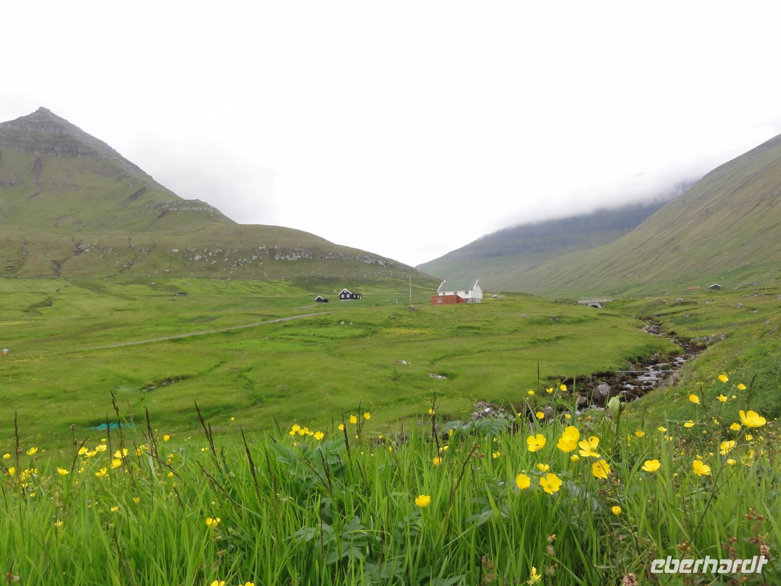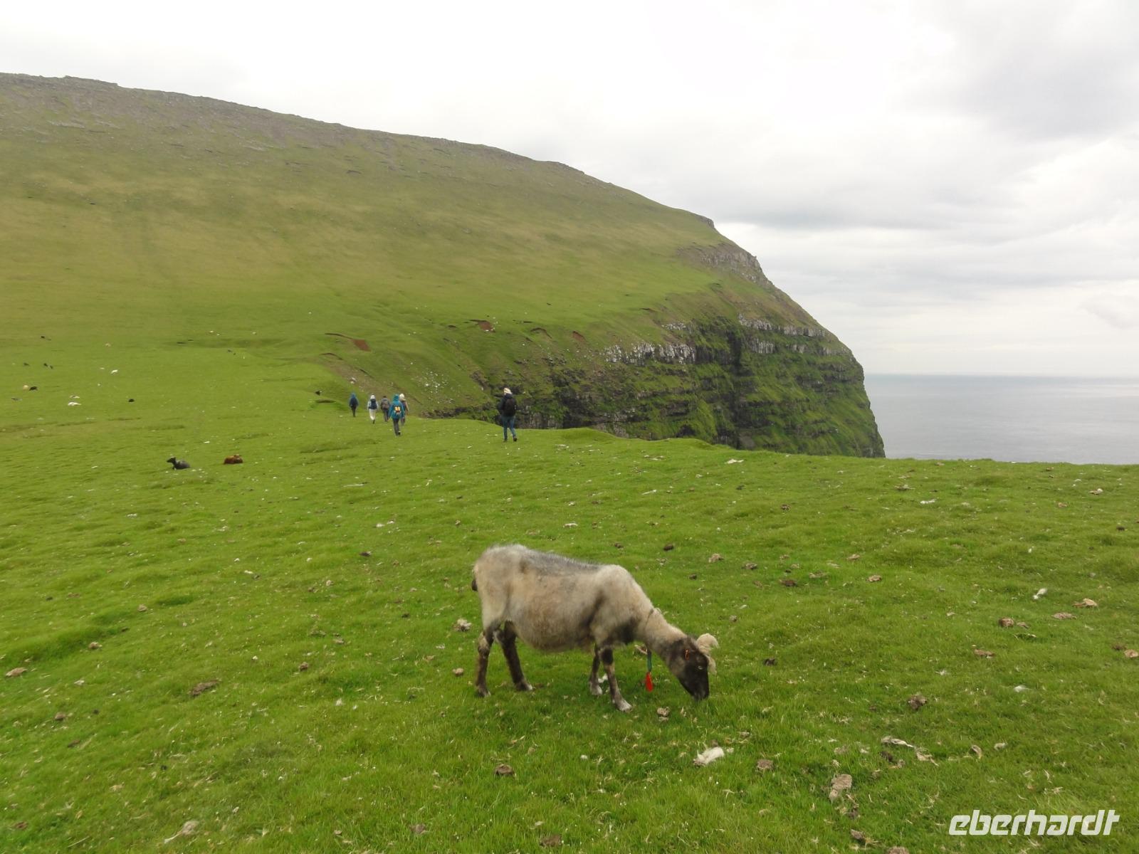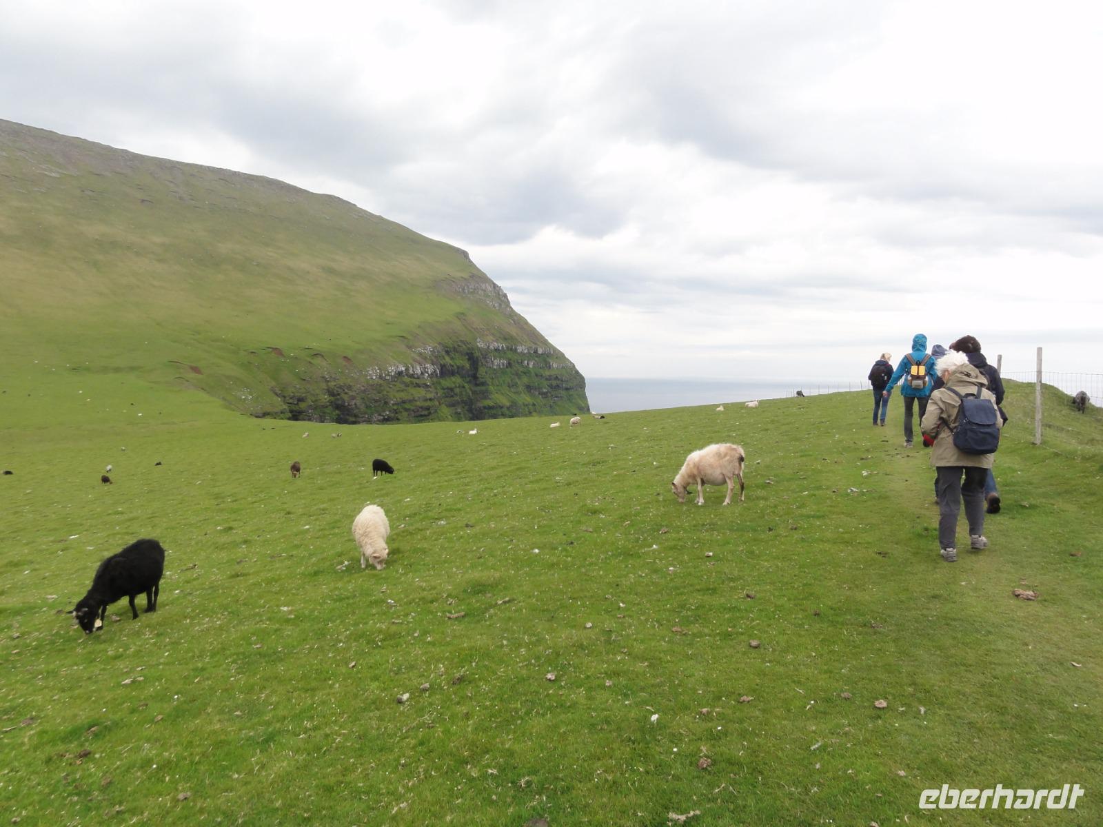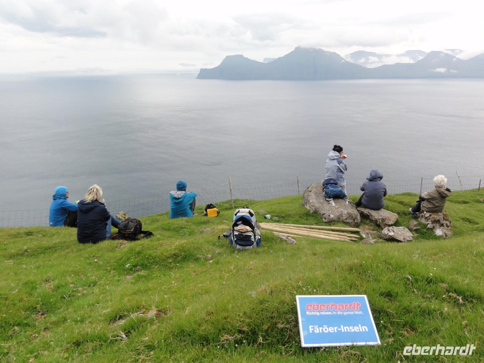 Nach dem Frühstück heißt es Wanderschuhe an und unser erstes Ziel ist Gjogv wo unsere Wanderung startet. Unterwegs sehen wir einige Schaefer die ihre Schafe zusammentreiben und machen einen Fotostopp oberhalb von Funningur. Von hier haben wir einen fabelhaften Ausblick auf das kleine Dorf unten in der Bucht und die 2 höchsten Berge der Inseln (883 m)