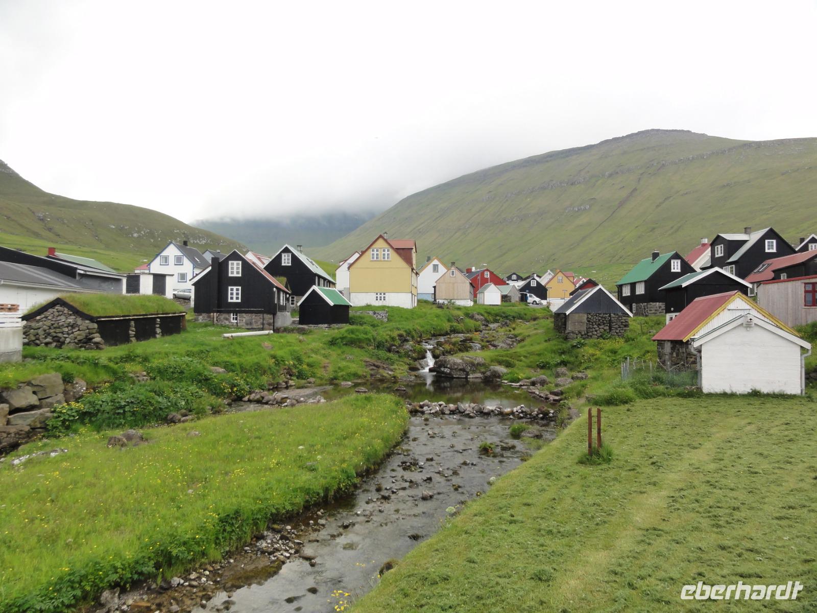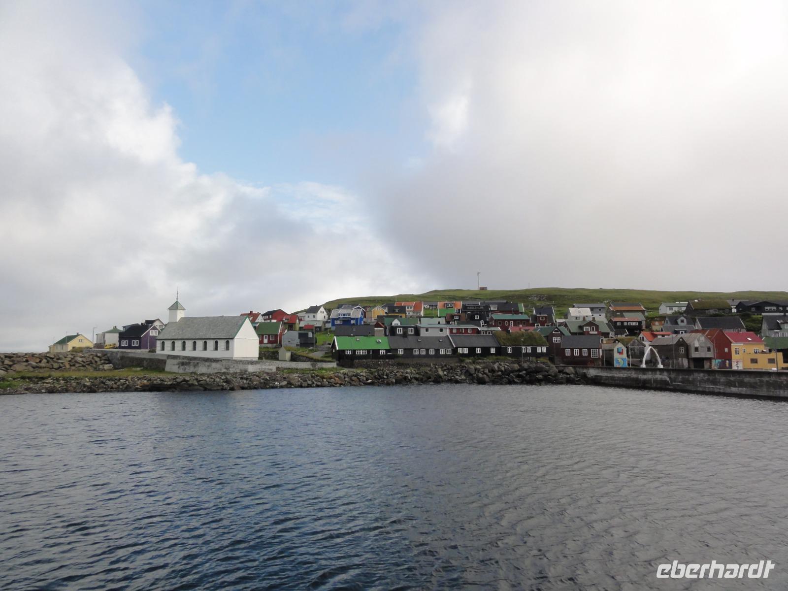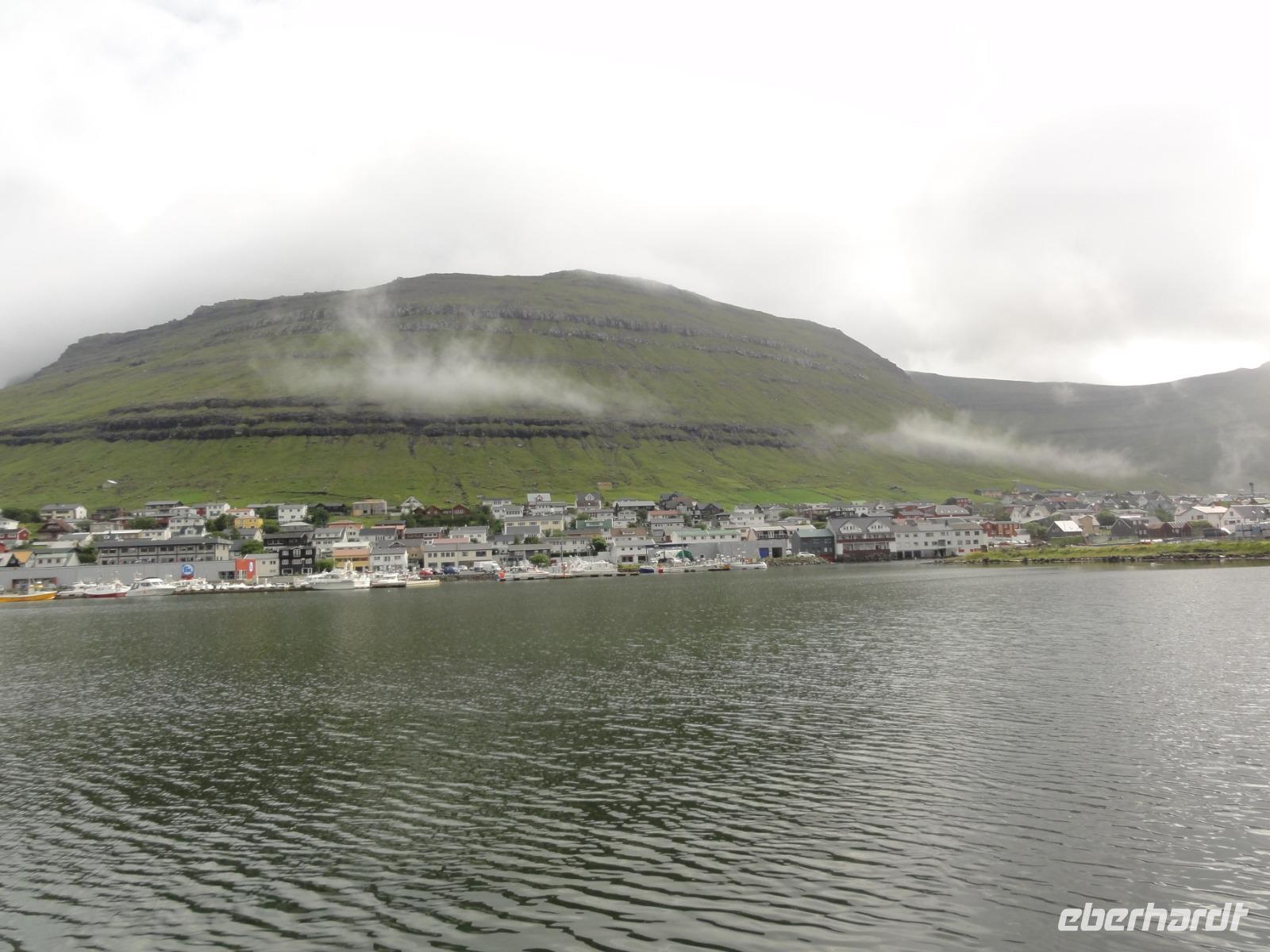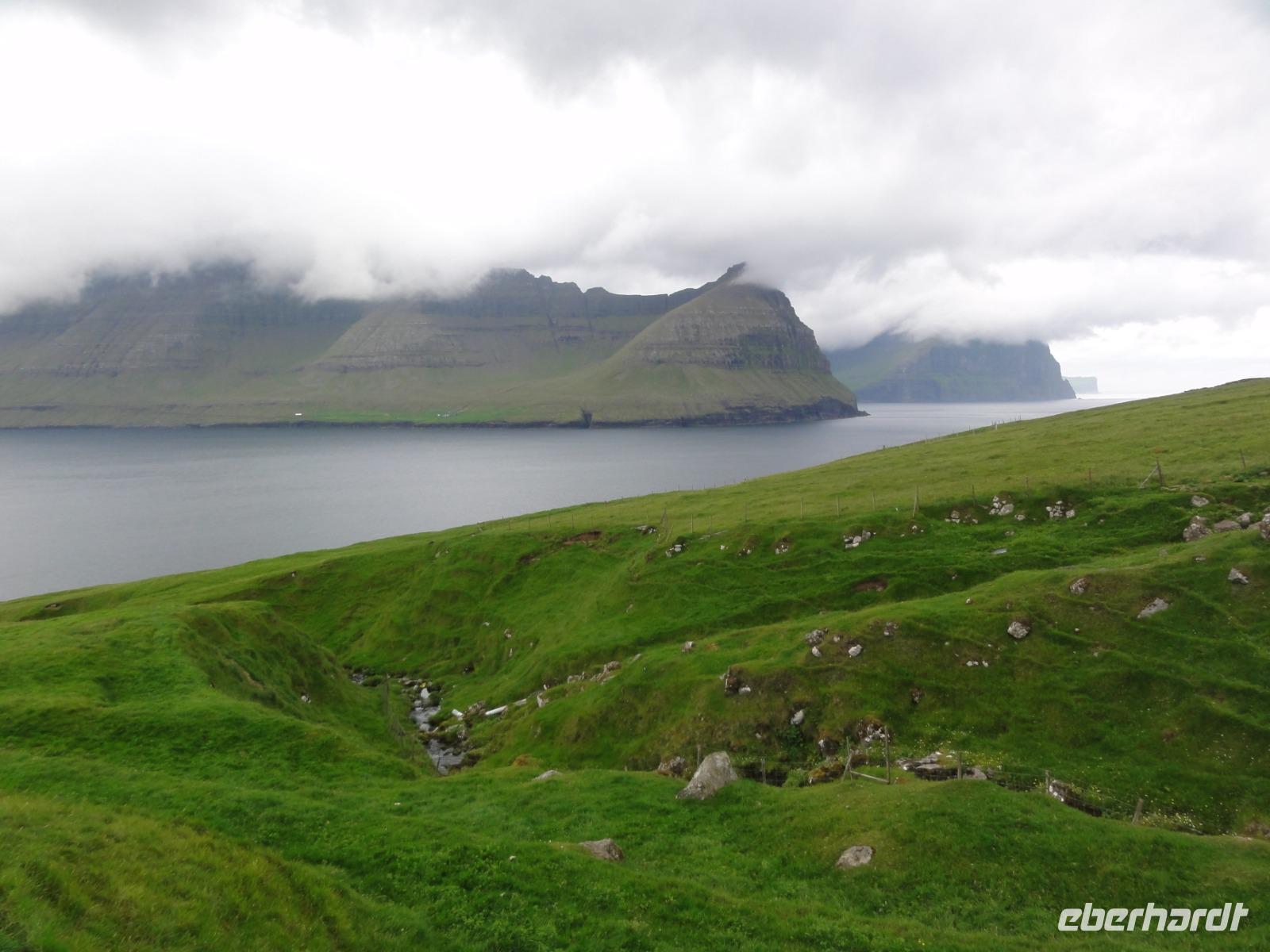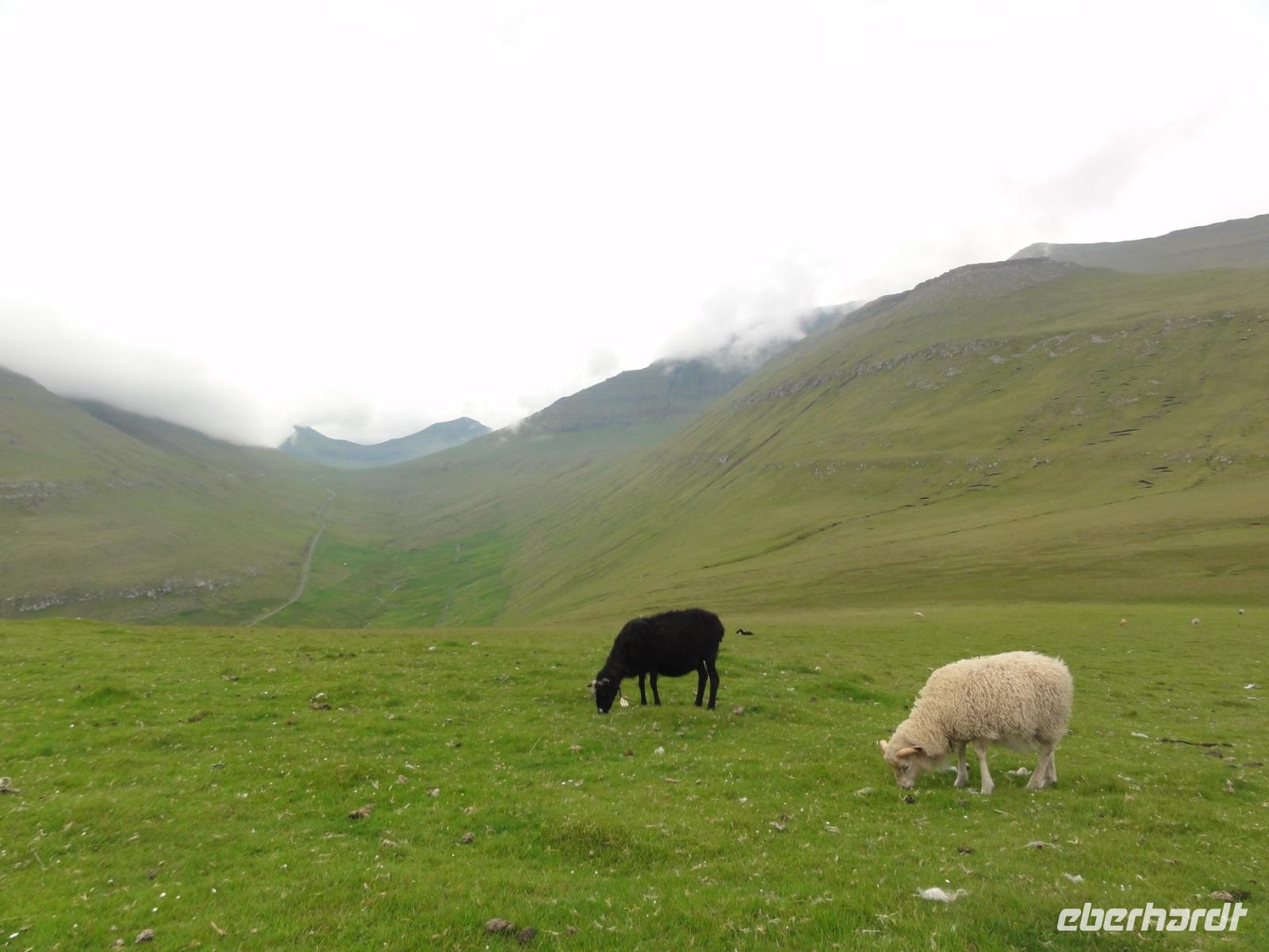 Nach dem Frühstück heißt es Wanderschuhe an und unser erstes Ziel ist Gjogv wo unsere Wanderung startet. Unterwegs sehen wir einige Schaefer die ihre Schafe zusammentreiben und machen einen Fotostopp oberhalb von Funningur. Von hier haben wir einen fabelhaften Ausblick auf das kleine Dorf unten in der Bucht und die 2 höchsten Berge der Inseln (883 m)