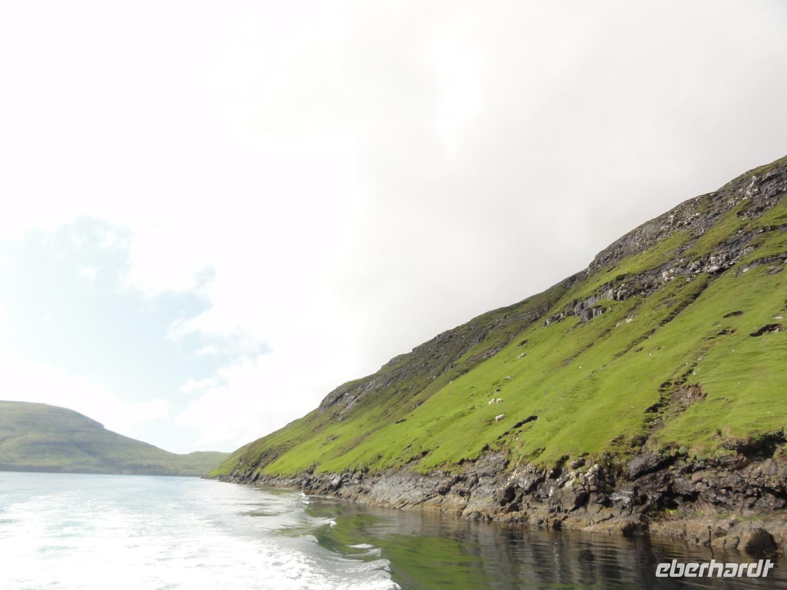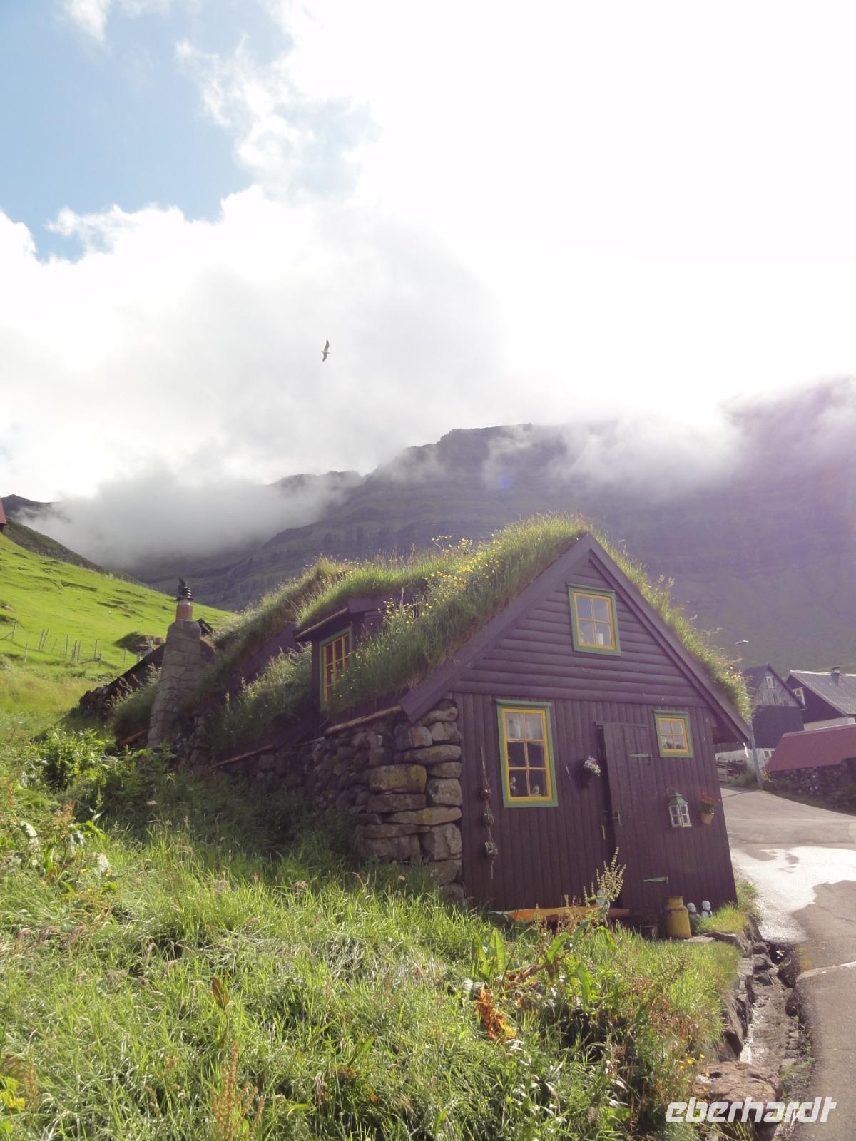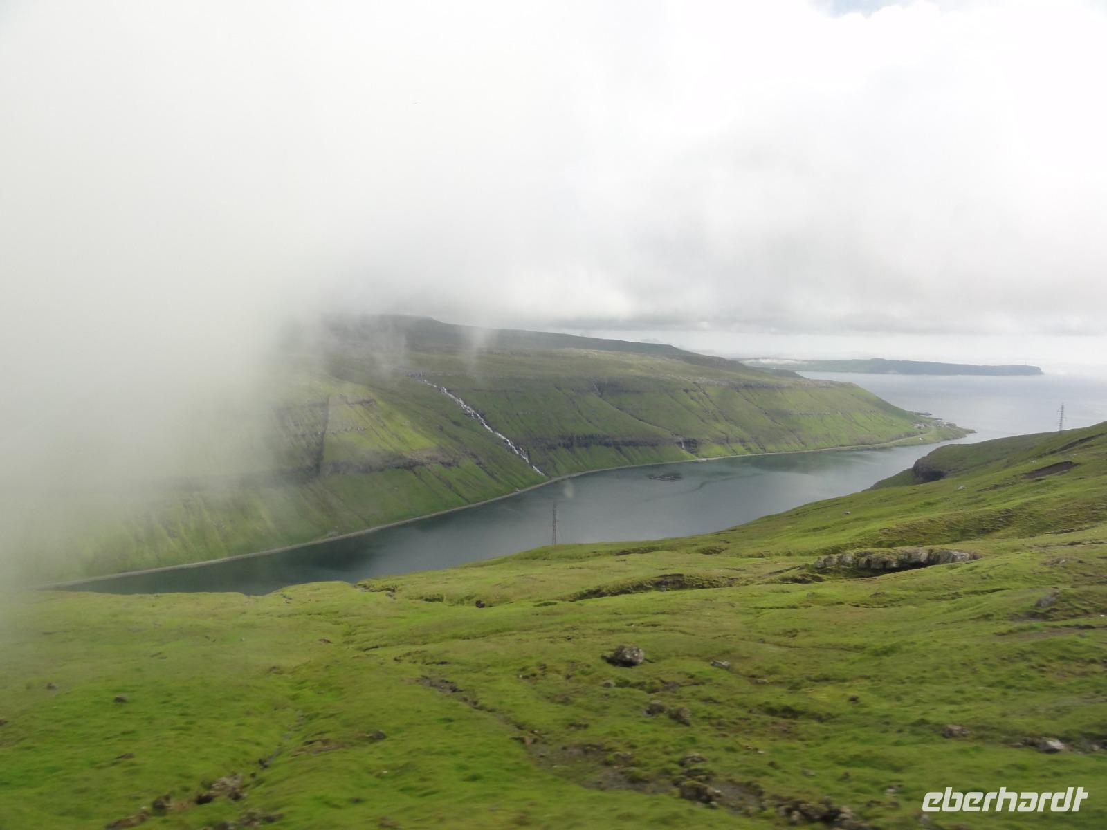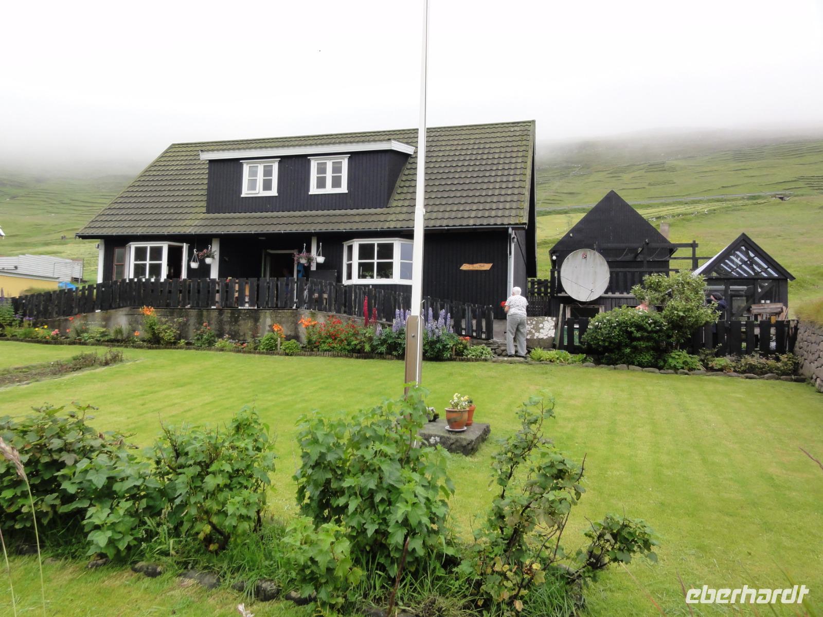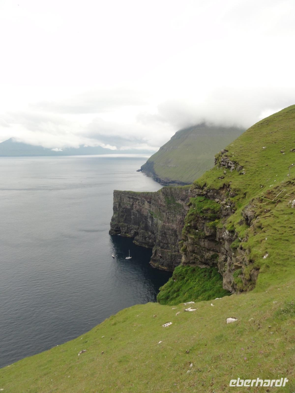 Nach dem Frühstück heißt es Wanderschuhe an und unser erstes Ziel ist Gjogv wo unsere Wanderung startet. Unterwegs sehen wir einige Schaefer die ihre Schafe zusammentreiben und machen einen Fotostopp oberhalb von Funningur. Von hier haben wir einen fabelhaften Ausblick auf das kleine Dorf unten in der Bucht und die 2 höchsten Berge der Inseln (883 m)