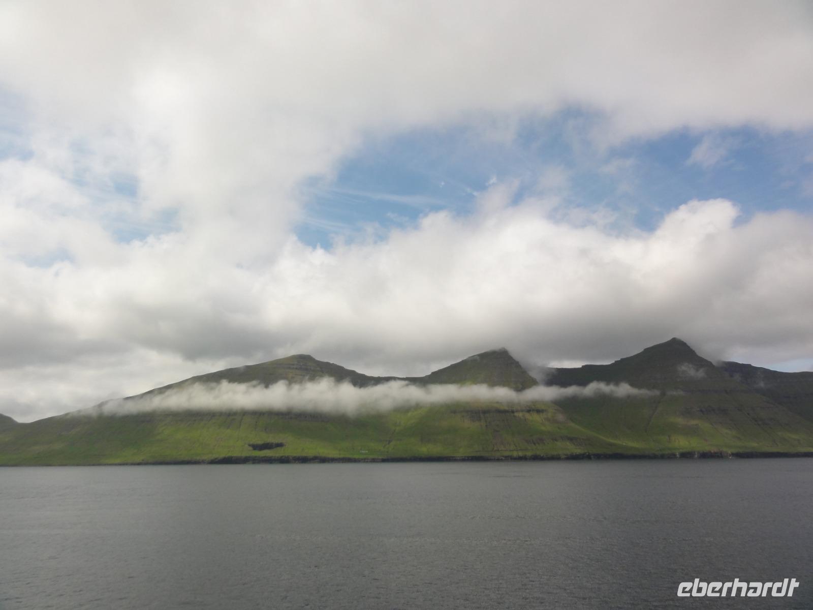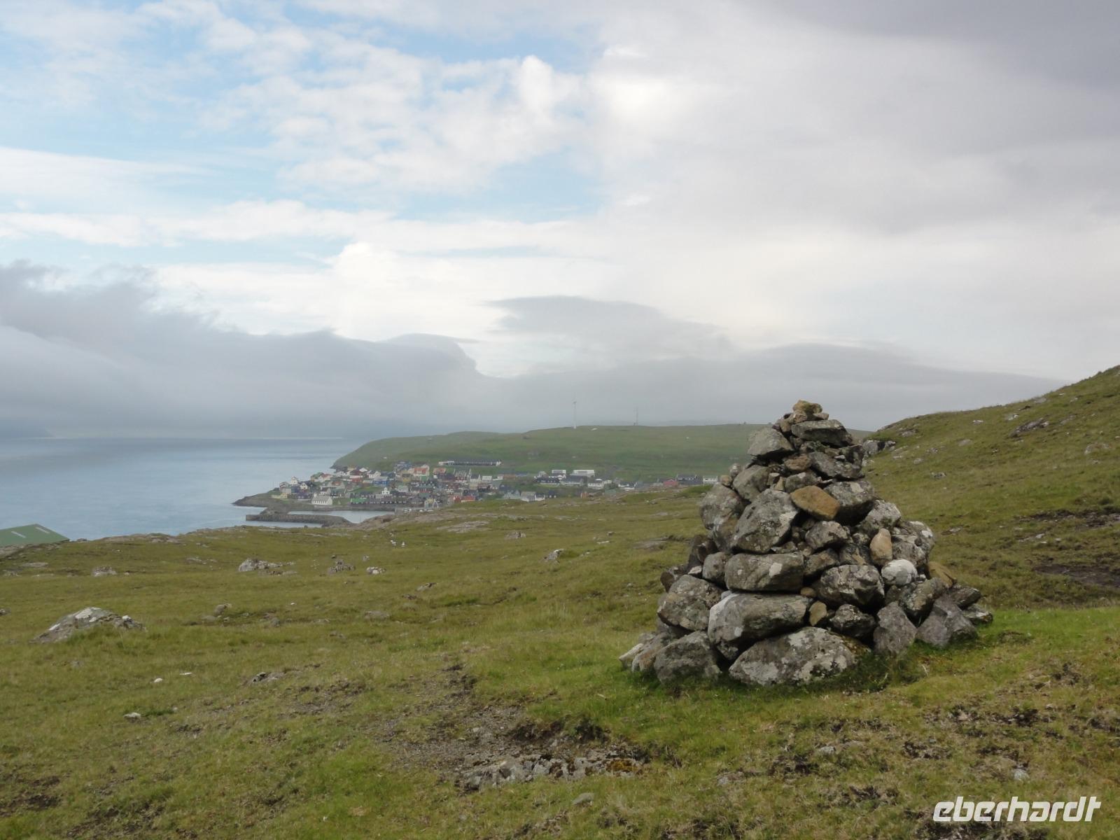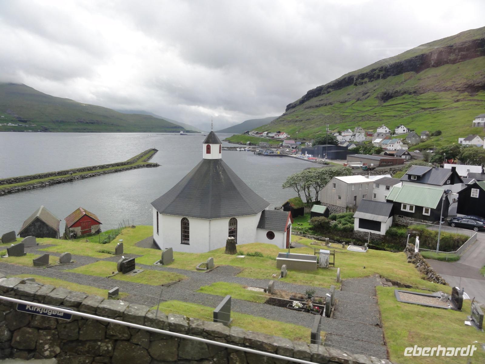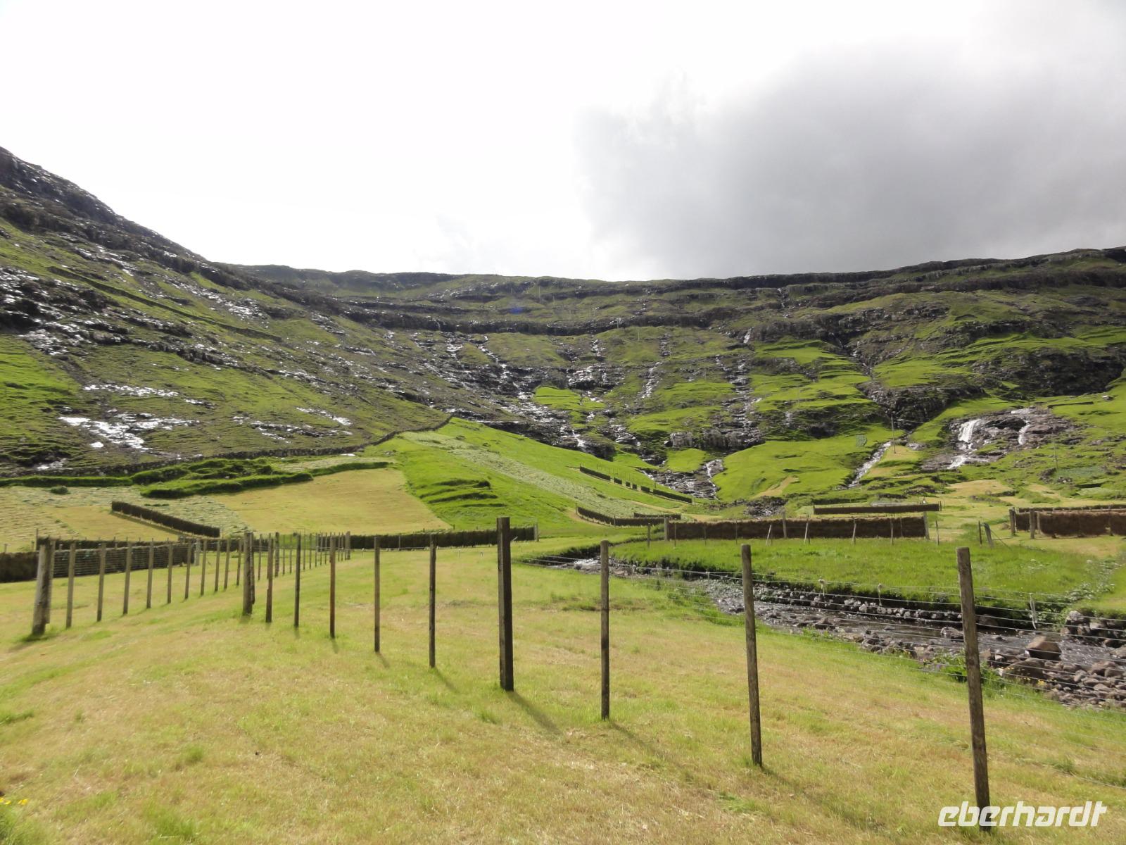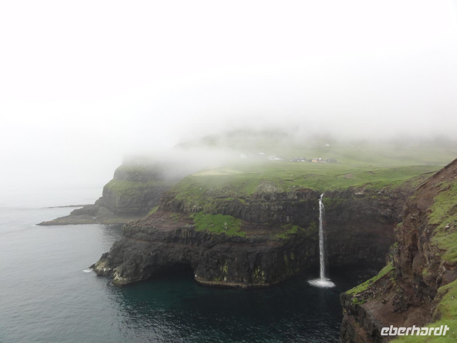 Nach dem Frühstück heißt es Wanderschuhe an und unser erstes Ziel ist Gjogv wo unsere Wanderung startet. Unterwegs sehen wir einige Schaefer die ihre Schafe zusammentreiben und machen einen Fotostopp oberhalb von Funningur. Von hier haben wir einen fabelhaften Ausblick auf das kleine Dorf unten in der Bucht und die 2 höchsten Berge der Inseln (883 m)