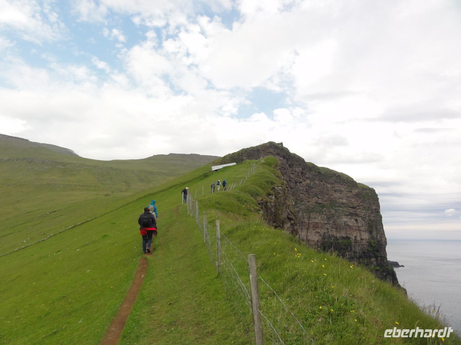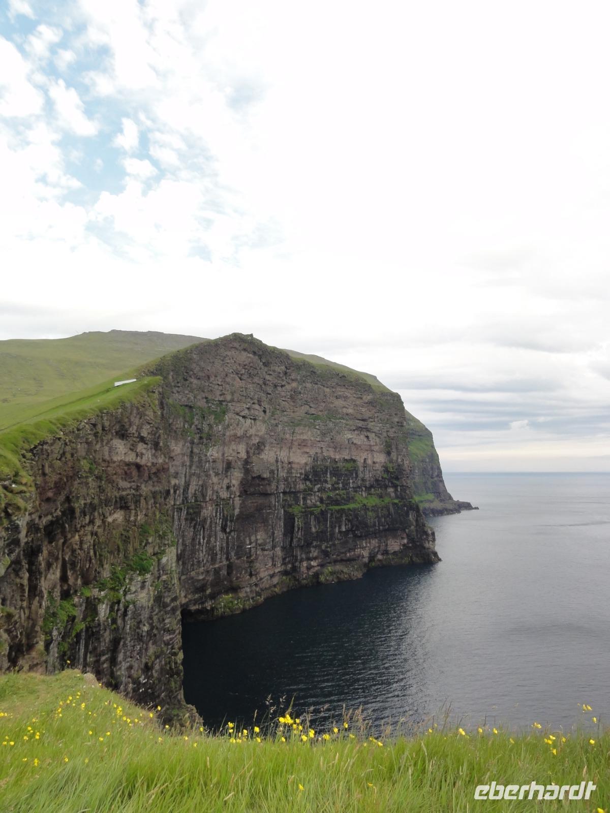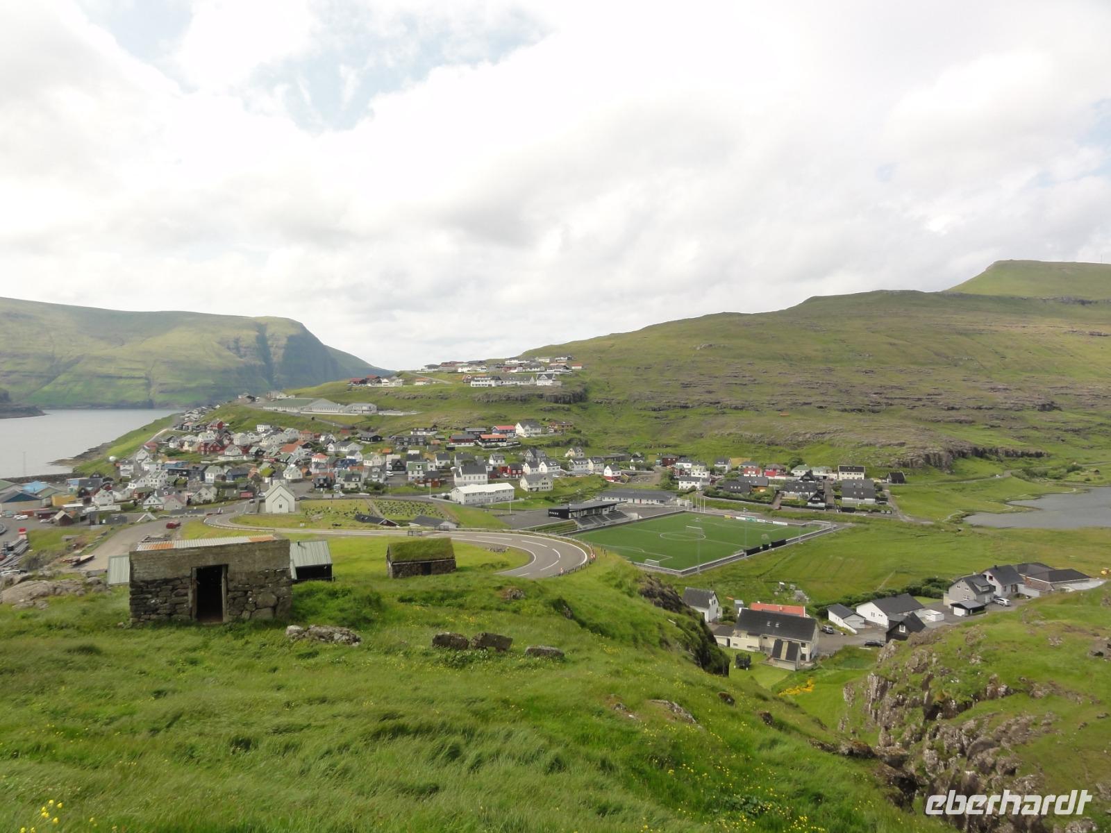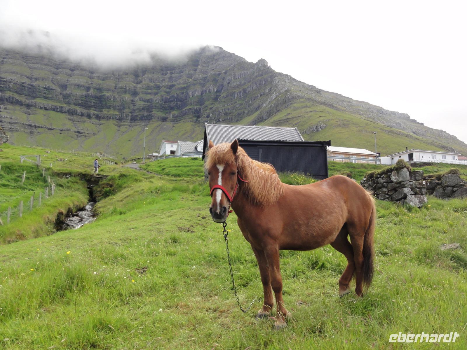 Nach dem Frühstück heißt es Wanderschuhe an und unser erstes Ziel ist Gjogv wo unsere Wanderung startet. Unterwegs sehen wir einige Schaefer die ihre Schafe zusammentreiben und machen einen Fotostopp oberhalb von Funningur. Von hier haben wir einen fabelhaften Ausblick auf das kleine Dorf unten in der Bucht und die 2 höchsten Berge der Inseln (883 m)