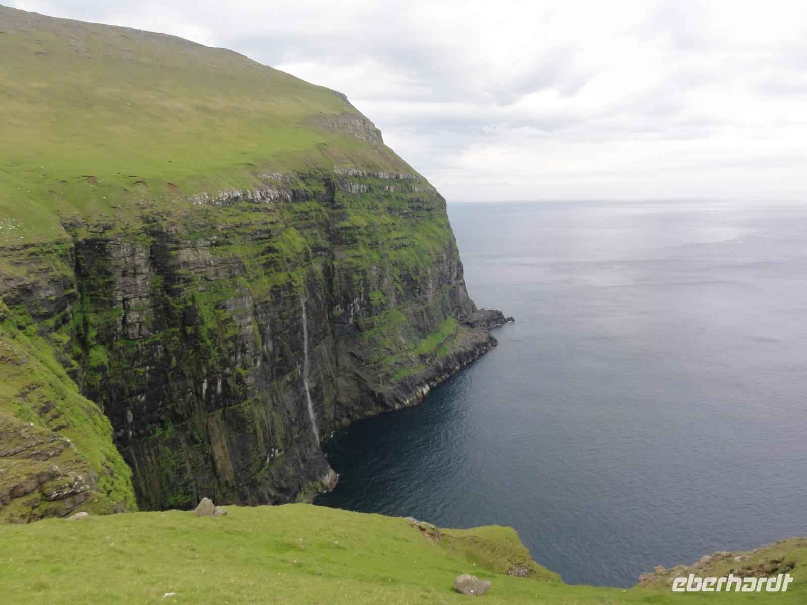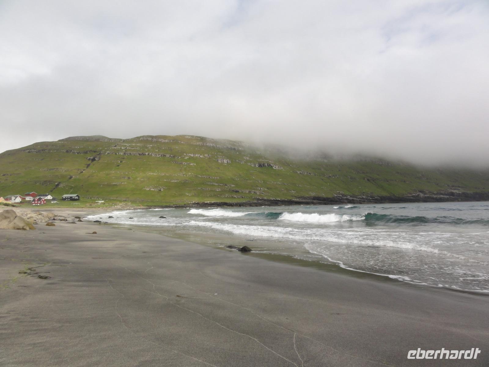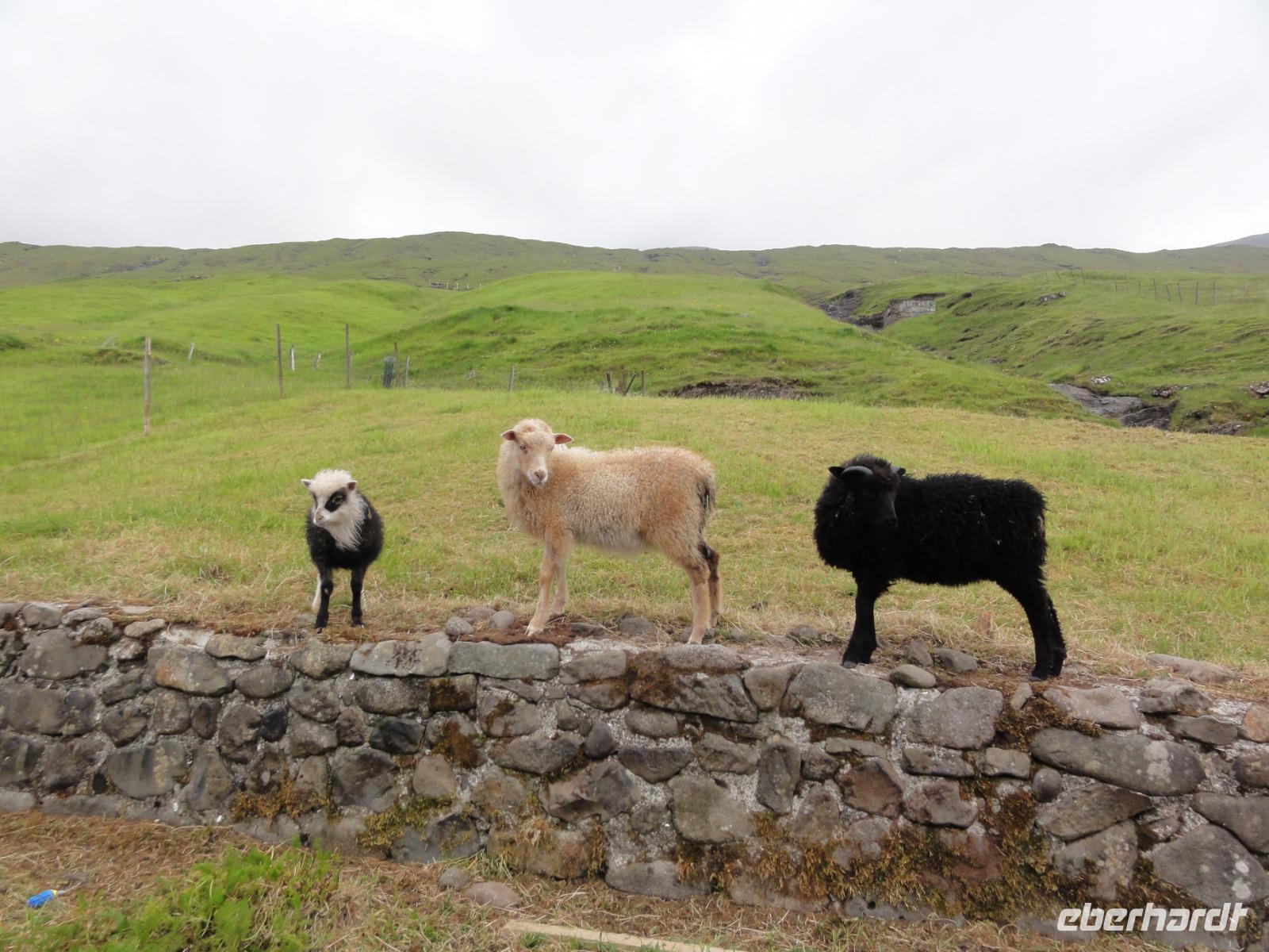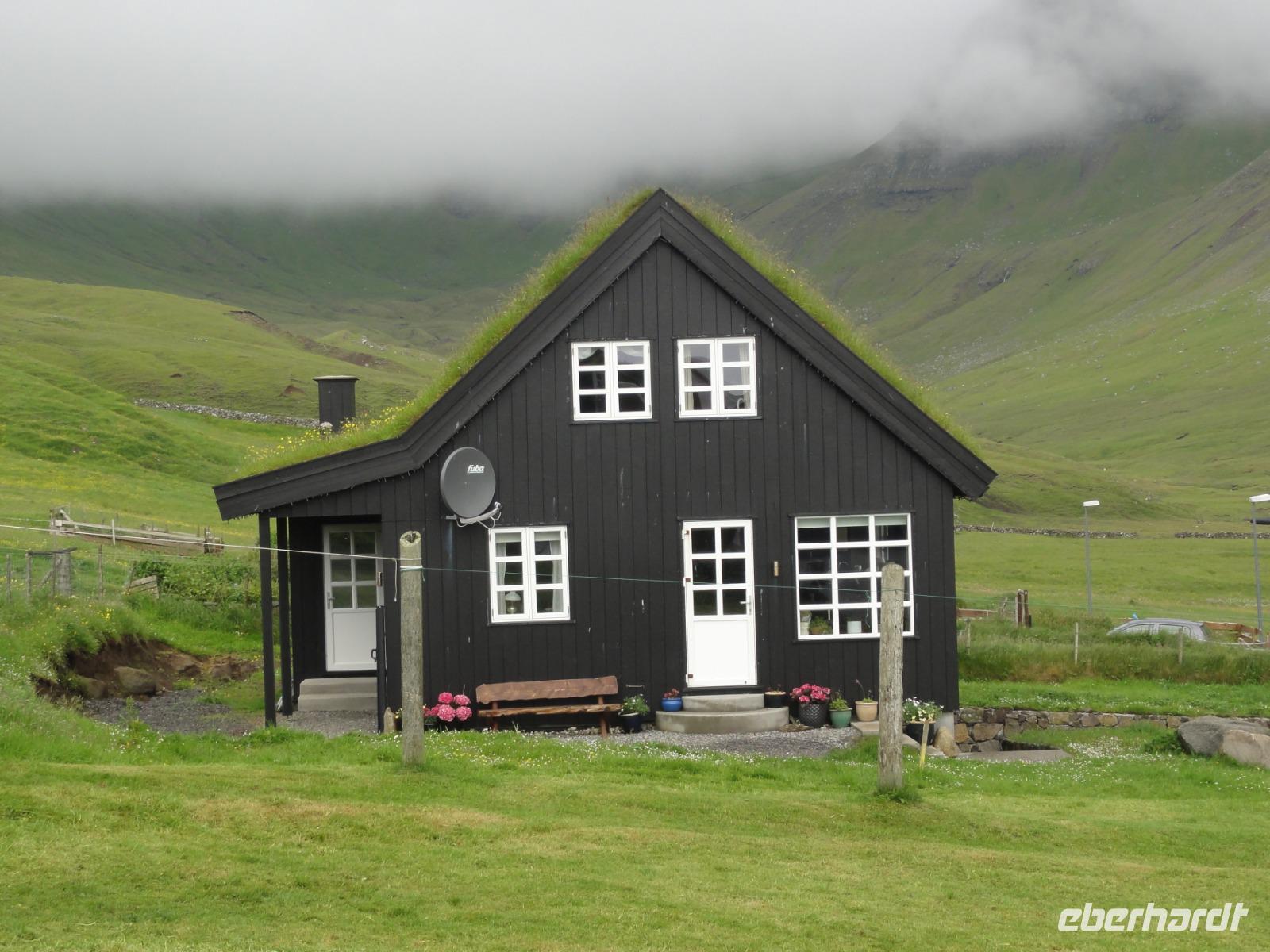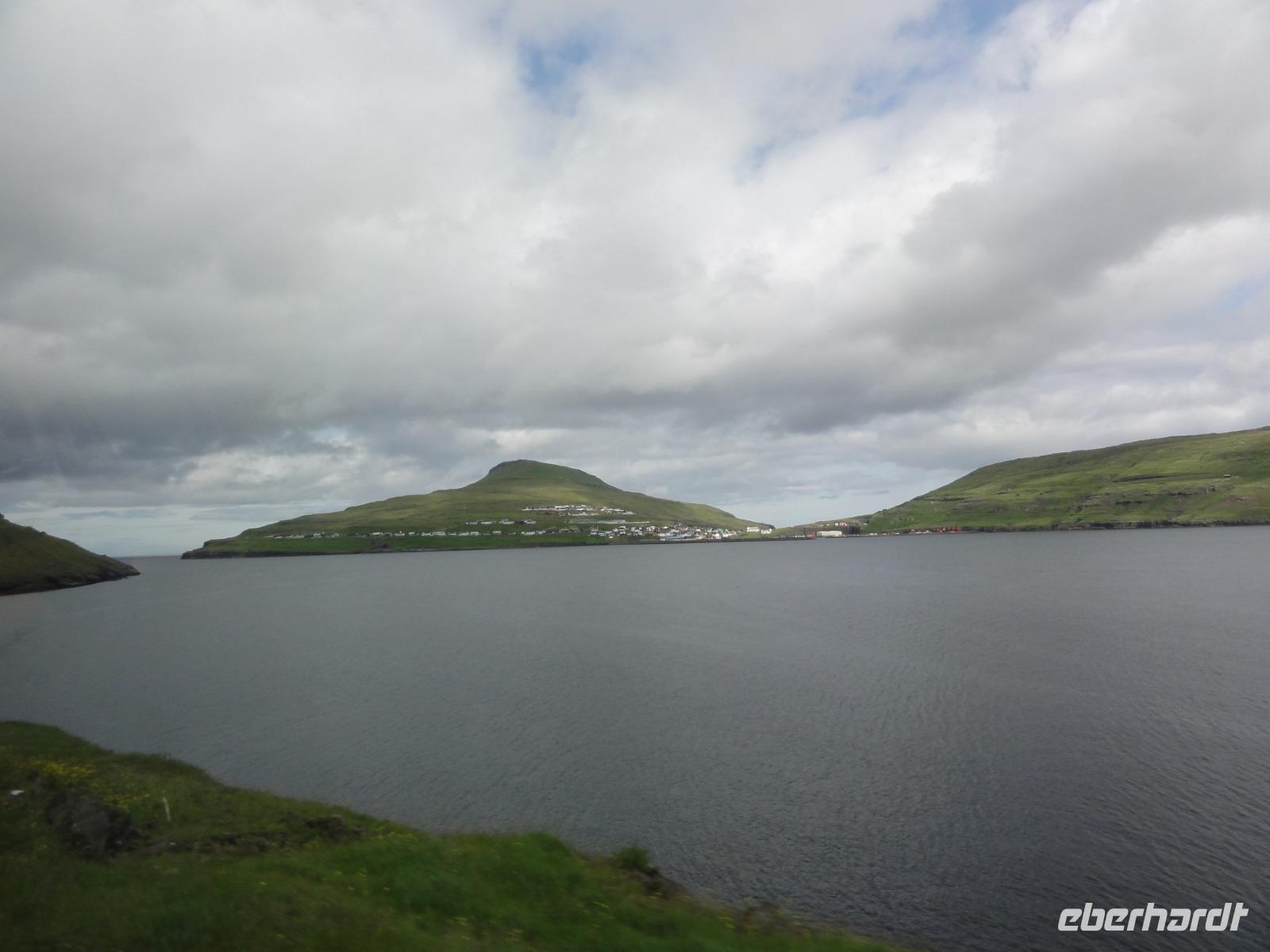 Nach dem Frühstück heißt es Wanderschuhe an und unser erstes Ziel ist Gjogv wo unsere Wanderung startet. Unterwegs sehen wir einige Schaefer die ihre Schafe zusammentreiben und machen einen Fotostopp oberhalb von Funningur. Von hier haben wir einen fabelhaften Ausblick auf das kleine Dorf unten in der Bucht und die 2 höchsten Berge der Inseln (883 m)