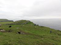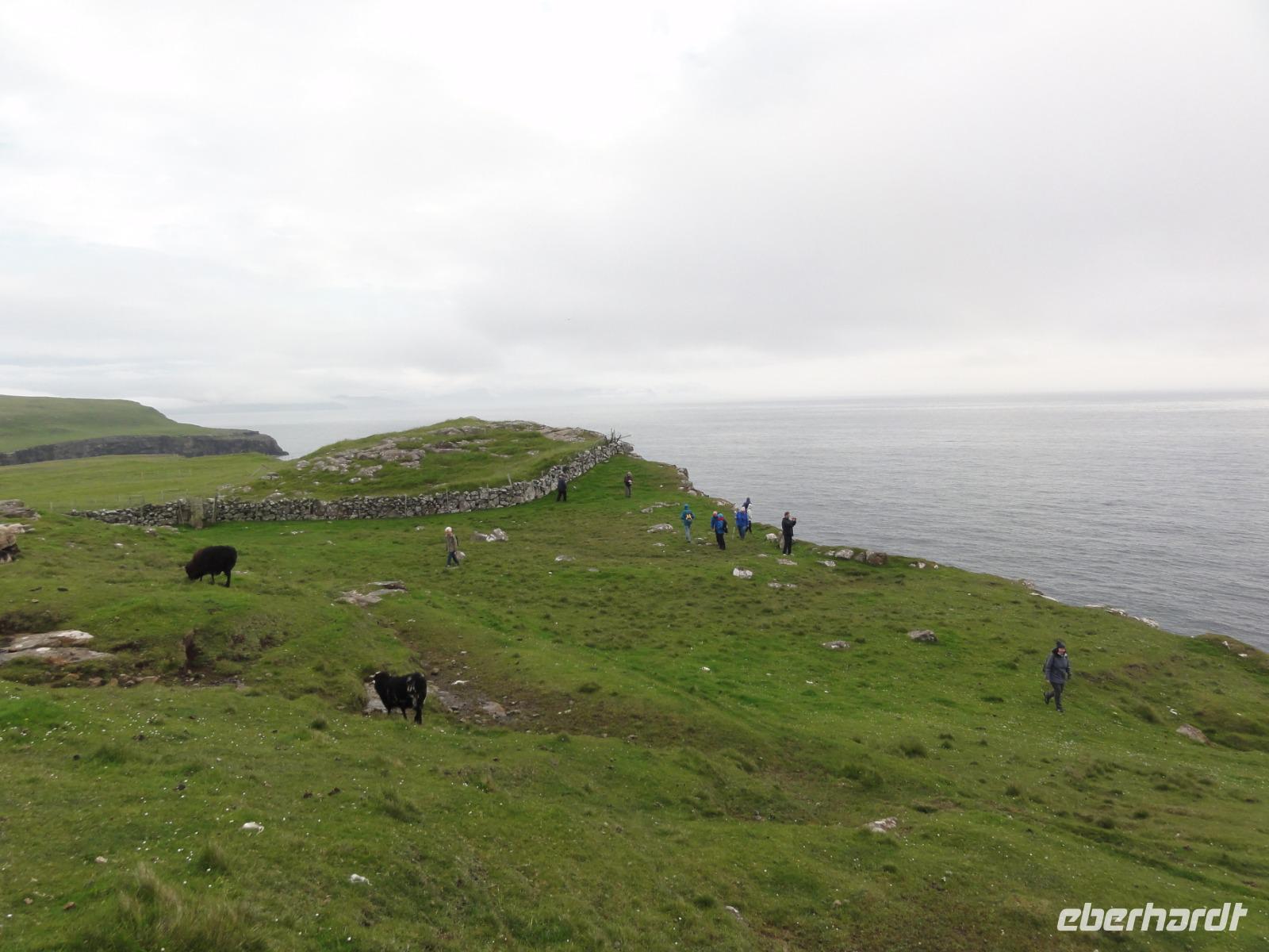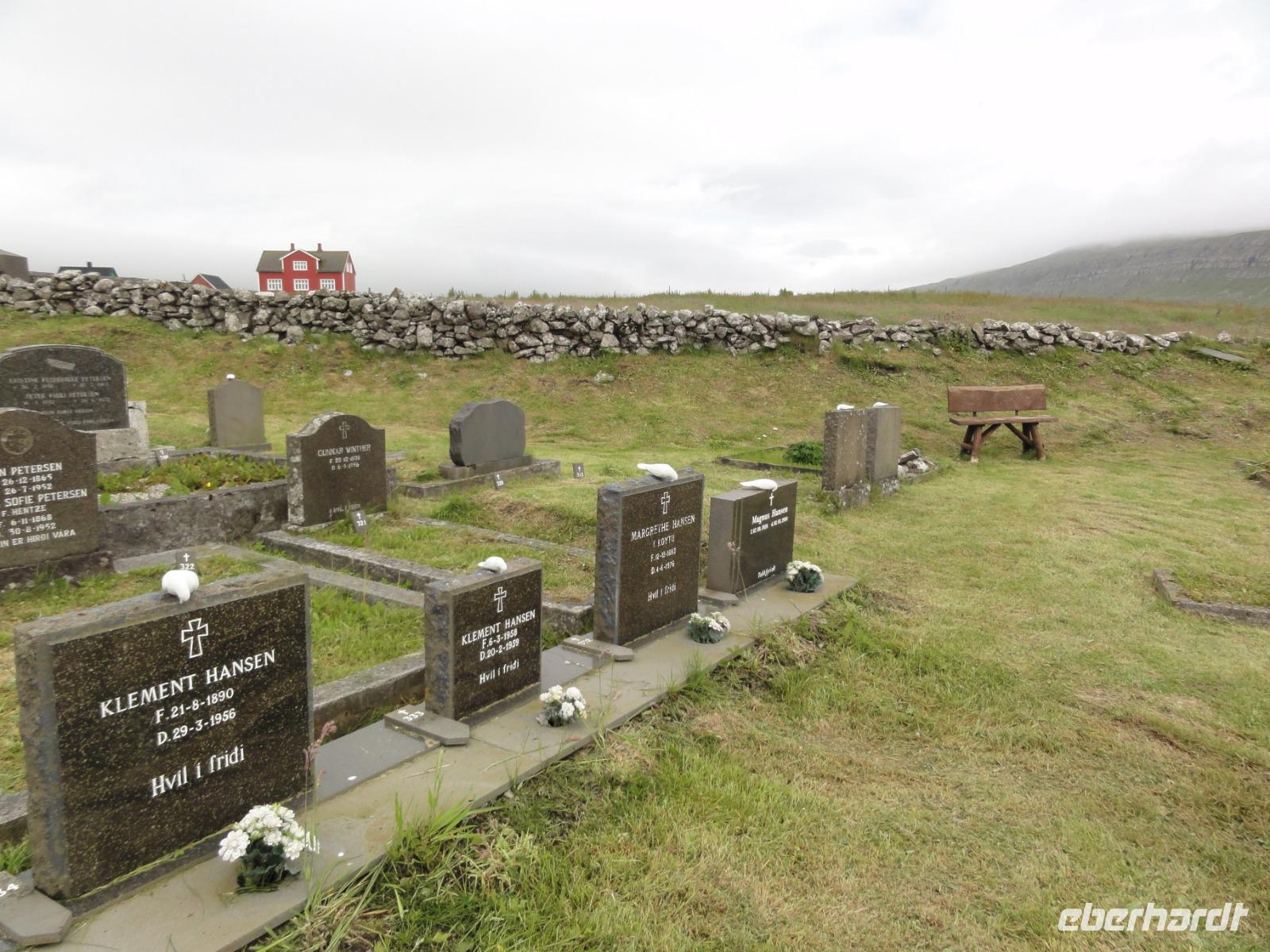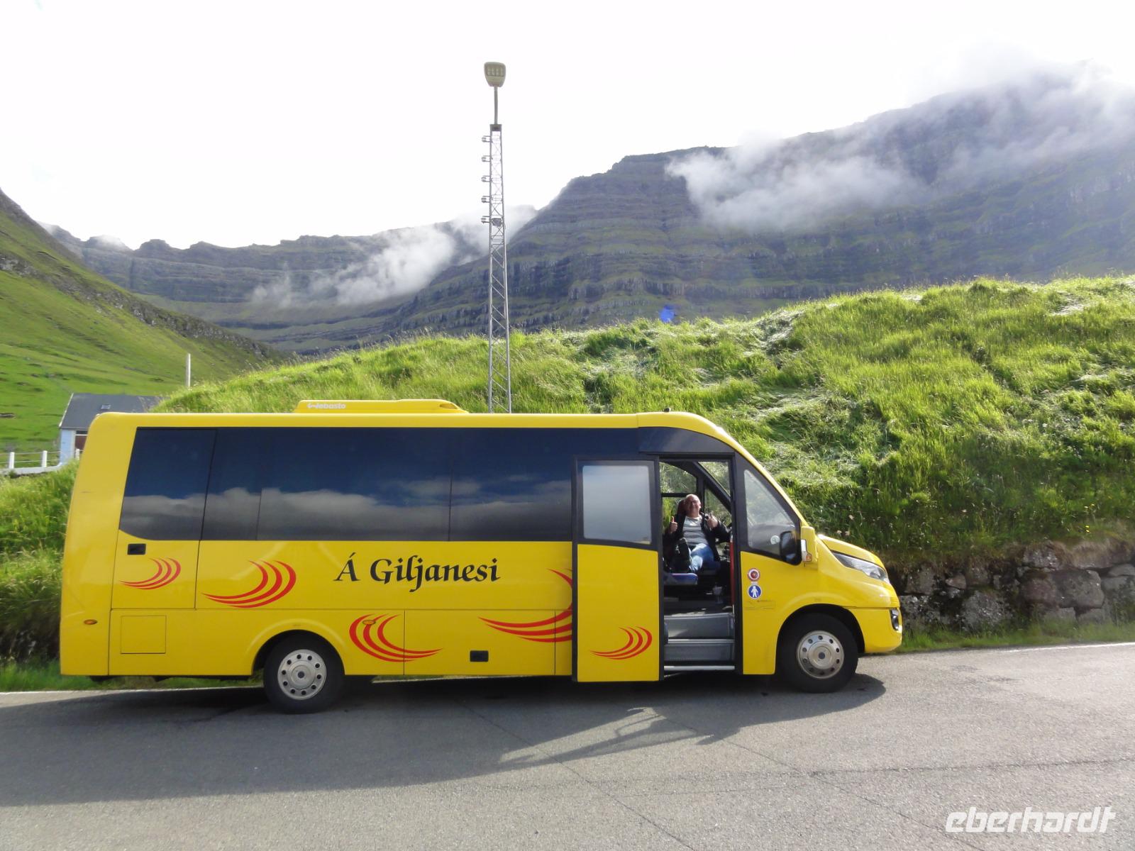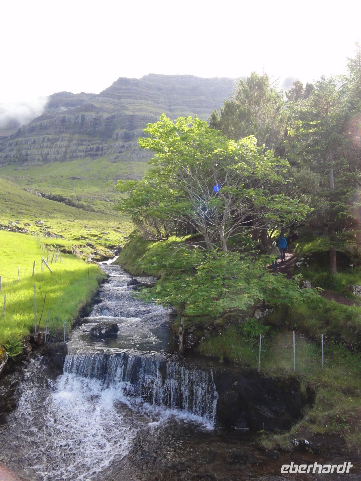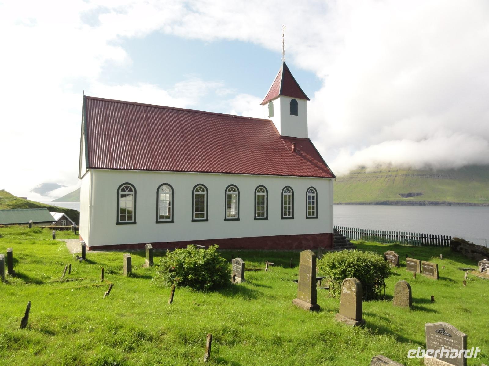 Nach dem Frühstück heißt es Wanderschuhe an und unser erstes Ziel ist Gjogv wo unsere Wanderung startet. Unterwegs sehen wir einige Schaefer die ihre Schafe zusammentreiben und machen einen Fotostopp oberhalb von Funningur. Von hier haben wir einen fabelhaften Ausblick auf das kleine Dorf unten in der Bucht und die 2 höchsten Berge der Inseln (883 m)