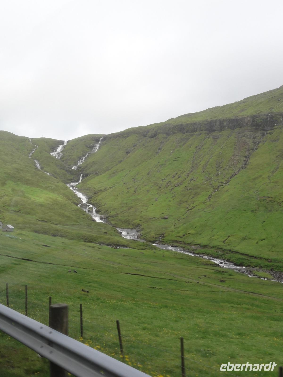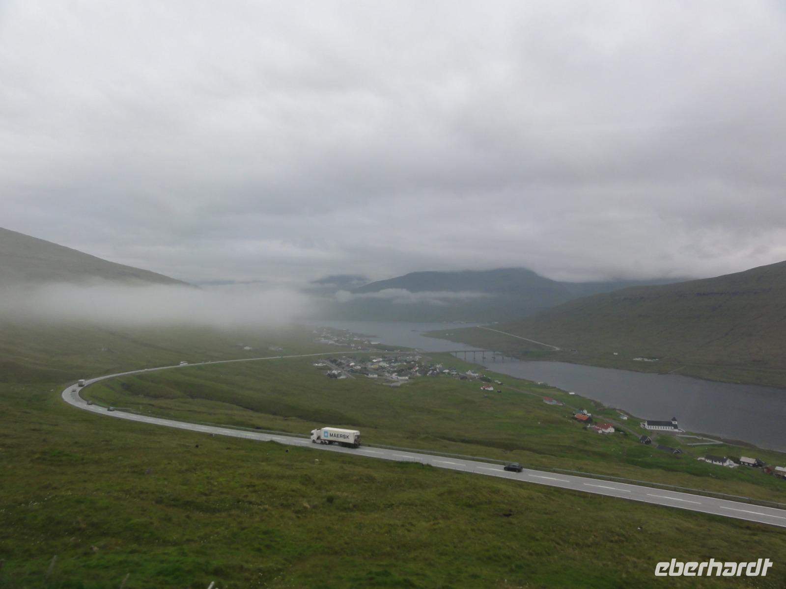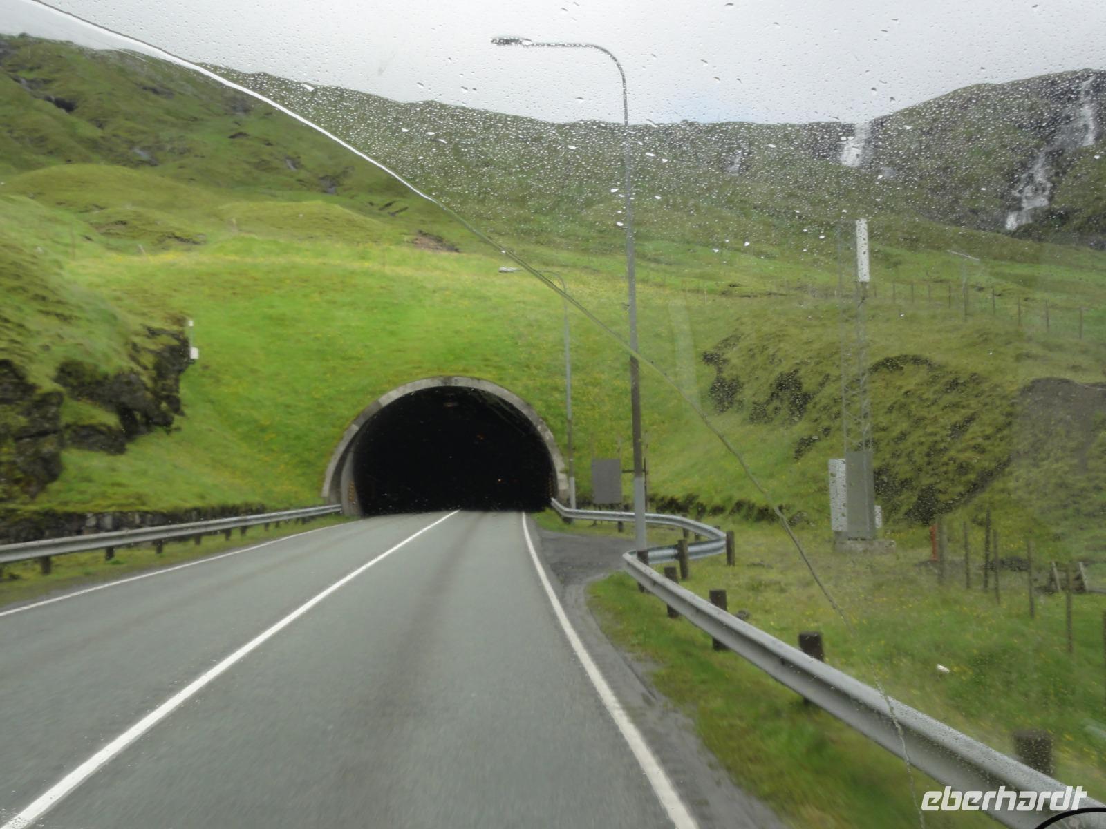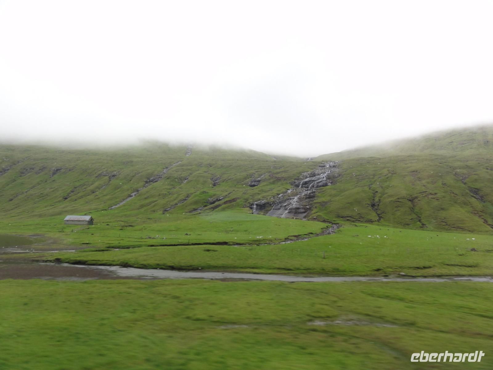 Heute heißt es nach dem Frühstück auschecken. Wir fahren in den Norden auf die Insel Vidoy- die Holzinsel. Wir durchqueren den Unterwassertunnel, welcher an seiner tiefsten Stelle 150 m unter dem Meeresspiegel liegt und mit bunten Lampen geschmückt ist. Der Tunnel verbindet die Inseln Eysturoy und Bordoy und wir passieren Klaksvik die zweitgrößte Stadt mit 5.000 Einwohnern. Weiter geht es durch 2 sehr schmale Tunnel, deshalb haben wir heute auch einen kleineren Bus zur Verfügung. Wir fahren zur nördlichsten Stadt Vidareidi und machen unterwegs einen Fotostopp in Hvannasund. Im Hafen von Vidareidi haben wir Sicht auf die Inseln Fugloy -die Vogelinsel und die Insel Svinoy- die Schweineinsel. Danach geht es wieder zurück nach Klaksvik und wir kehren im Café Amarant zum Mittag ein. Es gibt eine Färinger Spezialität, Fisch und Garnelen auf Brot. Sehr lecker... Nach dem Essen besichtigen wir die Christians Kirche und checken ins Hotel Klaksvik, was früher ein Seemannsheim war, ein. Das Highlight unseres Tages kommt jetzt, wir fahren wieder nach Gjogv und werden dort einen sehr lustigen Abend mit Musik und Tanz verbringen. Es gibt sämtliche Färinger Köstlichkeiten und es ist für jedermanns Geschmack etwas dabei. Unter anderem probieren wir getrocknetes Wal- und Lammfleisch. Ein Gaumenschmaus... Noch ein Schnaps zur Verdauung und wir lauschen der Färinger Band unseres Busfahrers und den musikalischen Klängen des Sohnes von Ann. Es regnet sehr stark, sodass sich aus den kleinen Bächen, reißende Flüsse bilden, die sich die saftig grünen Hänge hinunter stürzen. Wahnsinn, es ist unbeschreiblich...