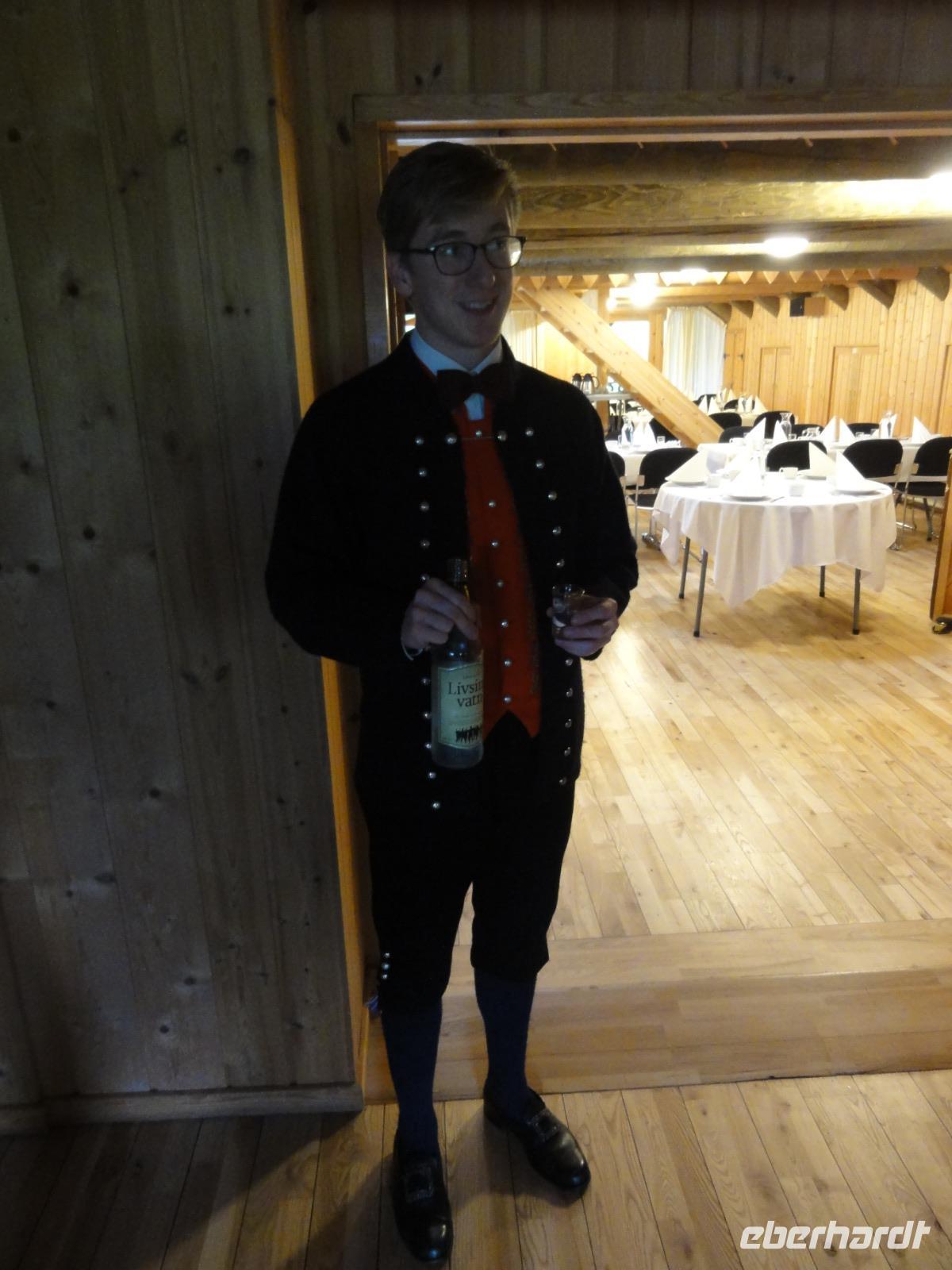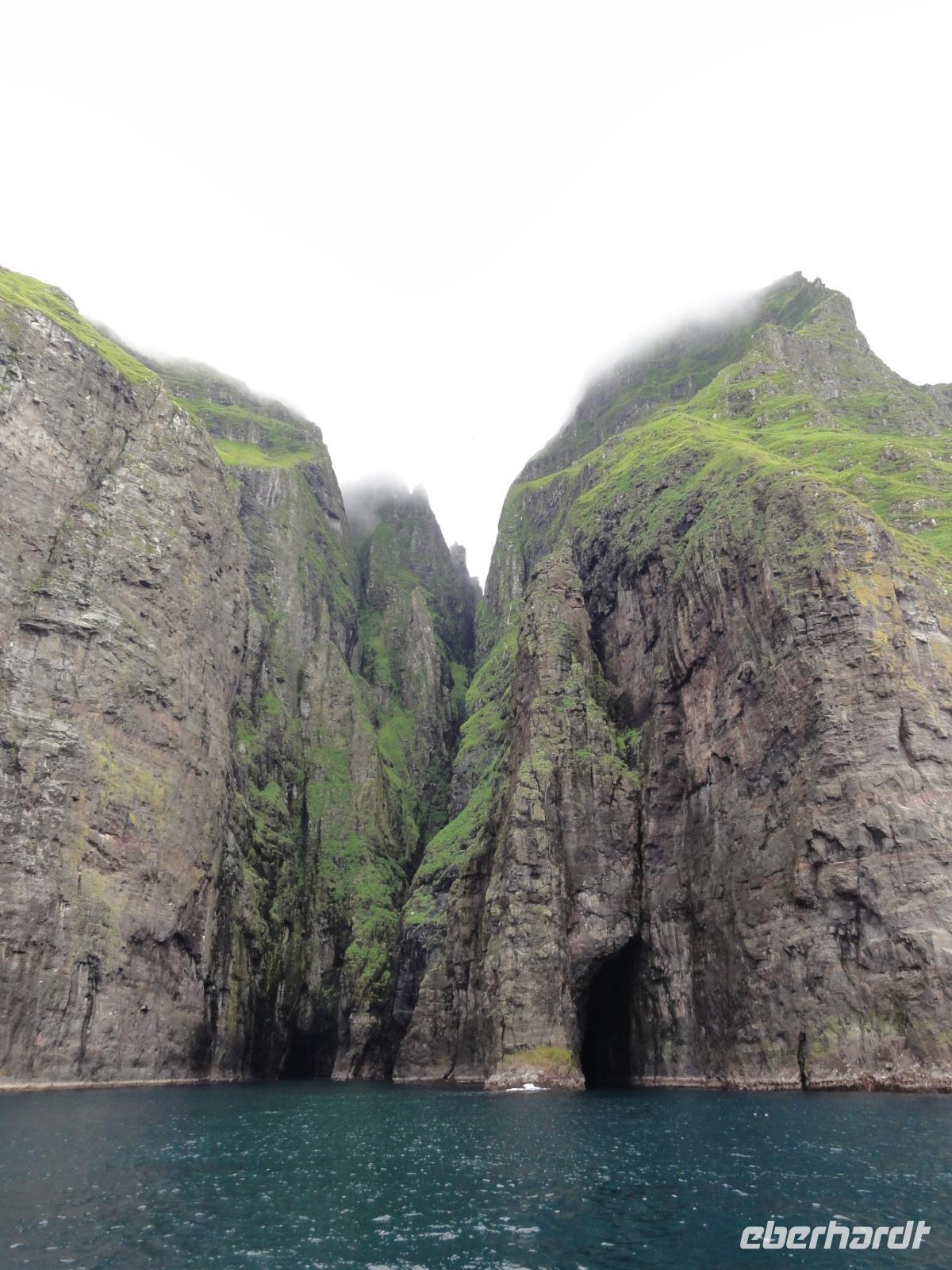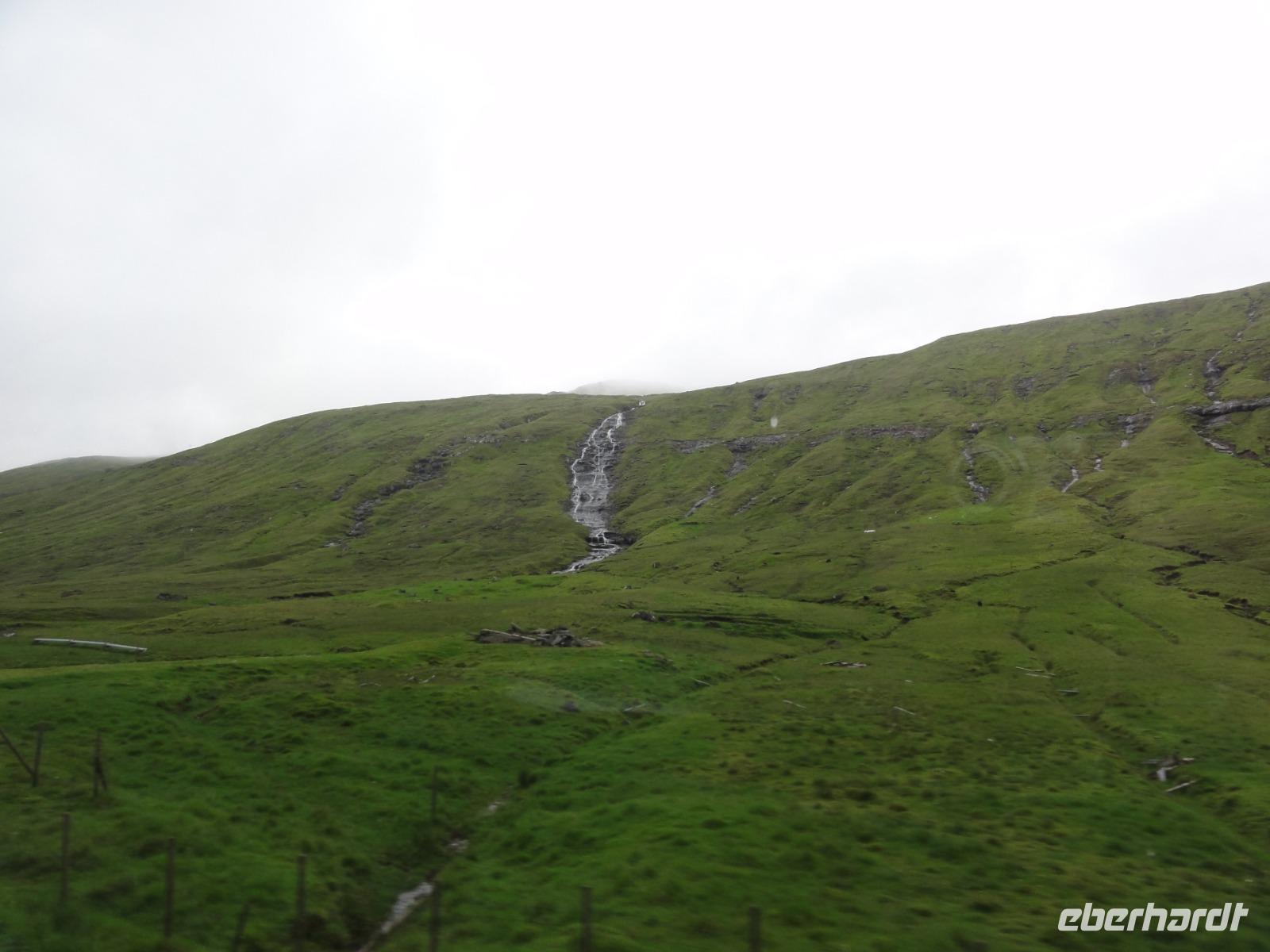 Heute heißt es nach dem Frühstück auschecken. Wir fahren in den Norden auf die Insel Vidoy- die Holzinsel. Wir durchqueren den Unterwassertunnel, welcher an seiner tiefsten Stelle 150 m unter dem Meeresspiegel liegt und mit bunten Lampen geschmückt ist. Der Tunnel verbindet die Inseln Eysturoy und Bordoy und wir passieren Klaksvik die zweitgrößte Stadt mit 5.000 Einwohnern. Weiter geht es durch 2 sehr schmale Tunnel, deshalb haben wir heute auch einen kleineren Bus zur Verfügung. Wir fahren zur nördlichsten Stadt Vidareidi und machen unterwegs einen Fotostopp in Hvannasund. Im Hafen von Vidareidi haben wir Sicht auf die Inseln Fugloy -die Vogelinsel und die Insel Svinoy- die Schweineinsel. Danach geht es wieder zurück nach Klaksvik und wir kehren im Café Amarant zum Mittag ein. Es gibt eine Färinger Spezialität, Fisch und Garnelen auf Brot. Sehr lecker... Nach dem Essen besichtigen wir die Christians Kirche und checken ins Hotel Klaksvik, was früher ein Seemannsheim war, ein. Das Highlight unseres Tages kommt jetzt, wir fahren wieder nach Gjogv und werden dort einen sehr lustigen Abend mit Musik und Tanz verbringen. Es gibt sämtliche Färinger Köstlichkeiten und es ist für jedermanns Geschmack etwas dabei. Unter anderem probieren wir getrocknetes Wal- und Lammfleisch. Ein Gaumenschmaus... Noch ein Schnaps zur Verdauung und wir lauschen der Färinger Band unseres Busfahrers und den musikalischen Klängen des Sohnes von Ann. Es regnet sehr stark, sodass sich aus den kleinen Bächen, reißende Flüsse bilden, die sich die saftig grünen Hänge hinunter stürzen. Wahnsinn, es ist unbeschreiblich...