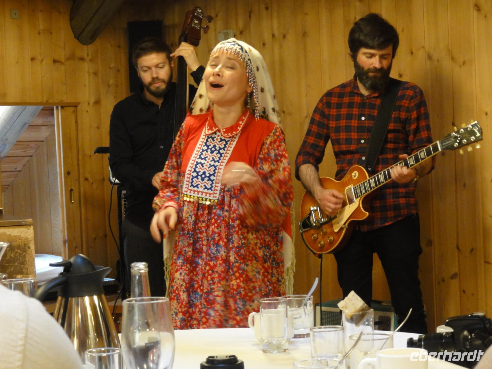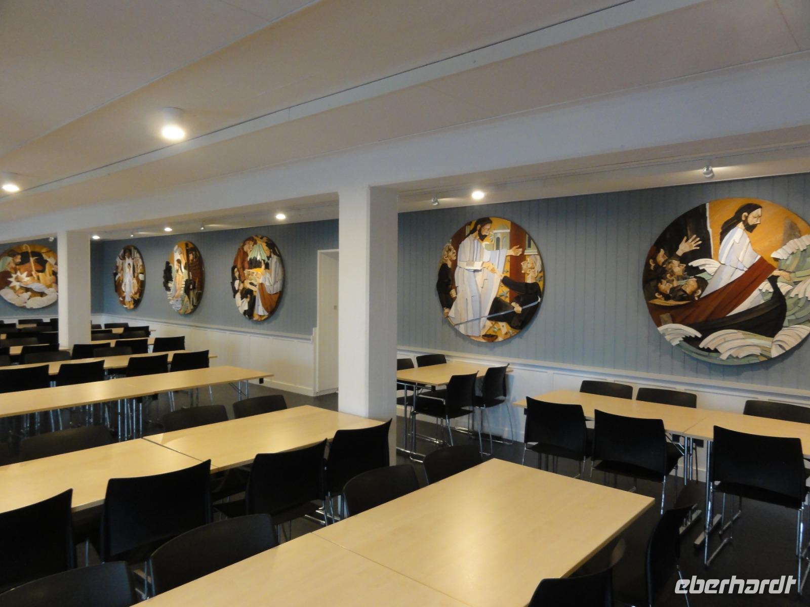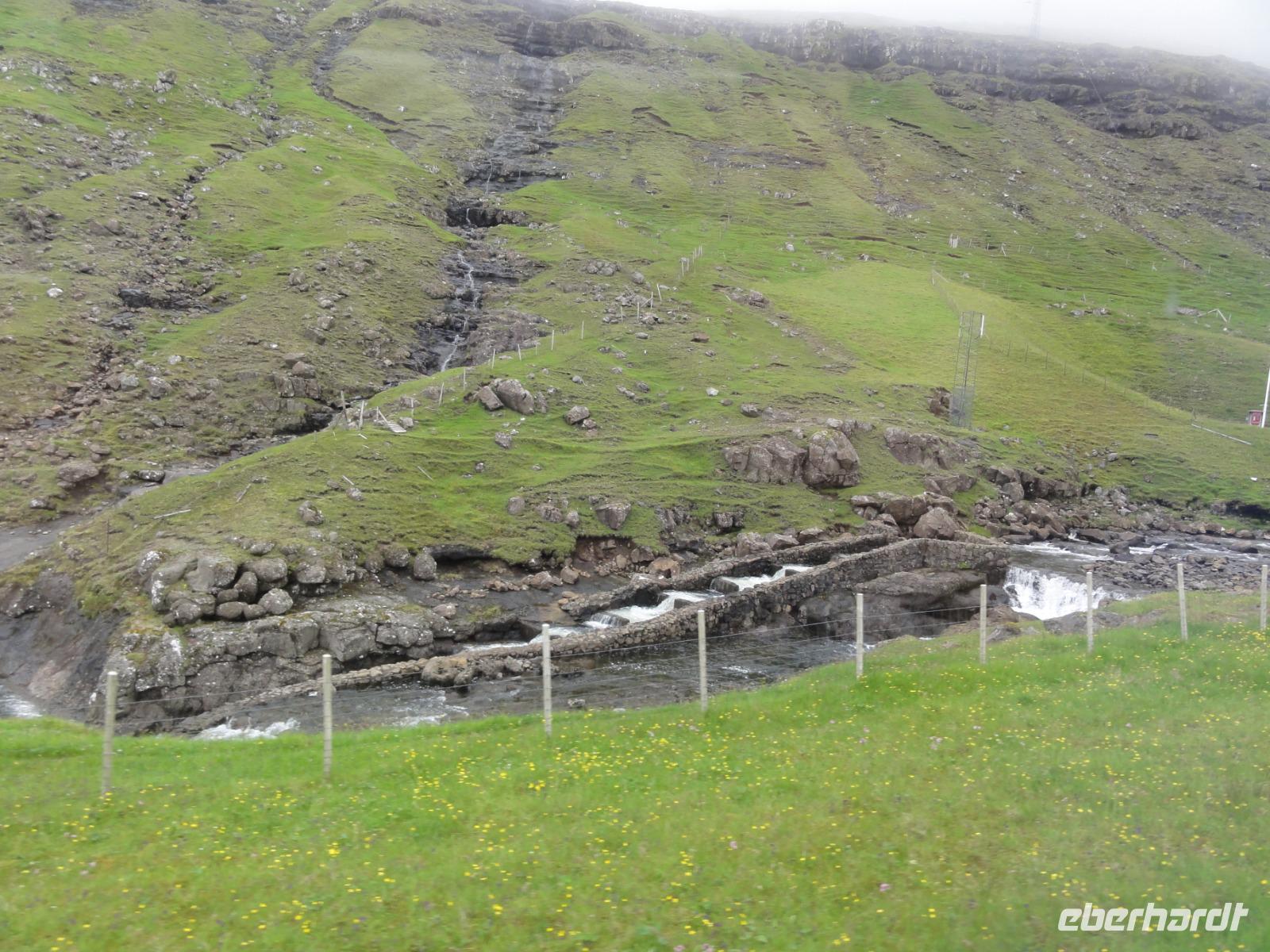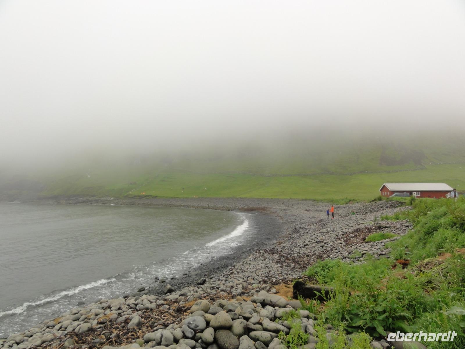 Heute heißt es nach dem Frühstück auschecken. Wir fahren in den Norden auf die Insel Vidoy- die Holzinsel. Wir durchqueren den Unterwassertunnel, welcher an seiner tiefsten Stelle 150 m unter dem Meeresspiegel liegt und mit bunten Lampen geschmückt ist. Der Tunnel verbindet die Inseln Eysturoy und Bordoy und wir passieren Klaksvik die zweitgrößte Stadt mit 5.000 Einwohnern. Weiter geht es durch 2 sehr schmale Tunnel, deshalb haben wir heute auch einen kleineren Bus zur Verfügung. Wir fahren zur nördlichsten Stadt Vidareidi und machen unterwegs einen Fotostopp in Hvannasund. Im Hafen von Vidareidi haben wir Sicht auf die Inseln Fugloy -die Vogelinsel und die Insel Svinoy- die Schweineinsel. Danach geht es wieder zurück nach Klaksvik und wir kehren im Café Amarant zum Mittag ein. Es gibt eine Färinger Spezialität, Fisch und Garnelen auf Brot. Sehr lecker... Nach dem Essen besichtigen wir die Christians Kirche und checken ins Hotel Klaksvik, was früher ein Seemannsheim war, ein. Das Highlight unseres Tages kommt jetzt, wir fahren wieder nach Gjogv und werden dort einen sehr lustigen Abend mit Musik und Tanz verbringen. Es gibt sämtliche Färinger Köstlichkeiten und es ist für jedermanns Geschmack etwas dabei. Unter anderem probieren wir getrocknetes Wal- und Lammfleisch. Ein Gaumenschmaus... Noch ein Schnaps zur Verdauung und wir lauschen der Färinger Band unseres Busfahrers und den musikalischen Klängen des Sohnes von Ann. Es regnet sehr stark, sodass sich aus den kleinen Bächen, reißende Flüsse bilden, die sich die saftig grünen Hänge hinunter stürzen. Wahnsinn, es ist unbeschreiblich...