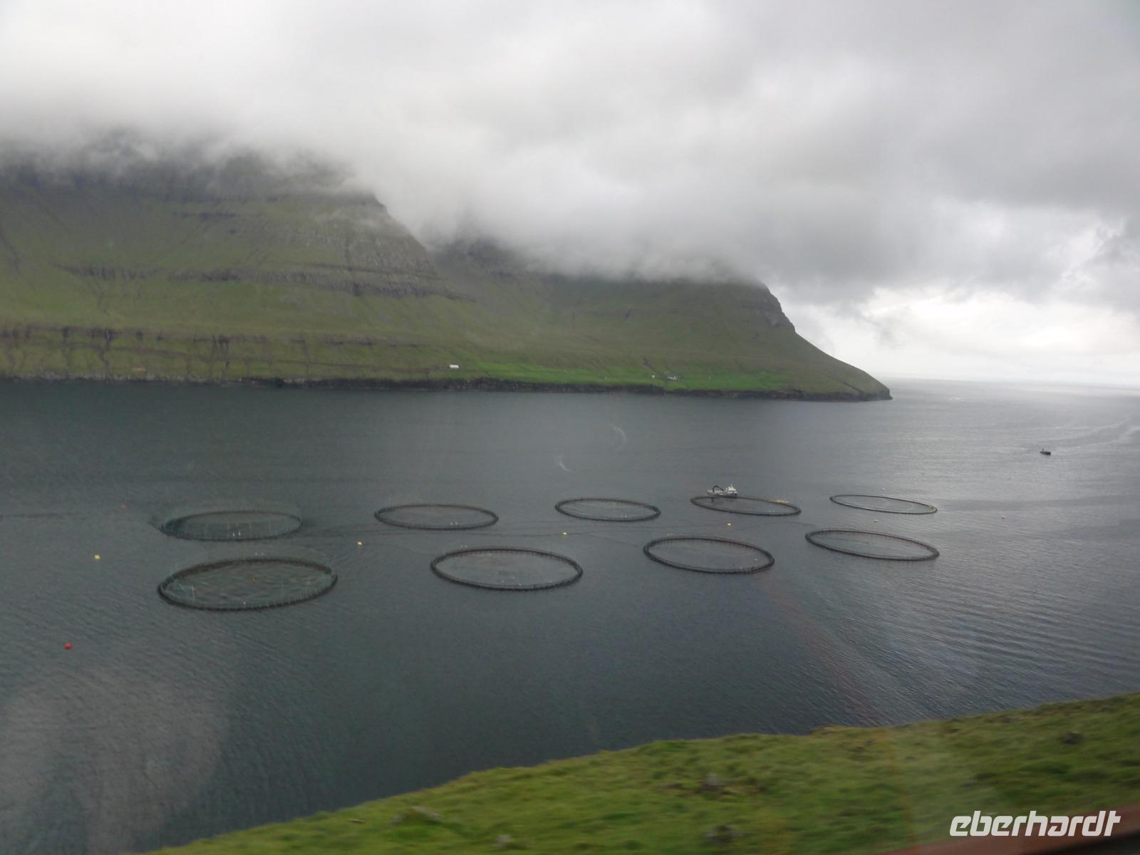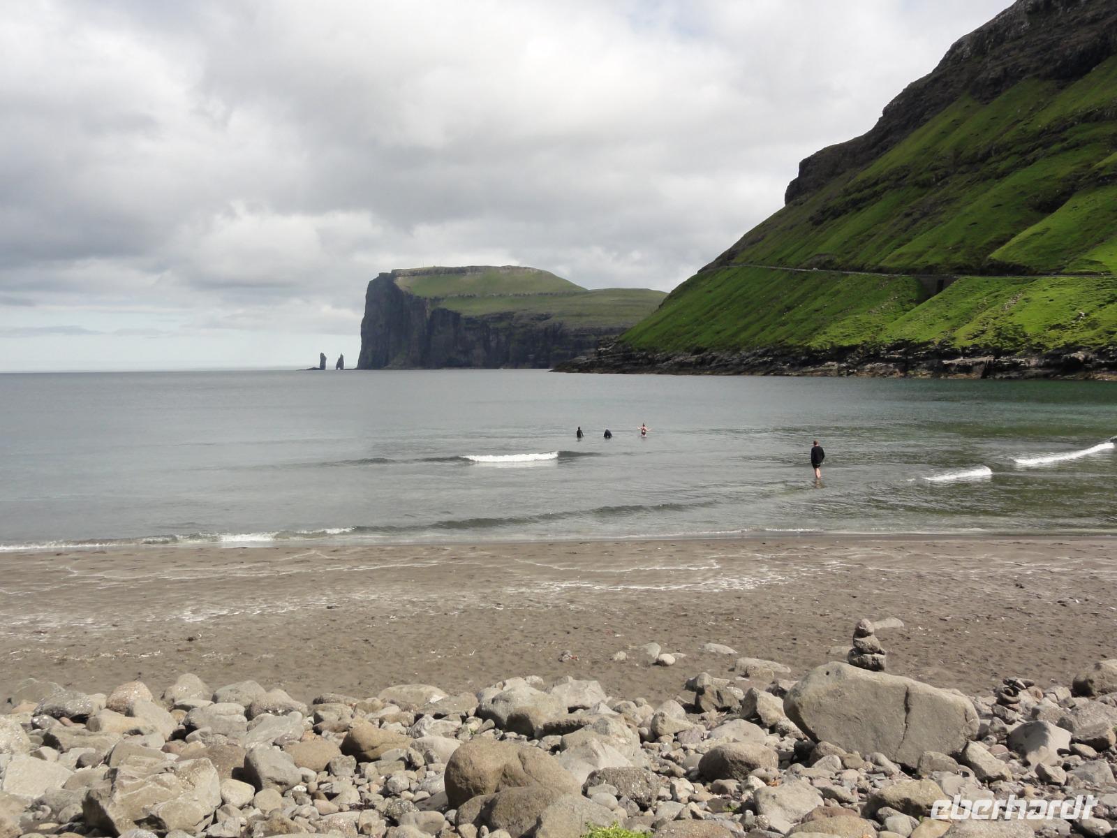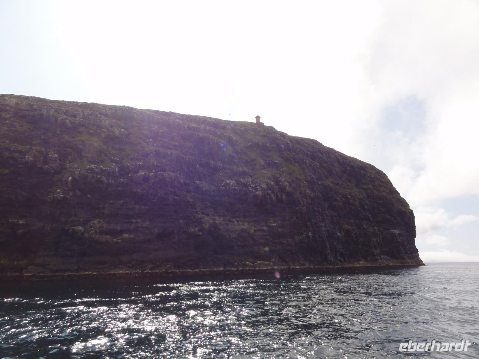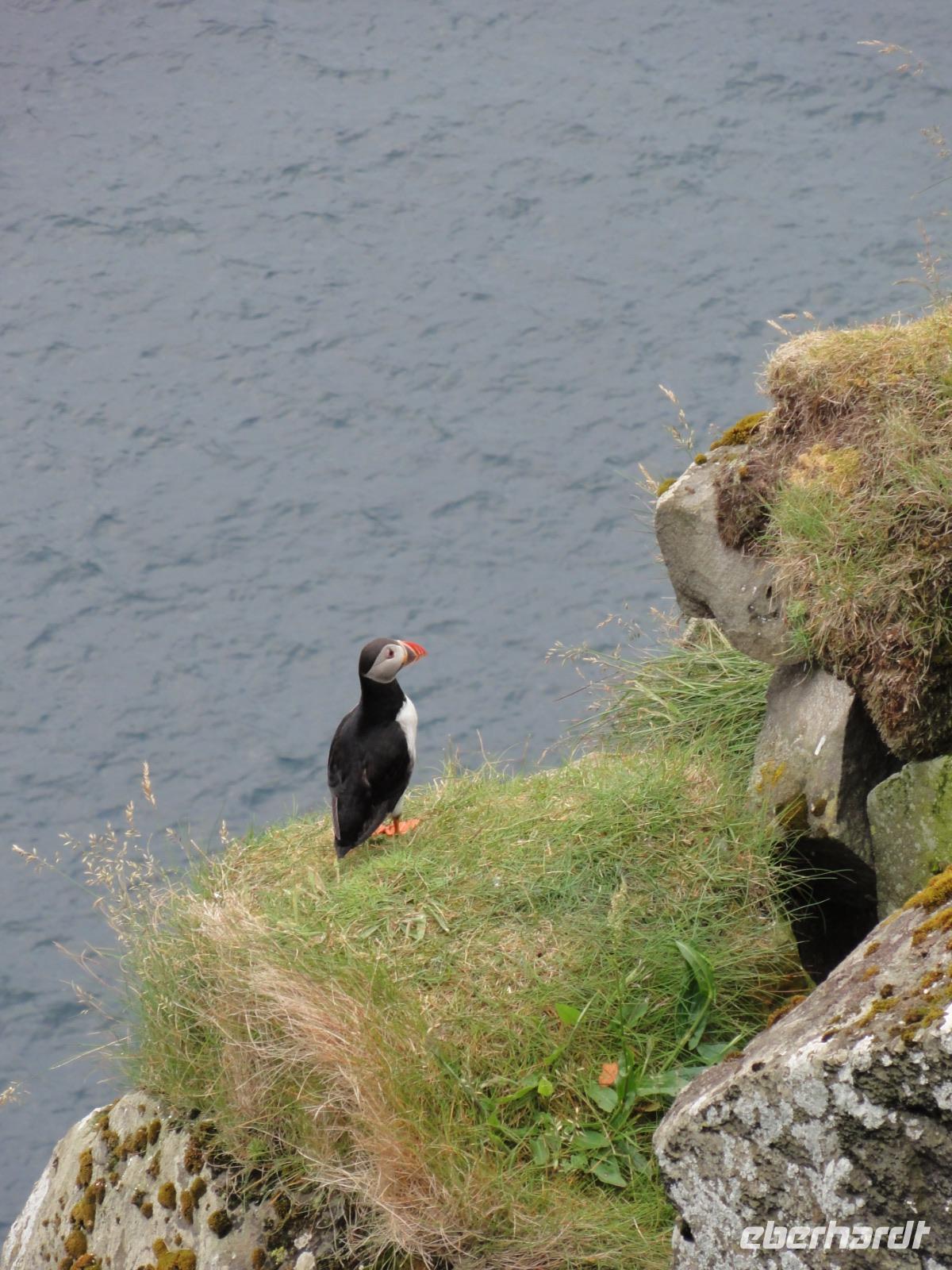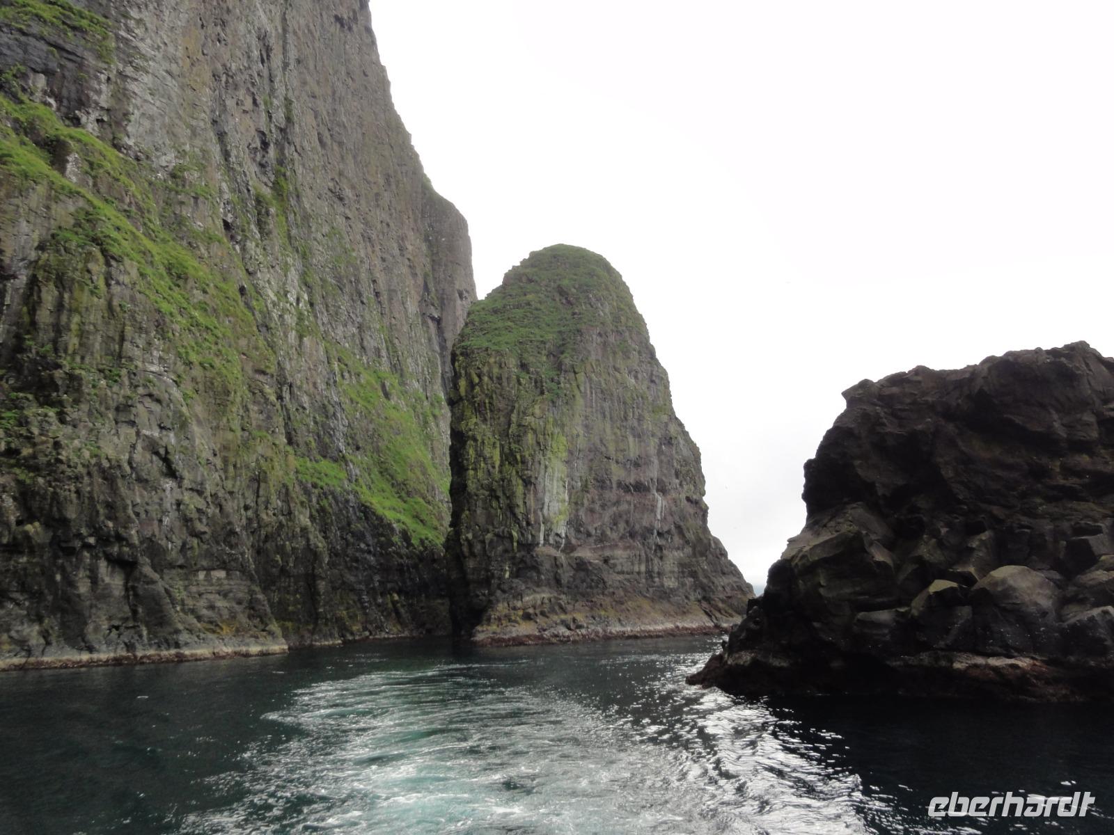 Ich hoffe ihr konntet trotz der Musik des Festivals gut schlafen und die Ohropax erfüllten ihren Zweck. Grins ...Nach dem Frühstück ist noch ein wenig Zeit um einen kleinen Stadtspaziergang durch die Stadt zu unternehmen oder zum Leuchtturm hinauf zu wandern. Danach heißt es auschecken und wir werden von Ann und Laurence am Hotel abgeholt. Unser erstes Ziel heißt Tjornuvik, eine traumhafte Bucht im Norden der Insel Streymoy. Die Sonne scheint und wir beobachten 3 mutige Mädchen beim Baden, bei durchschnittlich 7 Grad Wassertemperatur, Respekt ... Auf dem Rückweg an der Küste entlang machen wir einen Fotostopp am höchsten Wasserfall der Färöer, der Fossa Wasserfall( 140 m) und fahren an der einzigen runden Kirche auf den Färöer vorbei. Eine von 61 Kirchen, davon 60 evangelisch und 1 katholisch. Auch die größte Aquakultur der Welt für die Lachszucht befindet sich hier auf der Insel. Wir sehen in den runden Becken die großen Lachse hoch springen. In den Lachsbecken um von dem Meer den Fluss hinauf in den See zu schwimmen oder zu springen haben wir leider kein Glück. Unser nächstes Ziel heißt Vestmanna, dort besuchen wir zunächst der Saga Museum und können die komplette Woche noch einmal Revue passieren lassen. Wir lauschen der Geschichte der Färöer und bestaunen die Wachsfiguren. Nun kommen wir zum Highlight des heutigen Tages und zum krönenden Abschluss einer tollen Reise. Wir fahren mit dem Boot die Küste entlang der aus dem Wasser empor ragenden Felsen. An den Vogelklippen beobachten wir Küstenseeschwalben, Austernfischer, Eissturmvögel und Papageientaucher. Sogar ein Elefant ragt 90 Meter in die Höhe. Es ist beeindruckend, ich habe immer noch Gänsehaut, es fehlen nur noch die Dinosaurier und Jurassic Park wäre perfekt. Was für eine Flora und Fauna, der Höhepunkt der Rundreise, definitiv. Wieder im Hafen von Vestmanna angekommen fahren wir zu unserem Hotel für die letzte Nacht, das Hotel Foroyar oberhalb von Torshavn.