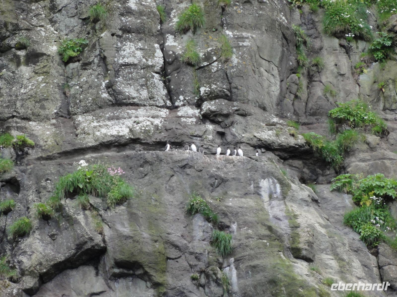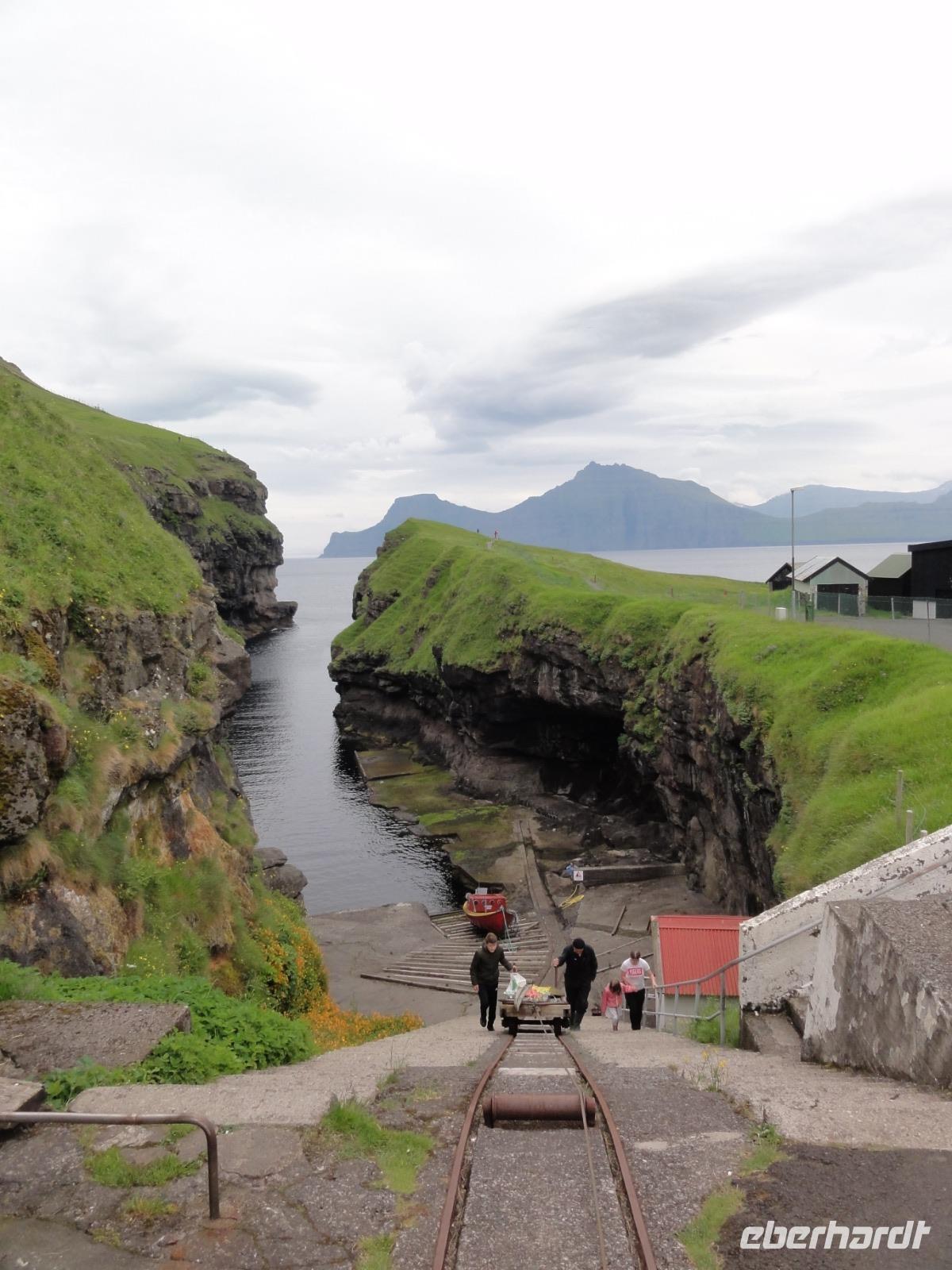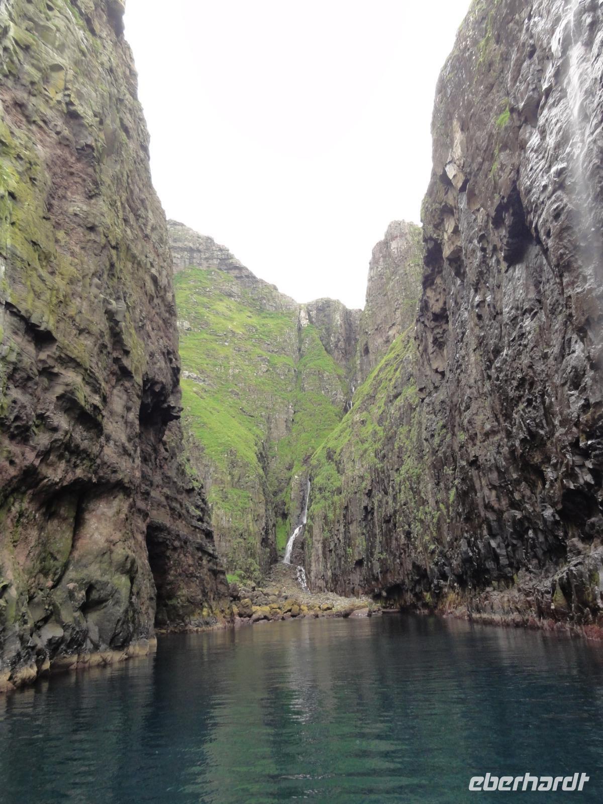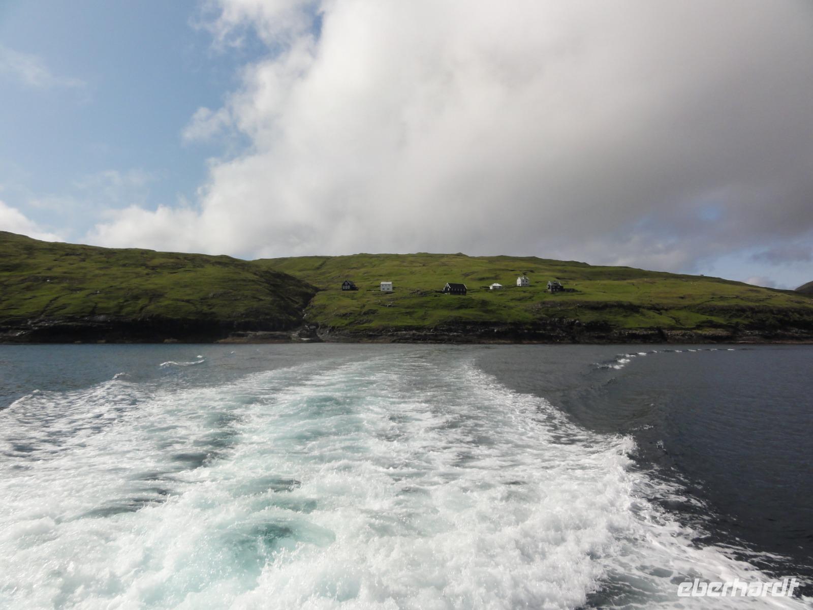 Ich hoffe ihr konntet trotz der Musik des Festivals gut schlafen und die Ohropax erfüllten ihren Zweck. Grins ...Nach dem Frühstück ist noch ein wenig Zeit um einen kleinen Stadtspaziergang durch die Stadt zu unternehmen oder zum Leuchtturm hinauf zu wandern. Danach heißt es auschecken und wir werden von Ann und Laurence am Hotel abgeholt. Unser erstes Ziel heißt Tjornuvik, eine traumhafte Bucht im Norden der Insel Streymoy. Die Sonne scheint und wir beobachten 3 mutige Mädchen beim Baden, bei durchschnittlich 7 Grad Wassertemperatur, Respekt ... Auf dem Rückweg an der Küste entlang machen wir einen Fotostopp am höchsten Wasserfall der Färöer, der Fossa Wasserfall( 140 m) und fahren an der einzigen runden Kirche auf den Färöer vorbei. Eine von 61 Kirchen, davon 60 evangelisch und 1 katholisch. Auch die größte Aquakultur der Welt für die Lachszucht befindet sich hier auf der Insel. Wir sehen in den runden Becken die großen Lachse hoch springen. In den Lachsbecken um von dem Meer den Fluss hinauf in den See zu schwimmen oder zu springen haben wir leider kein Glück. Unser nächstes Ziel heißt Vestmanna, dort besuchen wir zunächst der Saga Museum und können die komplette Woche noch einmal Revue passieren lassen. Wir lauschen der Geschichte der Färöer und bestaunen die Wachsfiguren. Nun kommen wir zum Highlight des heutigen Tages und zum krönenden Abschluss einer tollen Reise. Wir fahren mit dem Boot die Küste entlang der aus dem Wasser empor ragenden Felsen. An den Vogelklippen beobachten wir Küstenseeschwalben, Austernfischer, Eissturmvögel und Papageientaucher. Sogar ein Elefant ragt 90 Meter in die Höhe. Es ist beeindruckend, ich habe immer noch Gänsehaut, es fehlen nur noch die Dinosaurier und Jurassic Park wäre perfekt. Was für eine Flora und Fauna, der Höhepunkt der Rundreise, definitiv. Wieder im Hafen von Vestmanna angekommen fahren wir zu unserem Hotel für die letzte Nacht, das Hotel Foroyar oberhalb von Torshavn.
