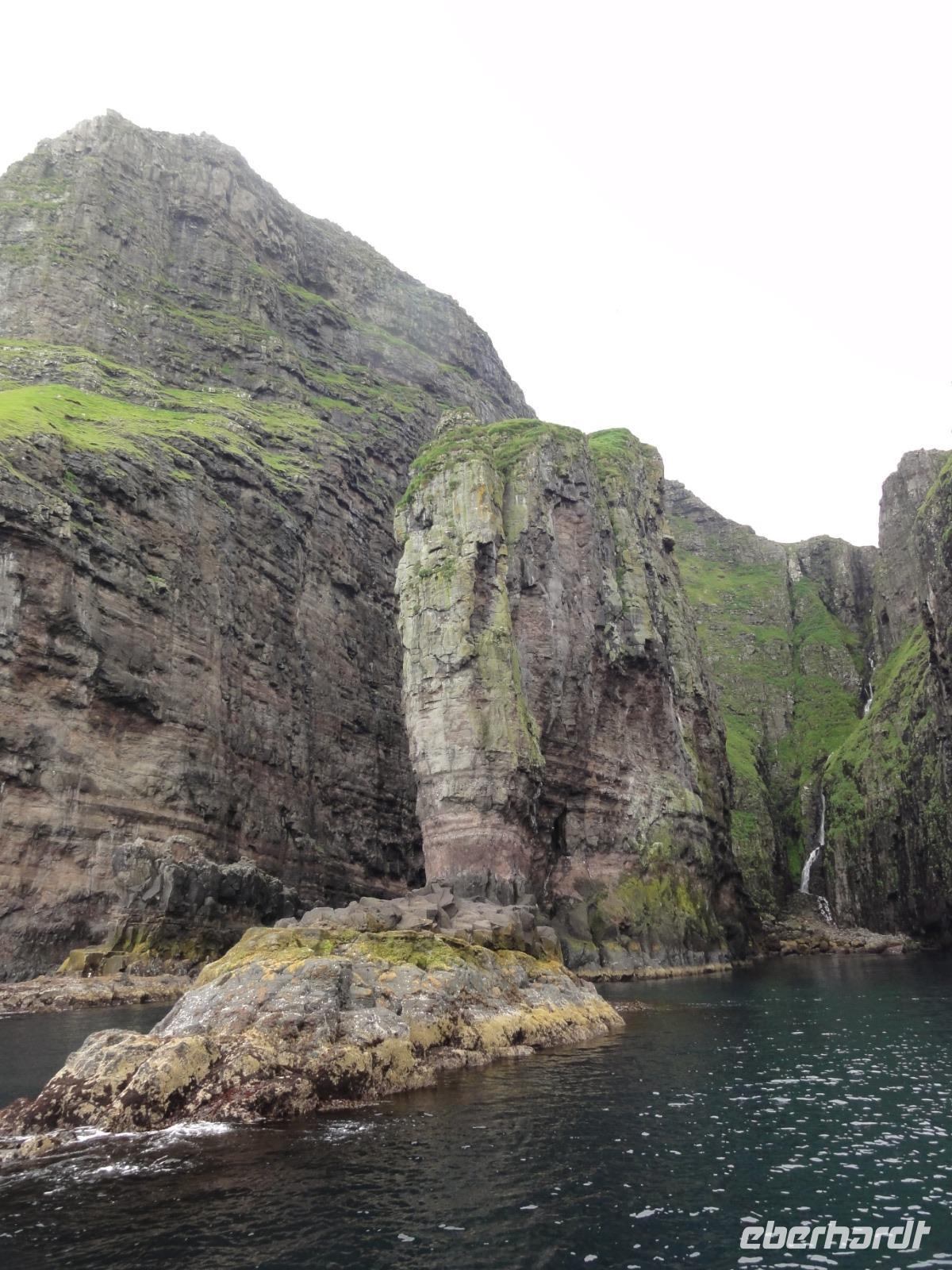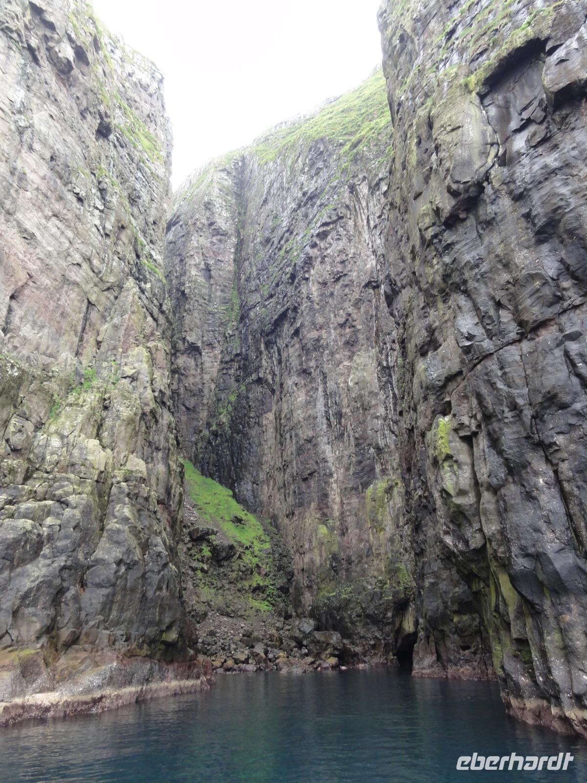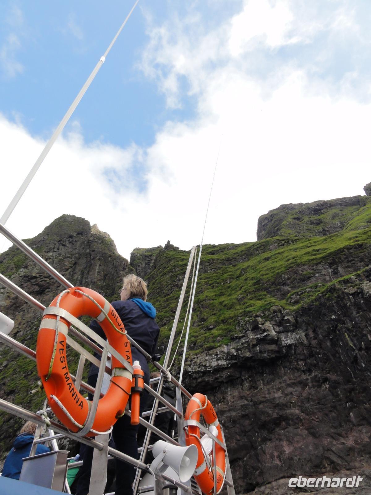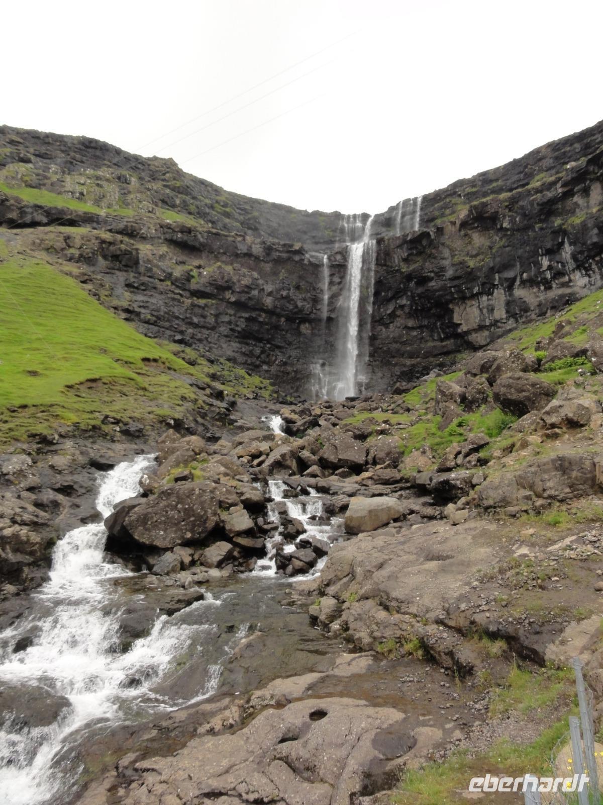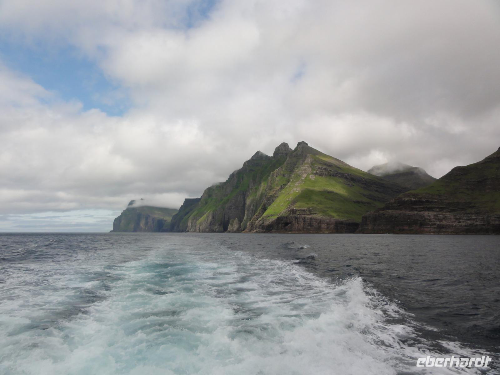 Ich hoffe ihr konntet trotz der Musik des Festivals gut schlafen und die Ohropax erfüllten ihren Zweck. Grins ...Nach dem Frühstück ist noch ein wenig Zeit um einen kleinen Stadtspaziergang durch die Stadt zu unternehmen oder zum Leuchtturm hinauf zu wandern. Danach heißt es auschecken und wir werden von Ann und Laurence am Hotel abgeholt. Unser erstes Ziel heißt Tjornuvik, eine traumhafte Bucht im Norden der Insel Streymoy. Die Sonne scheint und wir beobachten 3 mutige Mädchen beim Baden, bei durchschnittlich 7 Grad Wassertemperatur, Respekt ... Auf dem Rückweg an der Küste entlang machen wir einen Fotostopp am höchsten Wasserfall der Färöer, der Fossa Wasserfall( 140 m) und fahren an der einzigen runden Kirche auf den Färöer vorbei. Eine von 61 Kirchen, davon 60 evangelisch und 1 katholisch. Auch die größte Aquakultur der Welt für die Lachszucht befindet sich hier auf der Insel. Wir sehen in den runden Becken die großen Lachse hoch springen. In den Lachsbecken um von dem Meer den Fluss hinauf in den See zu schwimmen oder zu springen haben wir leider kein Glück. Unser nächstes Ziel heißt Vestmanna, dort besuchen wir zunächst der Saga Museum und können die komplette Woche noch einmal Revue passieren lassen. Wir lauschen der Geschichte der Färöer und bestaunen die Wachsfiguren. Nun kommen wir zum Highlight des heutigen Tages und zum krönenden Abschluss einer tollen Reise. Wir fahren mit dem Boot die Küste entlang der aus dem Wasser empor ragenden Felsen. An den Vogelklippen beobachten wir Küstenseeschwalben, Austernfischer, Eissturmvögel und Papageientaucher. Sogar ein Elefant ragt 90 Meter in die Höhe. Es ist beeindruckend, ich habe immer noch Gänsehaut, es fehlen nur noch die Dinosaurier und Jurassic Park wäre perfekt. Was für eine Flora und Fauna, der Höhepunkt der Rundreise, definitiv. Wieder im Hafen von Vestmanna angekommen fahren wir zu unserem Hotel für die letzte Nacht, das Hotel Foroyar oberhalb von Torshavn.