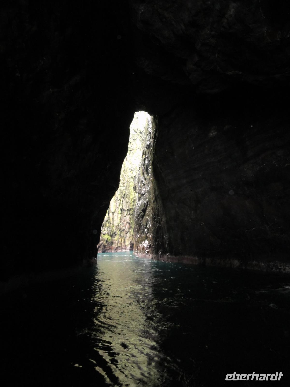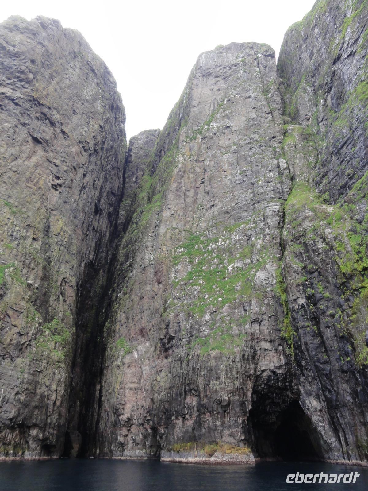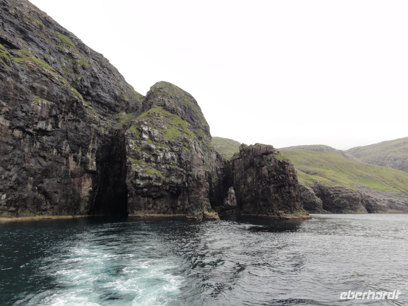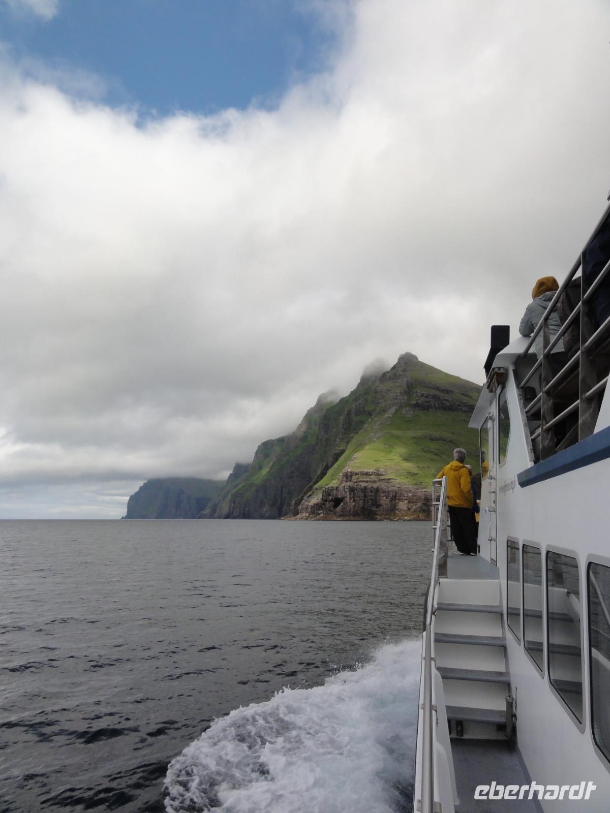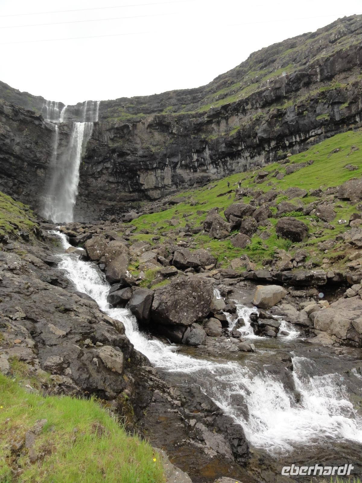 Ich hoffe ihr konntet trotz der Musik des Festivals gut schlafen und die Ohropax erfüllten ihren Zweck. Grins ...Nach dem Frühstück ist noch ein wenig Zeit um einen kleinen Stadtspaziergang durch die Stadt zu unternehmen oder zum Leuchtturm hinauf zu wandern. Danach heißt es auschecken und wir werden von Ann und Laurence am Hotel abgeholt. Unser erstes Ziel heißt Tjornuvik, eine traumhafte Bucht im Norden der Insel Streymoy. Die Sonne scheint und wir beobachten 3 mutige Mädchen beim Baden, bei durchschnittlich 7 Grad Wassertemperatur, Respekt ... Auf dem Rückweg an der Küste entlang machen wir einen Fotostopp am höchsten Wasserfall der Färöer, der Fossa Wasserfall( 140 m) und fahren an der einzigen runden Kirche auf den Färöer vorbei. Eine von 61 Kirchen, davon 60 evangelisch und 1 katholisch. Auch die größte Aquakultur der Welt für die Lachszucht befindet sich hier auf der Insel. Wir sehen in den runden Becken die großen Lachse hoch springen. In den Lachsbecken um von dem Meer den Fluss hinauf in den See zu schwimmen oder zu springen haben wir leider kein Glück. Unser nächstes Ziel heißt Vestmanna, dort besuchen wir zunächst der Saga Museum und können die komplette Woche noch einmal Revue passieren lassen. Wir lauschen der Geschichte der Färöer und bestaunen die Wachsfiguren. Nun kommen wir zum Highlight des heutigen Tages und zum krönenden Abschluss einer tollen Reise. Wir fahren mit dem Boot die Küste entlang der aus dem Wasser empor ragenden Felsen. An den Vogelklippen beobachten wir Küstenseeschwalben, Austernfischer, Eissturmvögel und Papageientaucher. Sogar ein Elefant ragt 90 Meter in die Höhe. Es ist beeindruckend, ich habe immer noch Gänsehaut, es fehlen nur noch die Dinosaurier und Jurassic Park wäre perfekt. Was für eine Flora und Fauna, der Höhepunkt der Rundreise, definitiv. Wieder im Hafen von Vestmanna angekommen fahren wir zu unserem Hotel für die letzte Nacht, das Hotel Foroyar oberhalb von Torshavn.