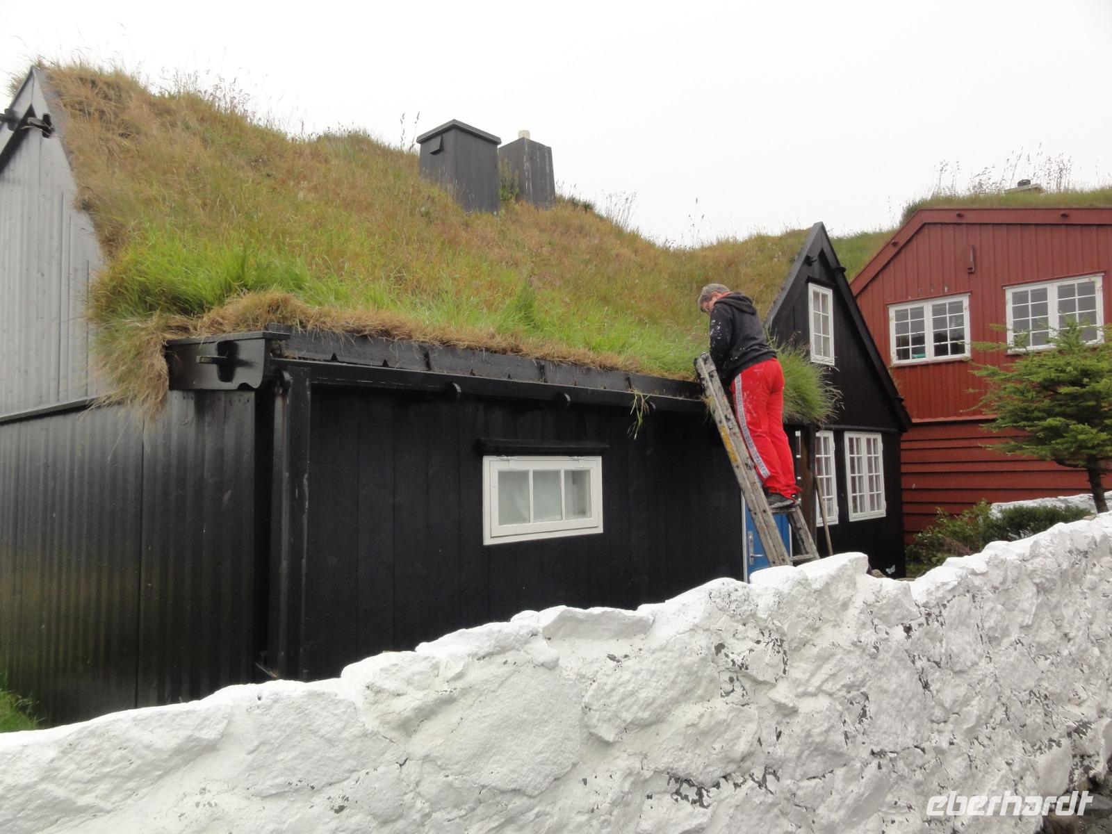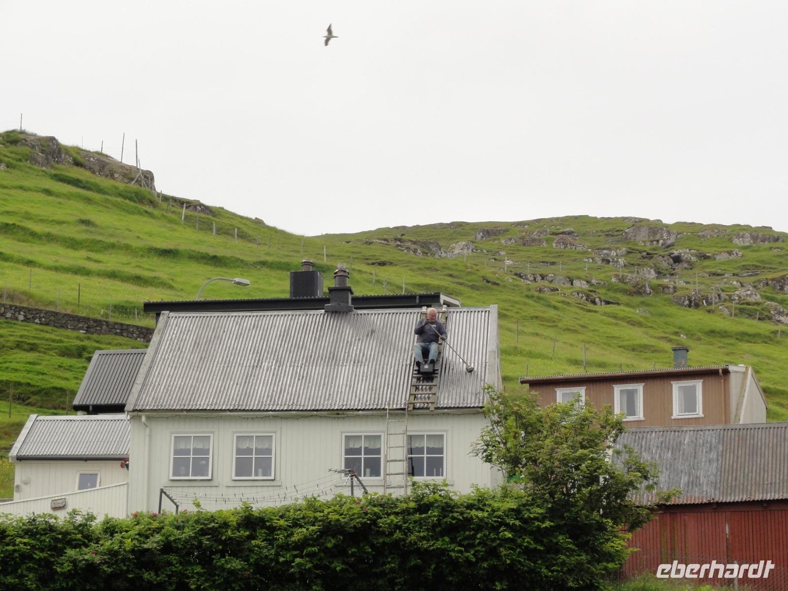 Wir lassen es etwas gemütlich angehen und fahren nach dem Frühstück auf die Insel Kunoy- die weibliche Insel. Im gleichnamigen Ort haben wir Sicht auf die benachbarte Insel Kalsoy- die männliche Insel. Bei strahlendem Sonnenschein wandern wir hinauf zum größten Stein der Färöer Inseln. Der Stein ist heute leider nicht zu bezwingen, er ist zu rutschig. Von hier oben hat man einem traumhaften Panoramablick über die Inseln. Dann heißt es Gruppenfoto