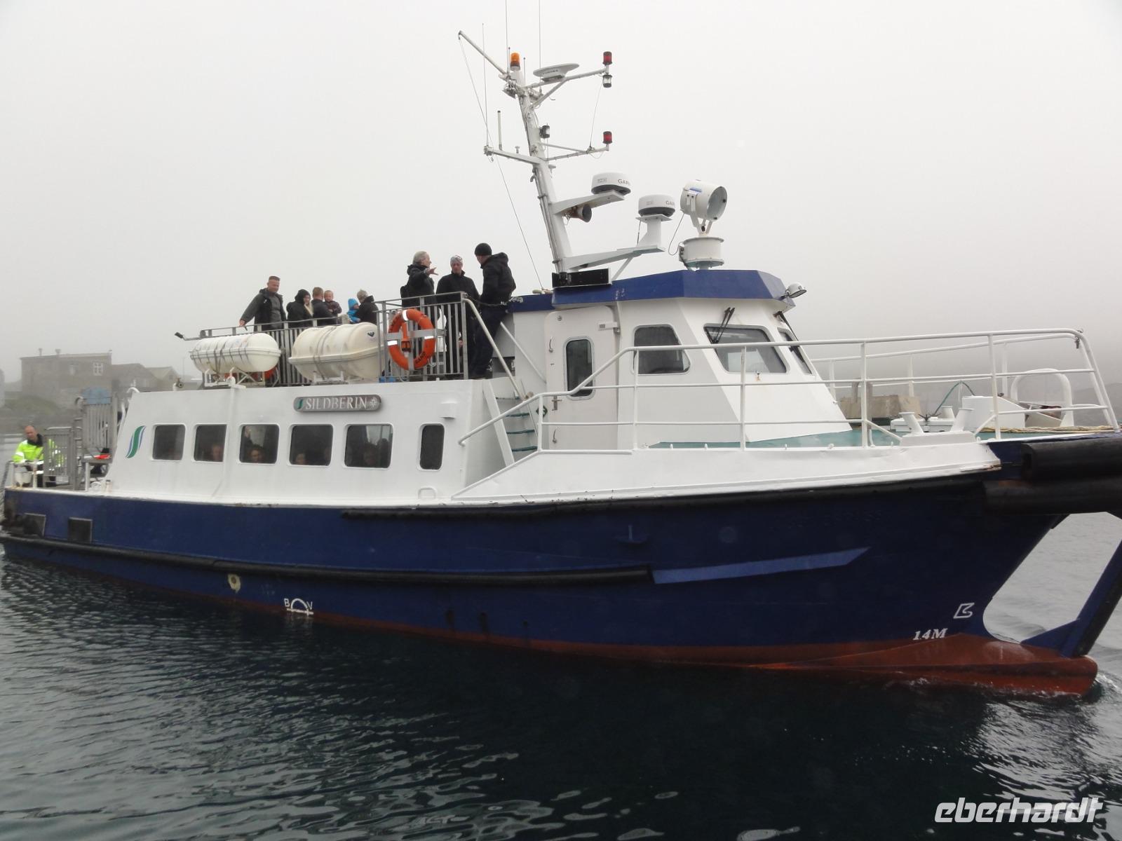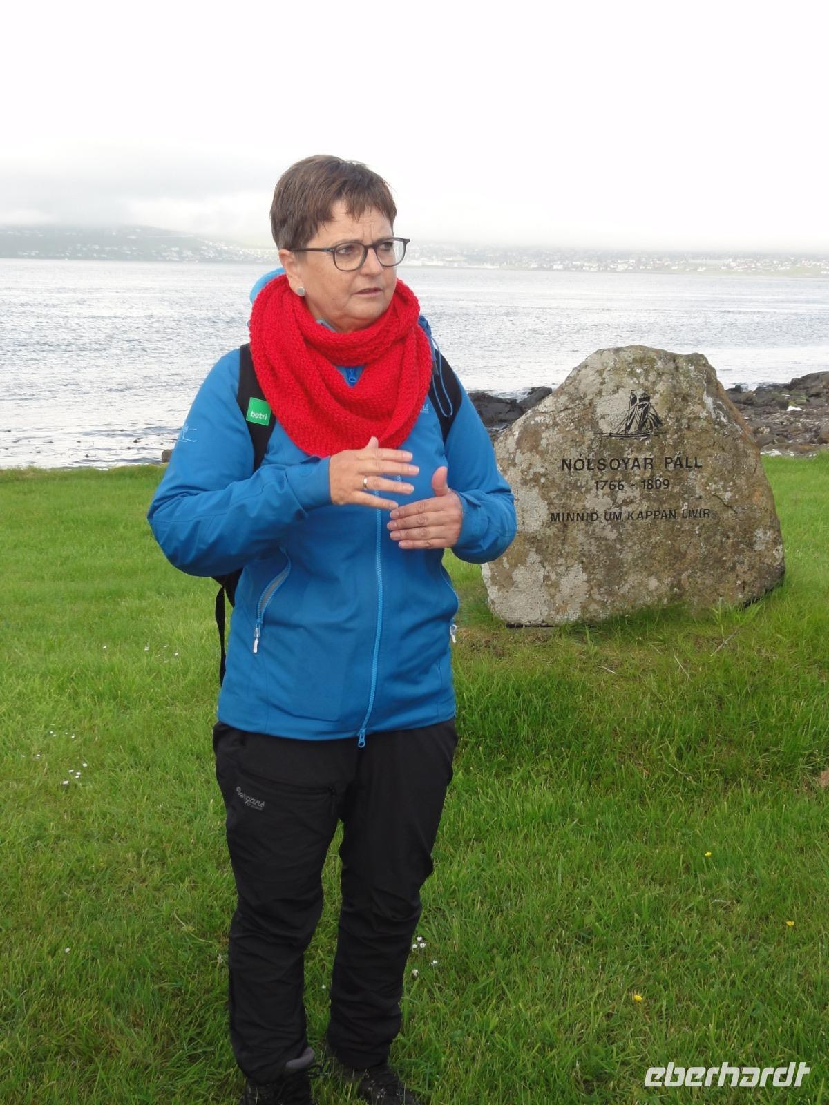 Wir gehen heute schon 6.30 Uhr zum Frühstück, da uns Ann bereits 7.15 Uhr am Hotel abholt und mit uns gemeinsam durch den Hafen bis zur Fähre läuft. Wir haben heute keinen Bus und werden Nolsoy zu Fuß erkunden. Die Wanderschuhe geschnürt fahren wir mit der Fähre von Torshavn nach Nolsoy nur 20 min. Wir haben wie immer Glück mit dem Wetter, auf der Hinfahrt zeigt sich Nolsoy und auch Torshavn in der Sonne. Auf der Insel angekommen bewundern wir das Nollywood Sign und besuchen den Schiffsschuppen von Ove Joensen. Er war ein Abenteurer der allein in seinem Boot Diana Wictoria von den Färöer in 41 Tagen bis nach Dänemark ruderte. Danach machen wir eine kleine Wanderung zu den Klippen und haben einen tollen Blick auf die Stadt Nolsoy. Wir zücken unsere Kameras und probieren das beste Foto mit den Austernfischern zu schießen. Nach unzähligen Fotos wandern wir zurück nach Nolsoy und besuchen das Museum und gleichzeitig älteste Haus auf Nolsoy. Zum Mittag gibt es heute ein Fischpaket mit Dorsch und Kartoffeln. Wahnsinnig lecker... Dazu Brot mit einem Knoblauch Lemon Dipp. Nach dem Essen nehmen wir die Fähre zurück nach Torshavn und haben den Nachmittag zur freien Verfügung. Einige fahren mit dem kostenlosen Bus und besuchen das National Museum andere wiederum die National Gallery oder den Botanischen Garten. Es gibt genügend Möglichkeiten sich die Zeit in der Stadt zu vertreiben.